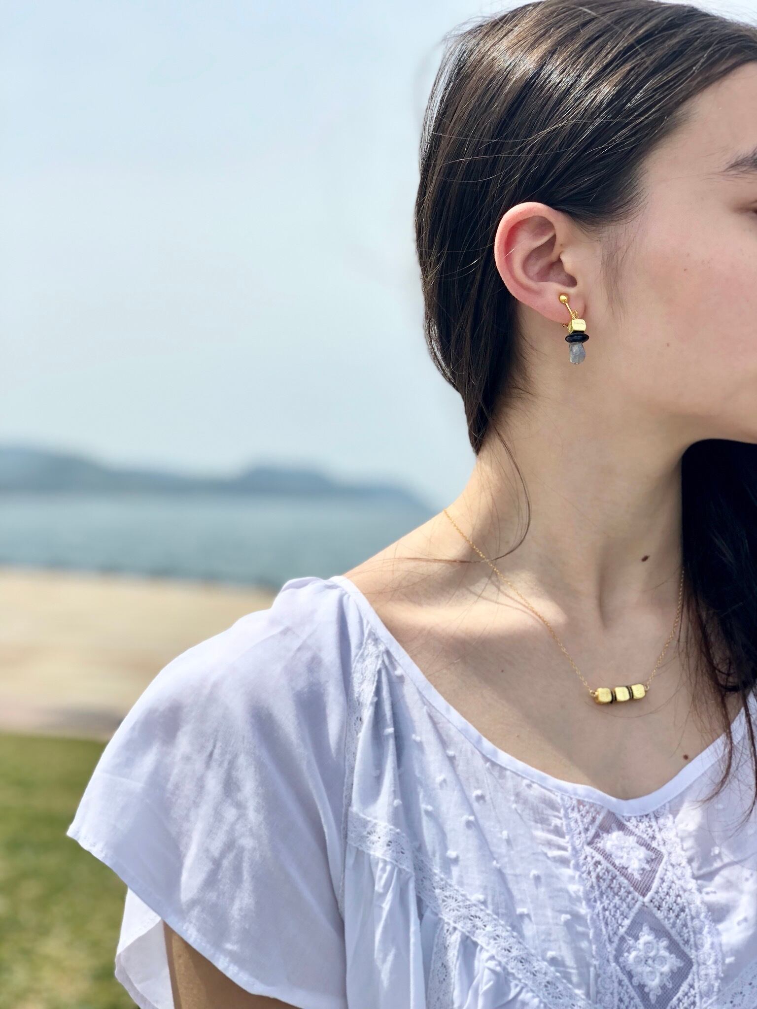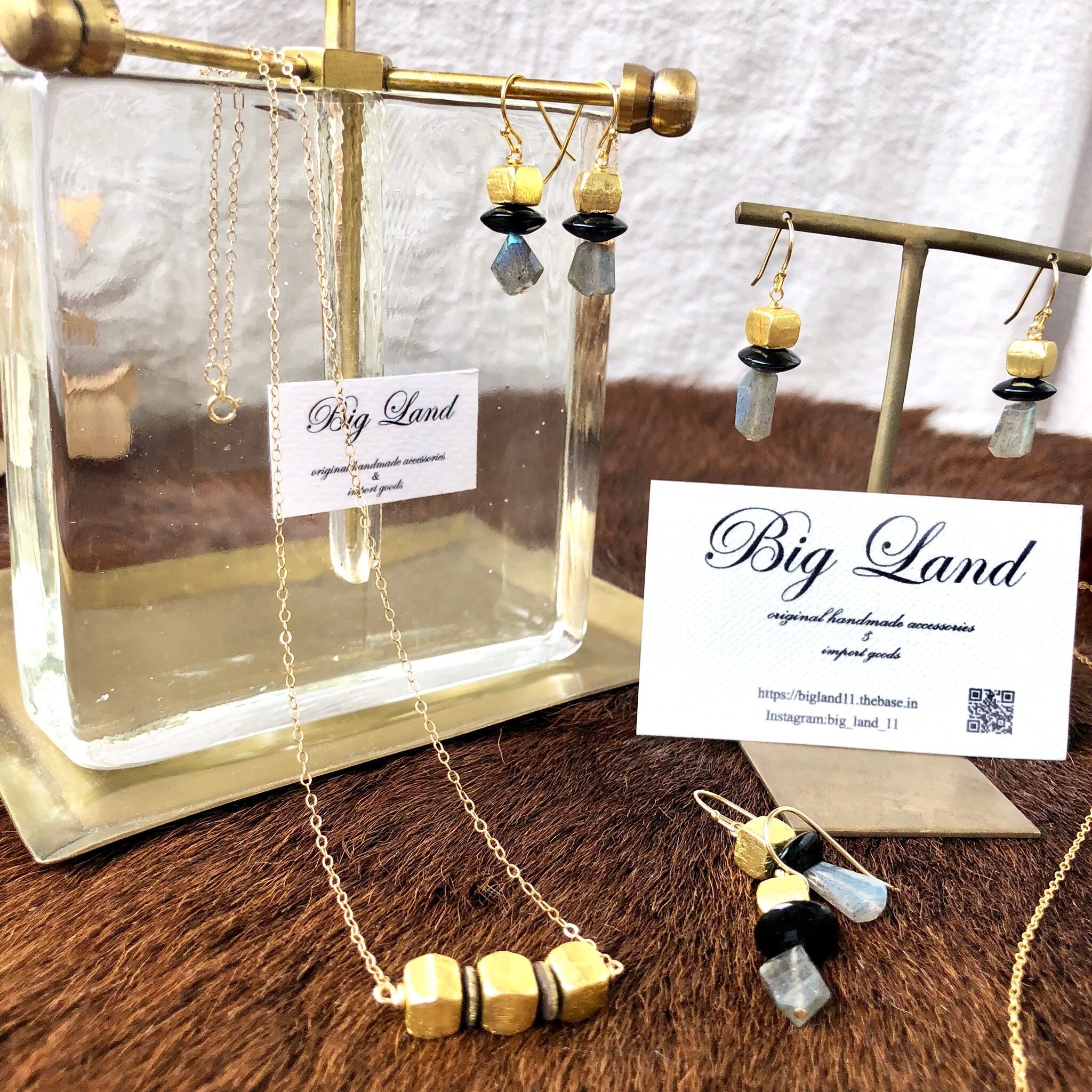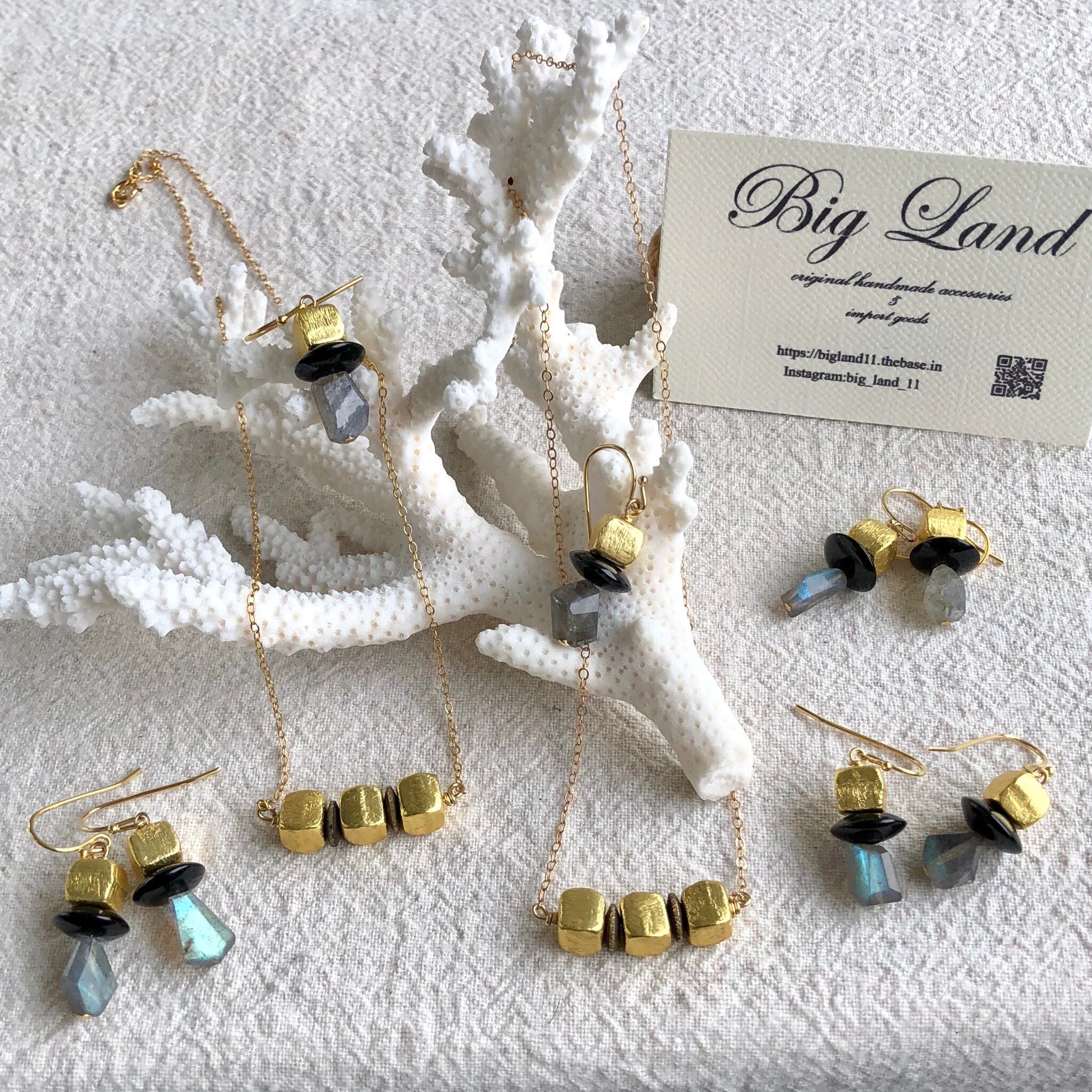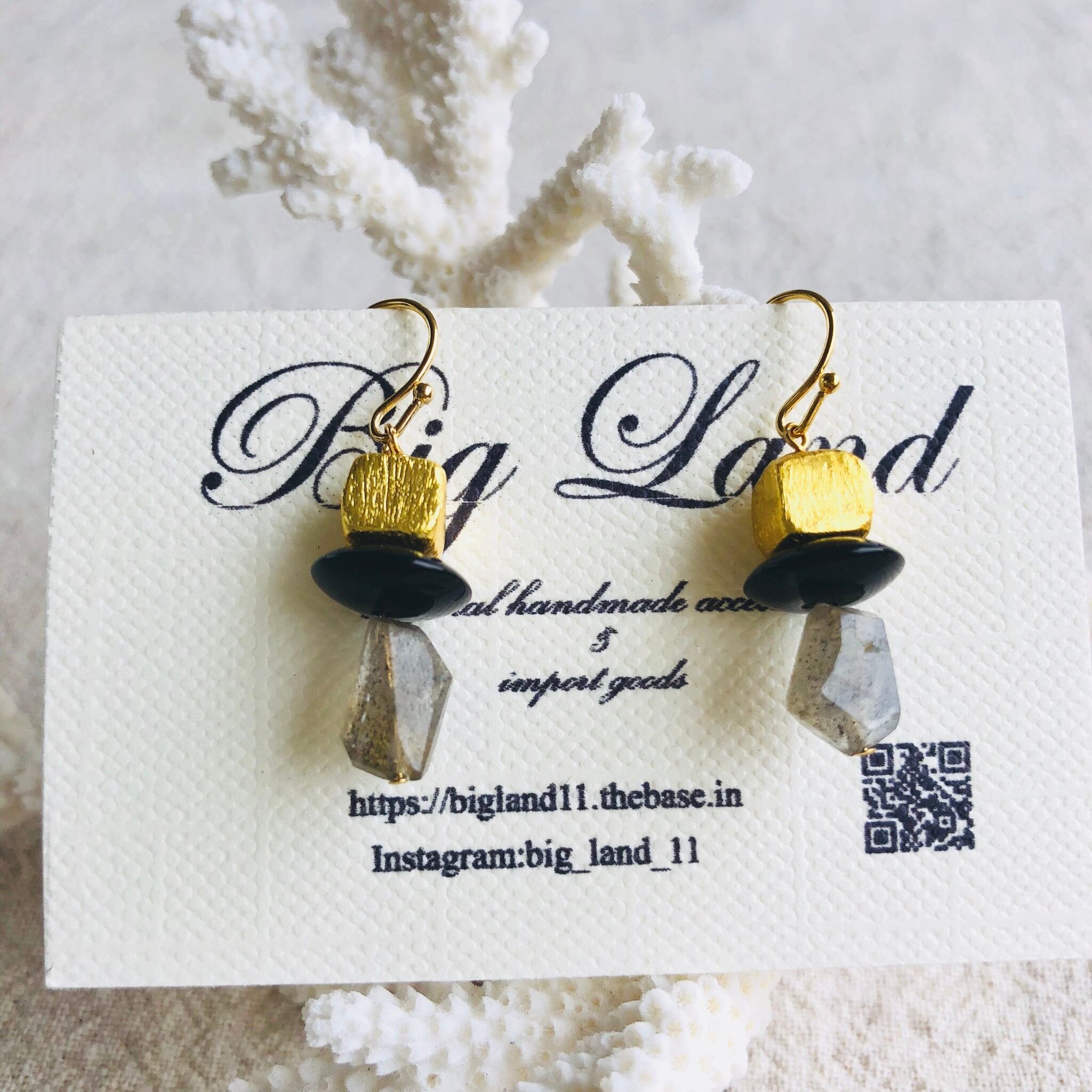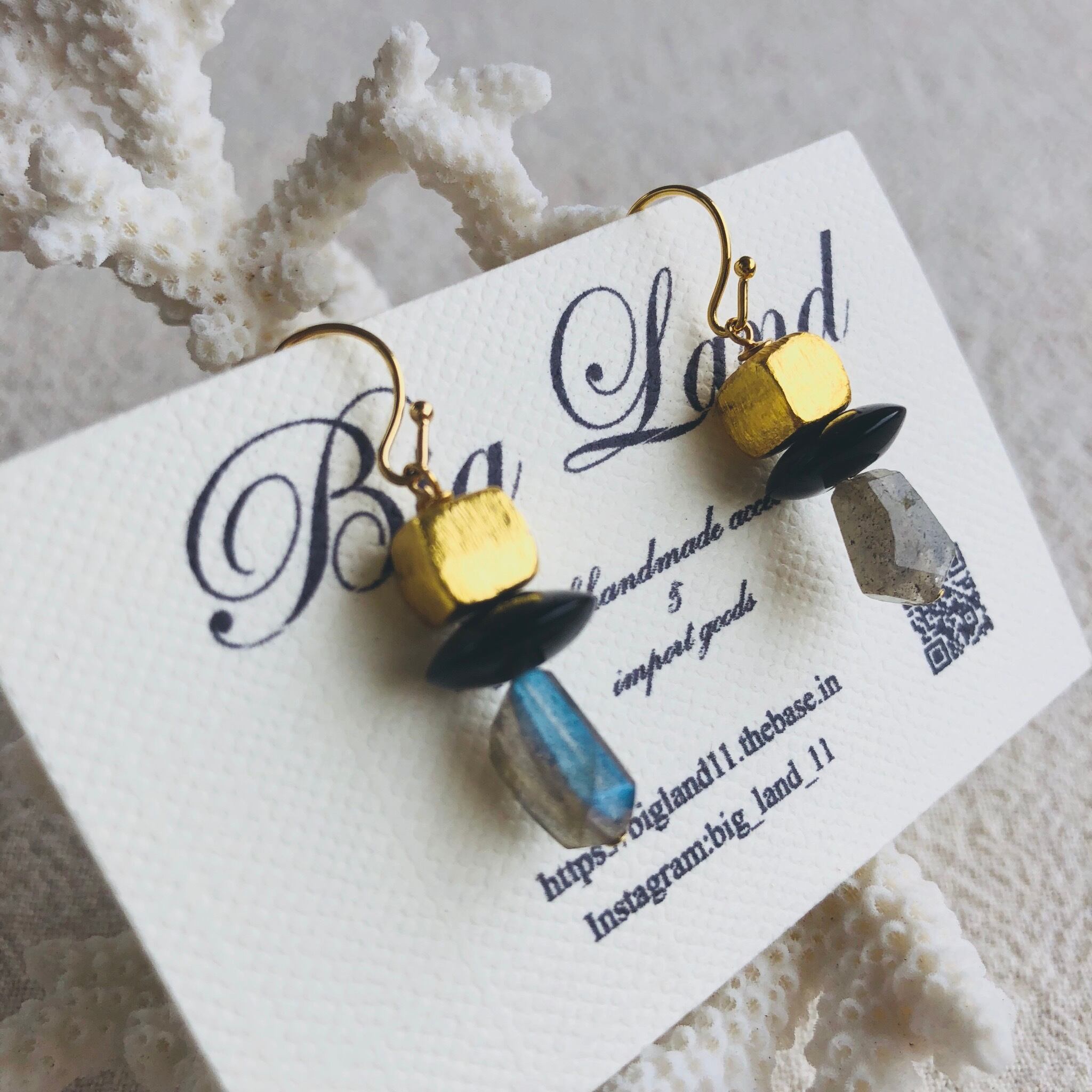 天然石のラブラドライト.オニキス.18金コーティングしたキューブ銅との組み合わせで、大人っぽくハイセンスな雰囲気に仕上げてみました✨
