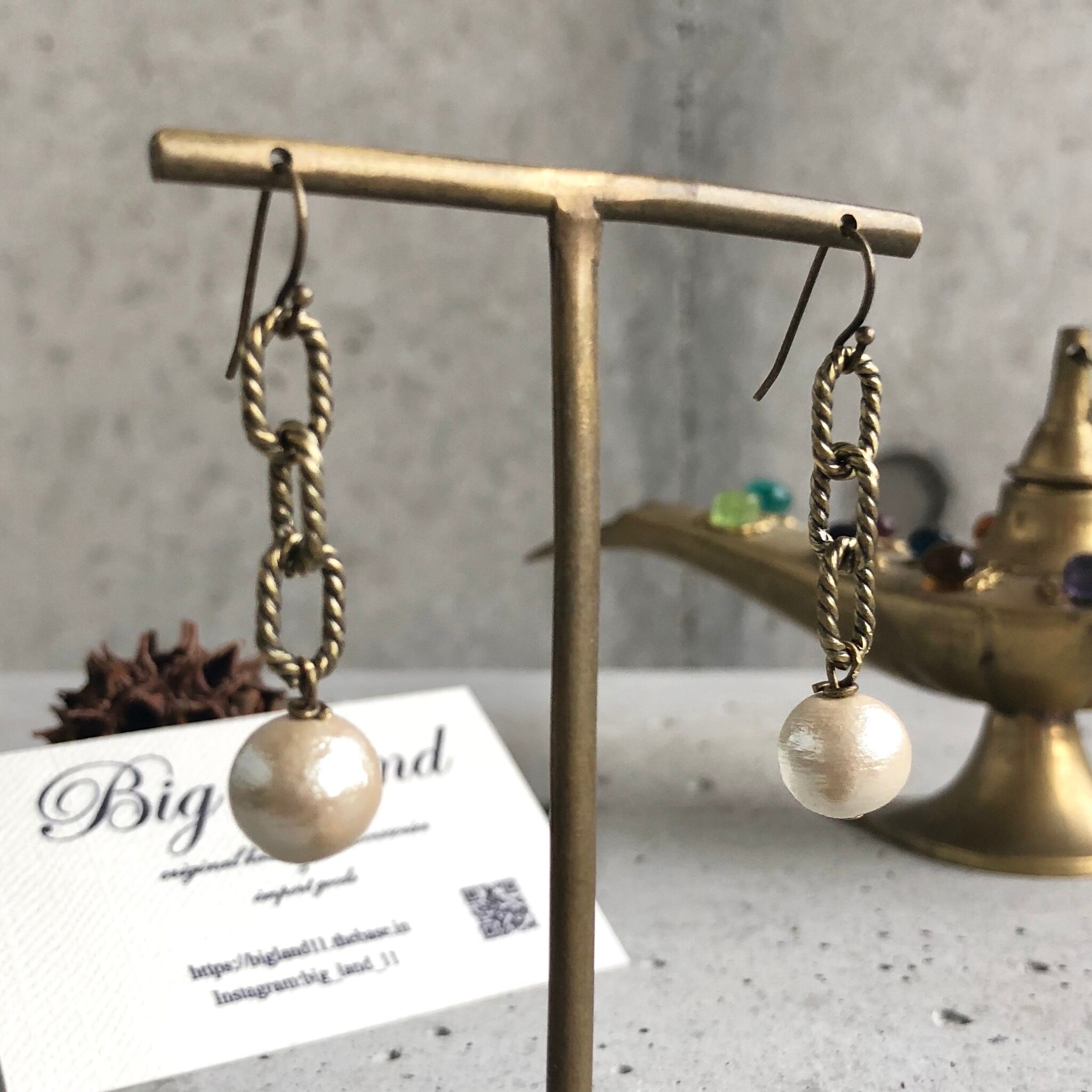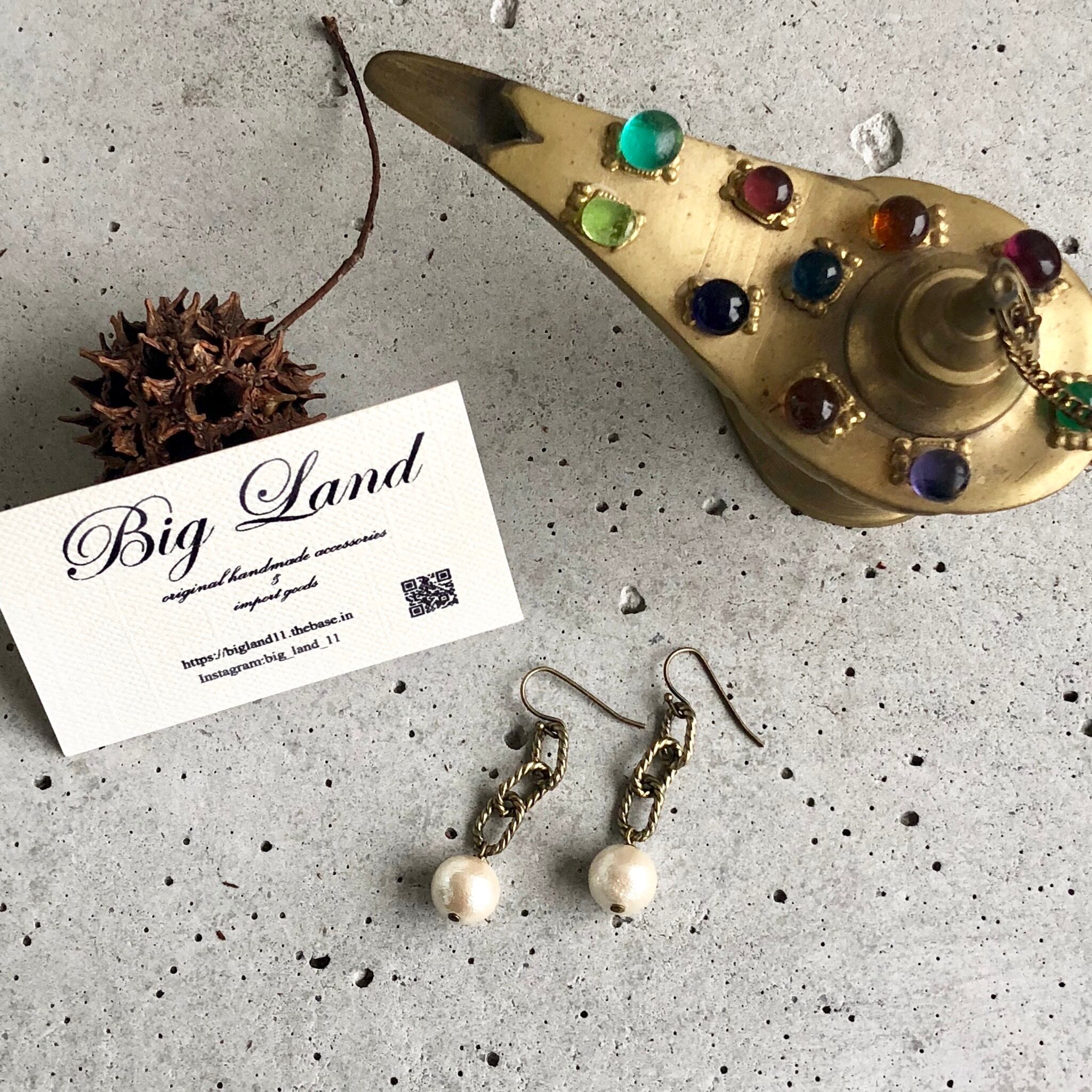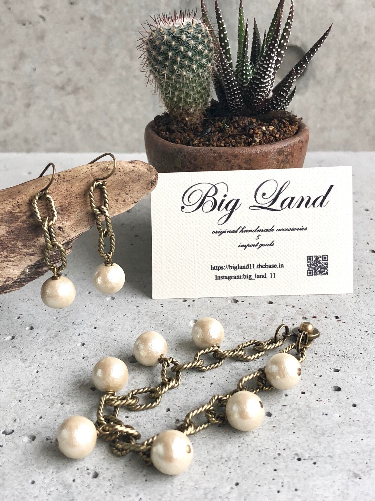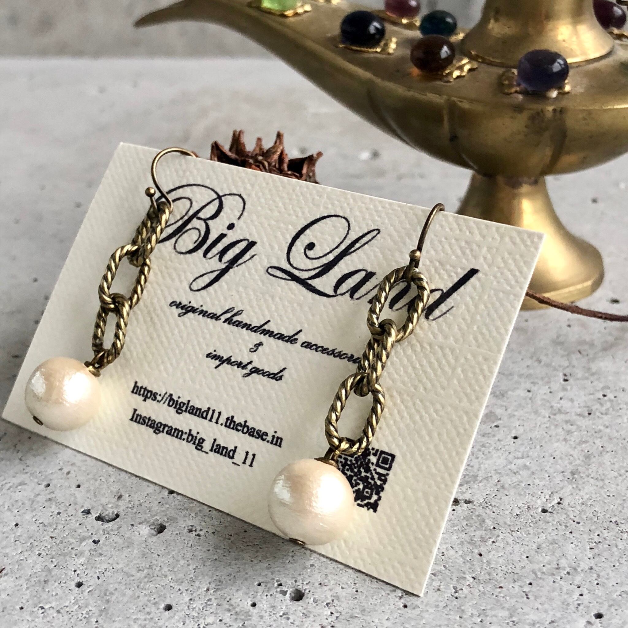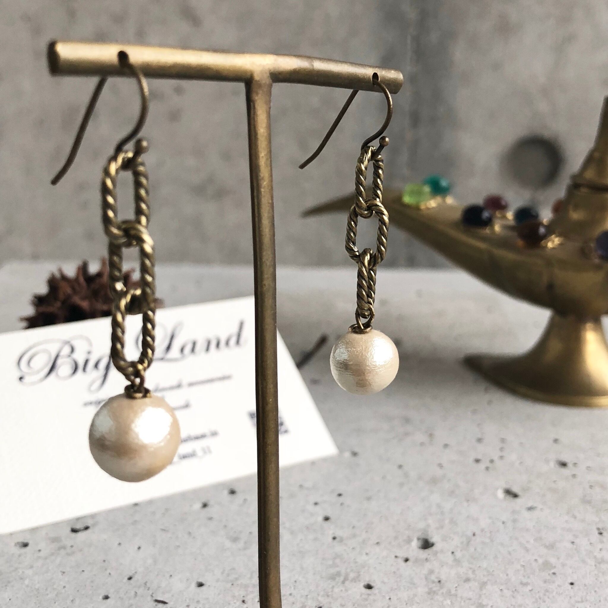 コットンパールと燻した色のデザインチェーンの組み合わせはこなれ感があります