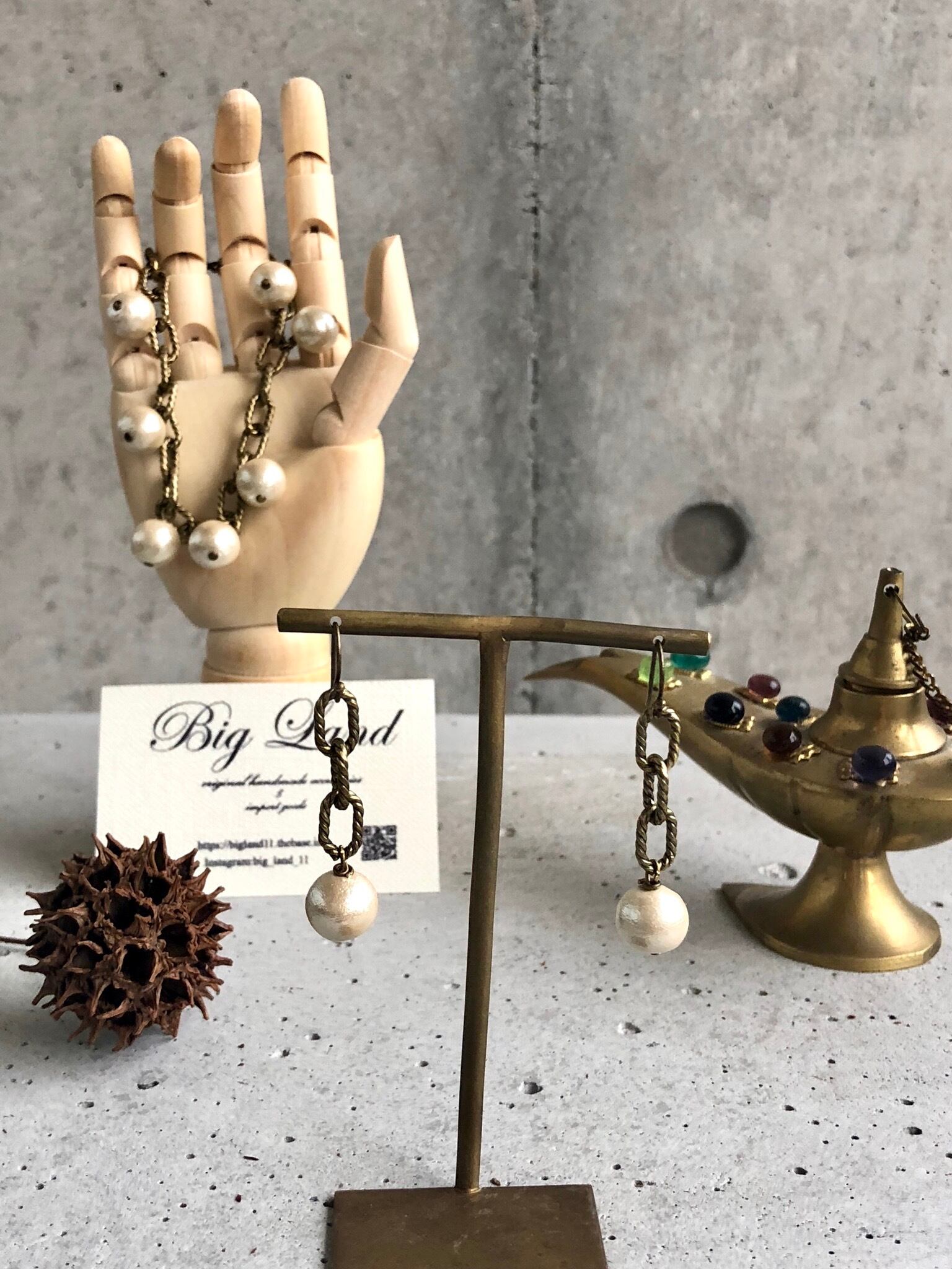 コットンパールと燻した色のデザインチェーンの組み合わせはこなれ感があります