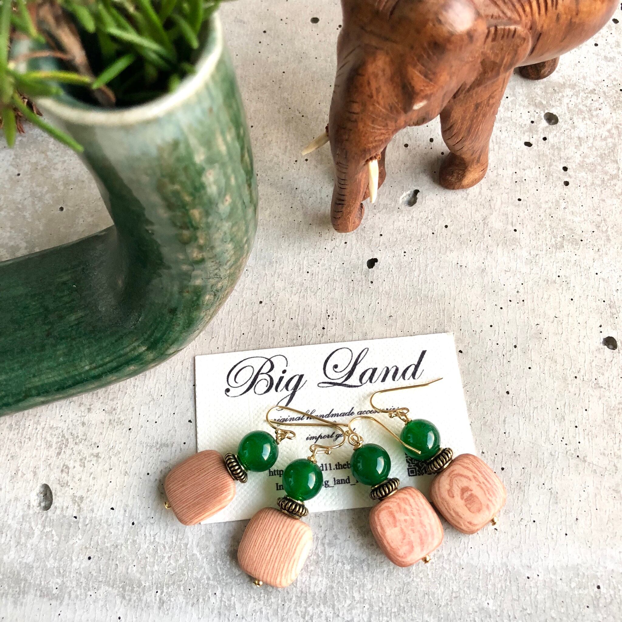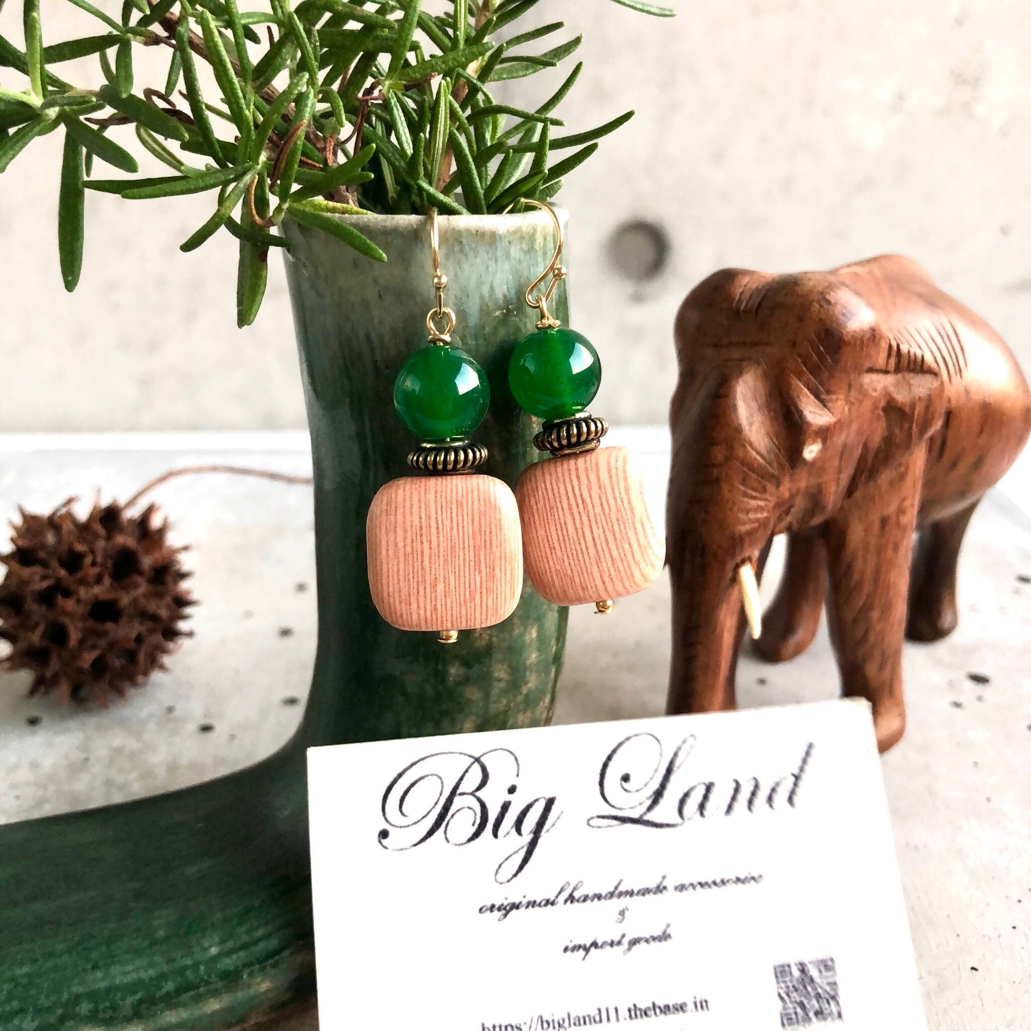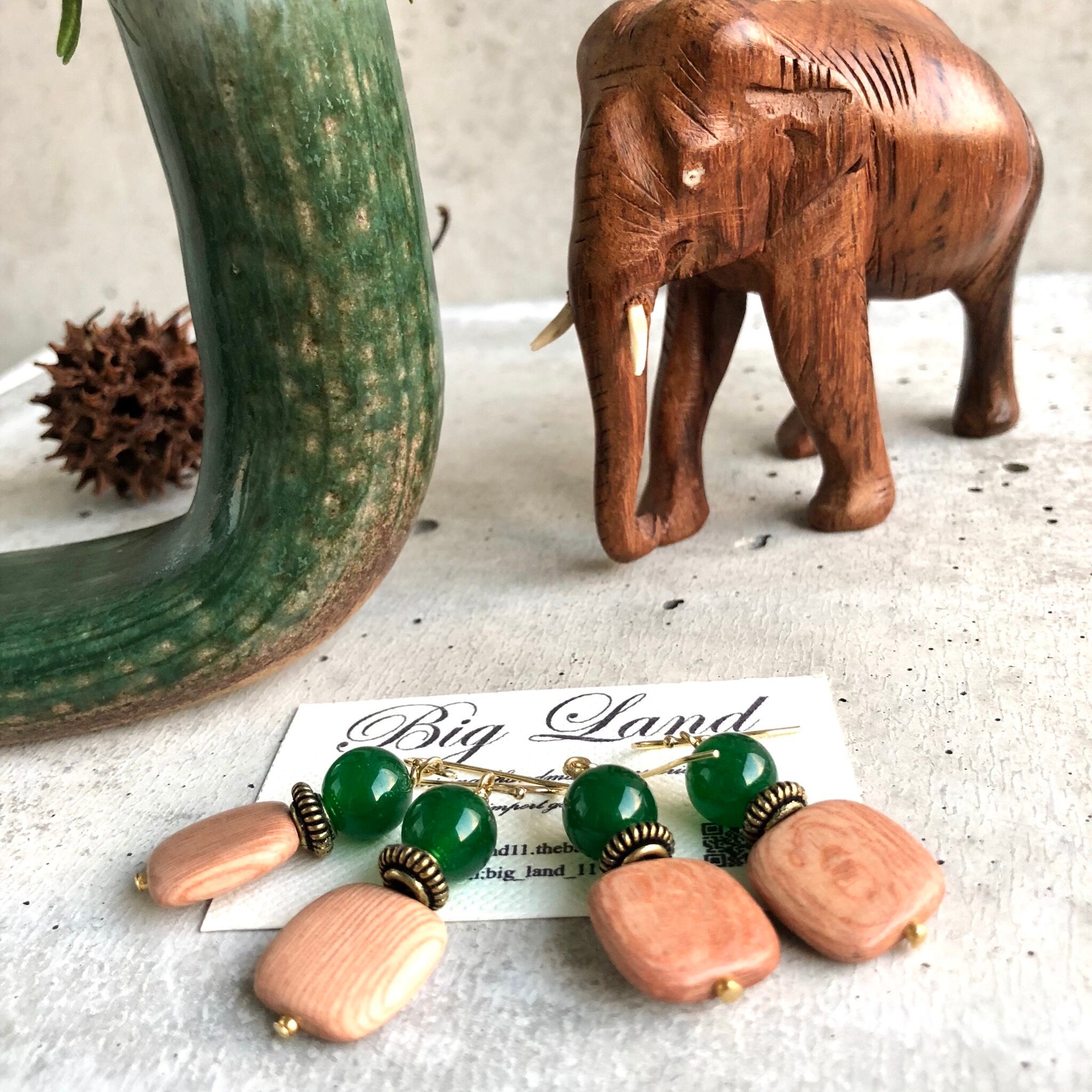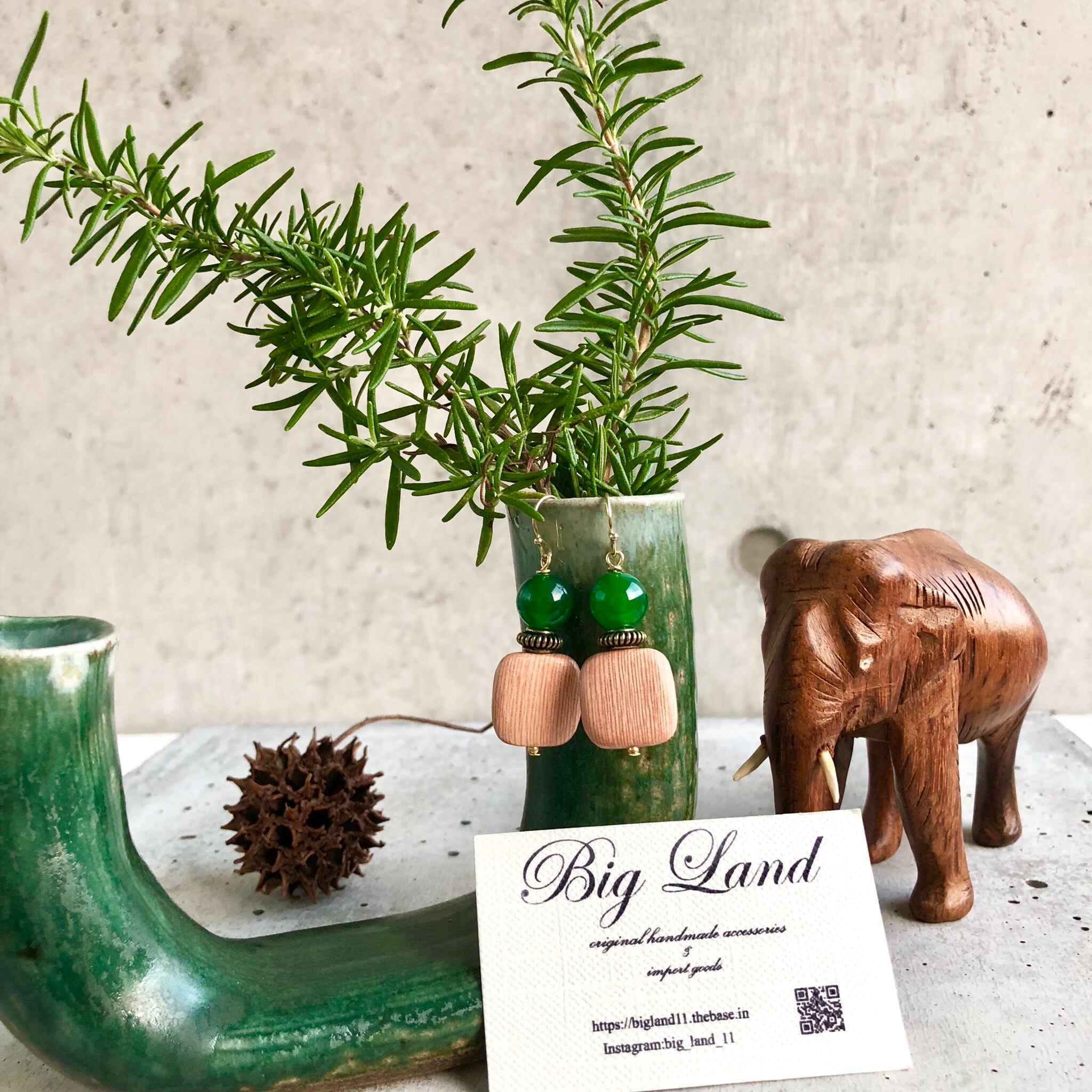 シンプルなスクエアのウッドに深く綺麗な色のグリーンアゲートとの組み合わせがどこかエキゾチックな雰囲気があり、グリーン系でワントーンコーデにすると凄く雰囲気が出ます✨