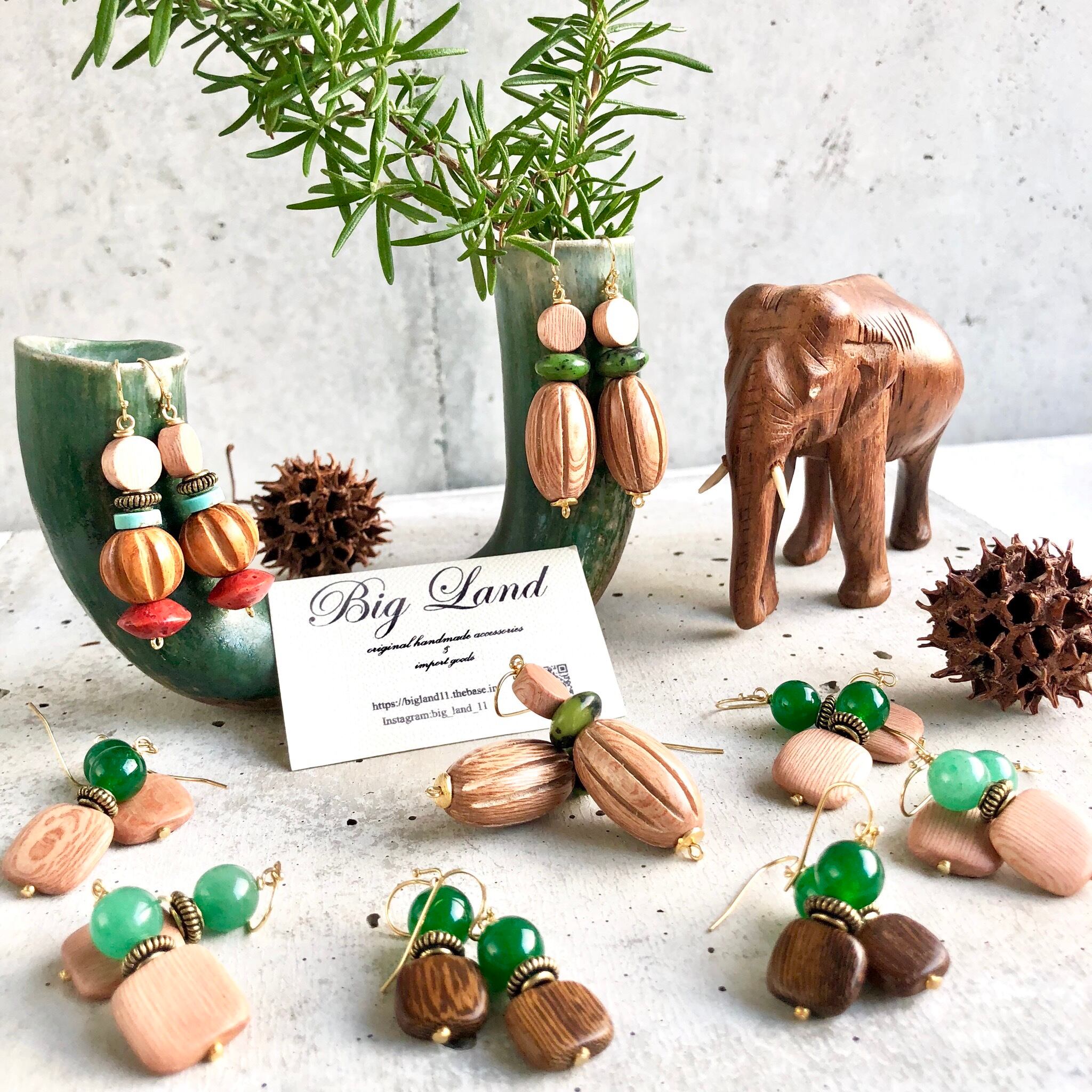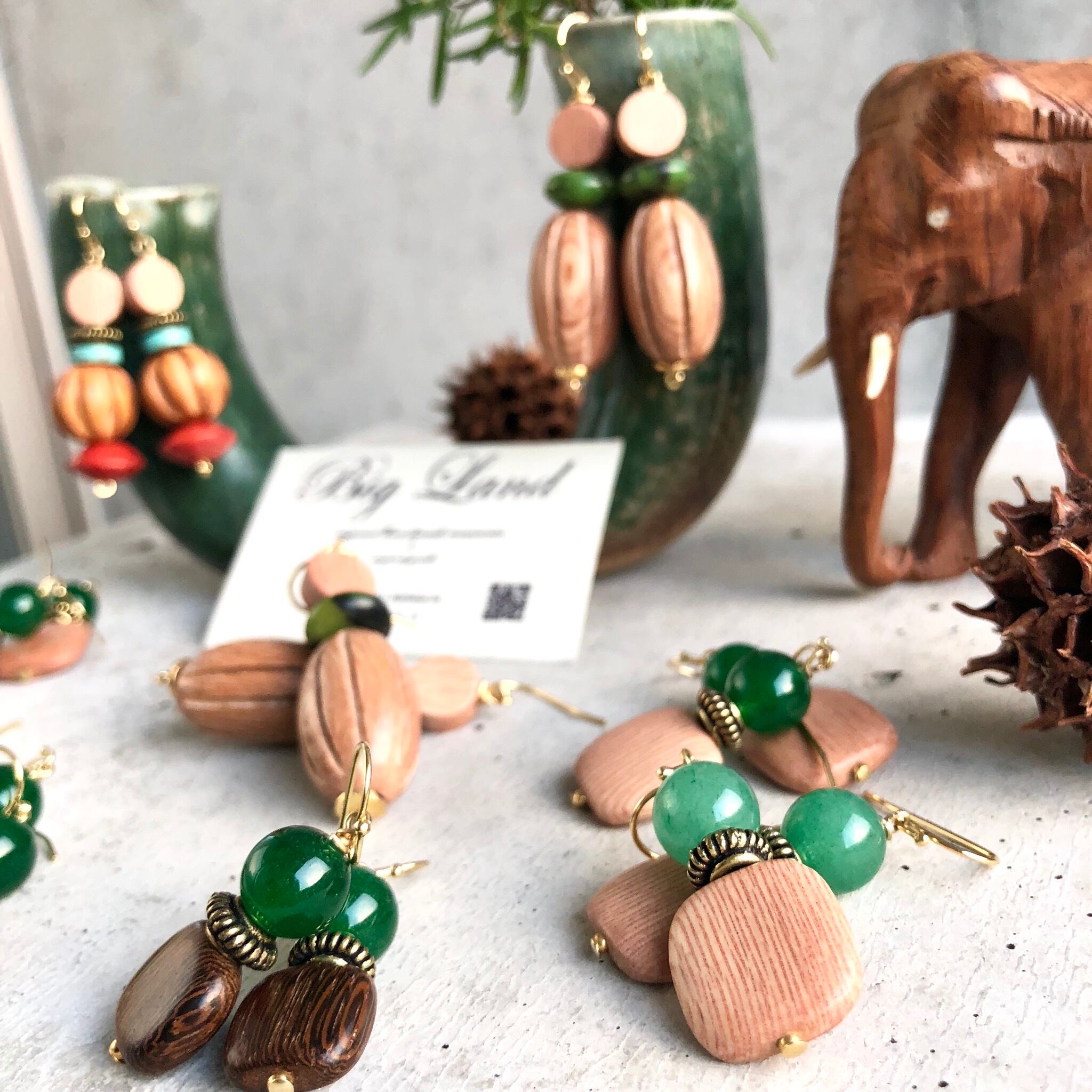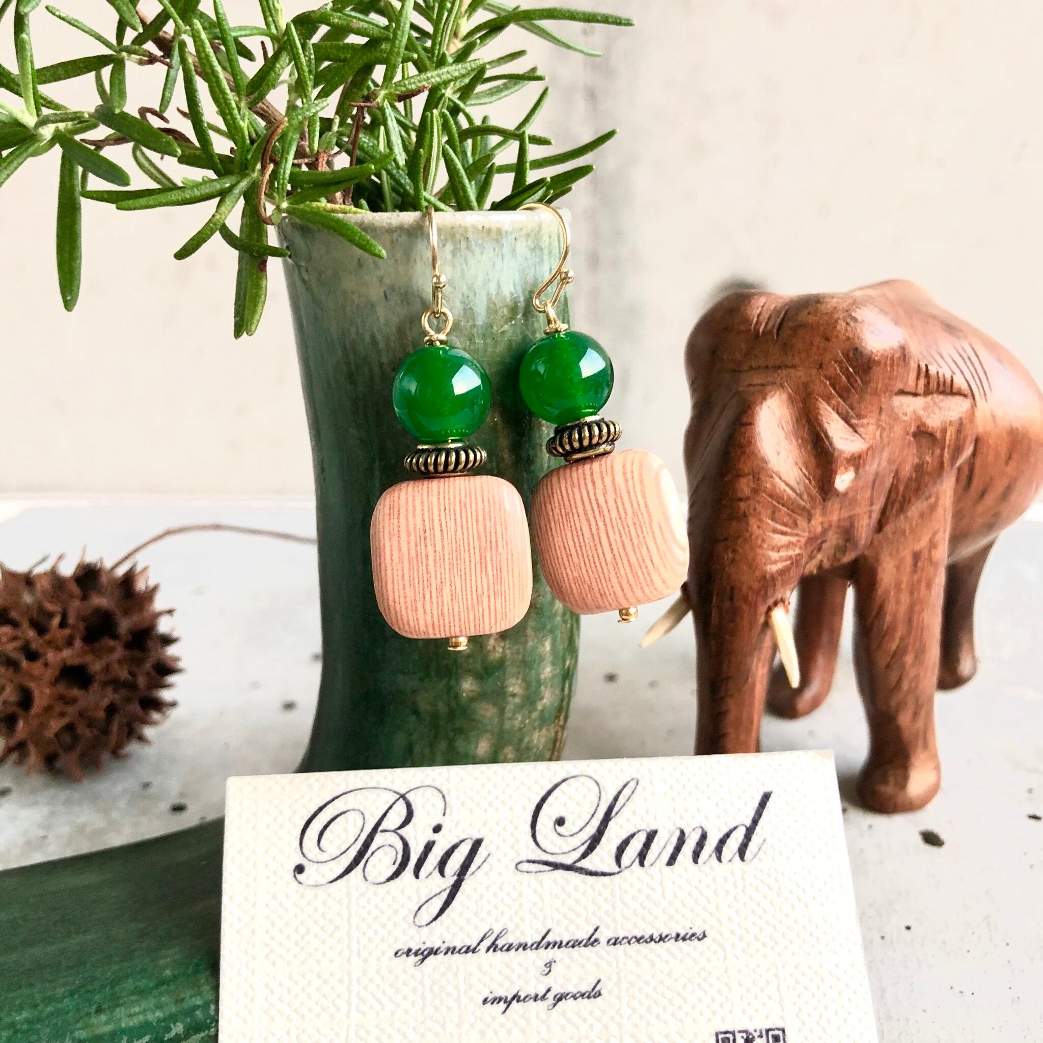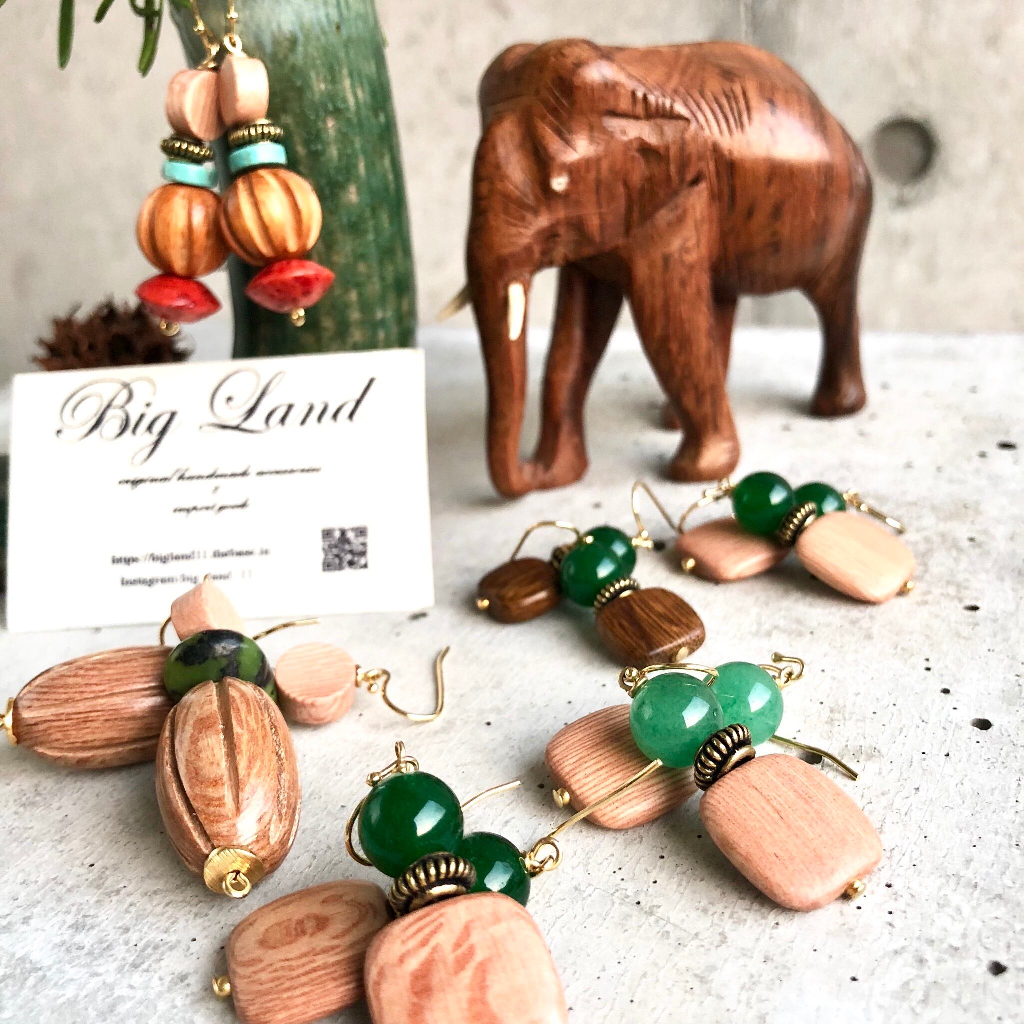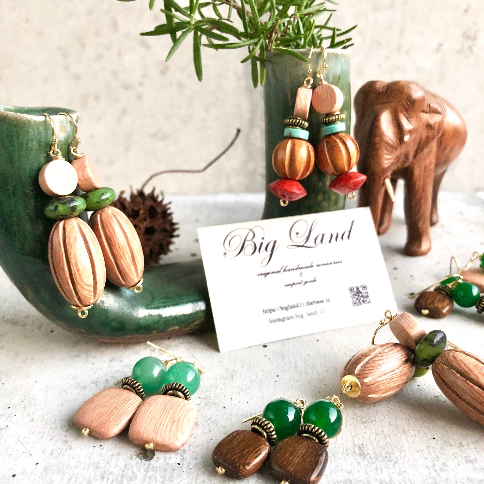 シンプルなスクエアのウッドに深く綺麗な色のグリーンアゲートとの組み合わせがどこかエキゾチックな雰囲気があり、グリーン系でワントーンコーデにすると凄く雰囲気が出ます✨