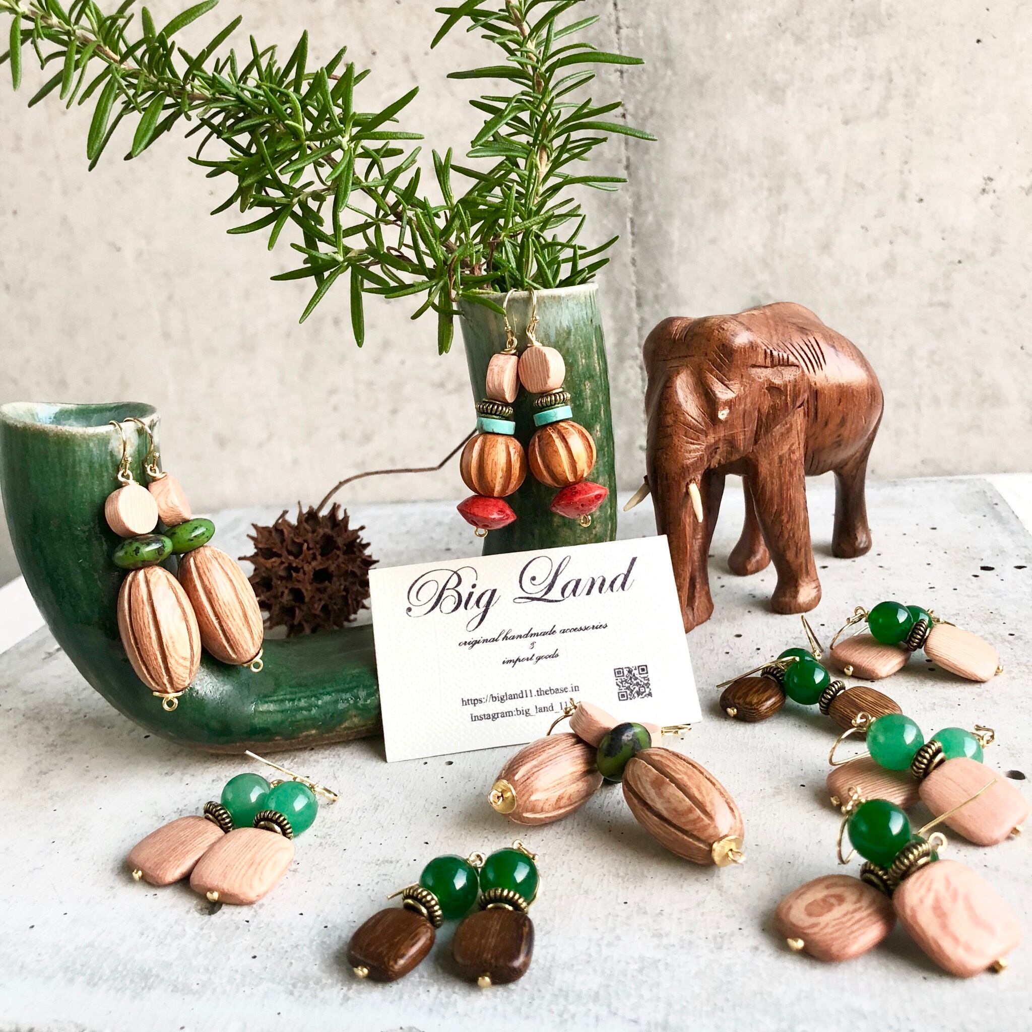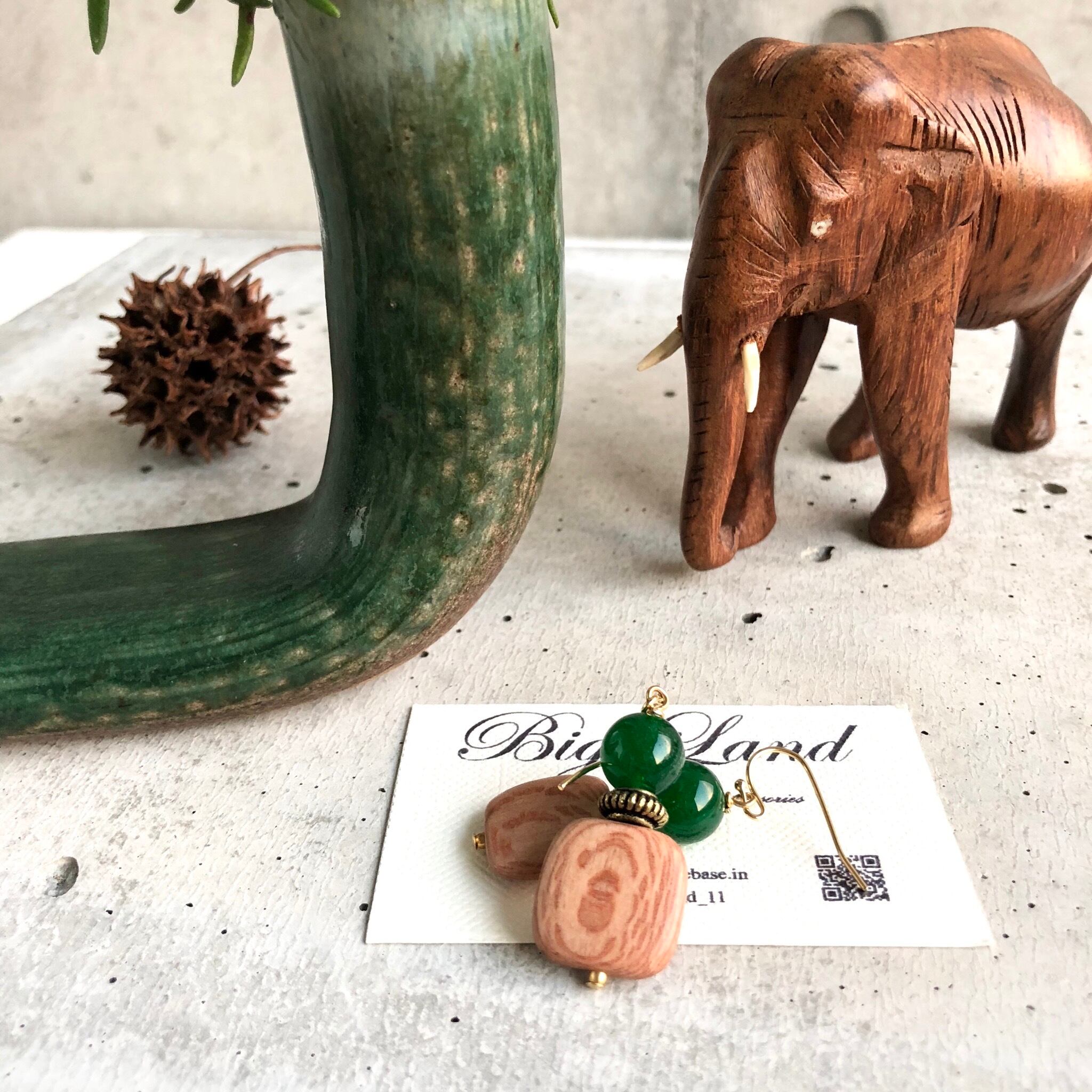 シンプルなスクエアのウッドに深く綺麗な色のグリーンアゲートとの組み合わせがどこかエキゾチックな雰囲気があり、グリーン系でワントーンコーデにすると凄く雰囲気が出ます✨