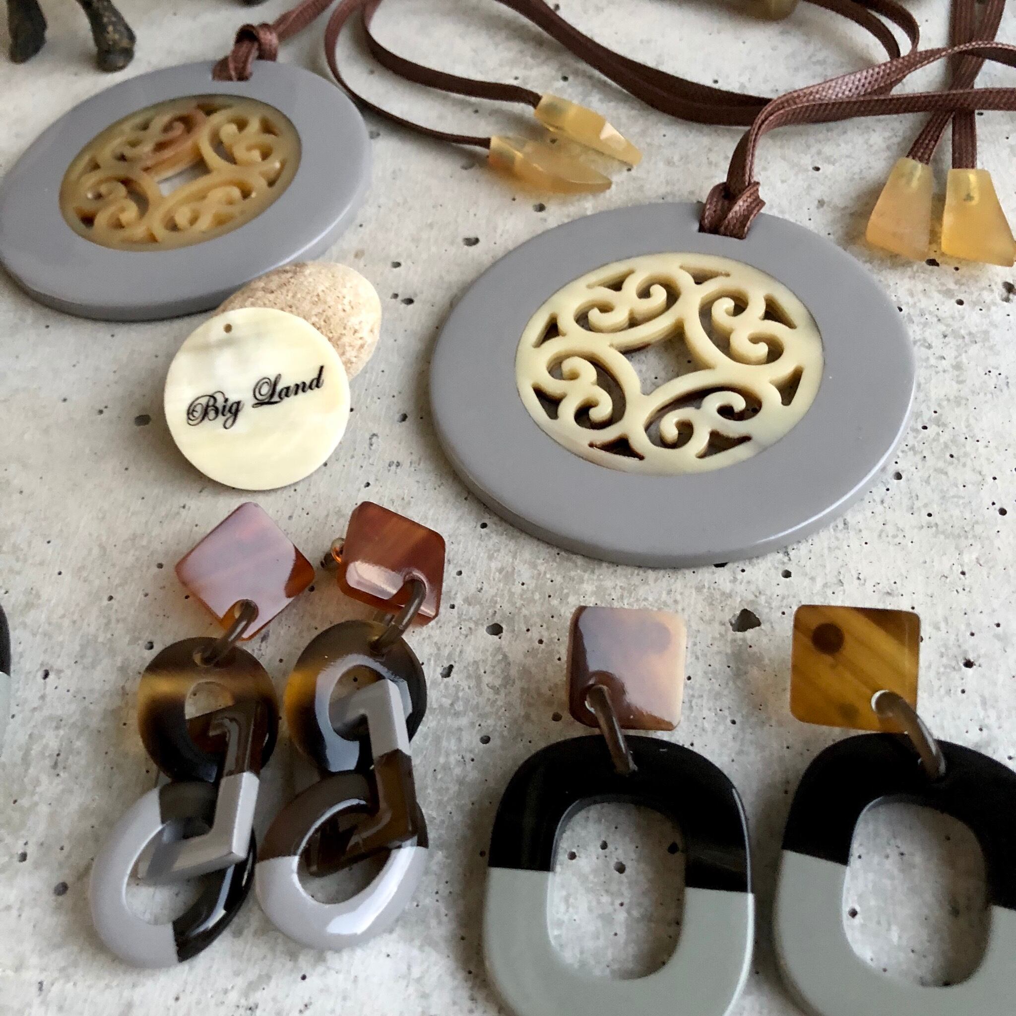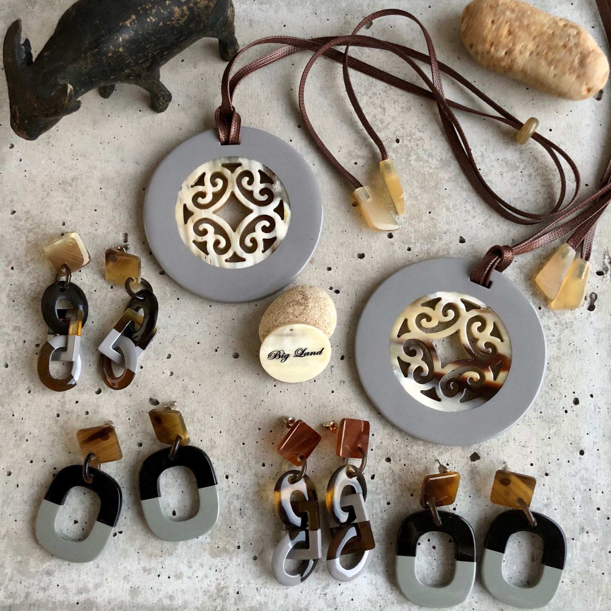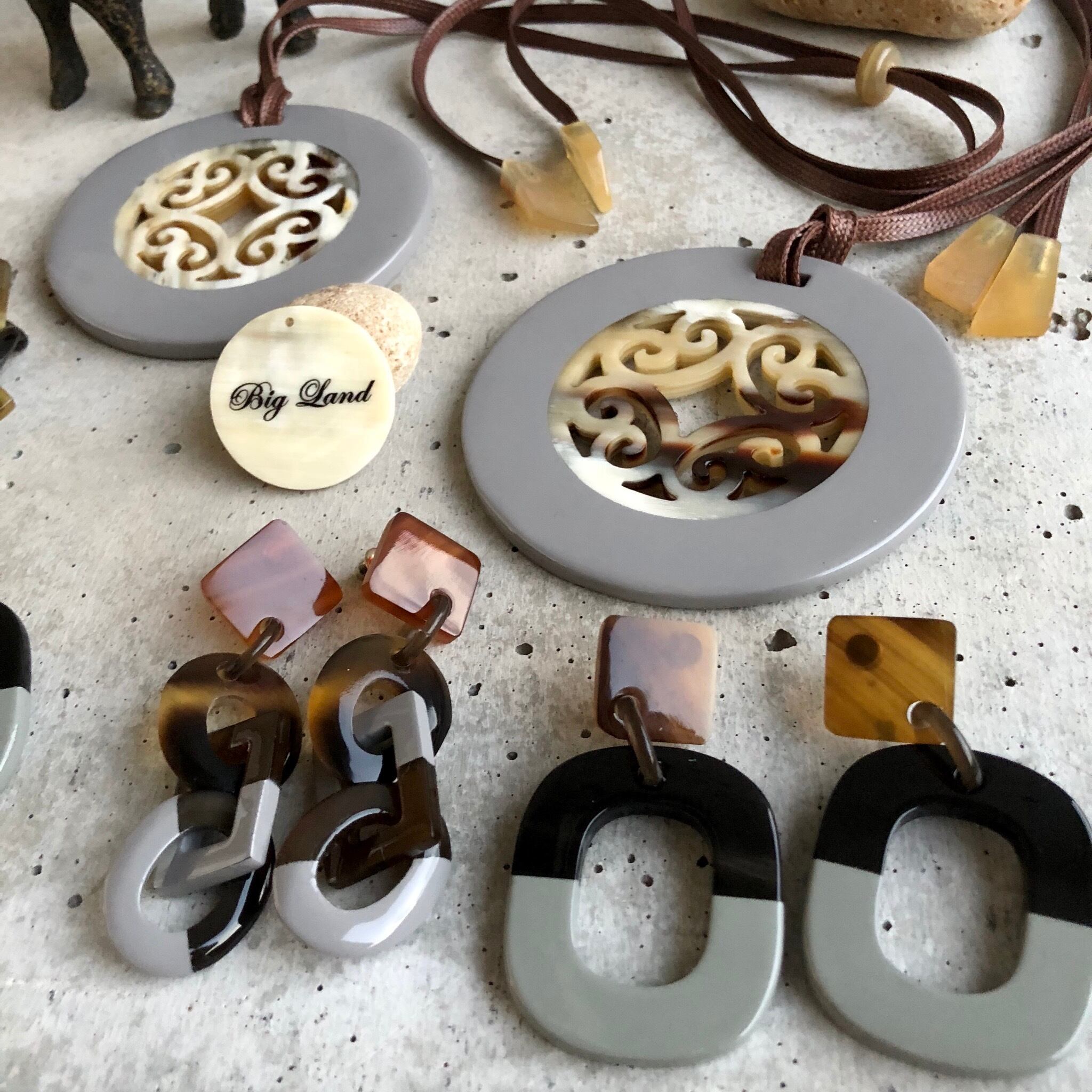 水牛角にグレーの漆塗りした大変上品なデザインで、スクエアと楕円の縦長デザインが洗練された雰囲気で軽いのが水牛アクセサリーの特徴です✨