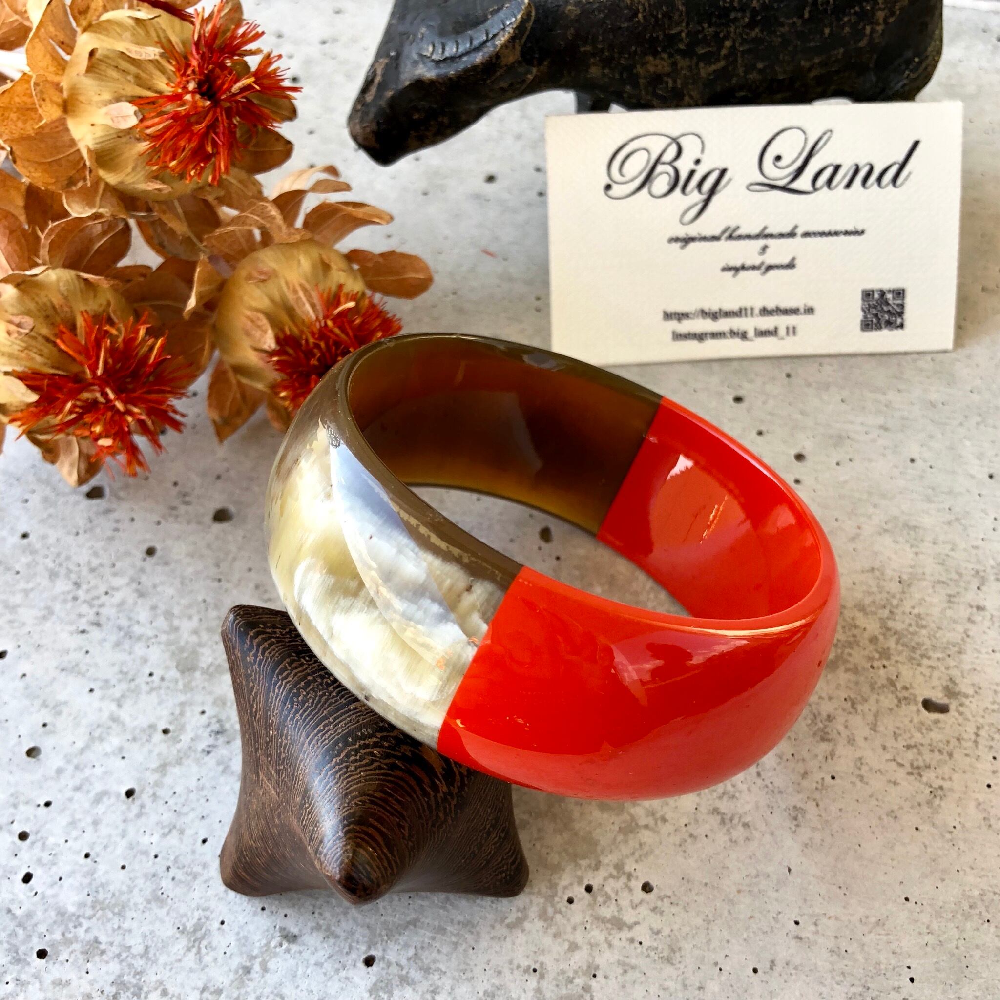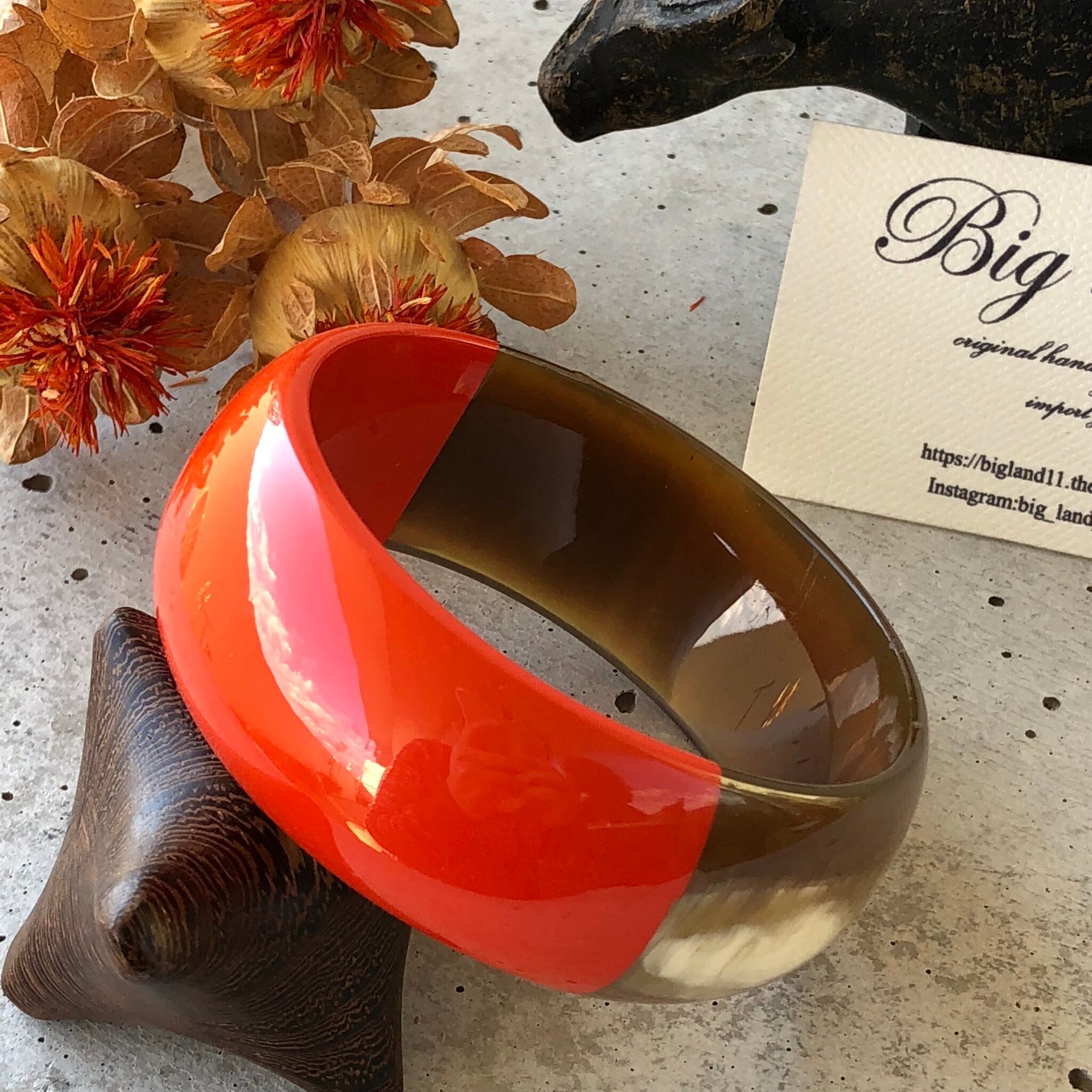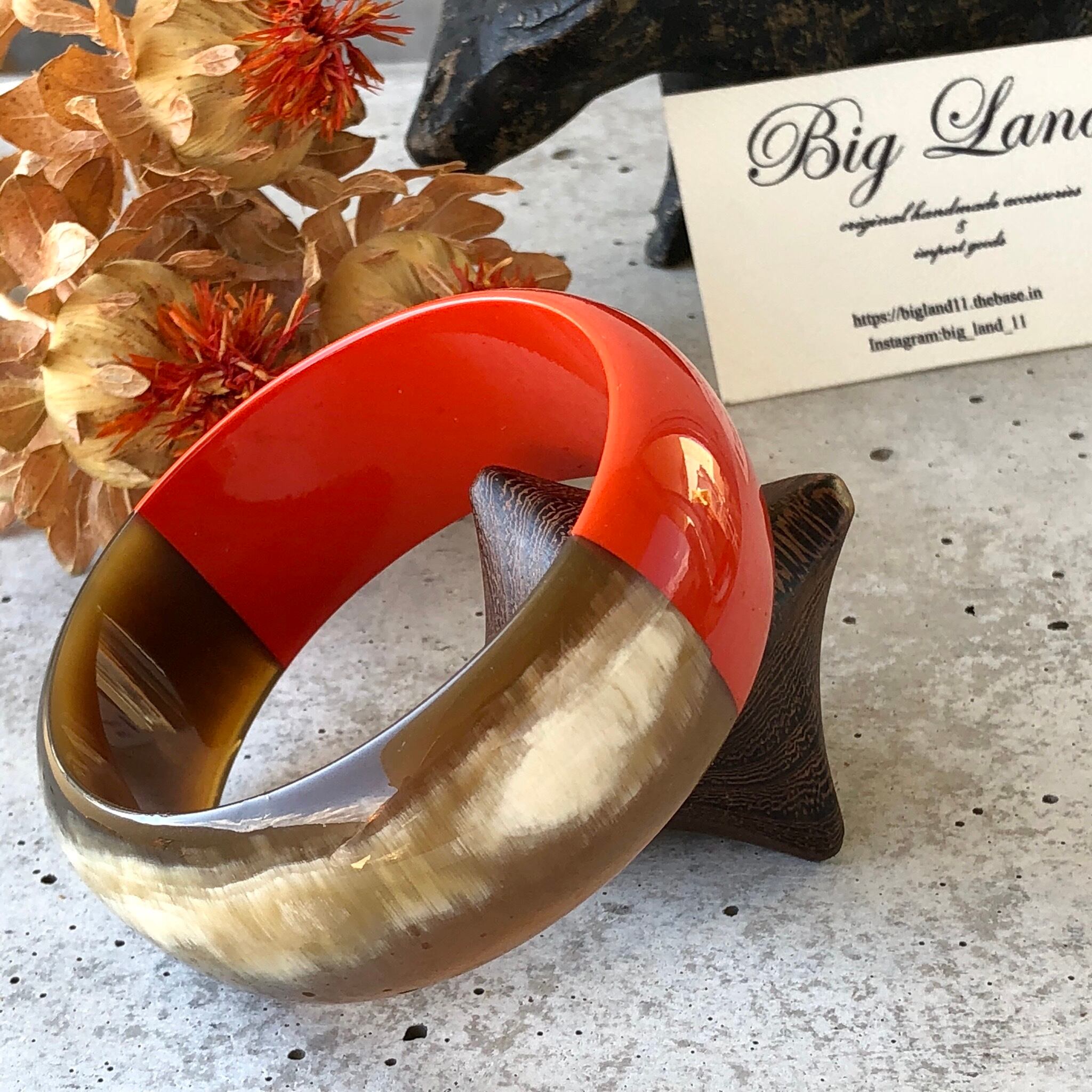 天然の水牛に朱色の漆塗りは元気が出そうなビビットカラー✨秋冬は暗い色のお洋服が多くなりますので、手元がパッと明るくなりワンポイントのオシャレに役立ちます‼️ニットカットソー等お洋服の上からも装着でき個性が光ります✨