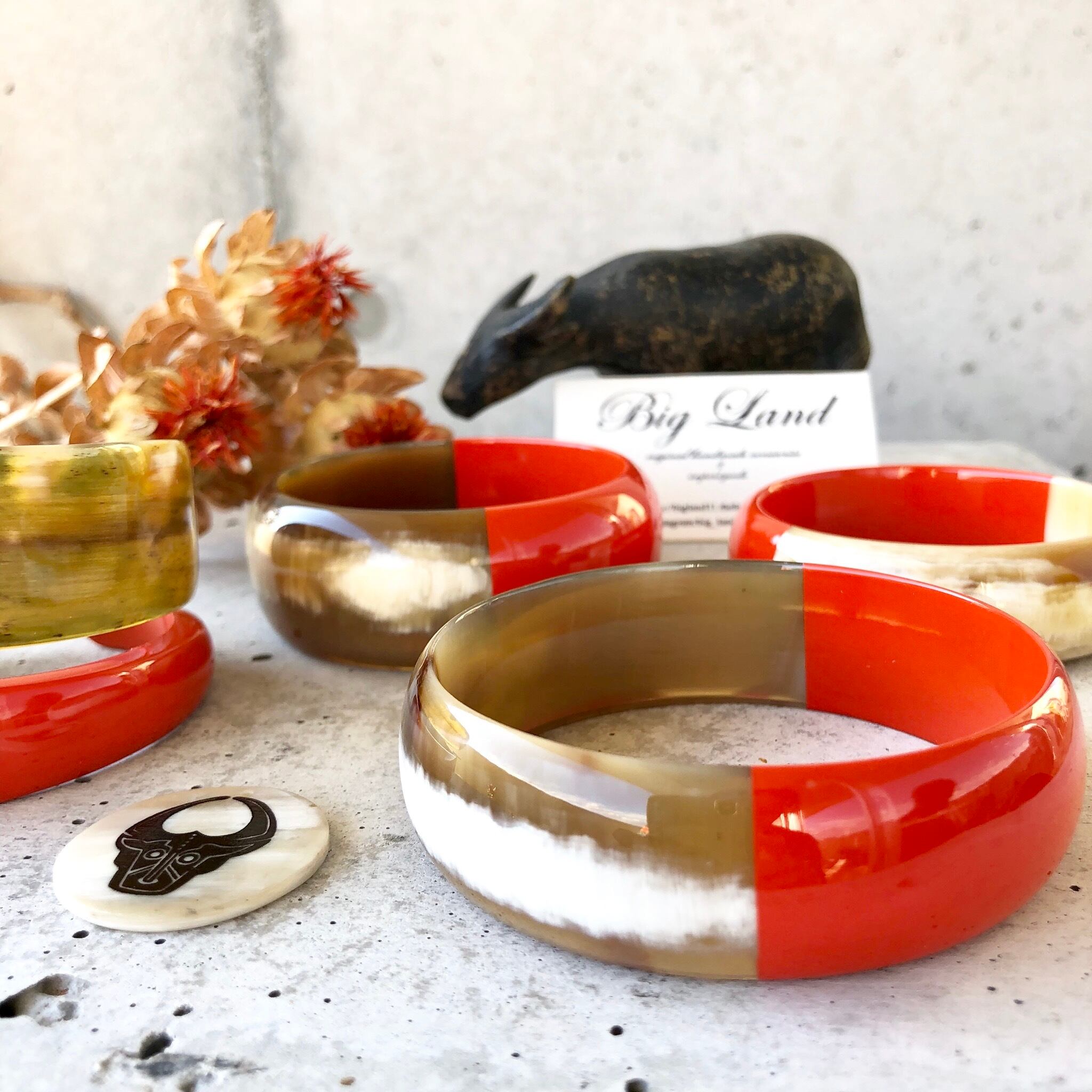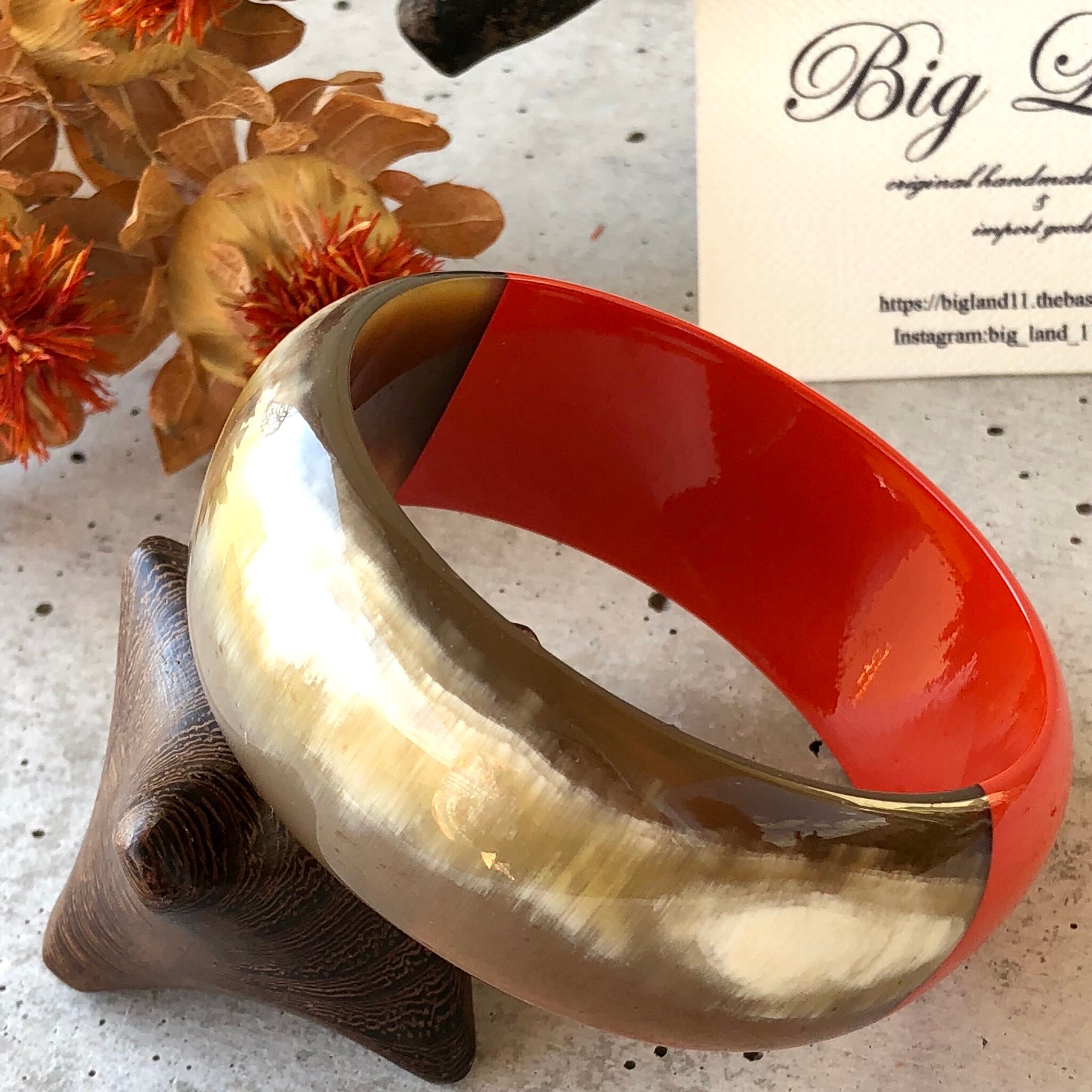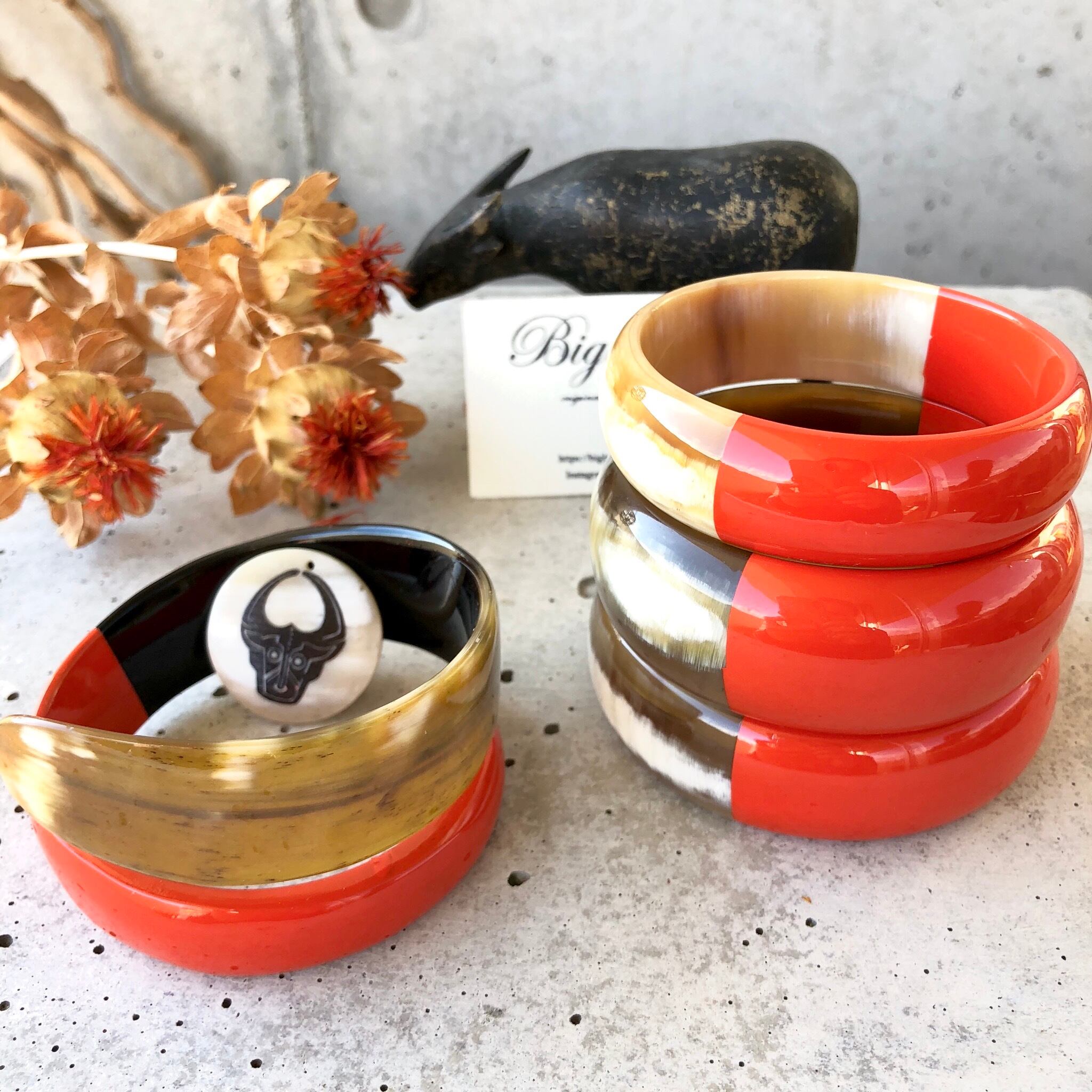 天然の水牛に朱色の漆塗りは元気が出そうなビビットカラー✨秋冬は暗い色のお洋服が多くなりますので、手元がパッと明るくなりワンポイントのオシャレに役立ちます‼️ニットカットソー等お洋服の上からも装着でき個性が光ります✨