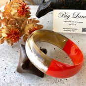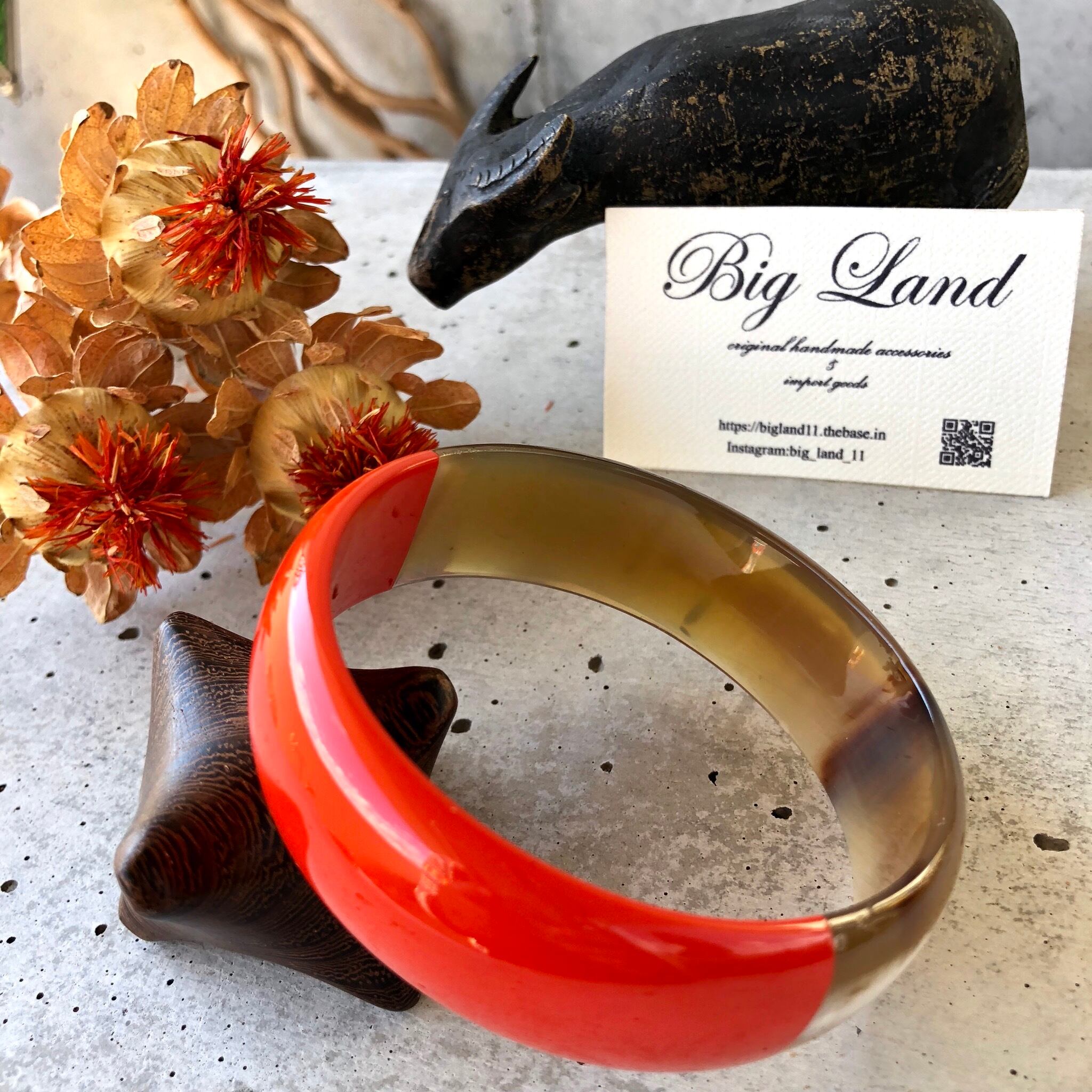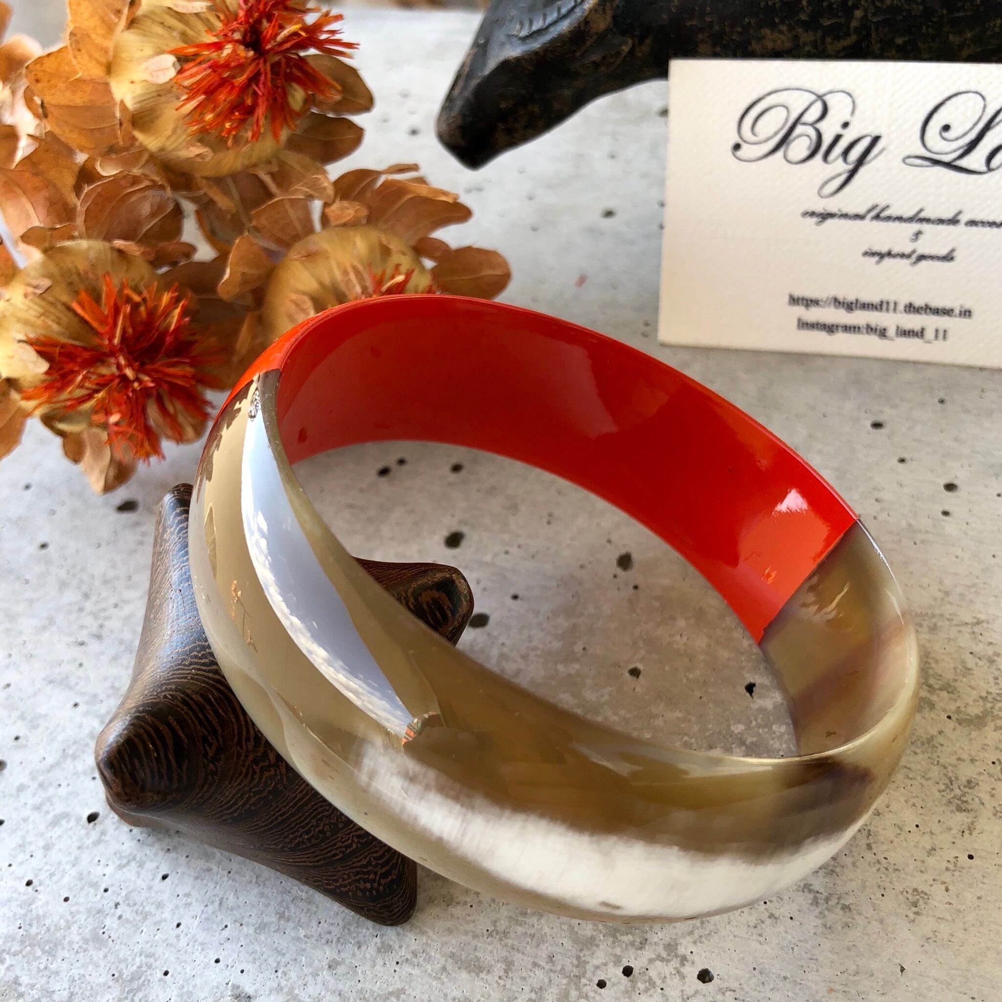 天然の水牛に朱色の漆塗りは元気が出そうなビビットカラー✨秋冬は暗い色のお洋服が多くなりますので、手元がパッと明るくなりワンポイントのオシャレに役立ちます‼️ニットカットソー等お洋服の上からも装着でき個性が光ります✨