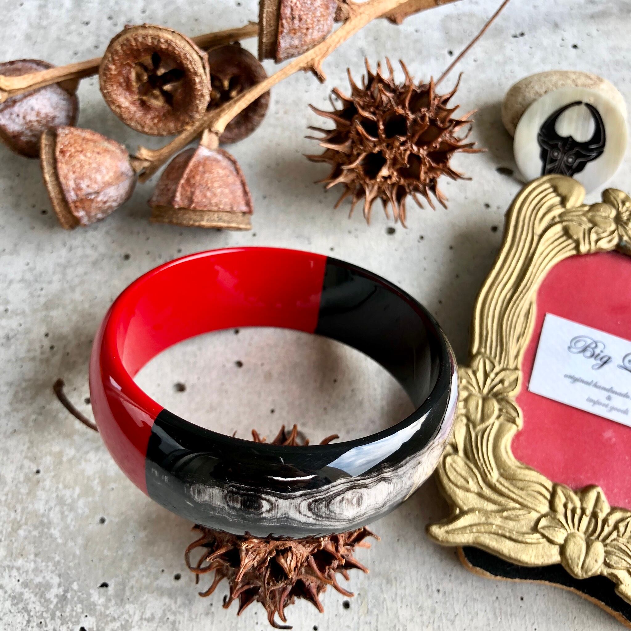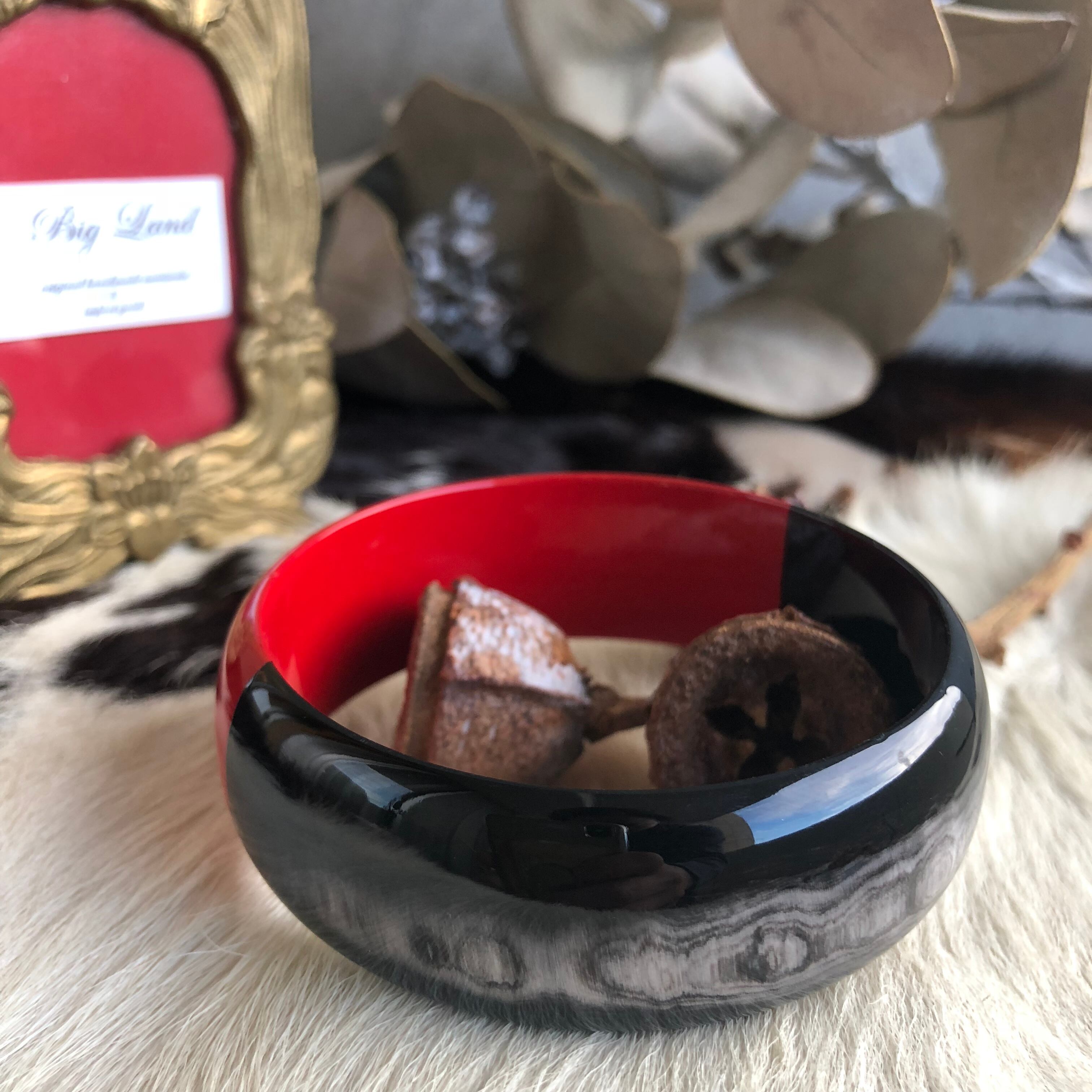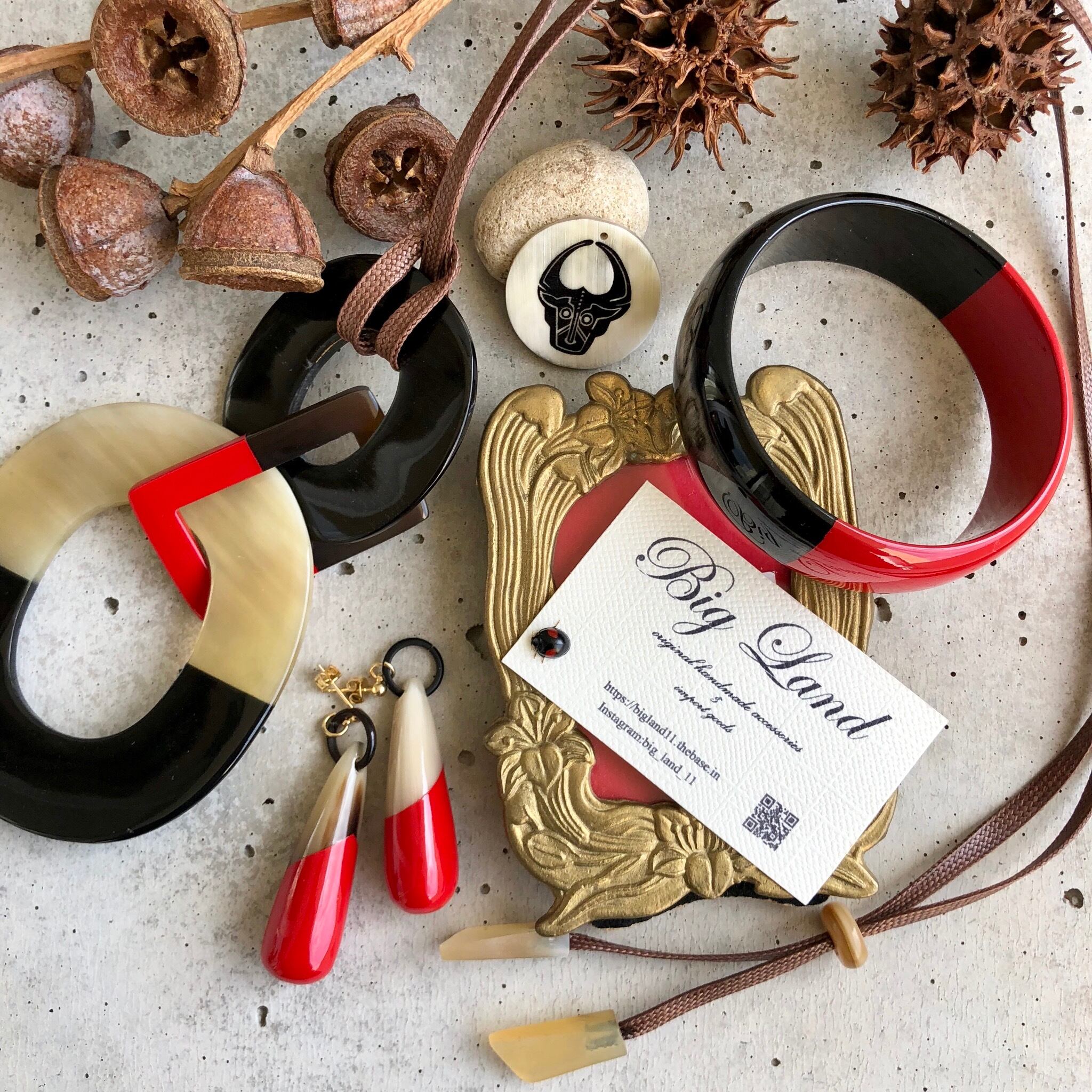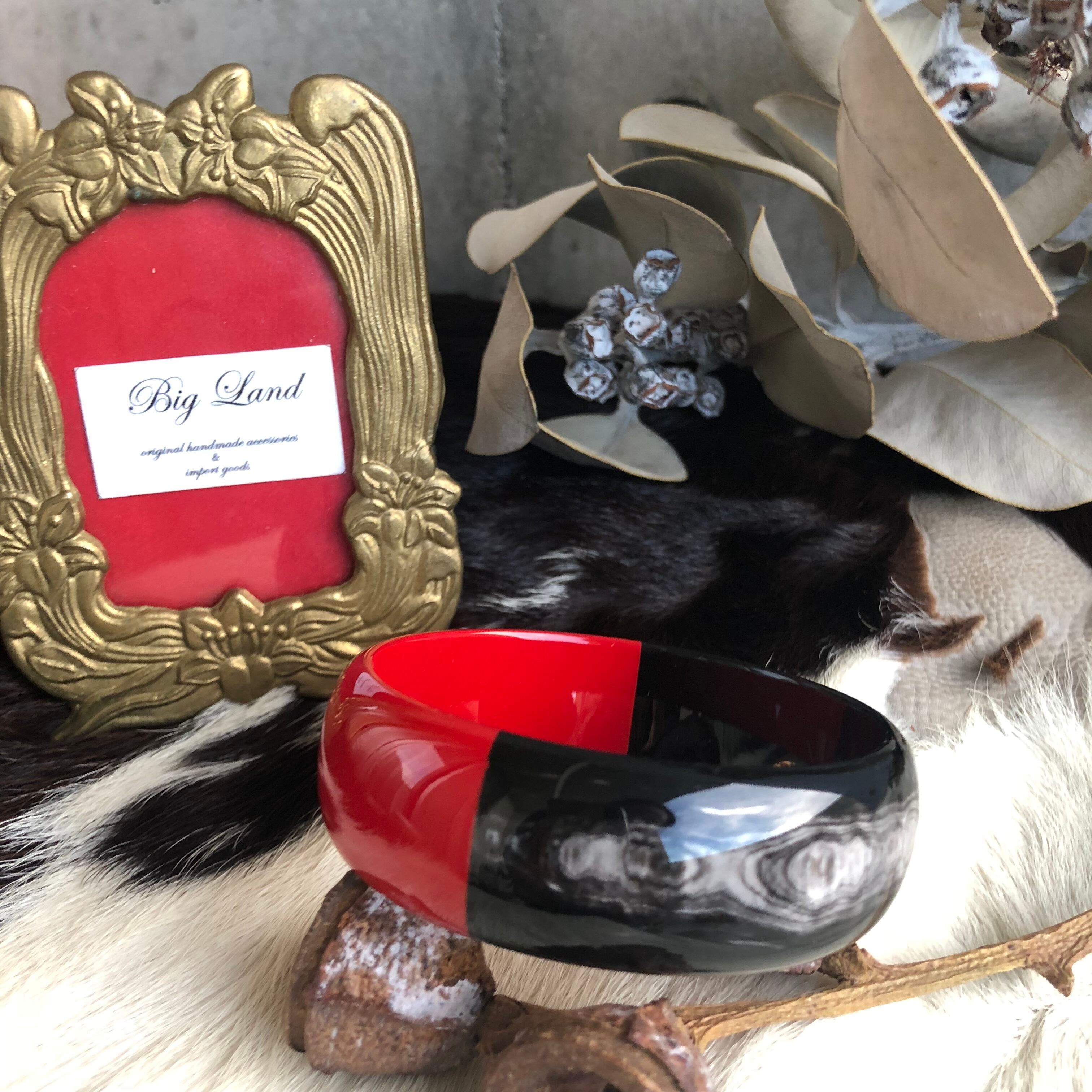 天然の水牛に赤色の漆塗りは元気が出そうなビビットカラー✨秋冬は暗い色のお洋服が多くなりますので、手元がパッと明るくなりワンポイントのオシャレに役立ちます‼️ニットカットソー等お洋服の上からも装着でき個性が光ります✨