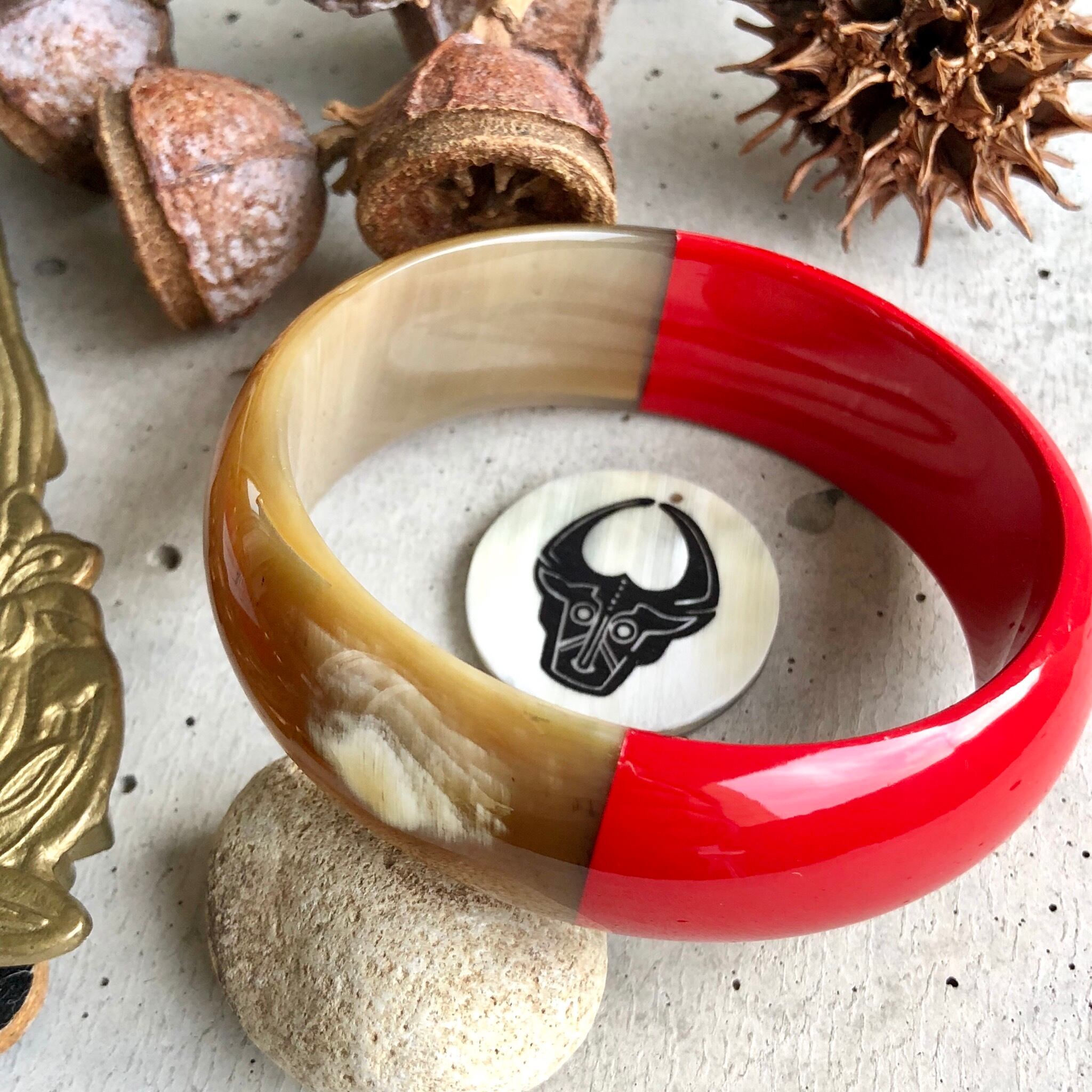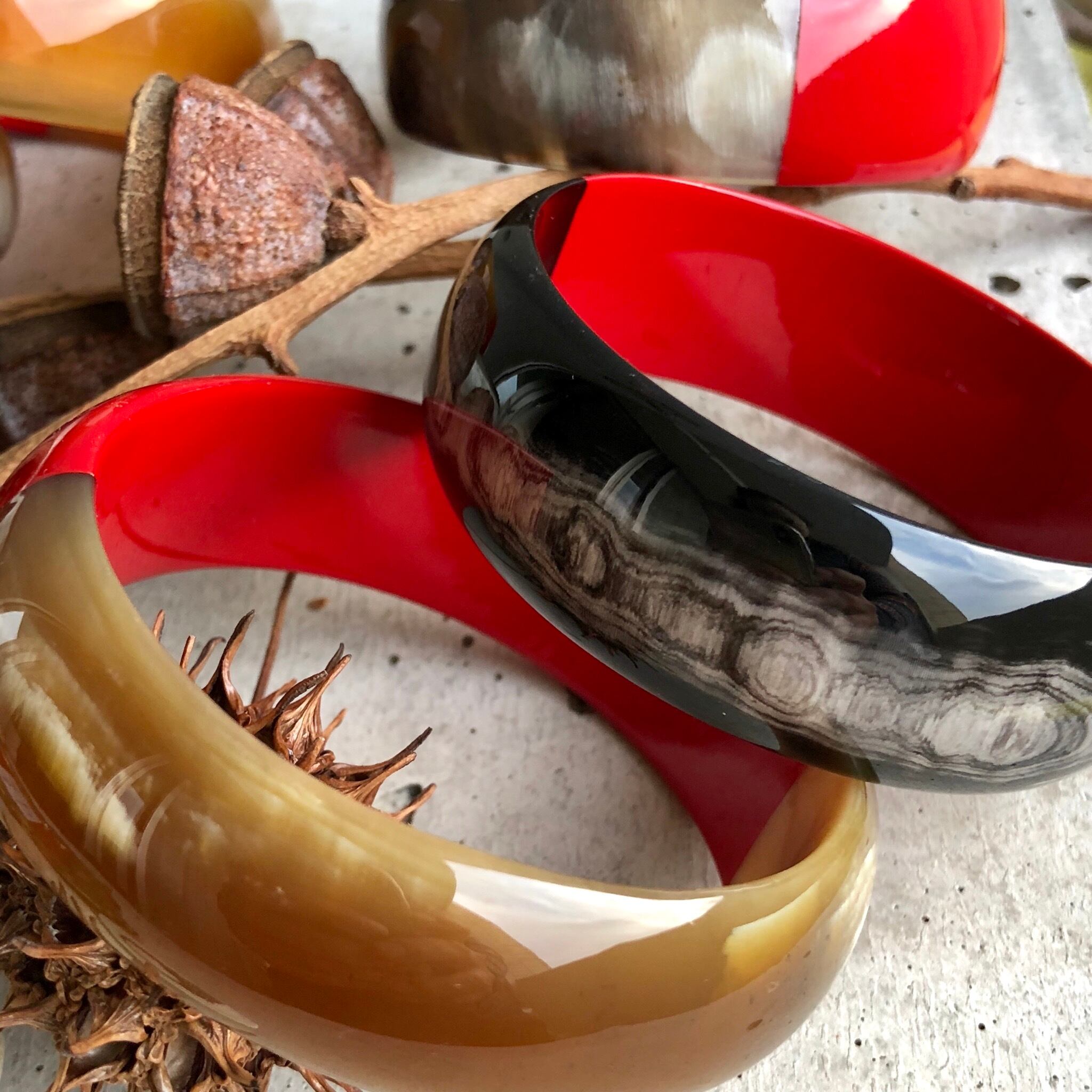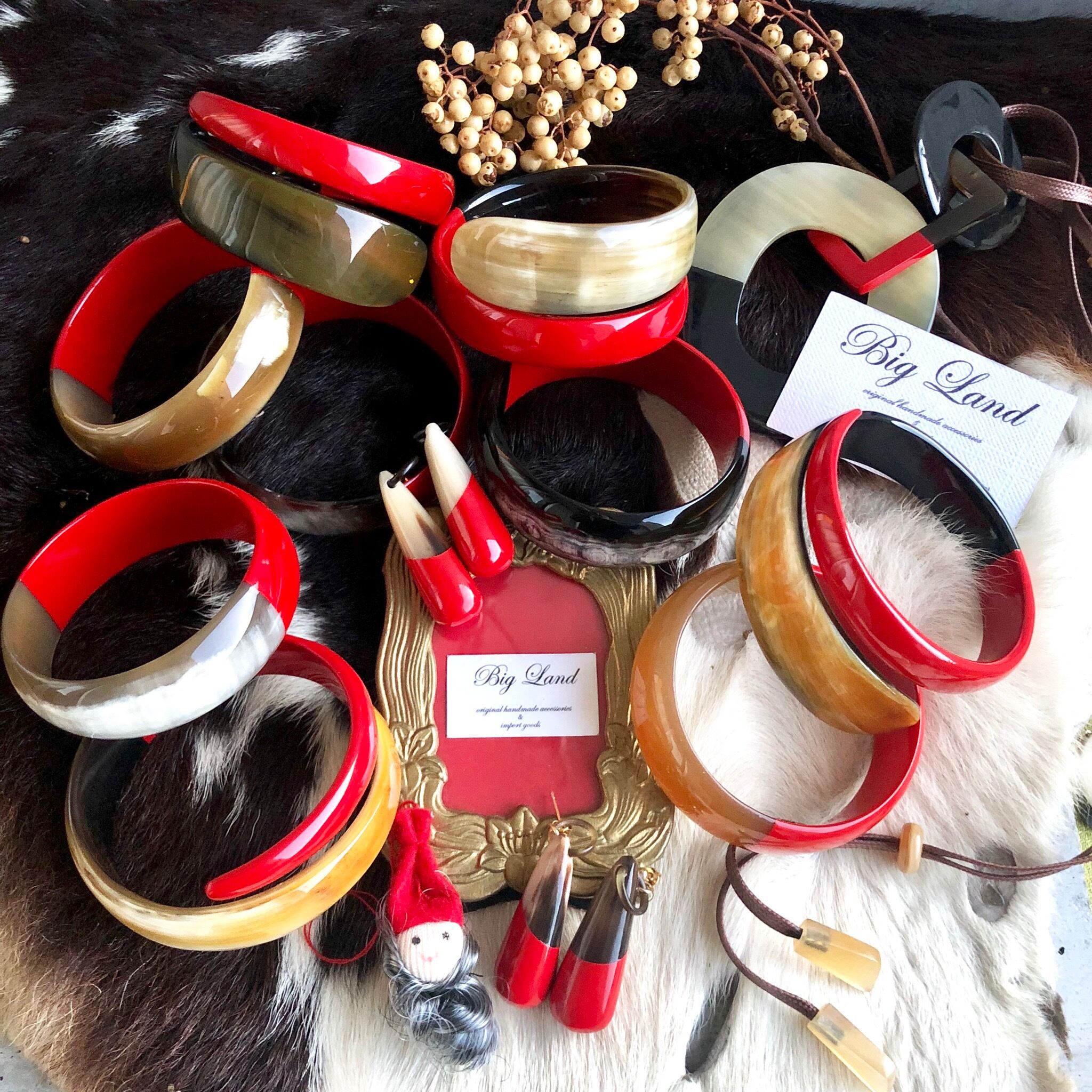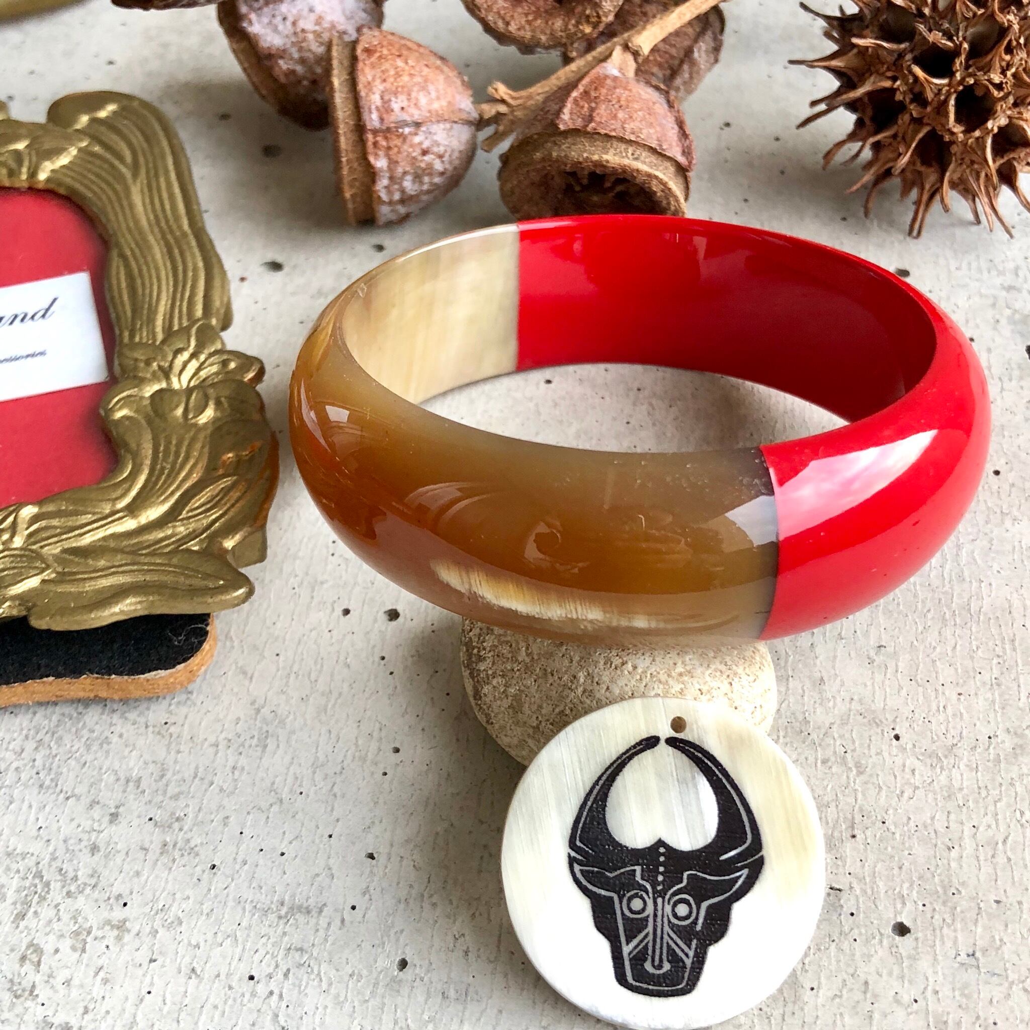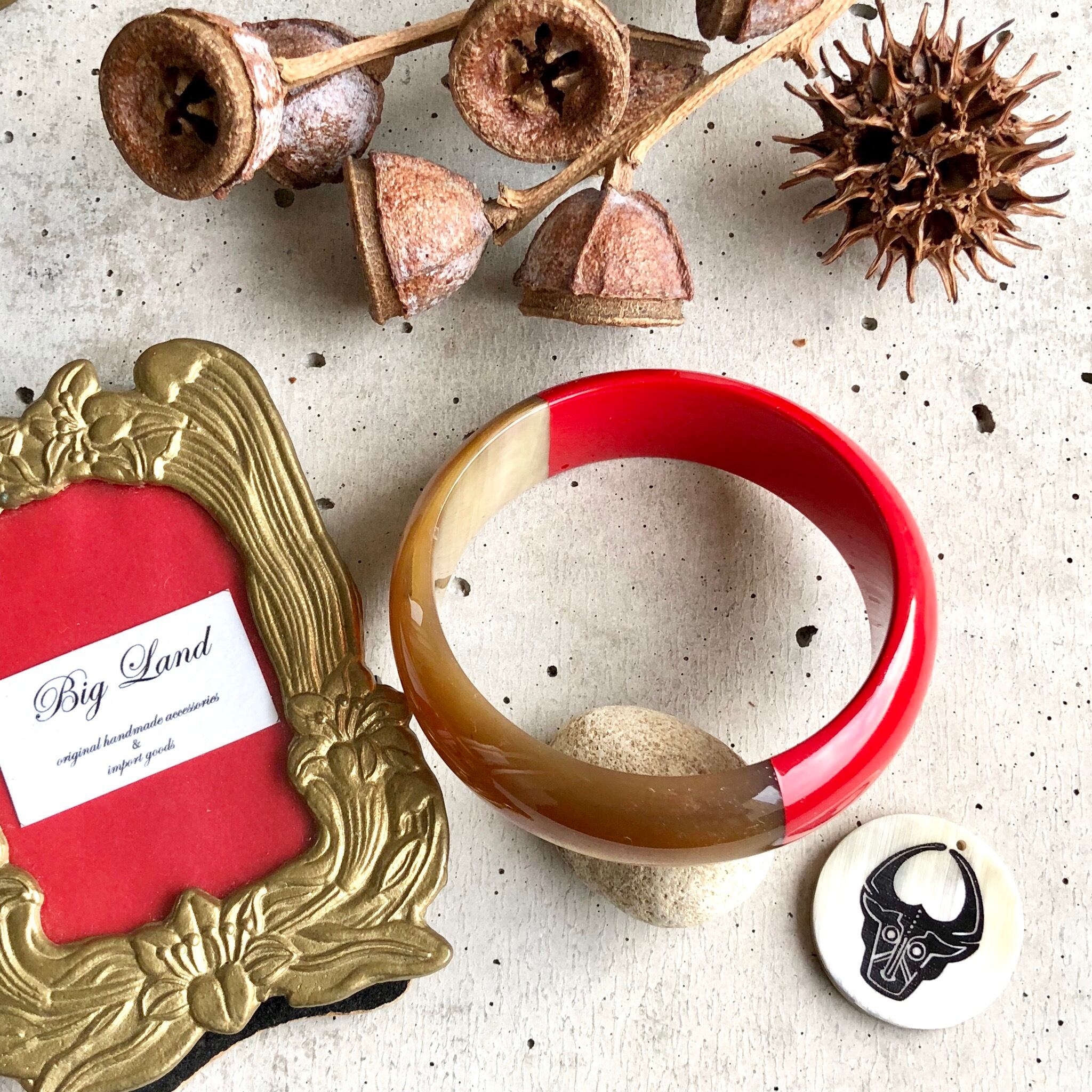 天然の水牛に赤色の漆塗りは元気が出そうなビビットカラー✨秋冬は暗い色のお洋服が多くなりますので、手元がパッと明るくなりワンポイントのオシャレに役立ちます‼️ニットカットソー等お洋服の上からも装着でき個性が光ります✨