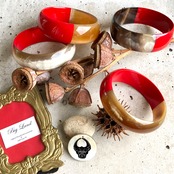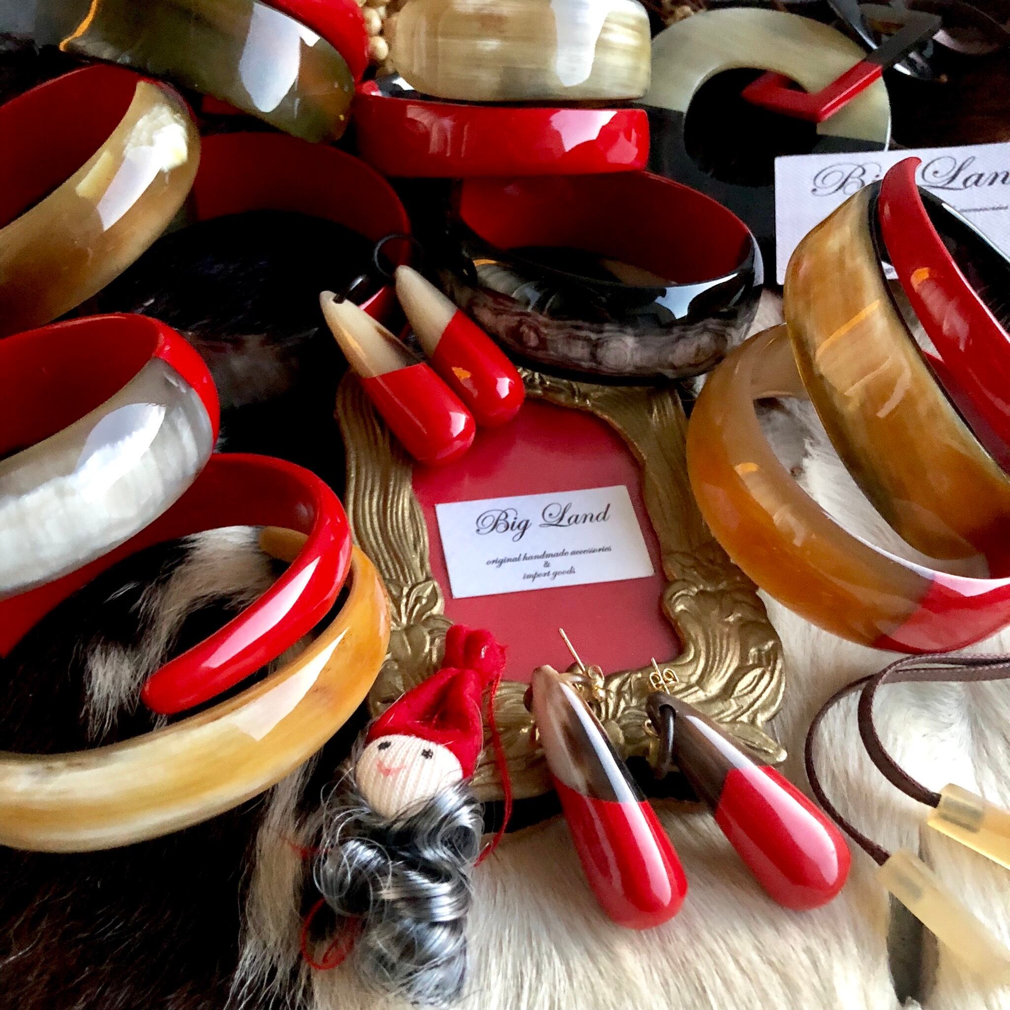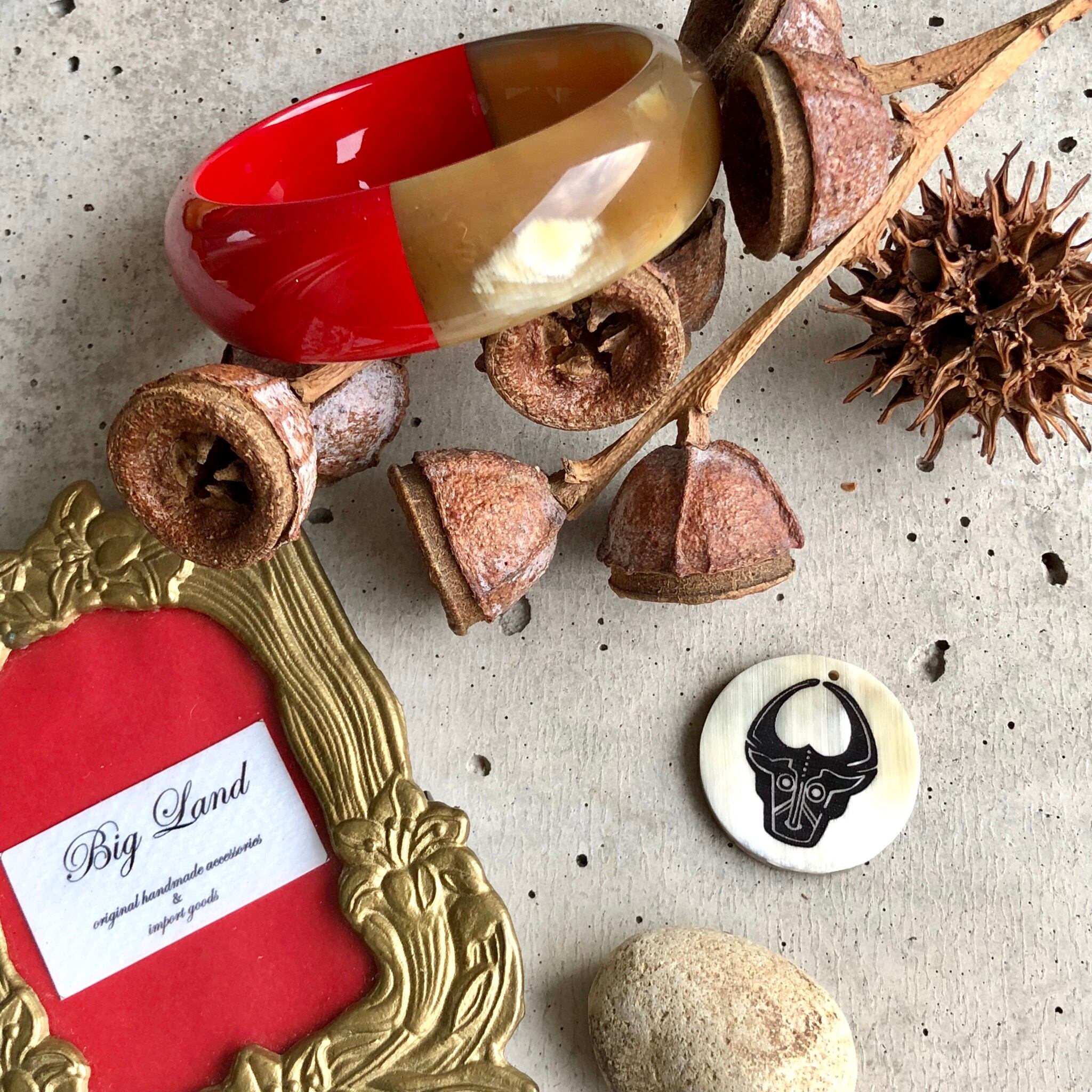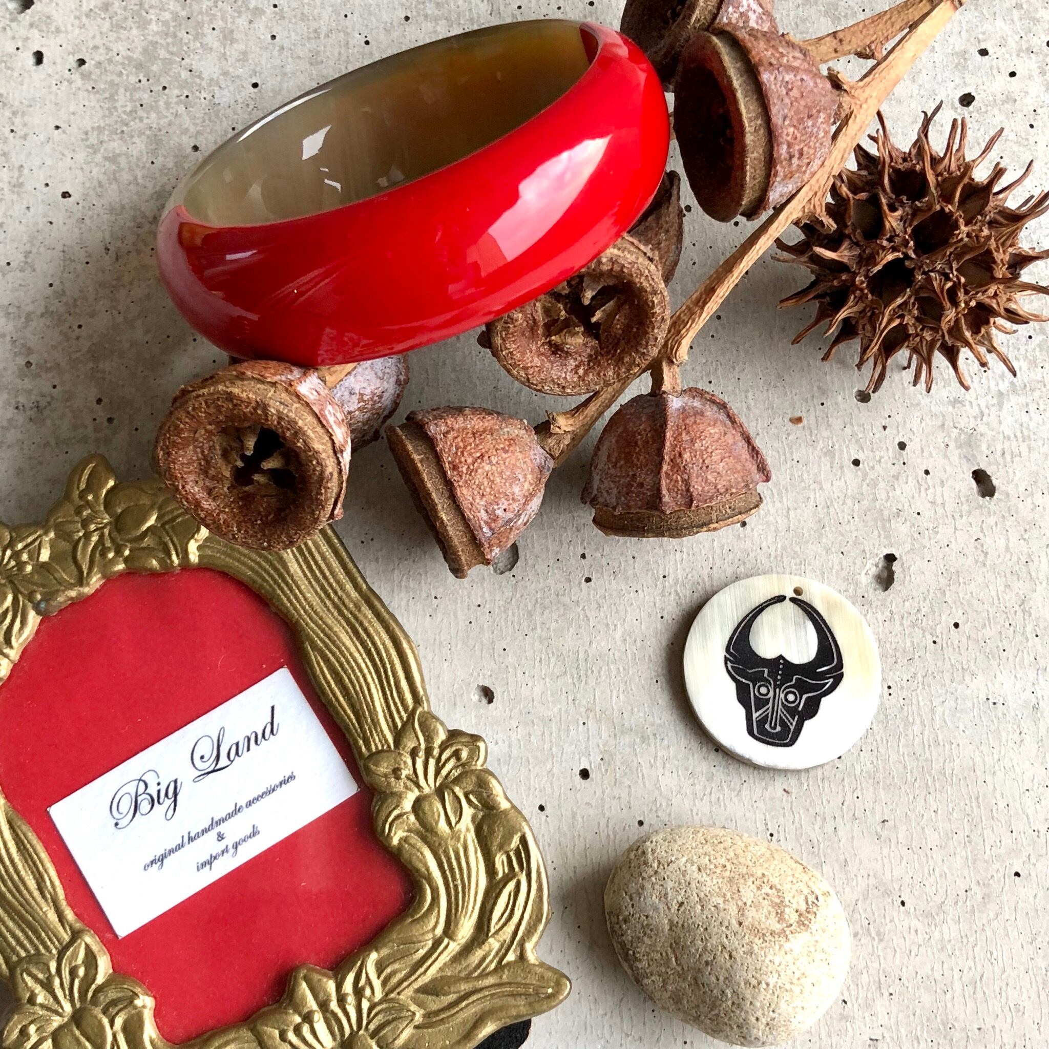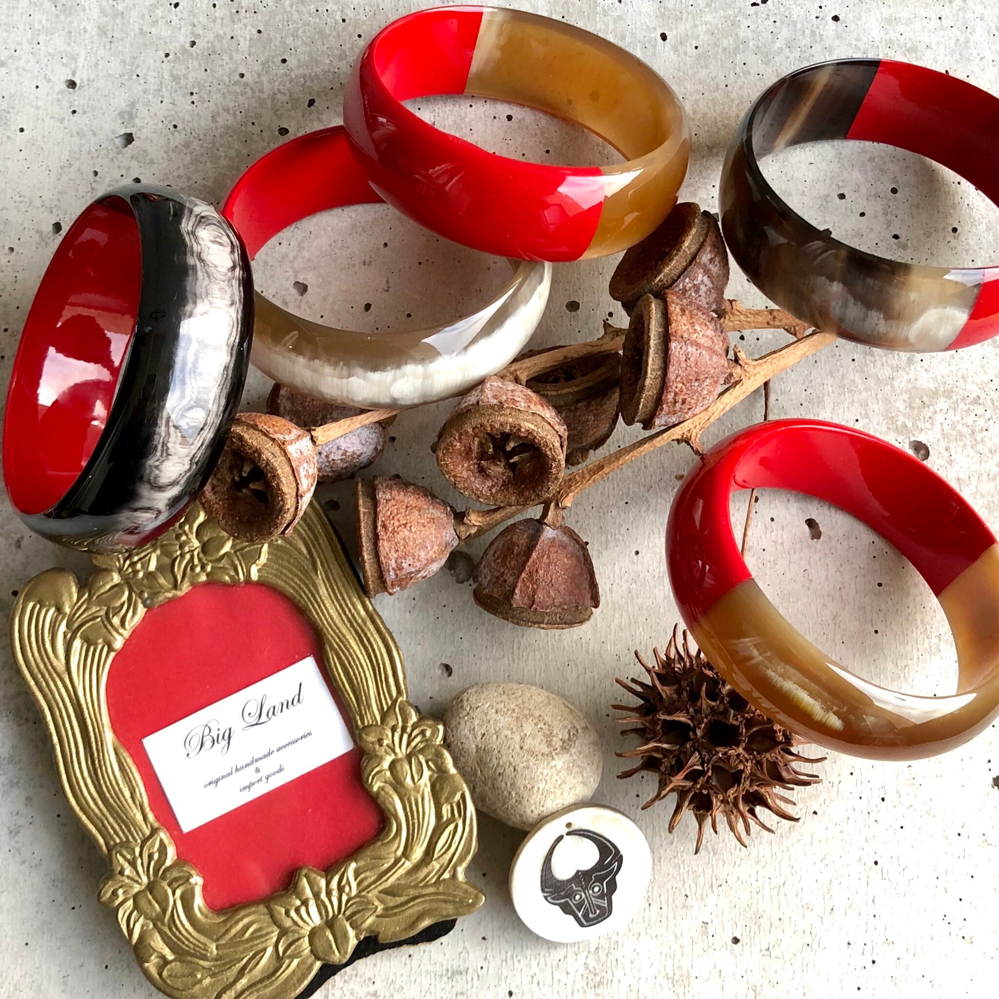 天然の水牛に赤色の漆塗りは元気が出そうなビビットカラー✨秋冬は暗い色のお洋服が多くなりますので、手元がパッと明るくなりワンポイントのオシャレに役立ちます‼️ニットカットソー等お洋服の上からも装着でき個性が光ります✨