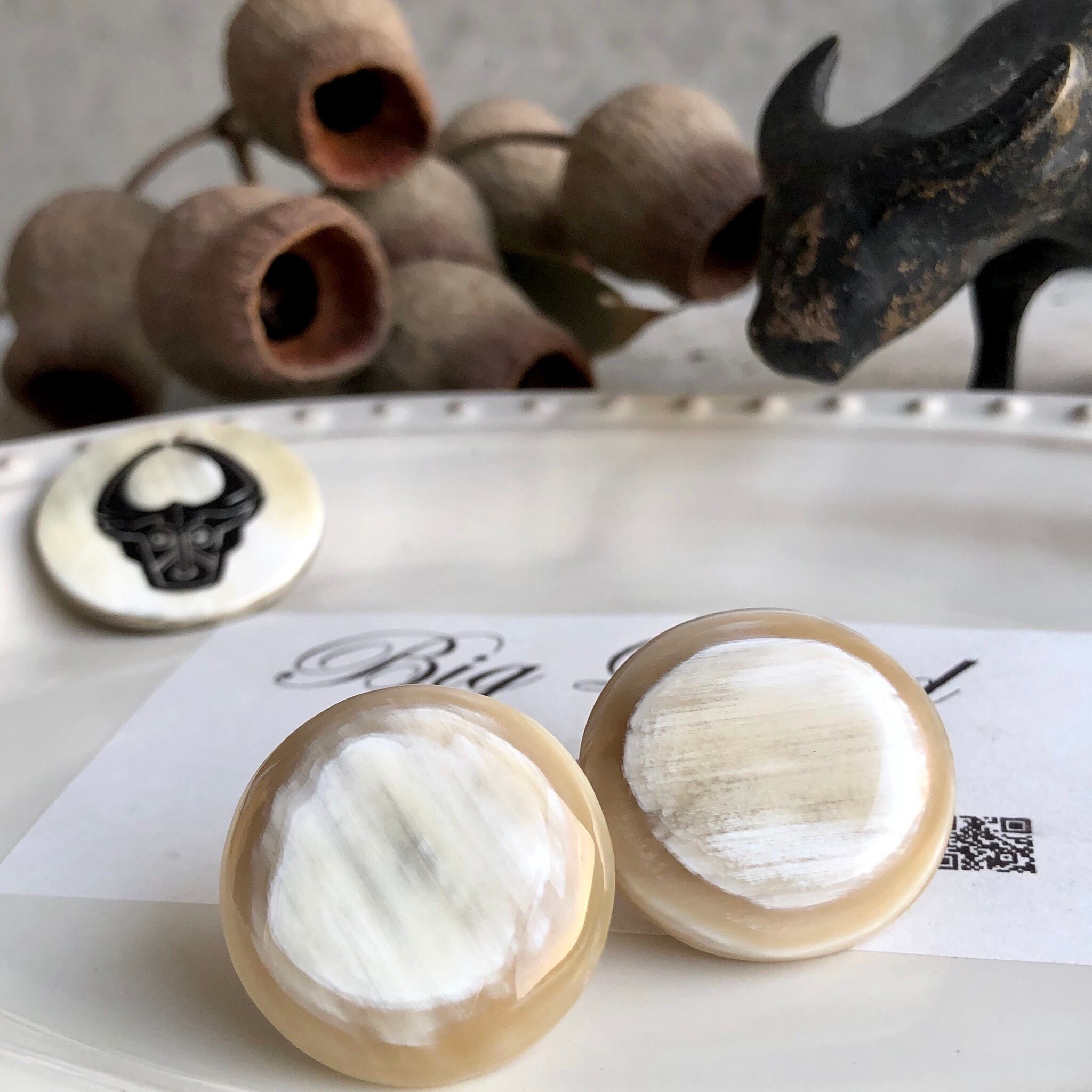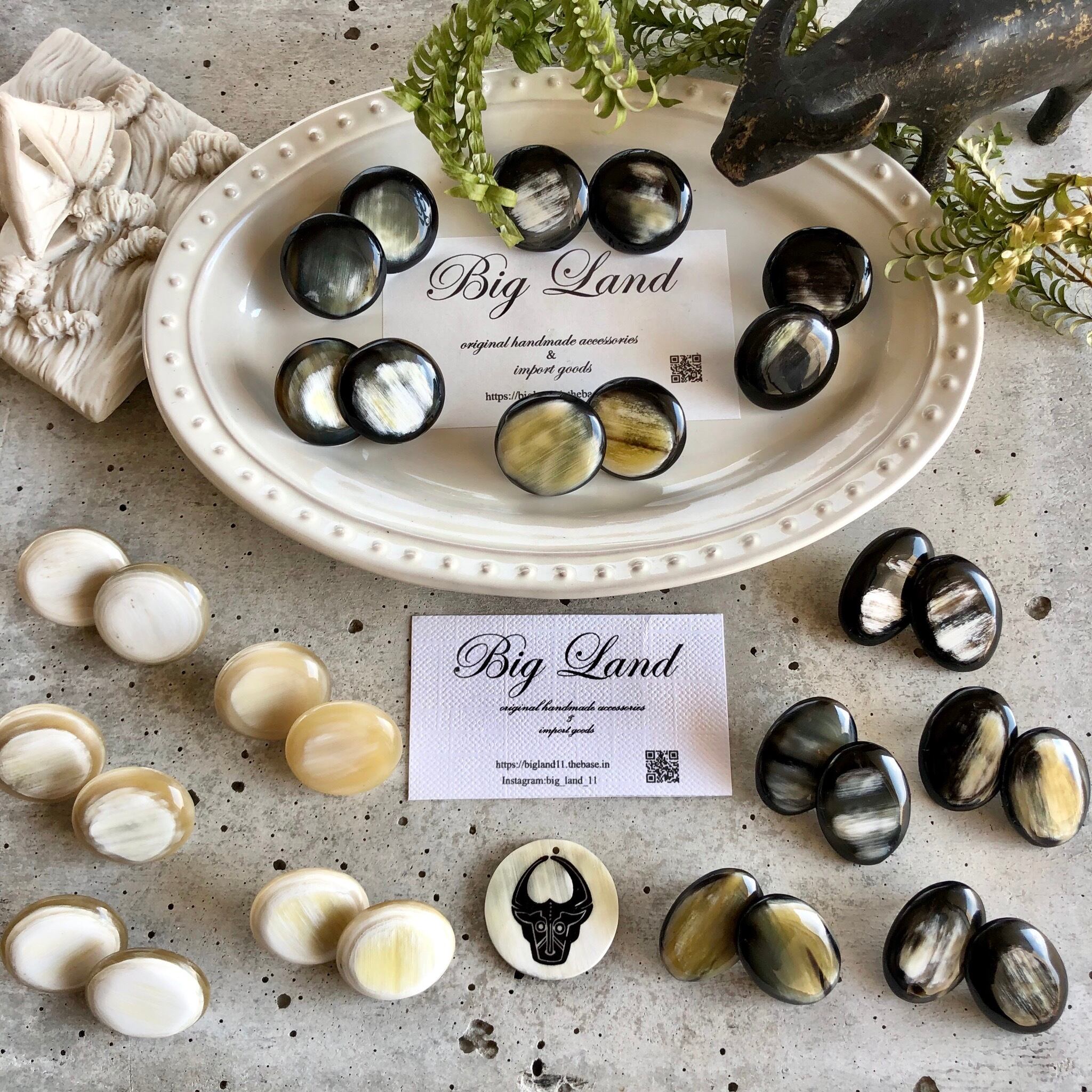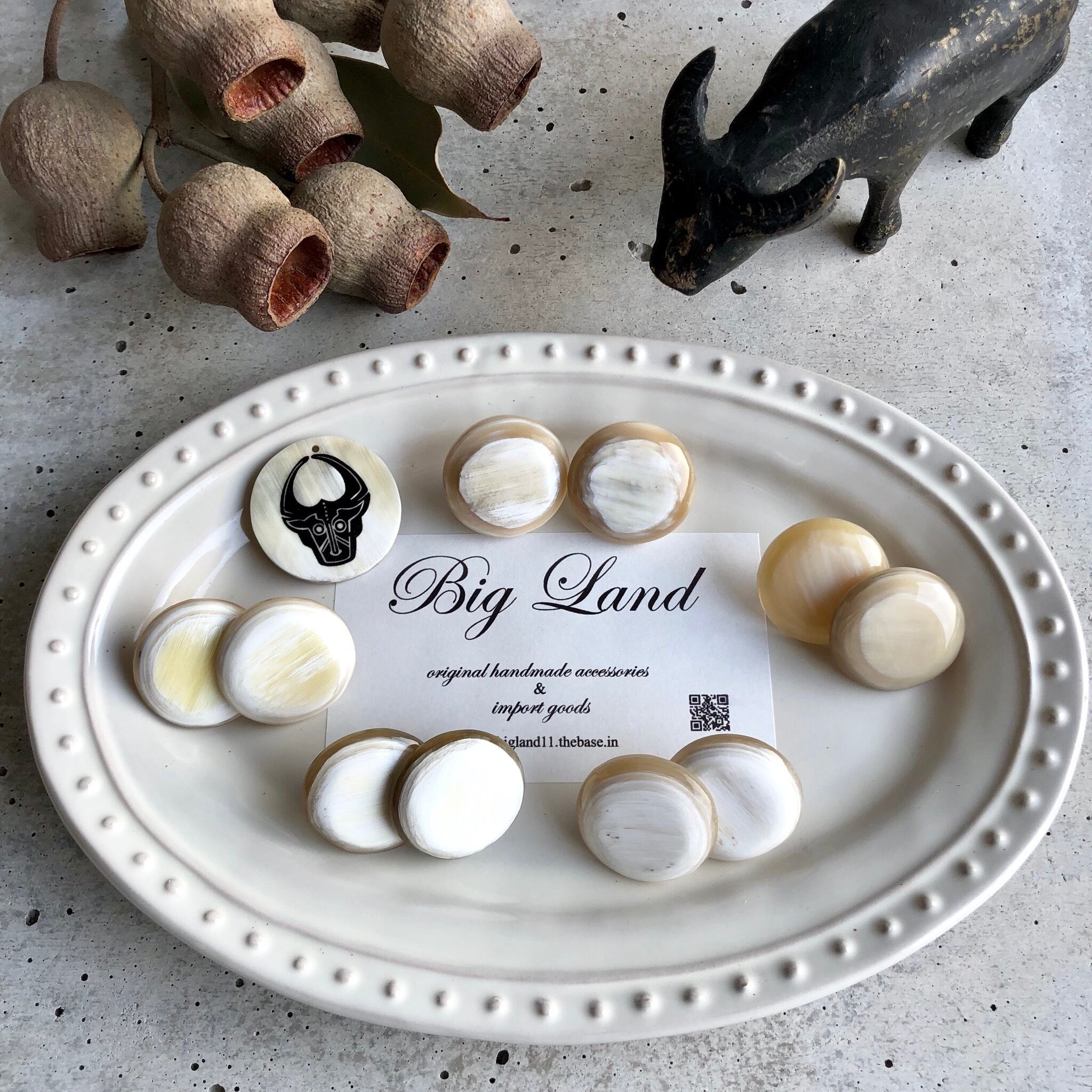 耳元でパッと明るくなる上品な色合いで、水牛角の一点ものならではの柄がとても美しく、卒業式や入学式等フォーマルコーデとの組み合わせにもお使いできます‼️