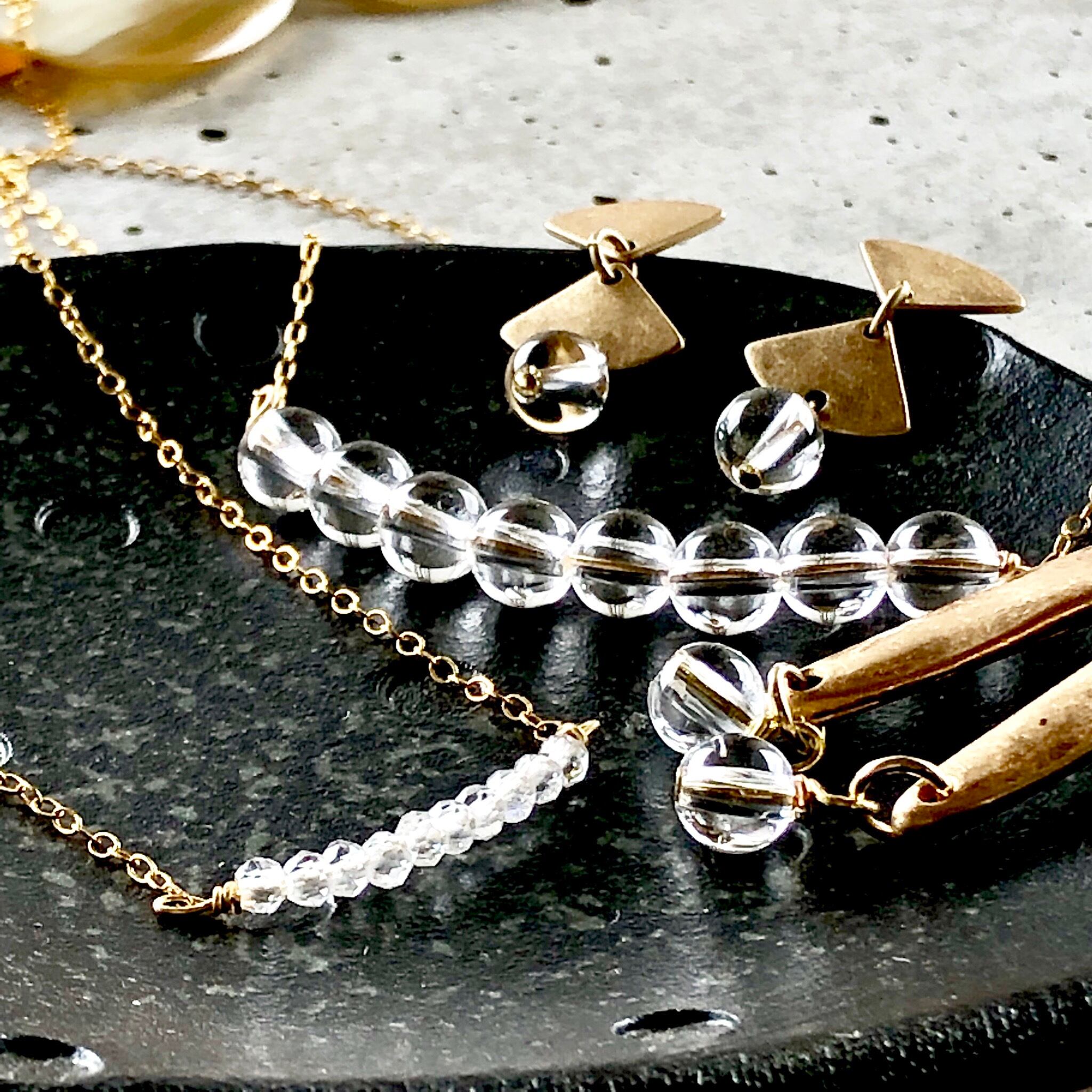 マットゴールドの地金と小粒水晶を組み合わせ、個性的に仕上げた一押しデザイン✨