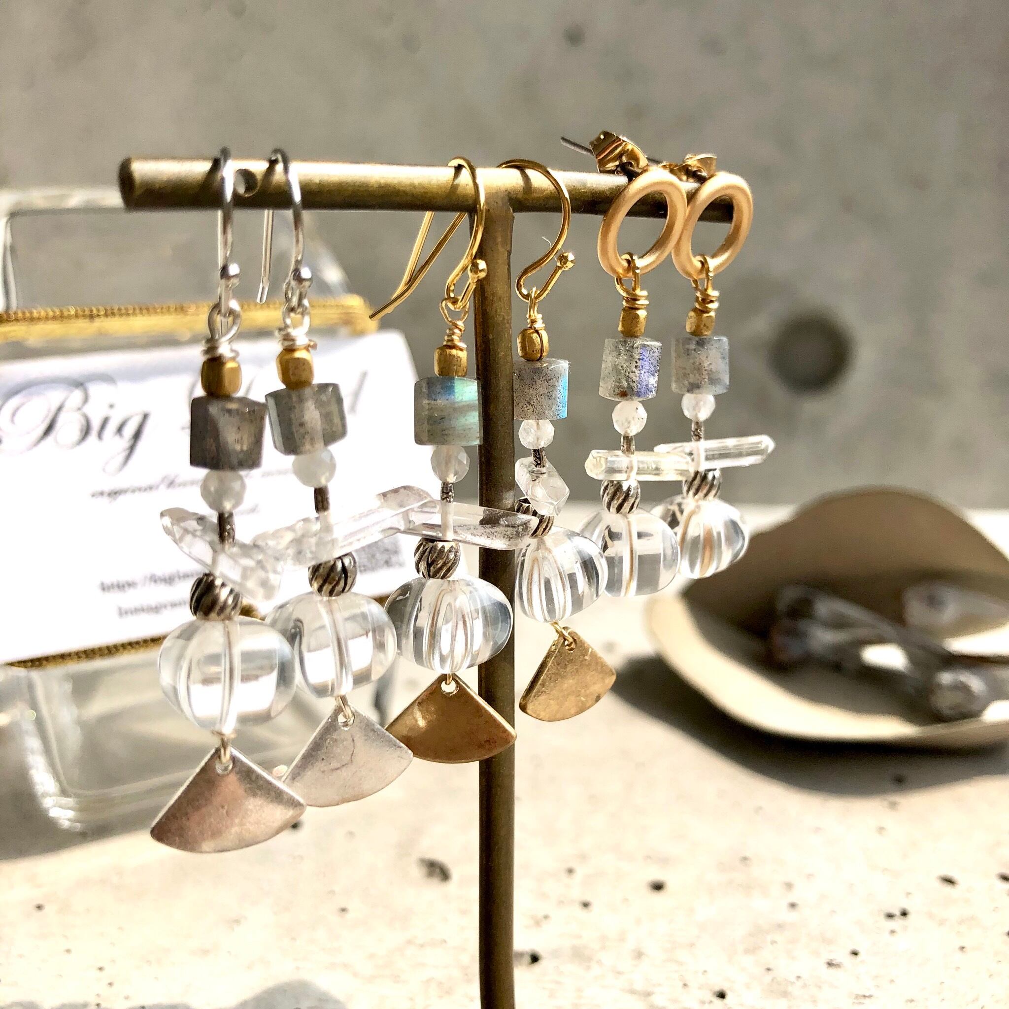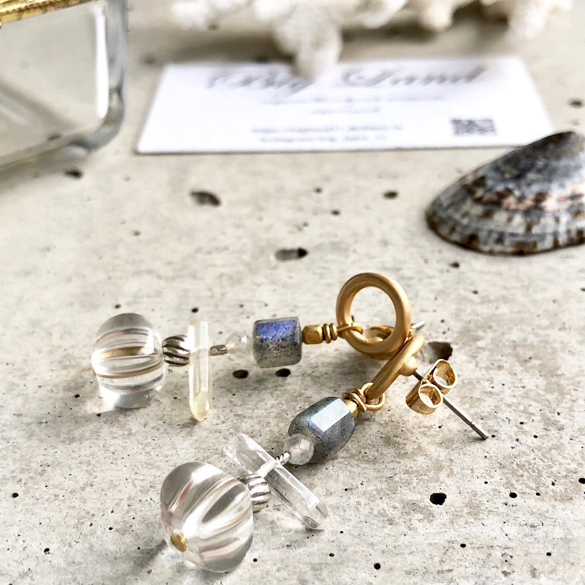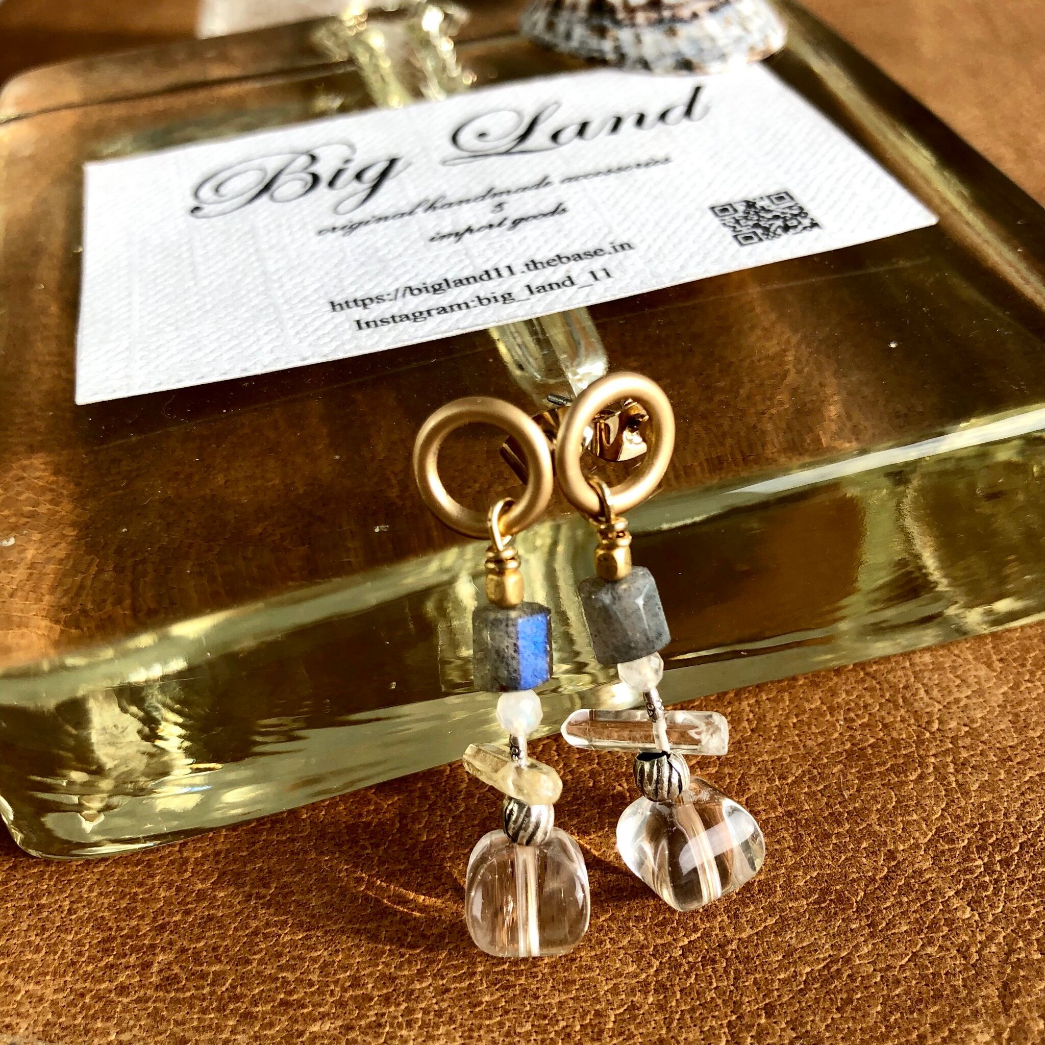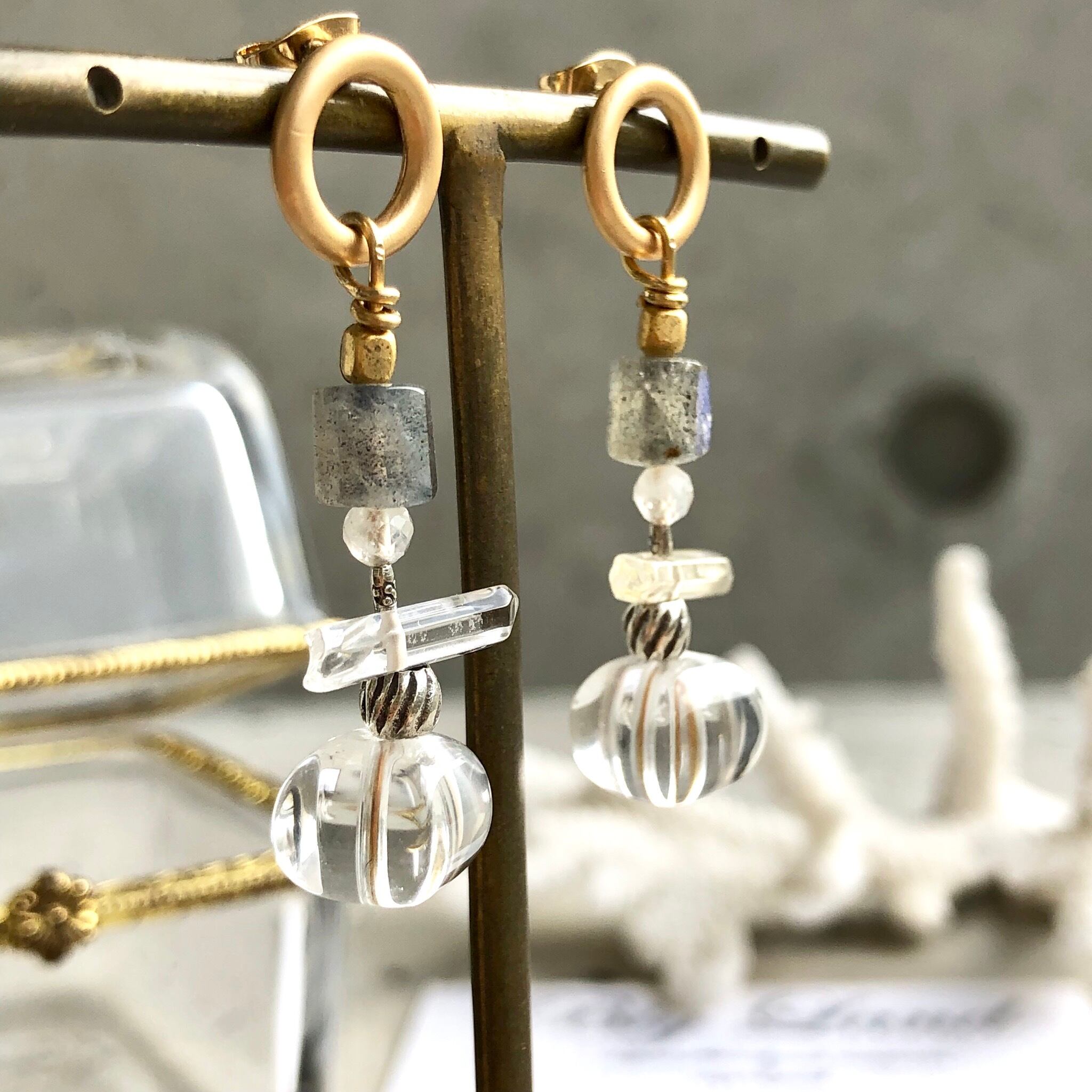 水晶、ラブラドライト、大変繊細な多面カットのレインボームーンストーン、カレンシルバー等を面白く色々と組み合わせナチュラルでどこか芸術的な雰囲気で洗練されたデザインに仕上げました✨