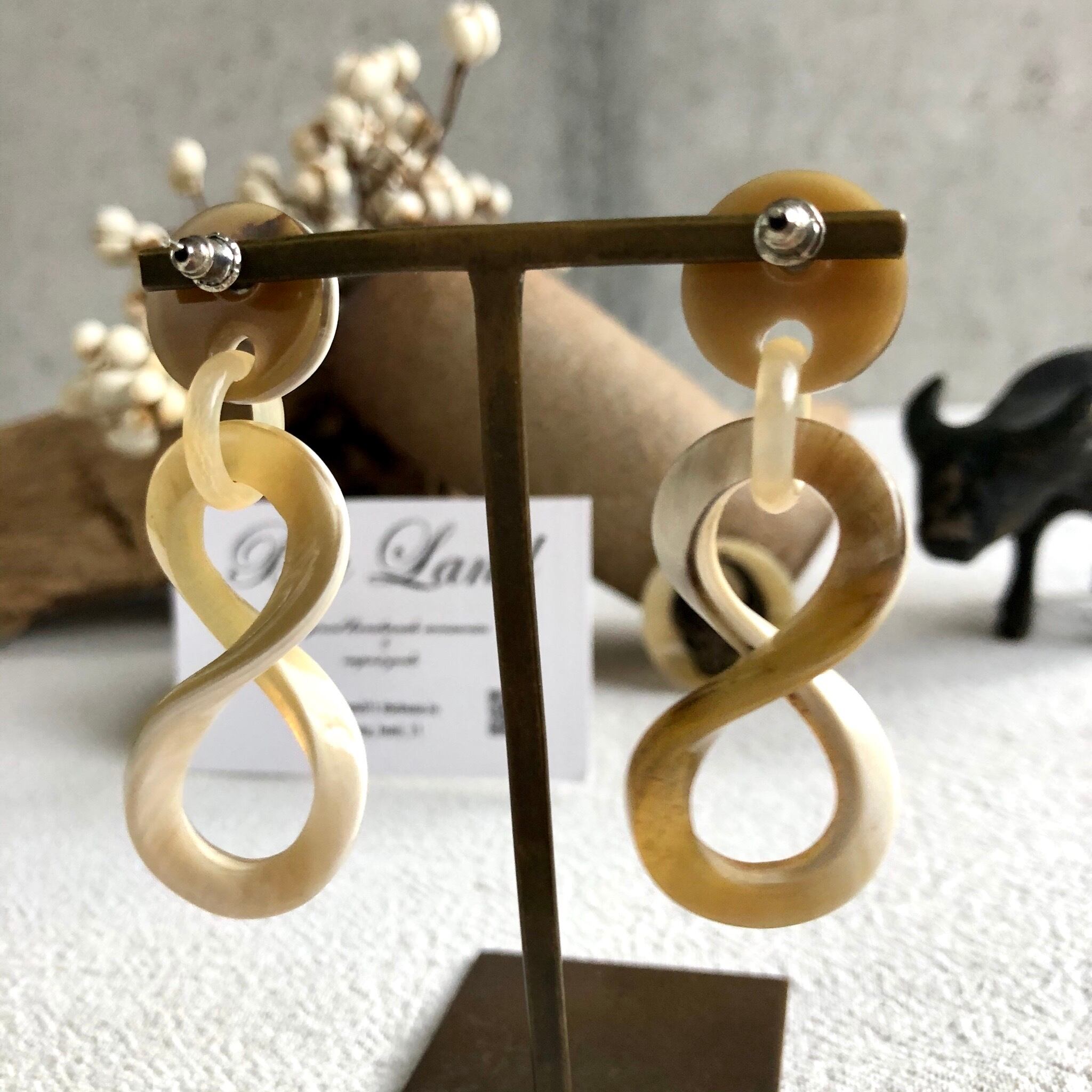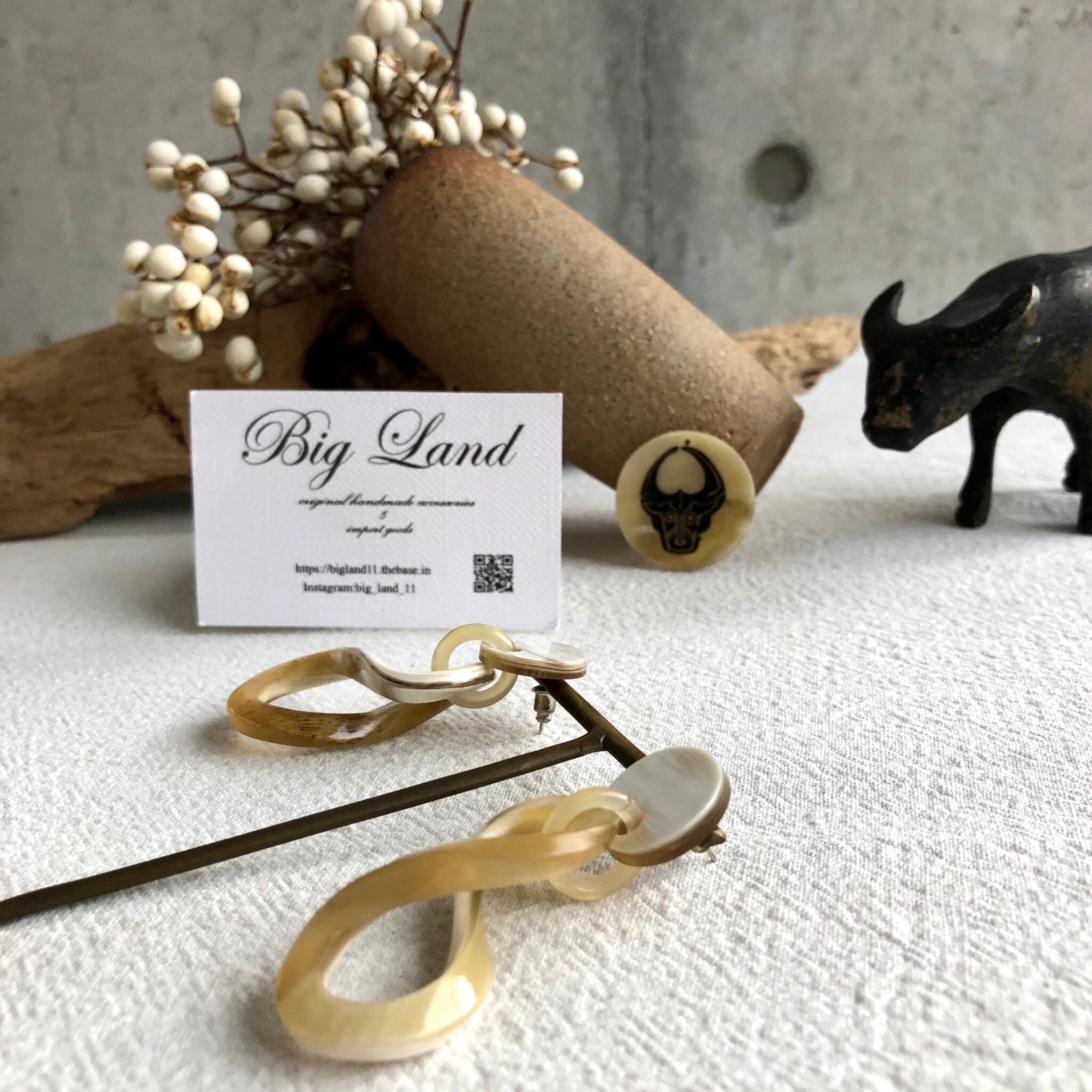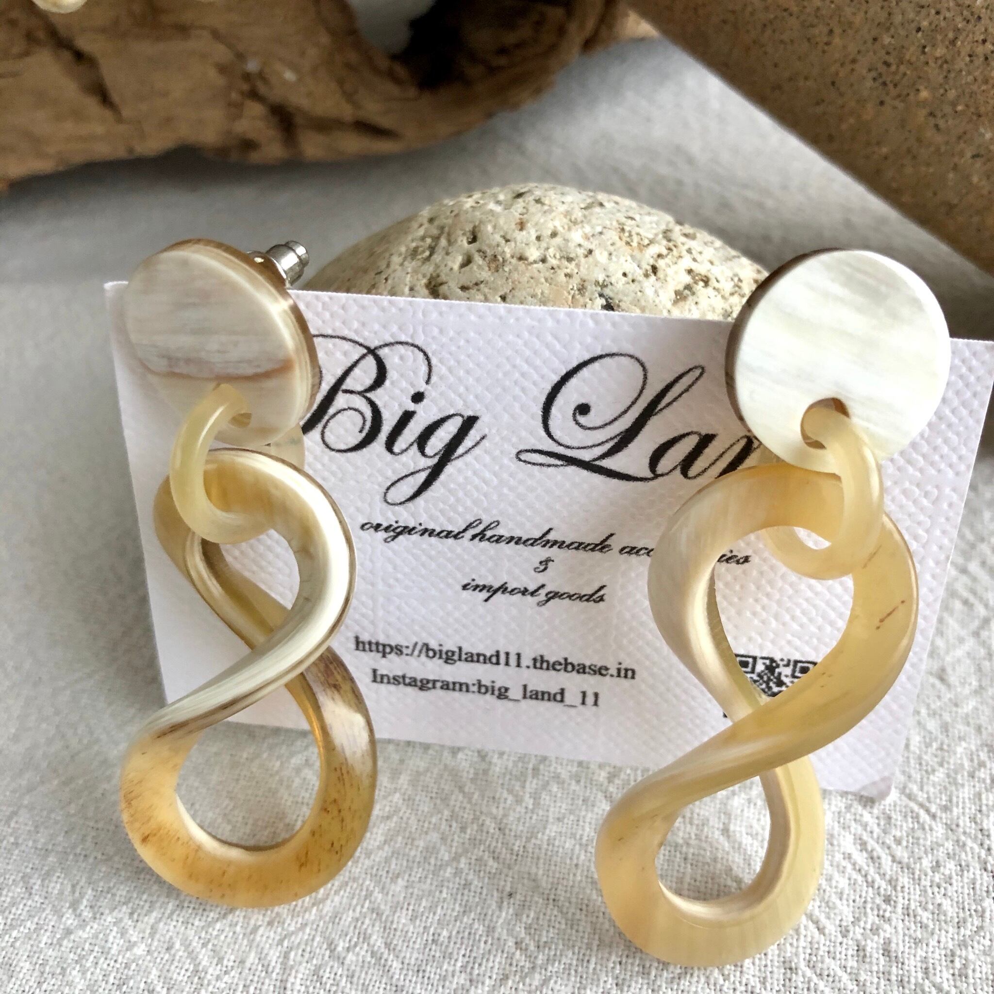 上品な色合いと無限を彷彿するようなモチーフがなんとも言えないデザインで、大ぶりなのに大変軽いのが水牛アクセサリーの特徴です✨