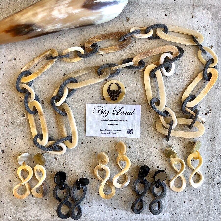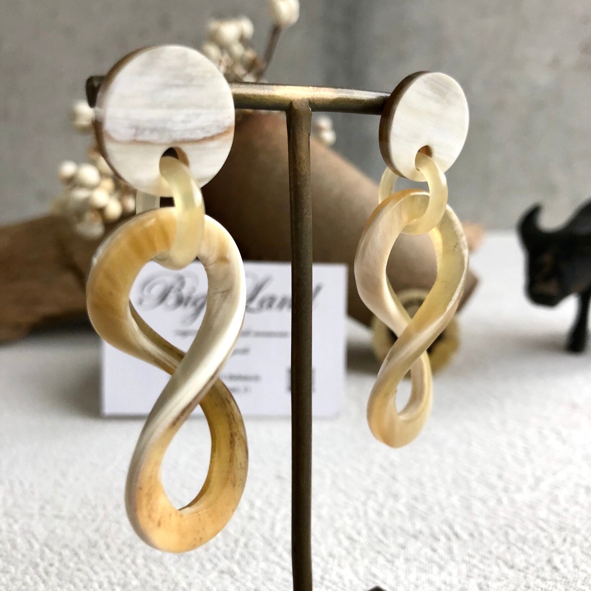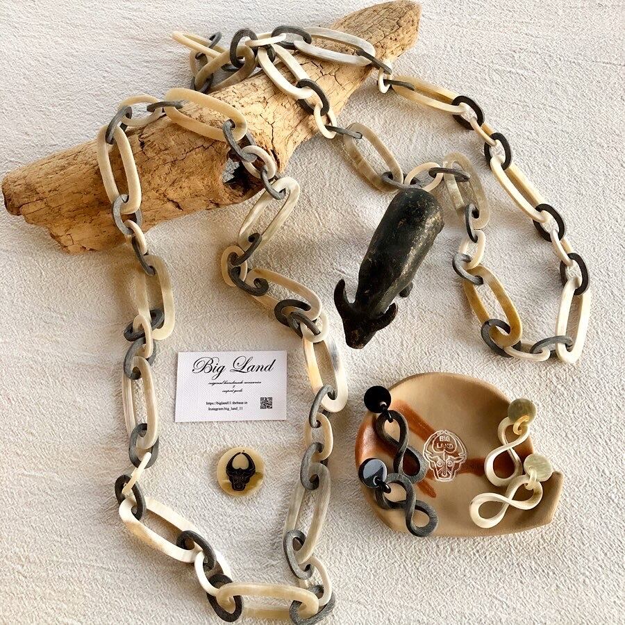 上品な色合いと無限を彷彿するようなモチーフがなんとも言えないデザインで、大ぶりなのに大変軽いのが水牛アクセサリーの特徴です✨