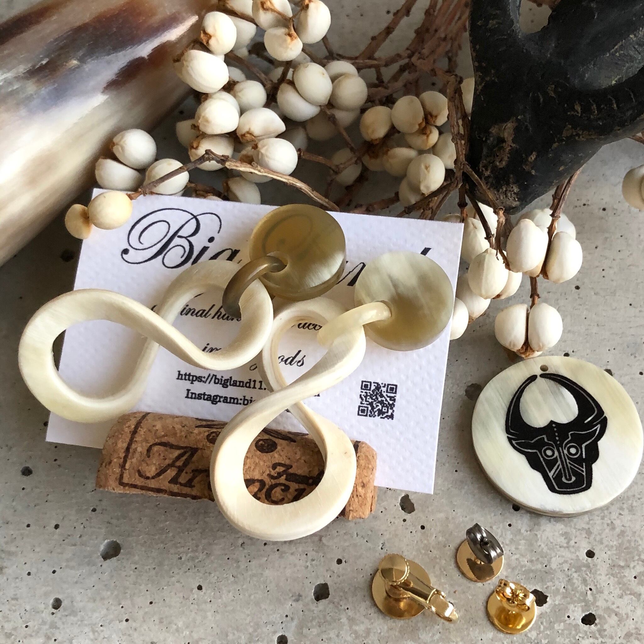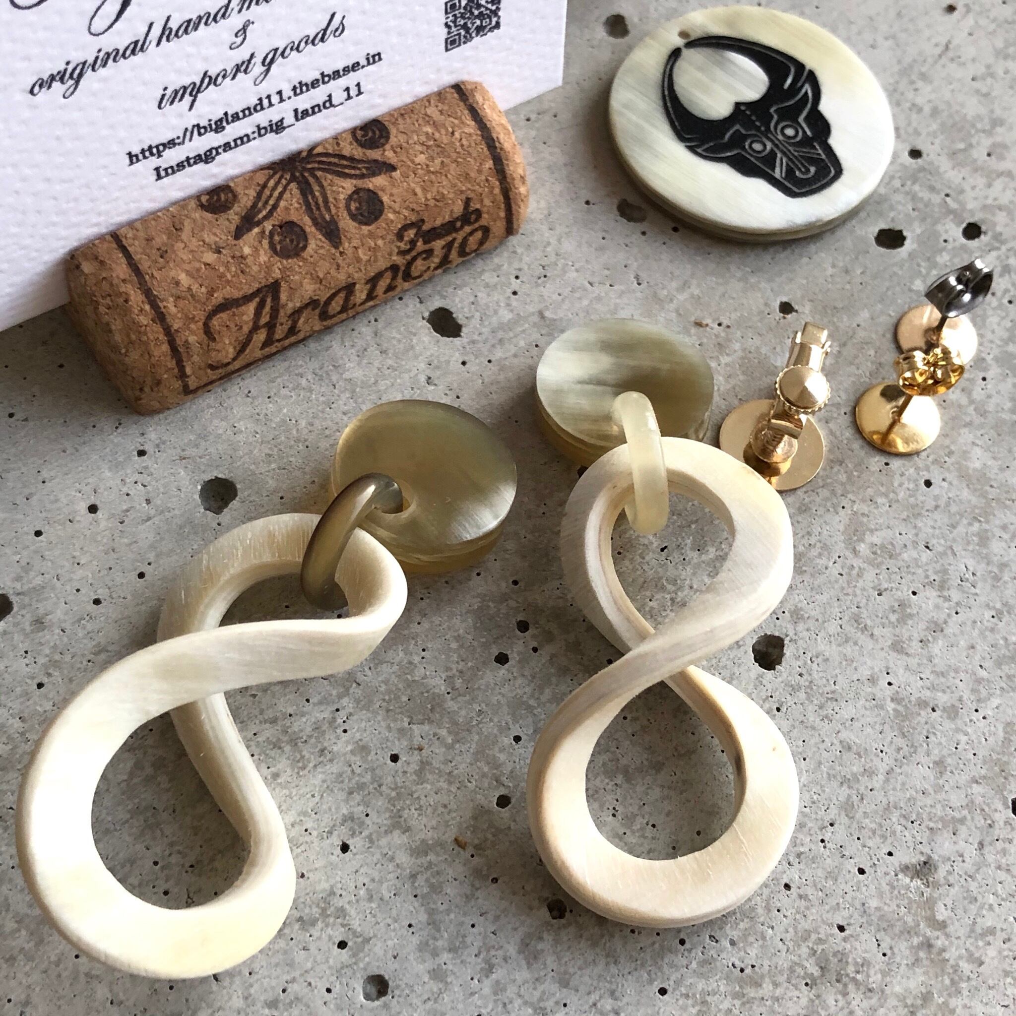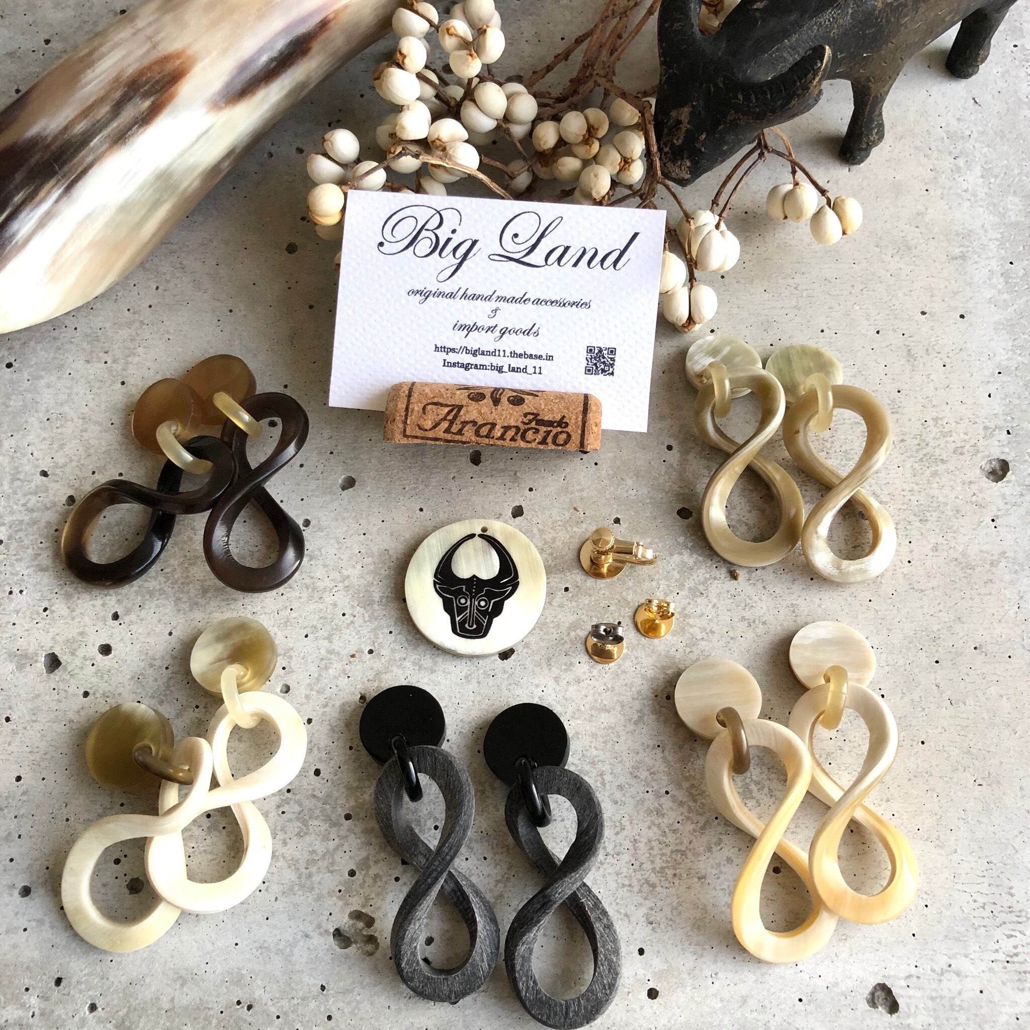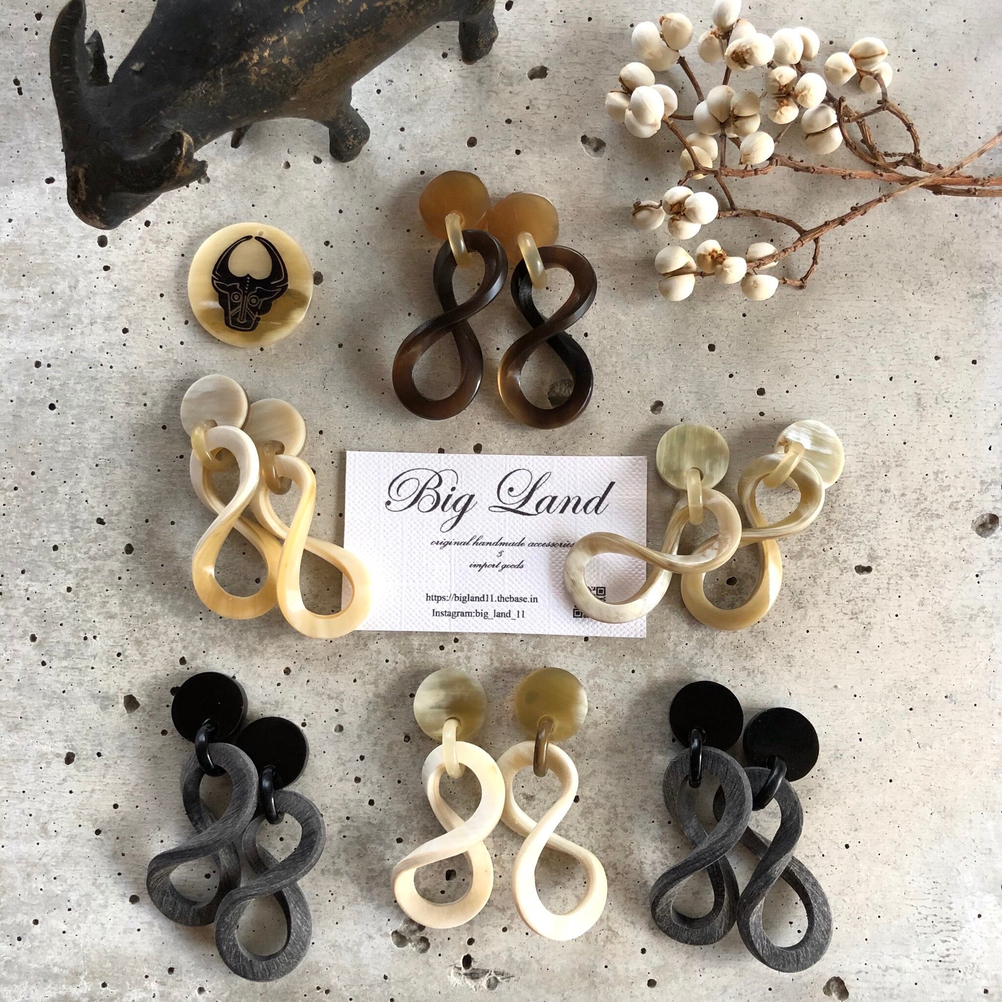 上品な色合いと無限を彷彿するようなモチーフがなんとも言えないデザインで、大ぶりなのに大変軽いのが水牛アクセサリーの特徴です✨