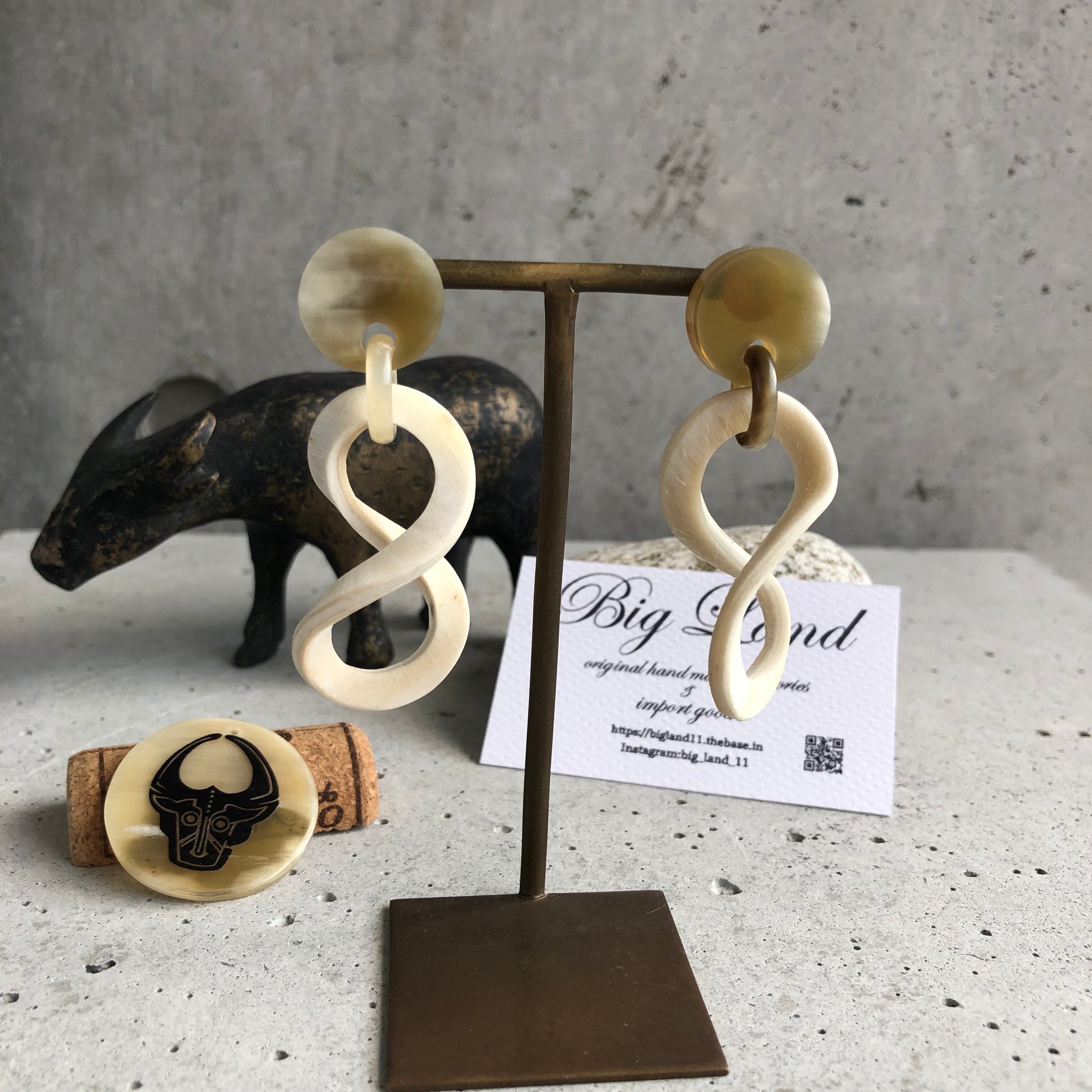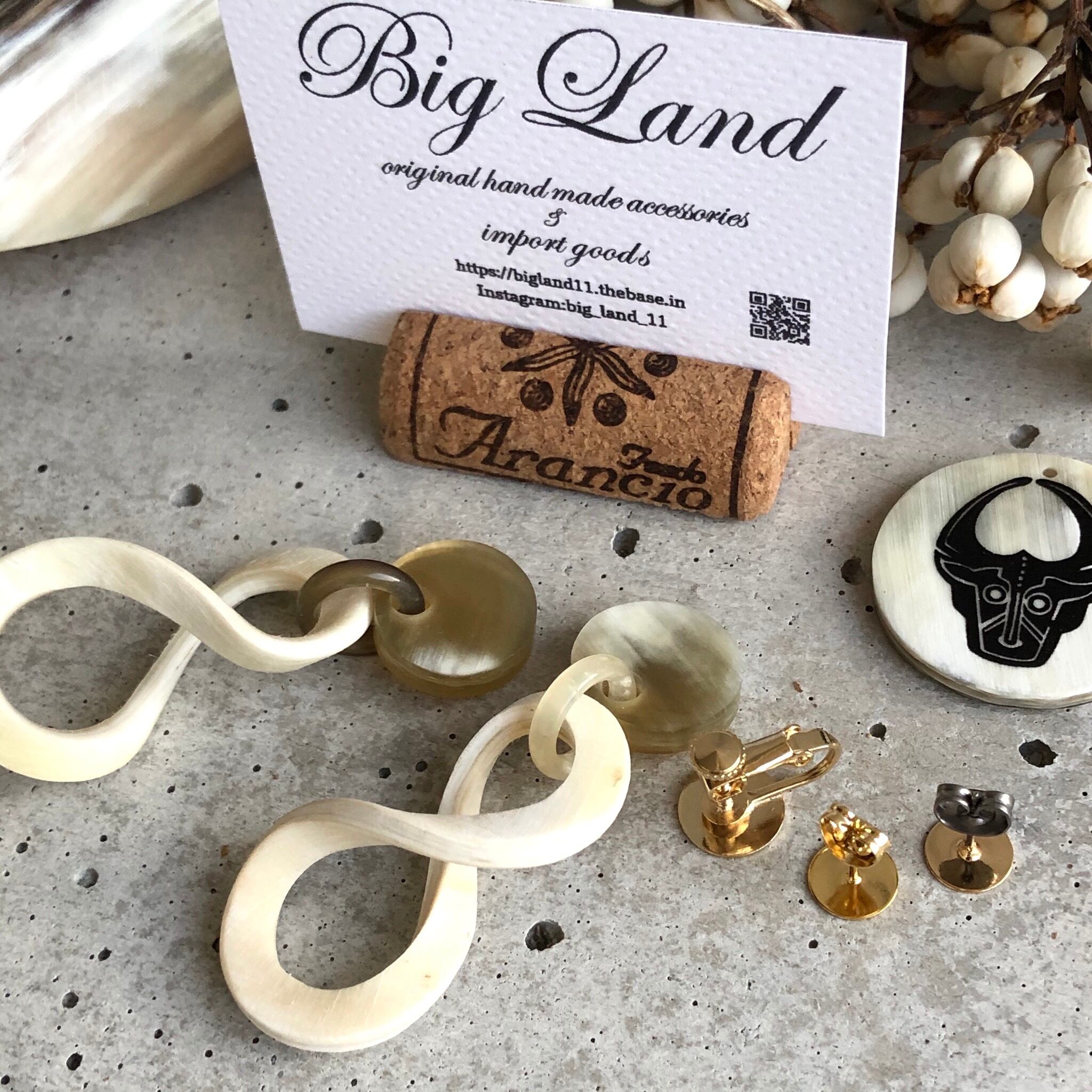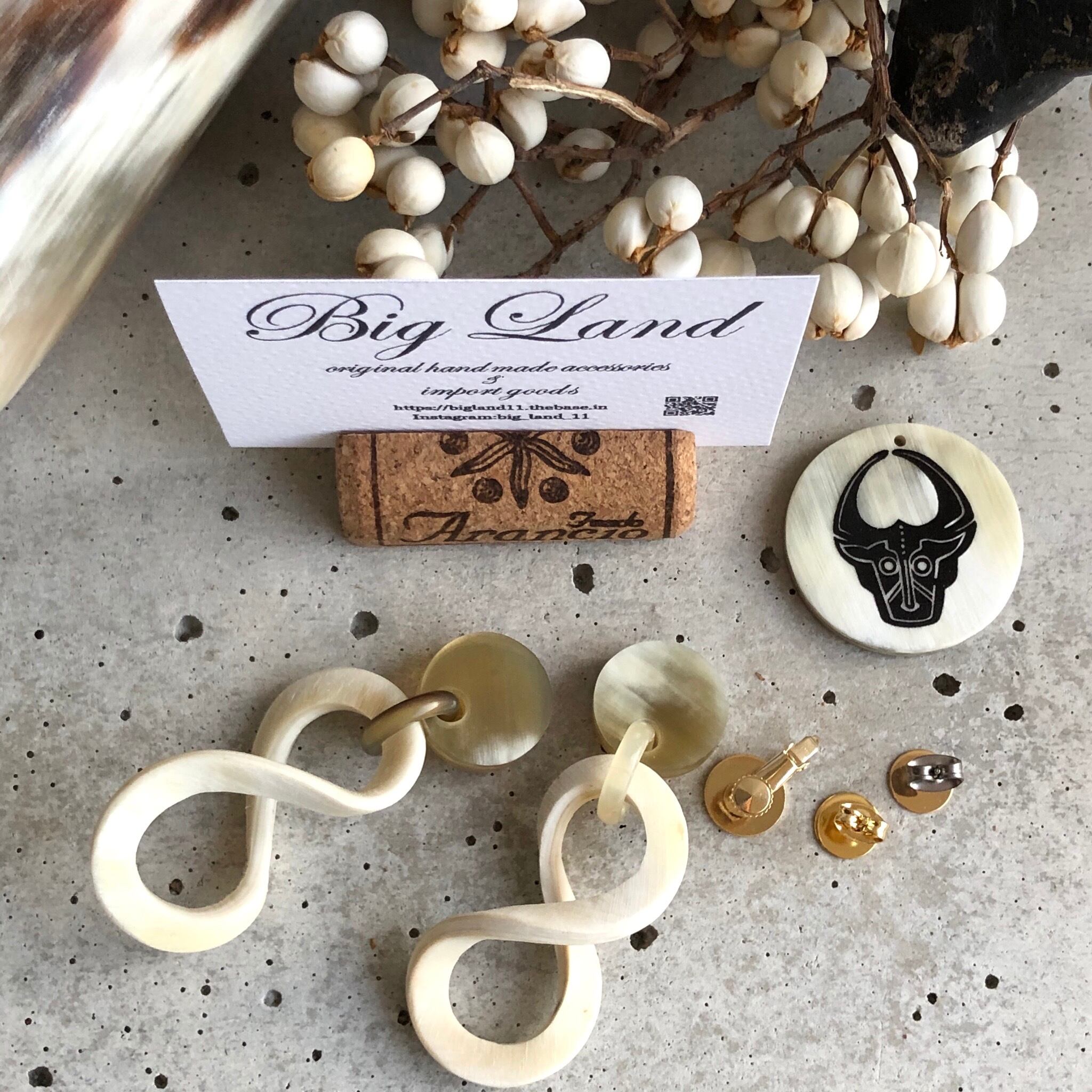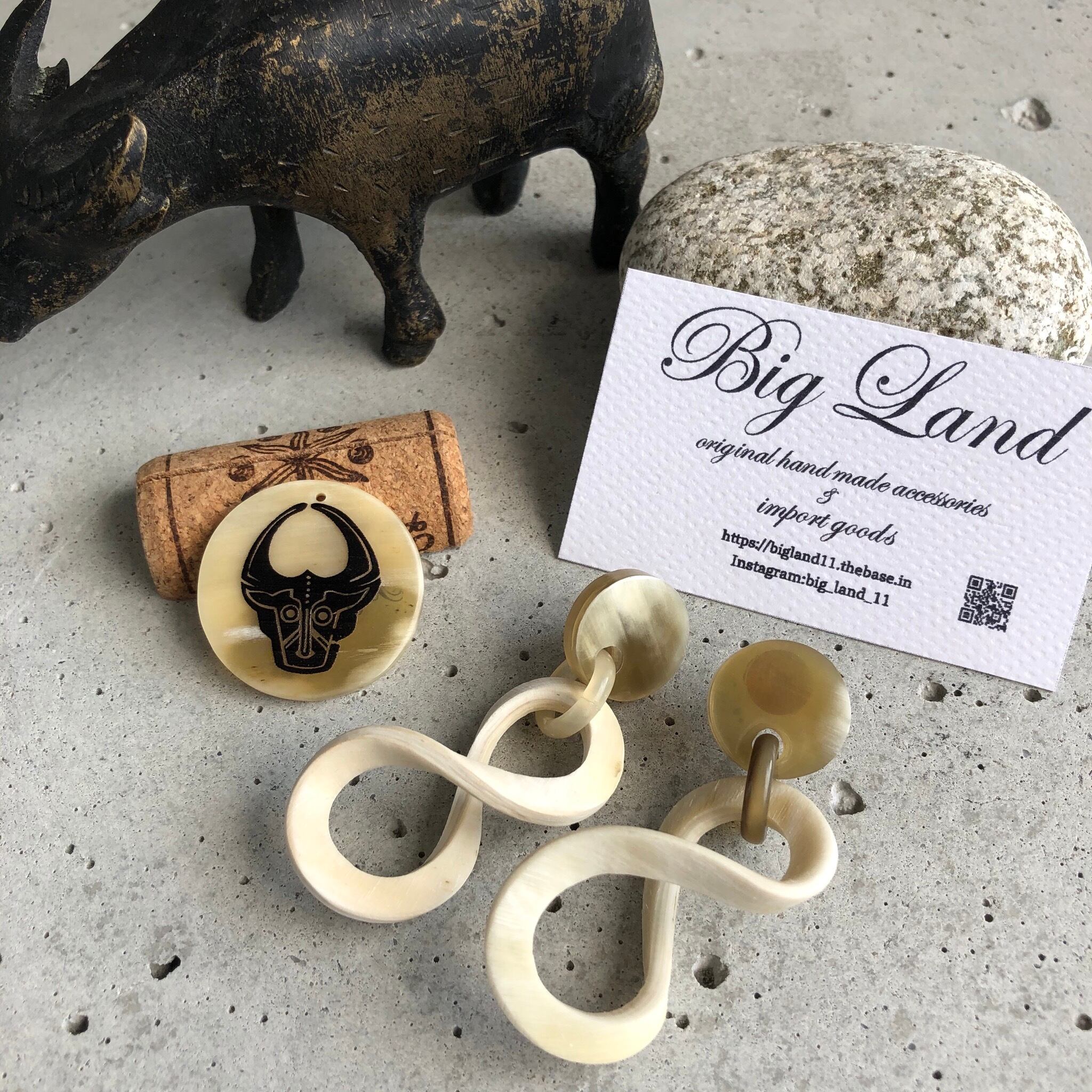 上品な色合いと無限を彷彿するようなモチーフがなんとも言えないデザインで、大ぶりなのに大変軽いのが水牛アクセサリーの特徴です✨