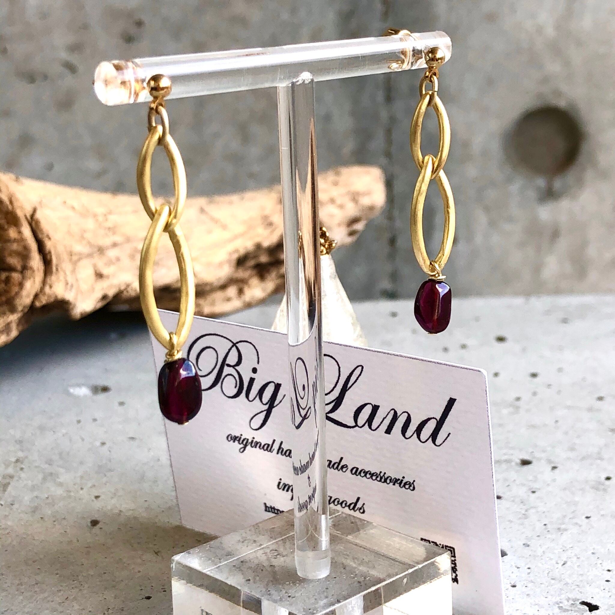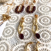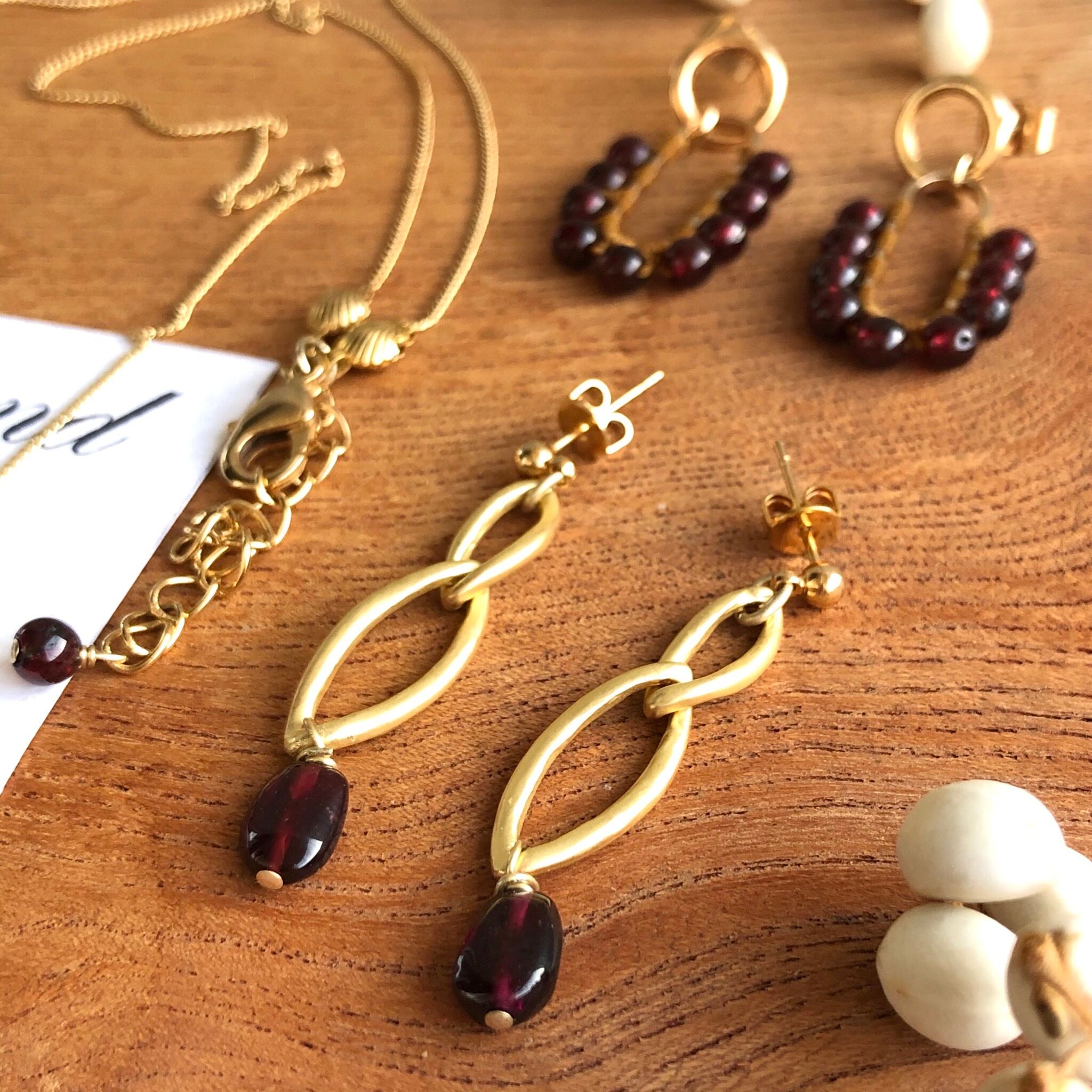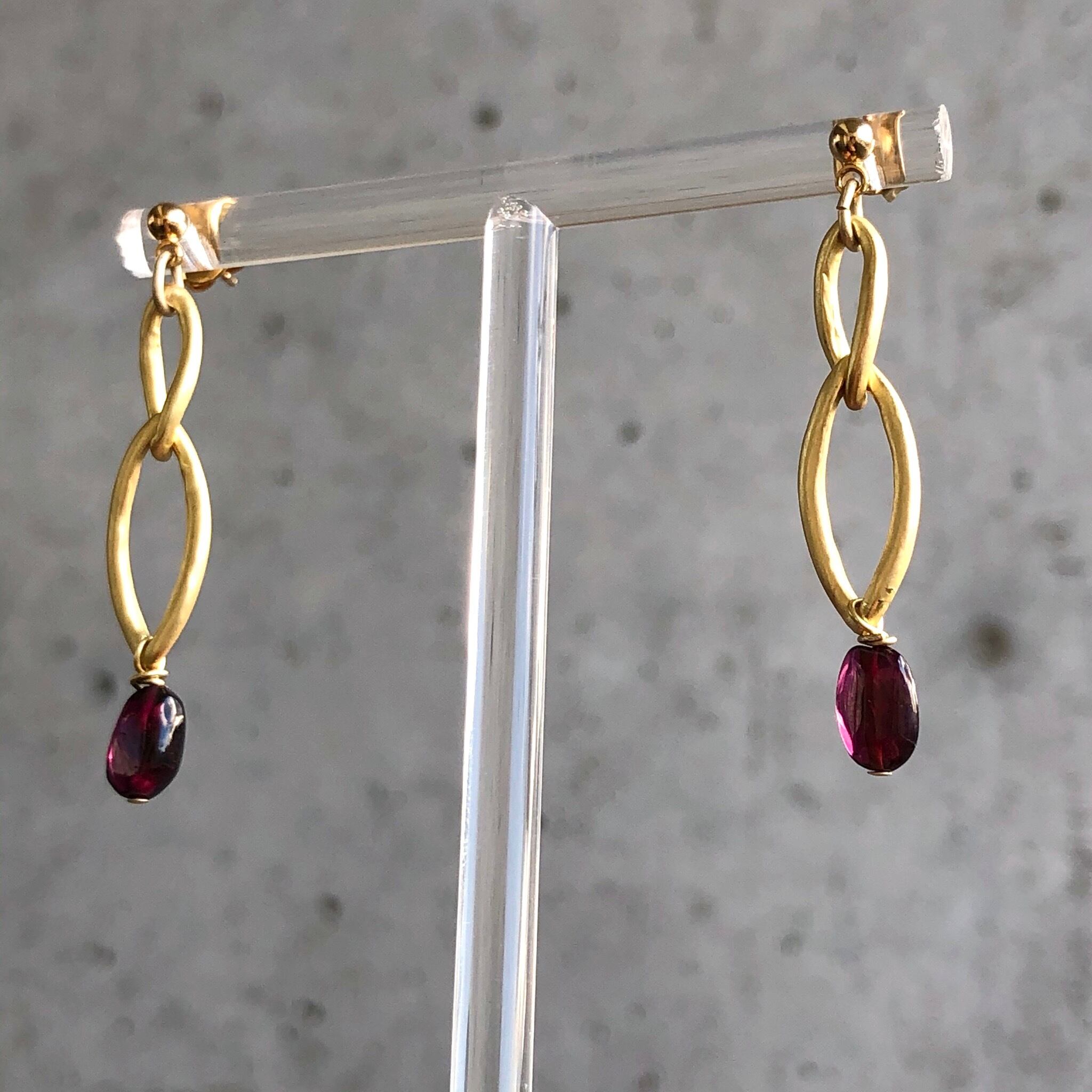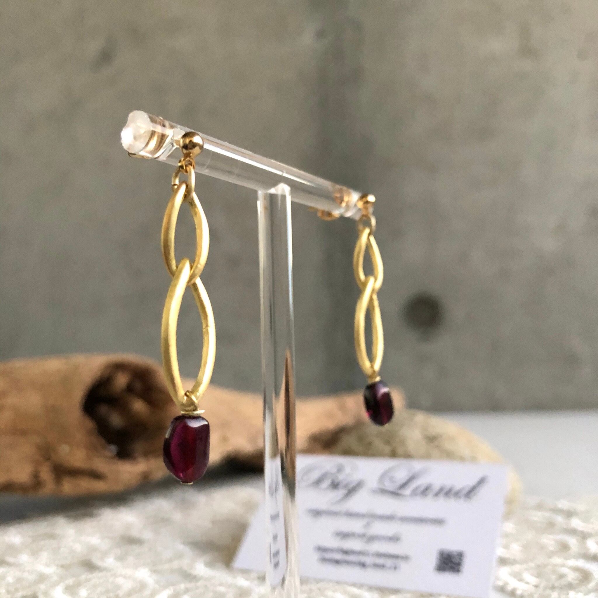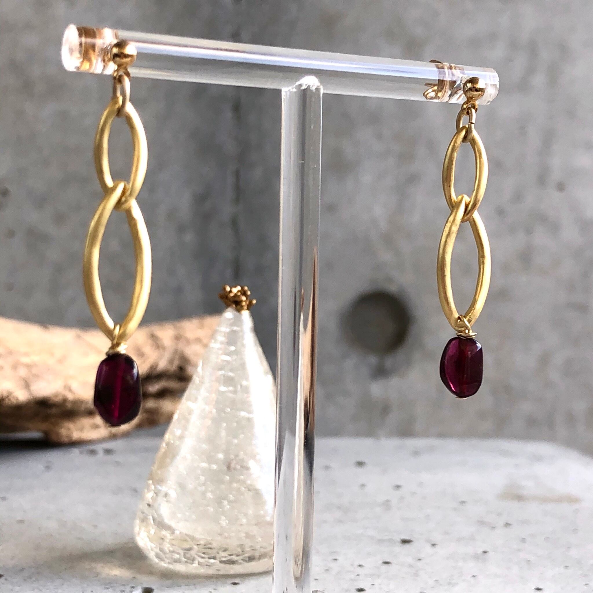 シンプルに一粒のガーネットとマットゴールドと組み合わせ、細長のさり気ないサイズ感に仕上げました。揺れ感もあり深い赤色とゴールドの組み合わせが少しオリエンタルな雰囲気‼︎