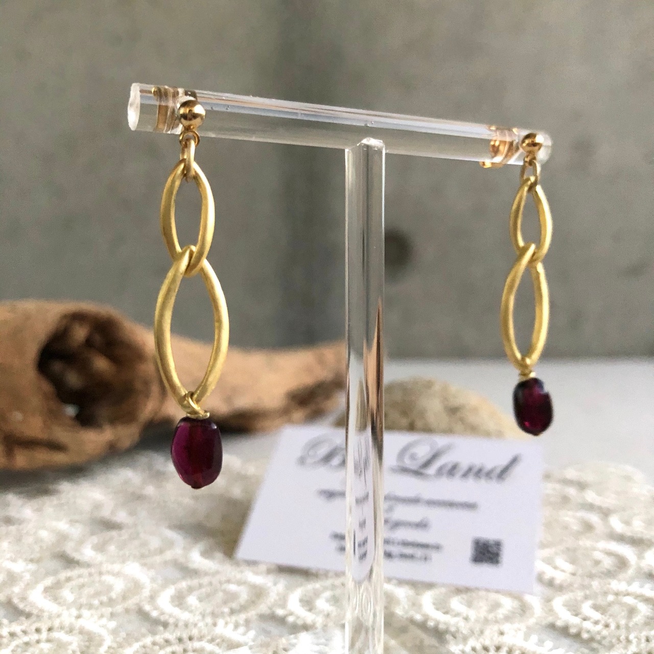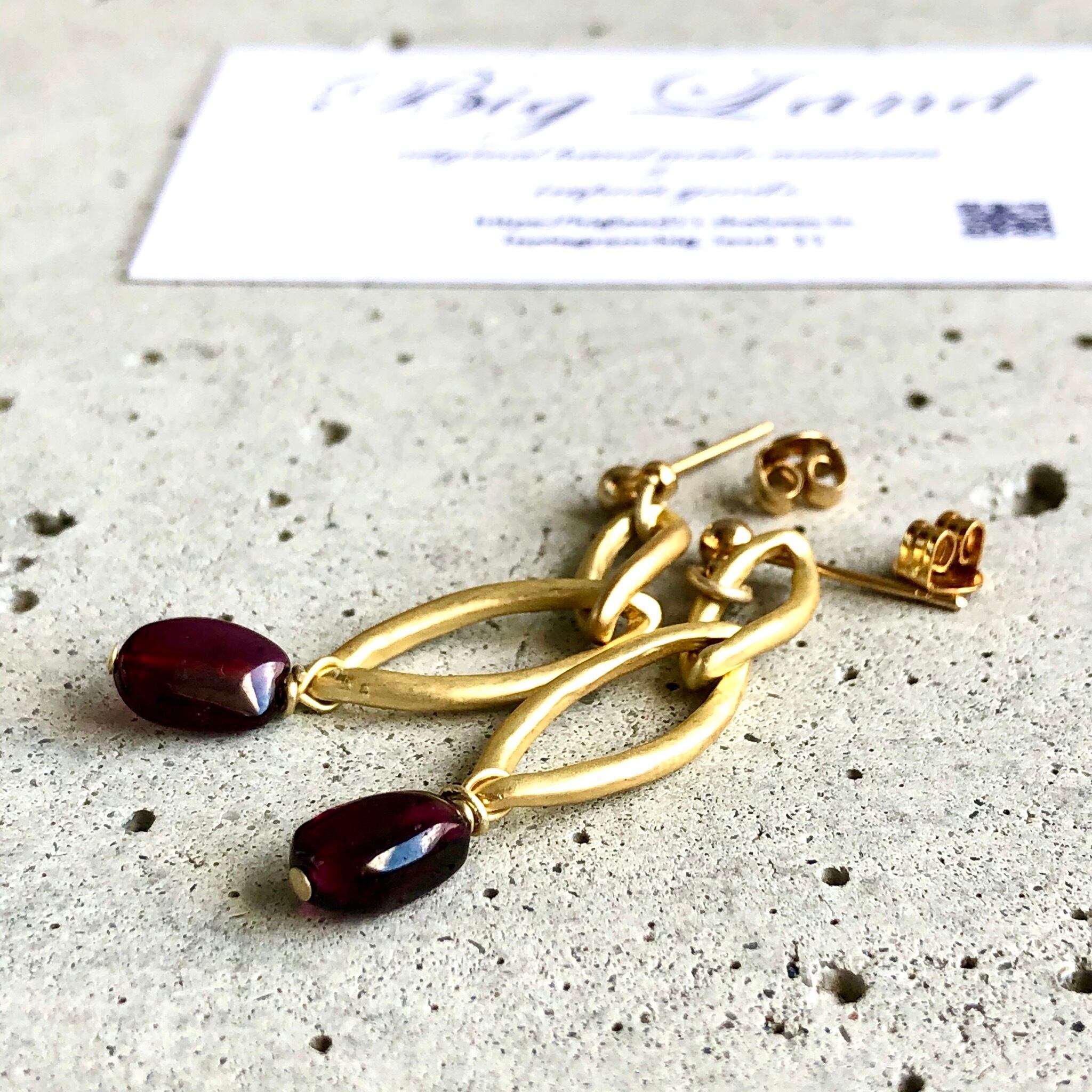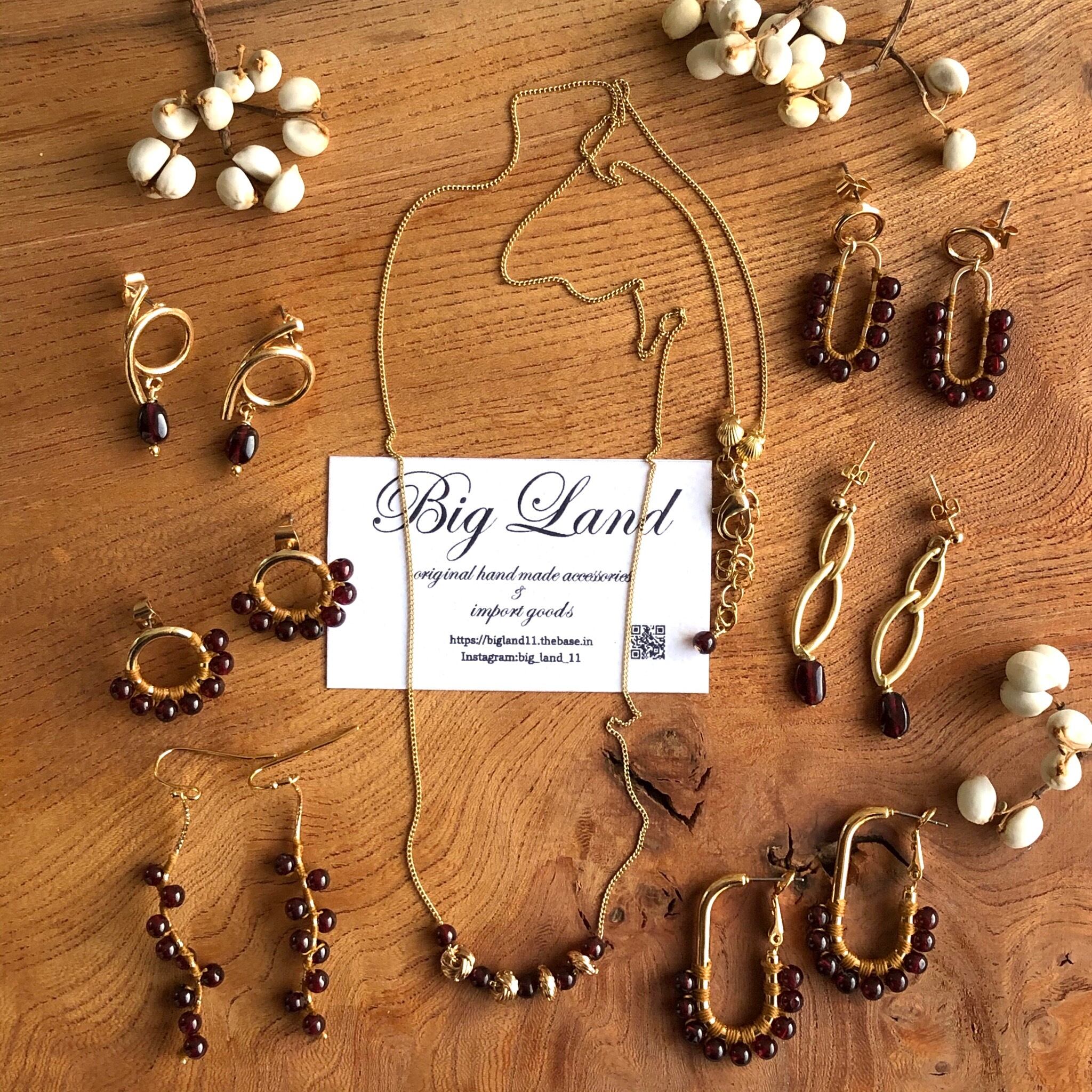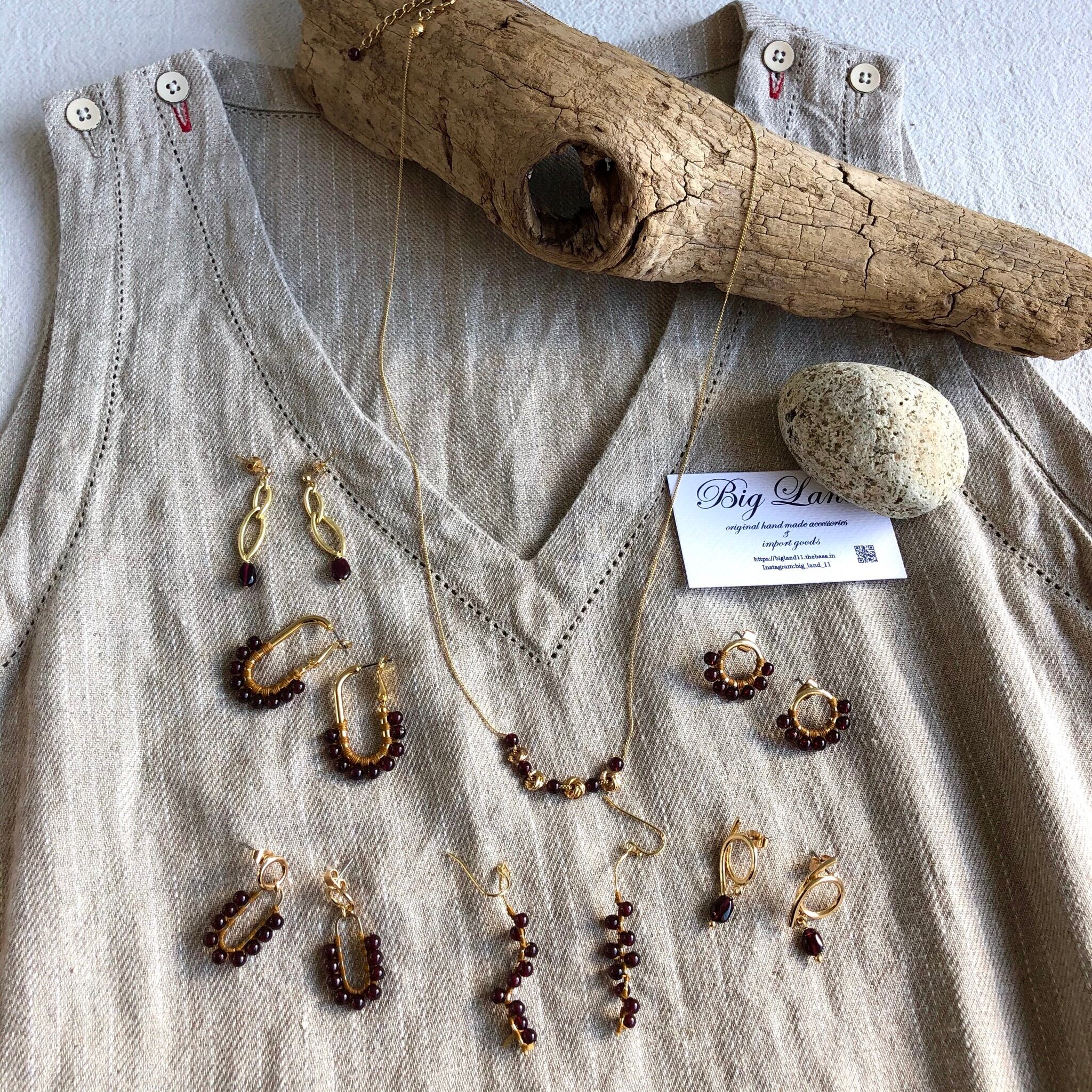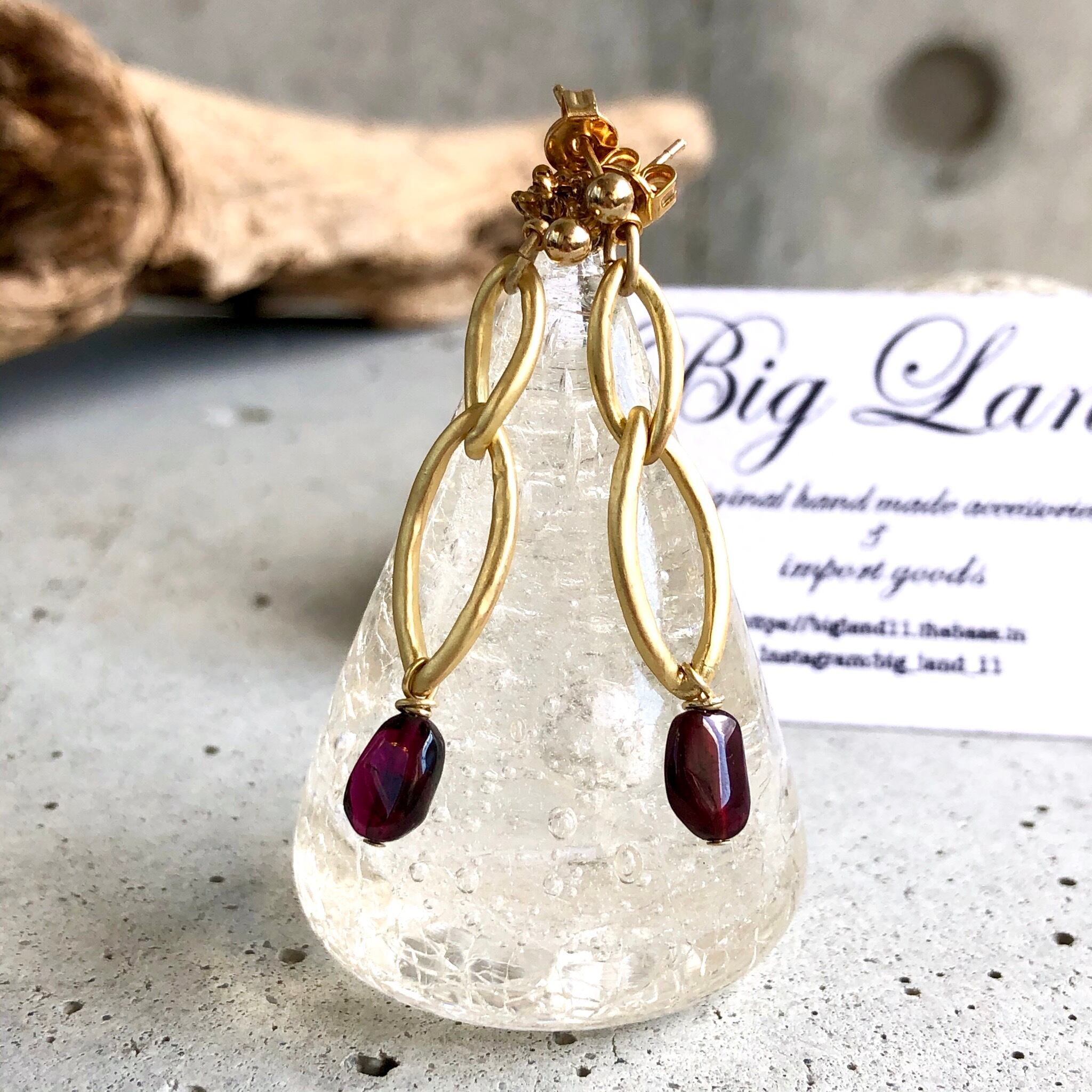 シンプルに一粒のガーネットとマットゴールドと組み合わせ、細長のさり気ないサイズ感に仕上げました。揺れ感もあり深い赤色とゴールドの組み合わせが少しオリエンタルな雰囲気‼︎