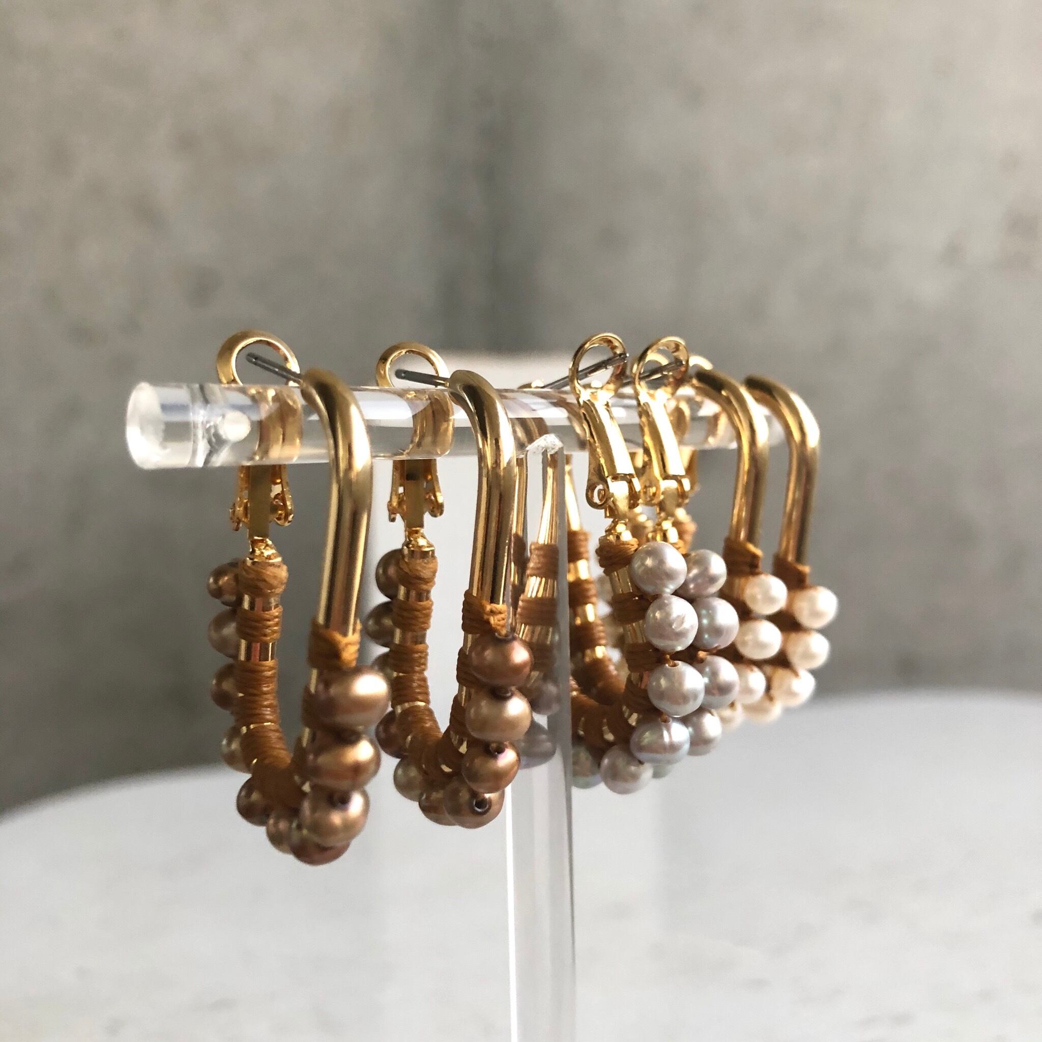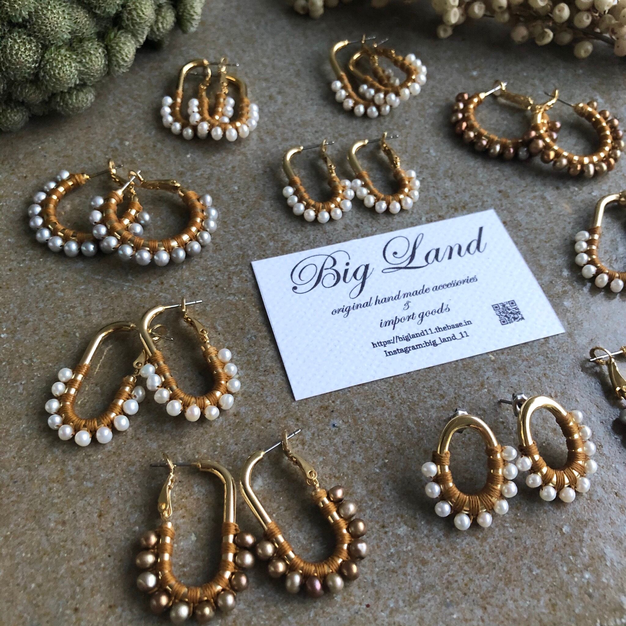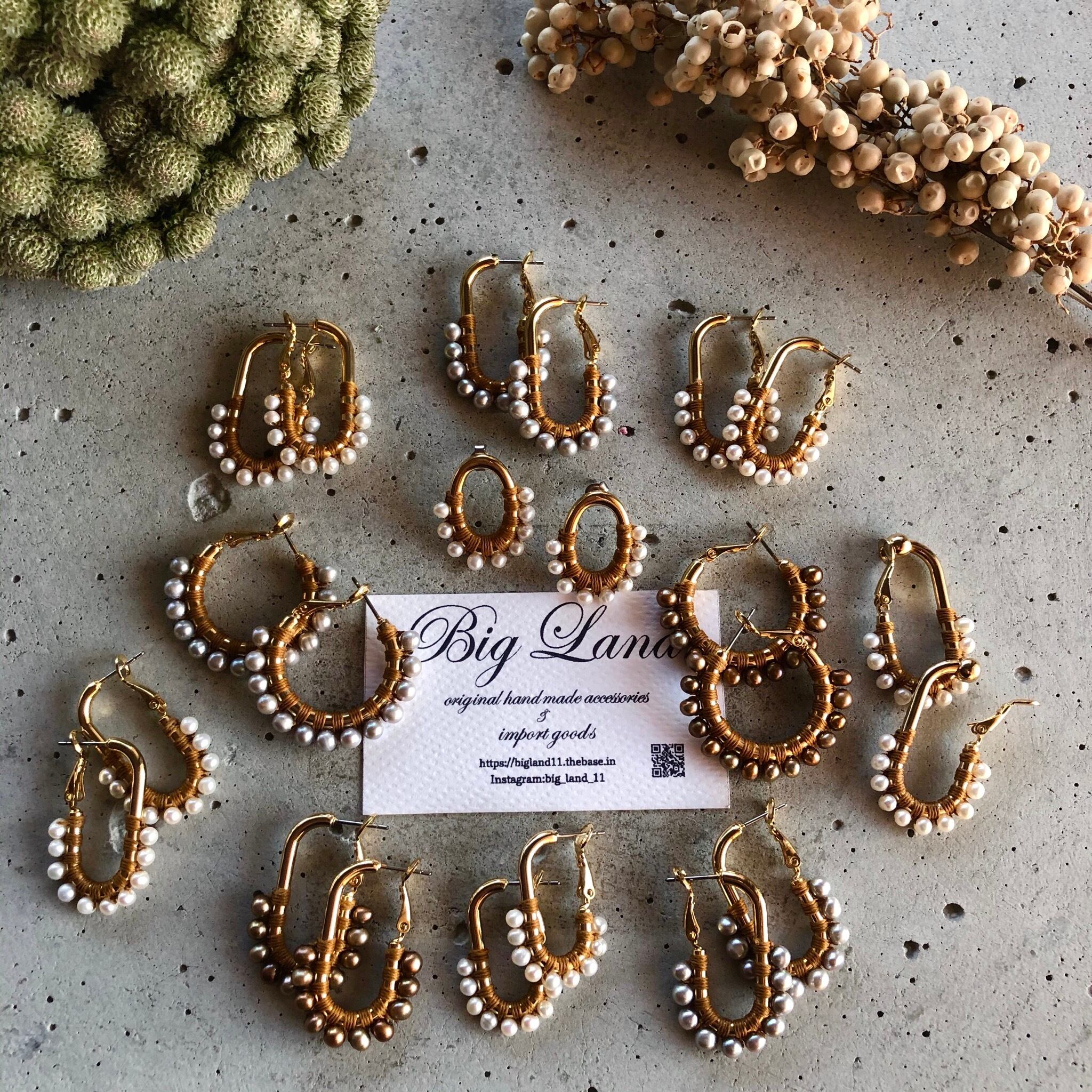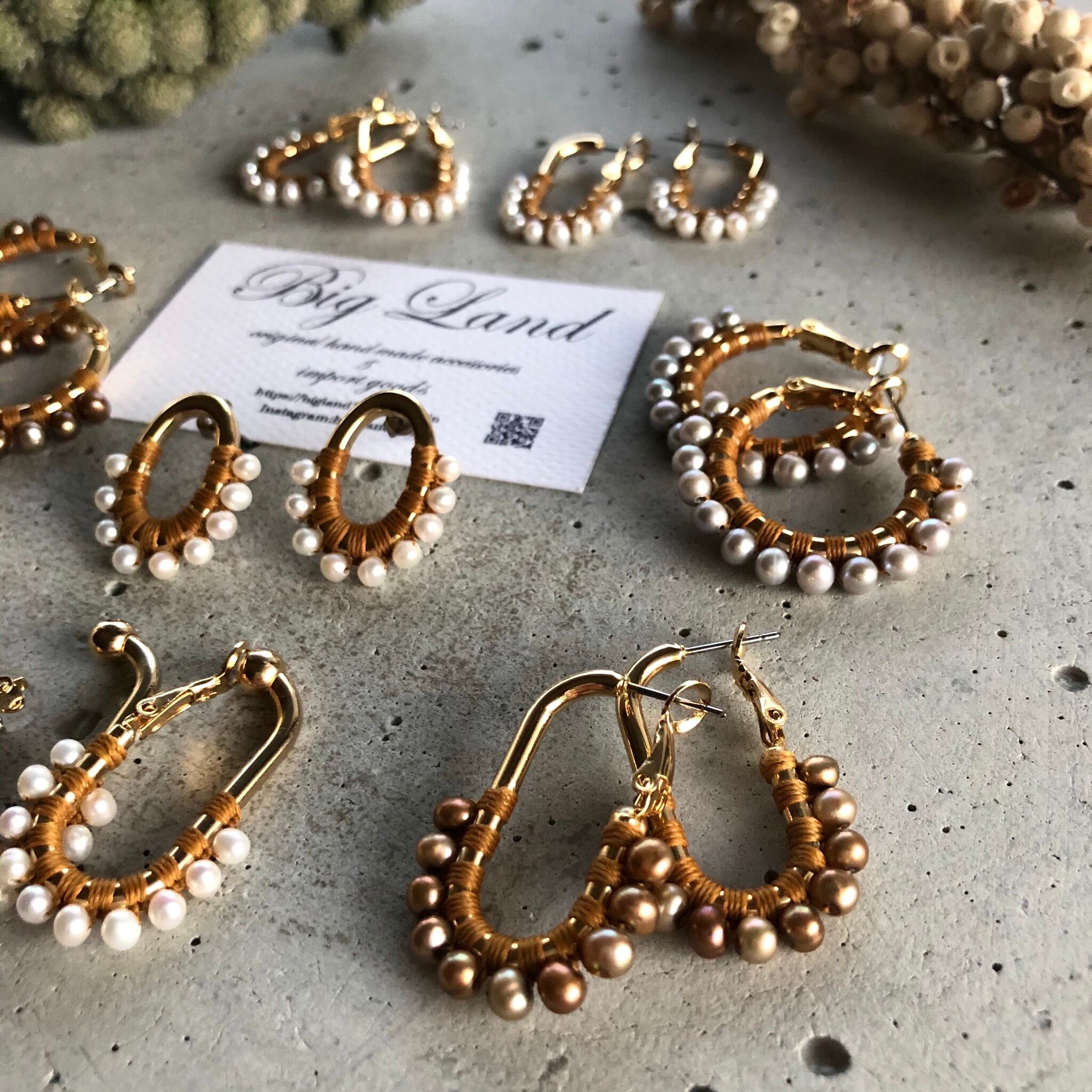 開閉式のぽってりした重厚感あるフープが高品質で、一粒一粒手間をかけて糸でひと編みひと編みし高級感ある縦長のフープは小顔効果があり私自身も愛用中で周りの方から高評価でオーダーも入り、今回色違いで沢山ご用意しました‼️
