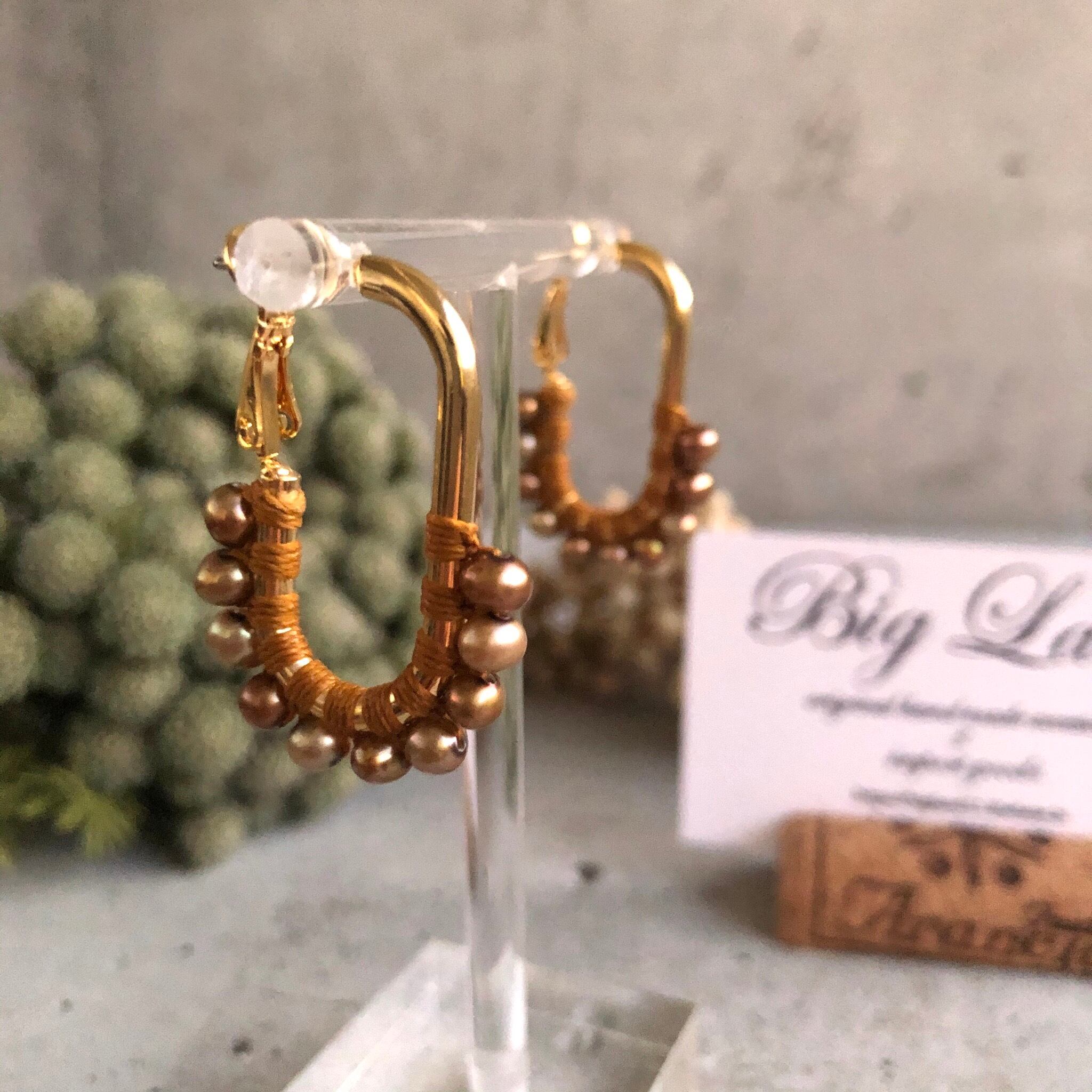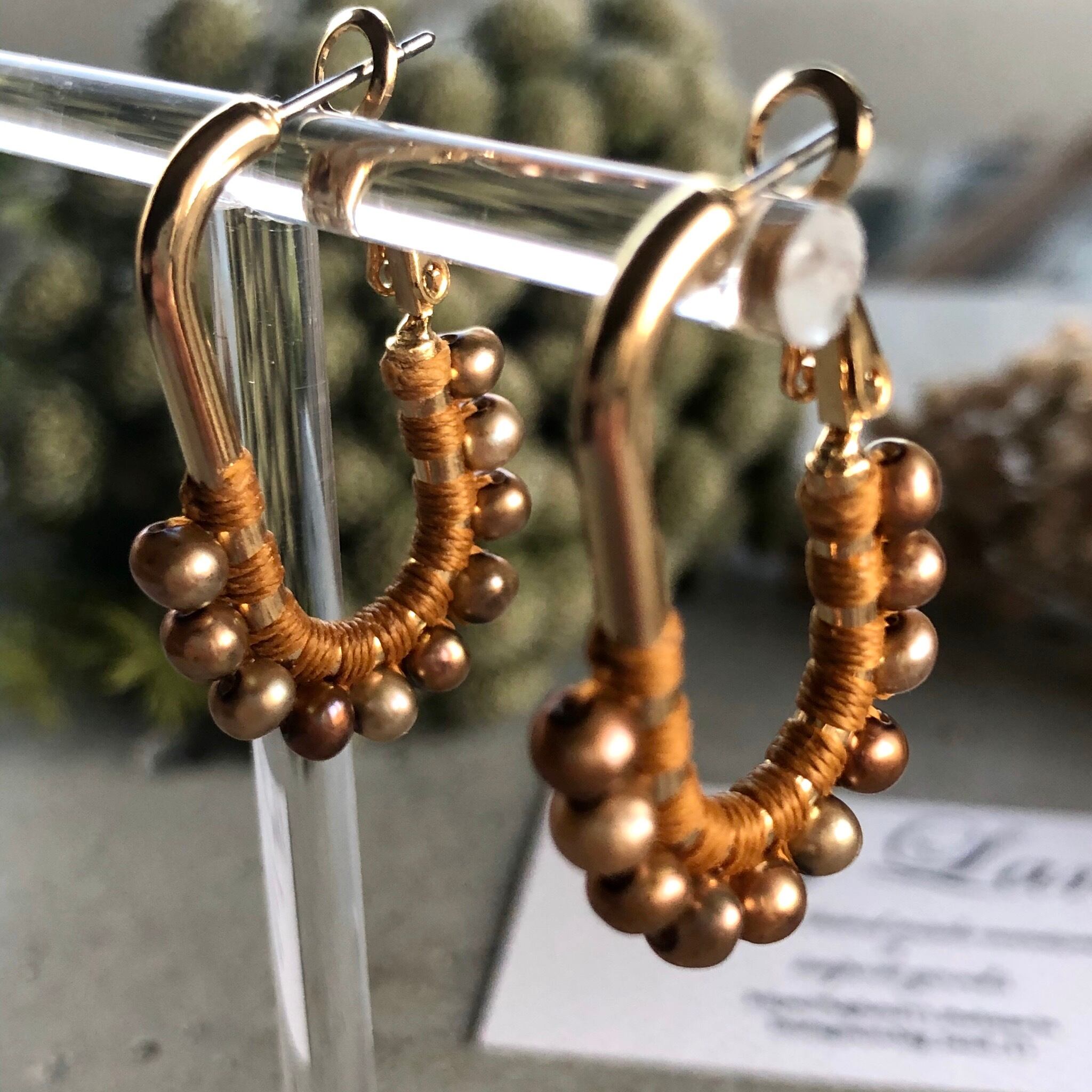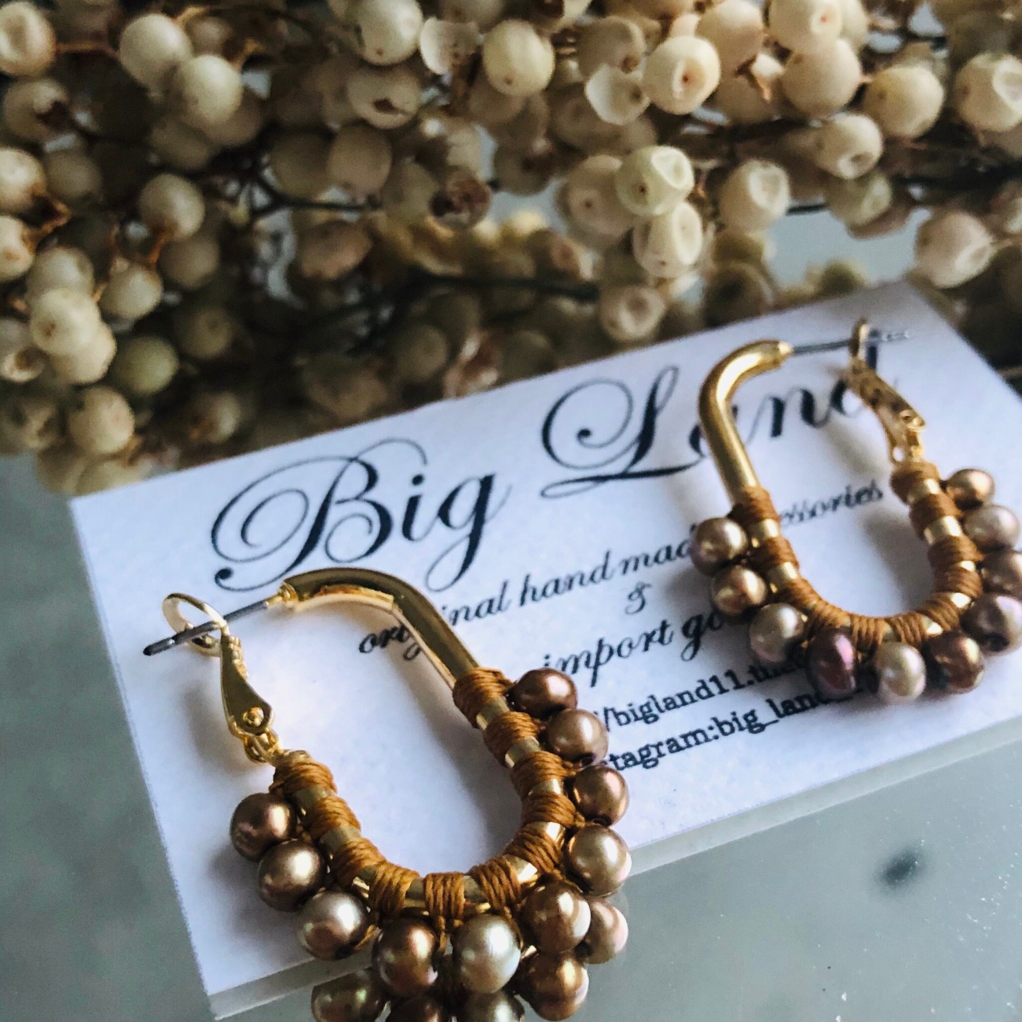 開閉式のぽってりした重厚感あるフープが高品質で、一粒一粒手間をかけて糸でひと編みひと編みし高級感ある縦長のフープは小顔効果があり私自身も愛用中で周りの方から高評価でオーダーも入り、今回色違いで沢山ご用意しました‼️