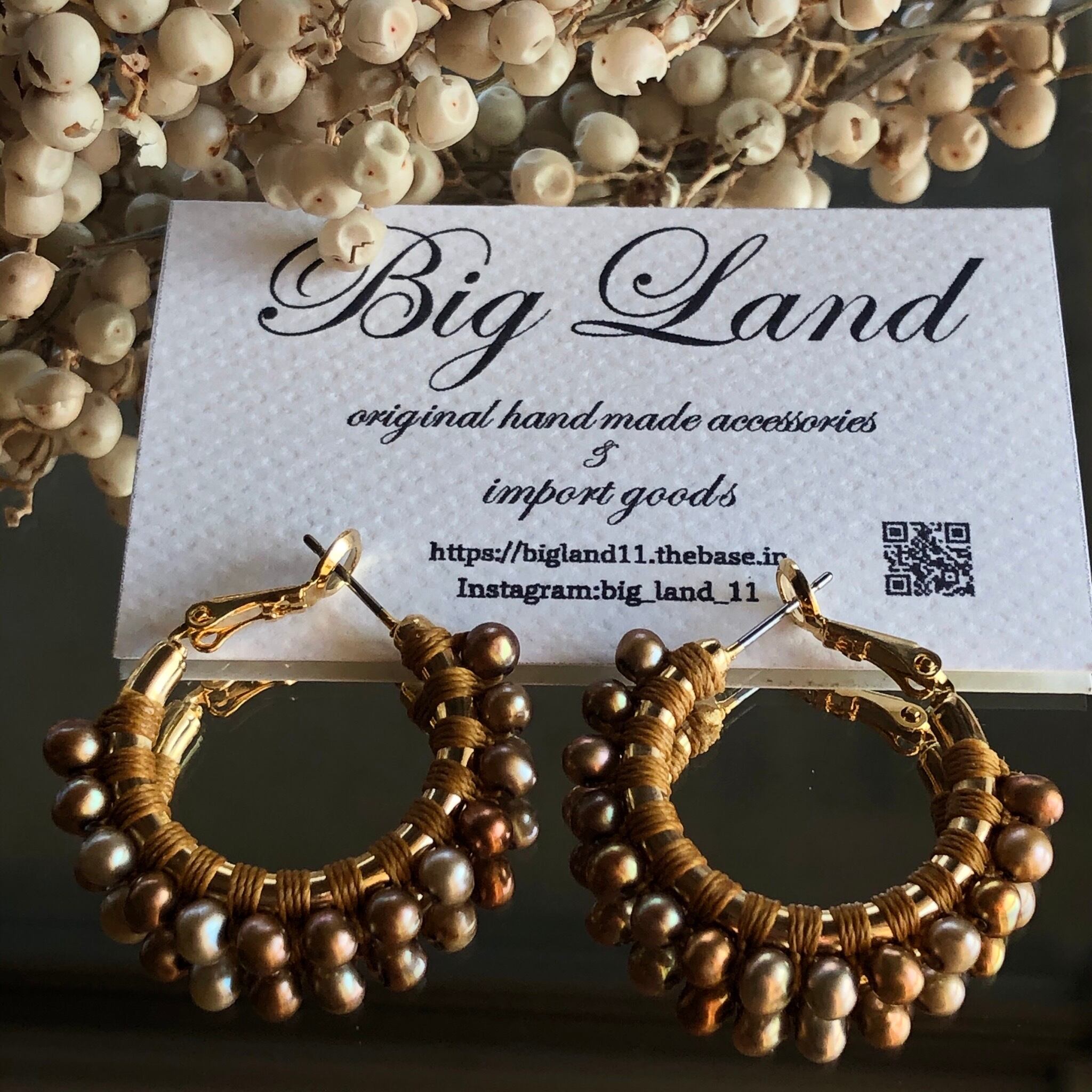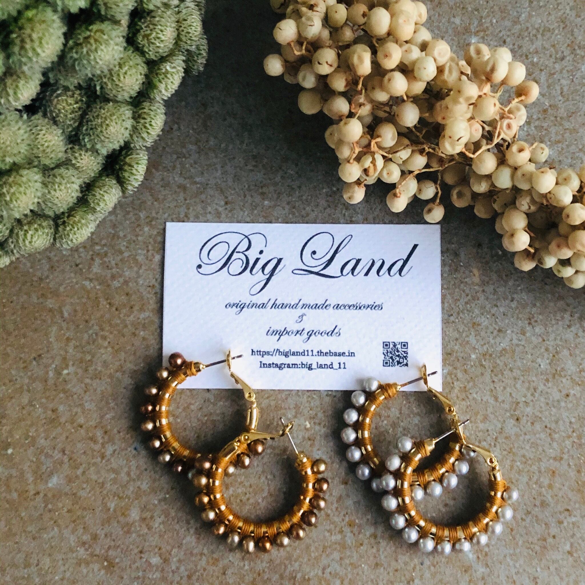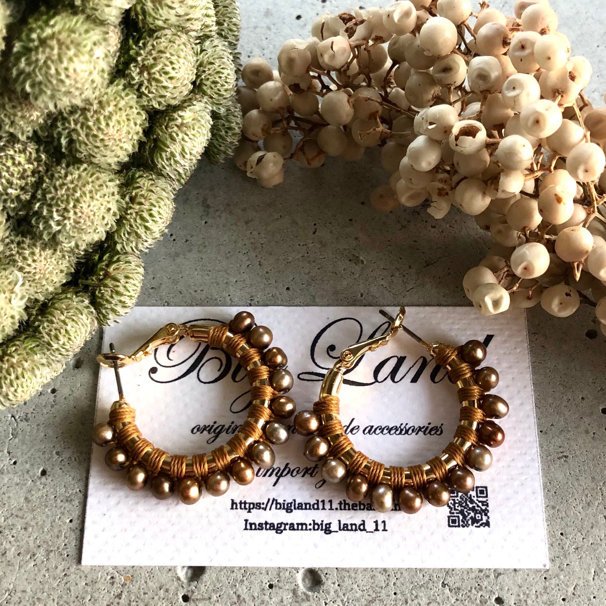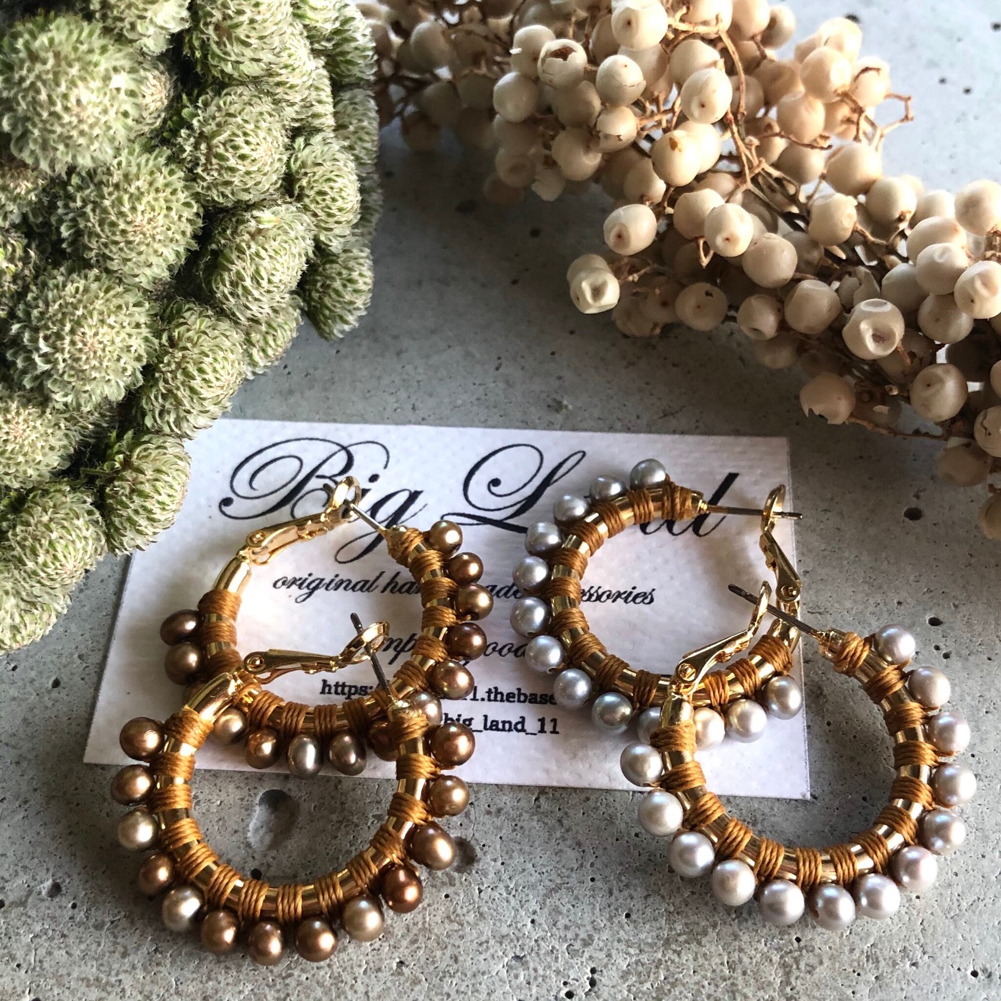 開閉式のぽってりした重厚感あるフープと大変美しい照りのあるパールを一粒一粒糸で丁寧にしっかり編みあげ、高級感がありどんなお洋服にも合うので出番が多くなると思います‼️