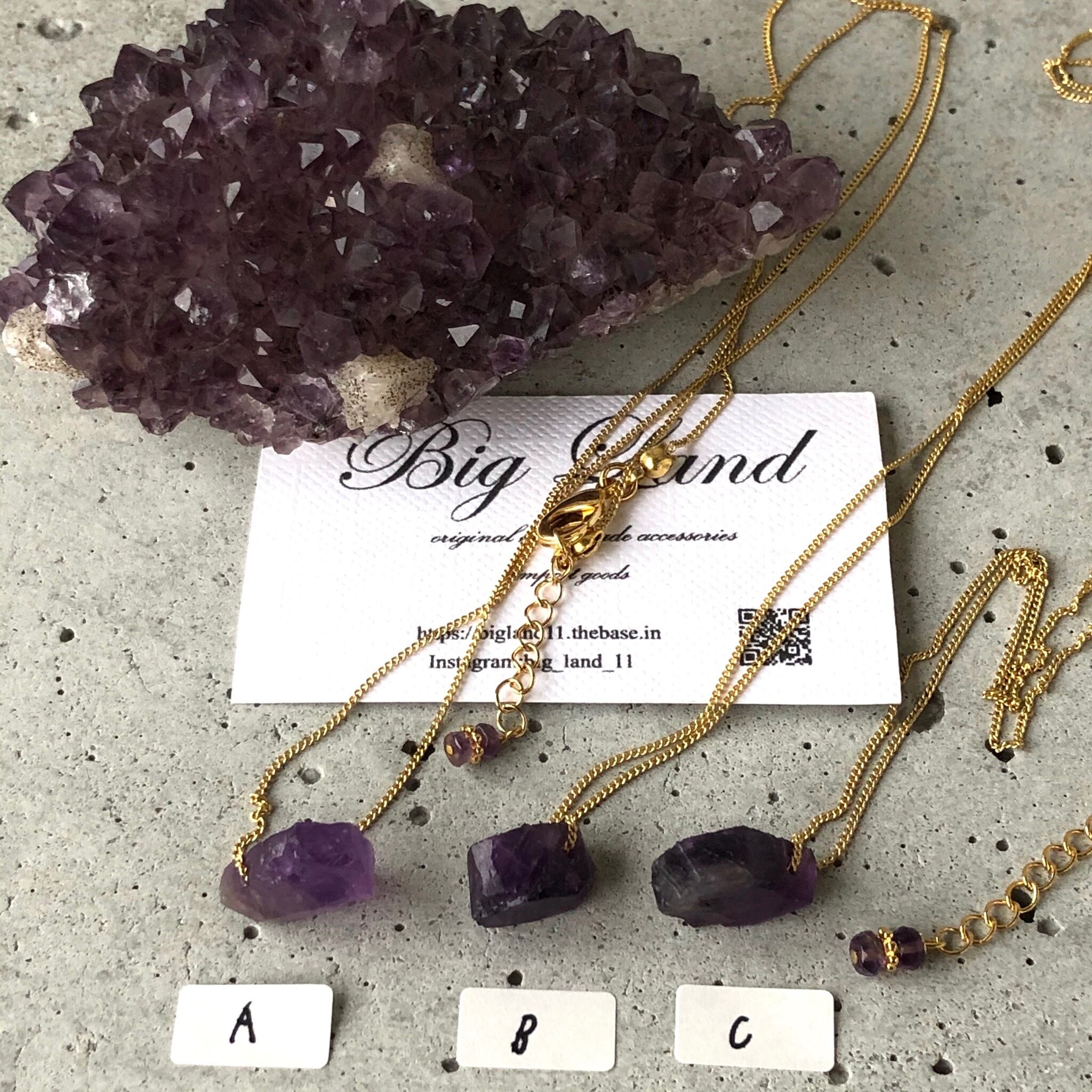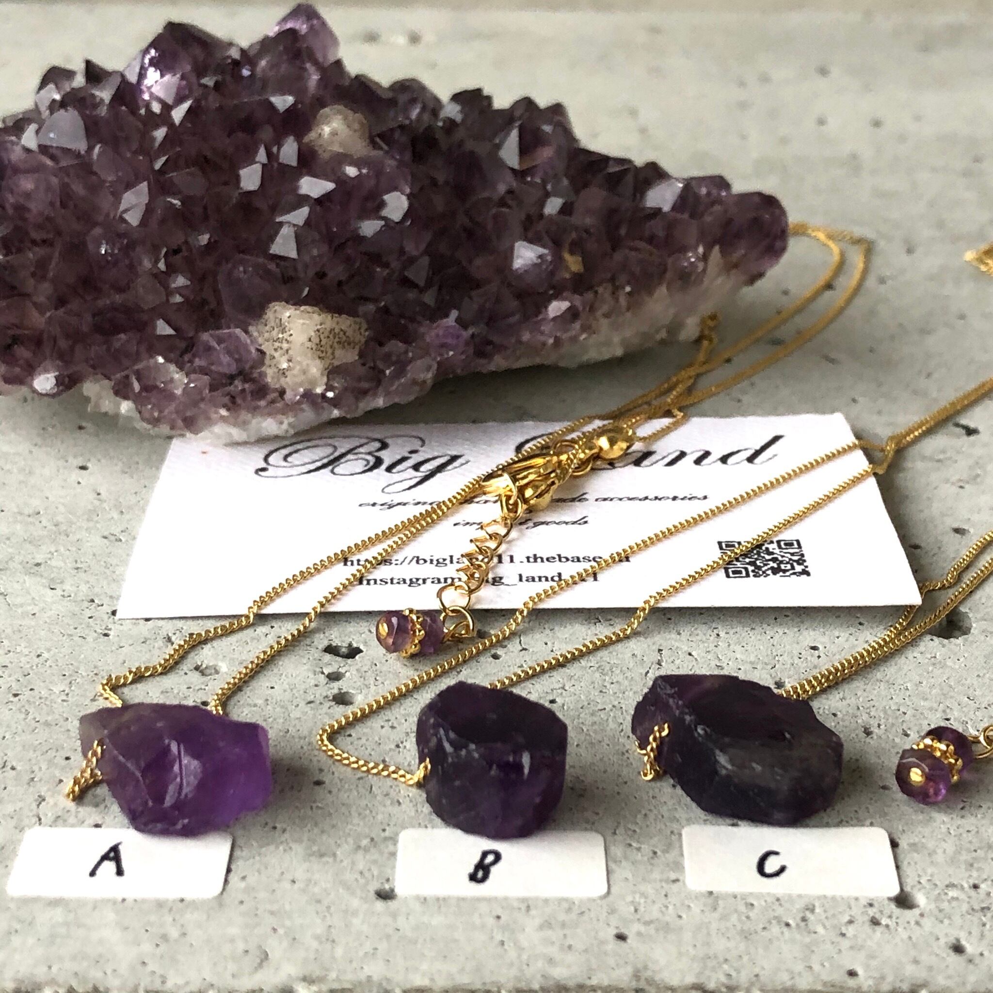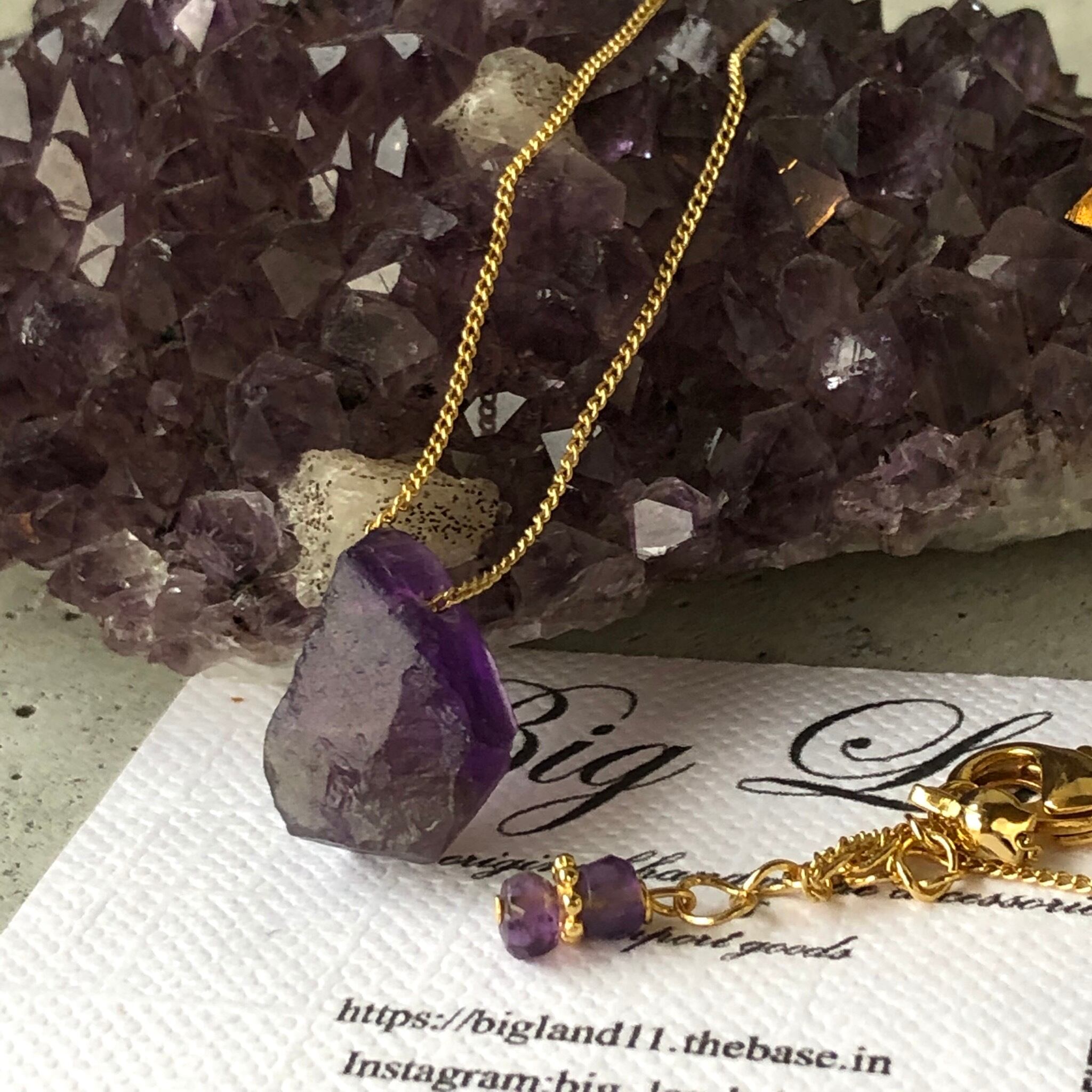 2月生まれのパワーストン、高貴な紫色「アメジスト」珍しいしずく型アメジスト原石を使いどこかエキゾチックな雰囲気漂う一点モノのネックレスに仕上げ....綺麗目ファッションから白ティーデニムとカジュアルスタイルにもgood✨