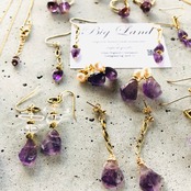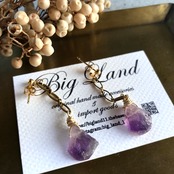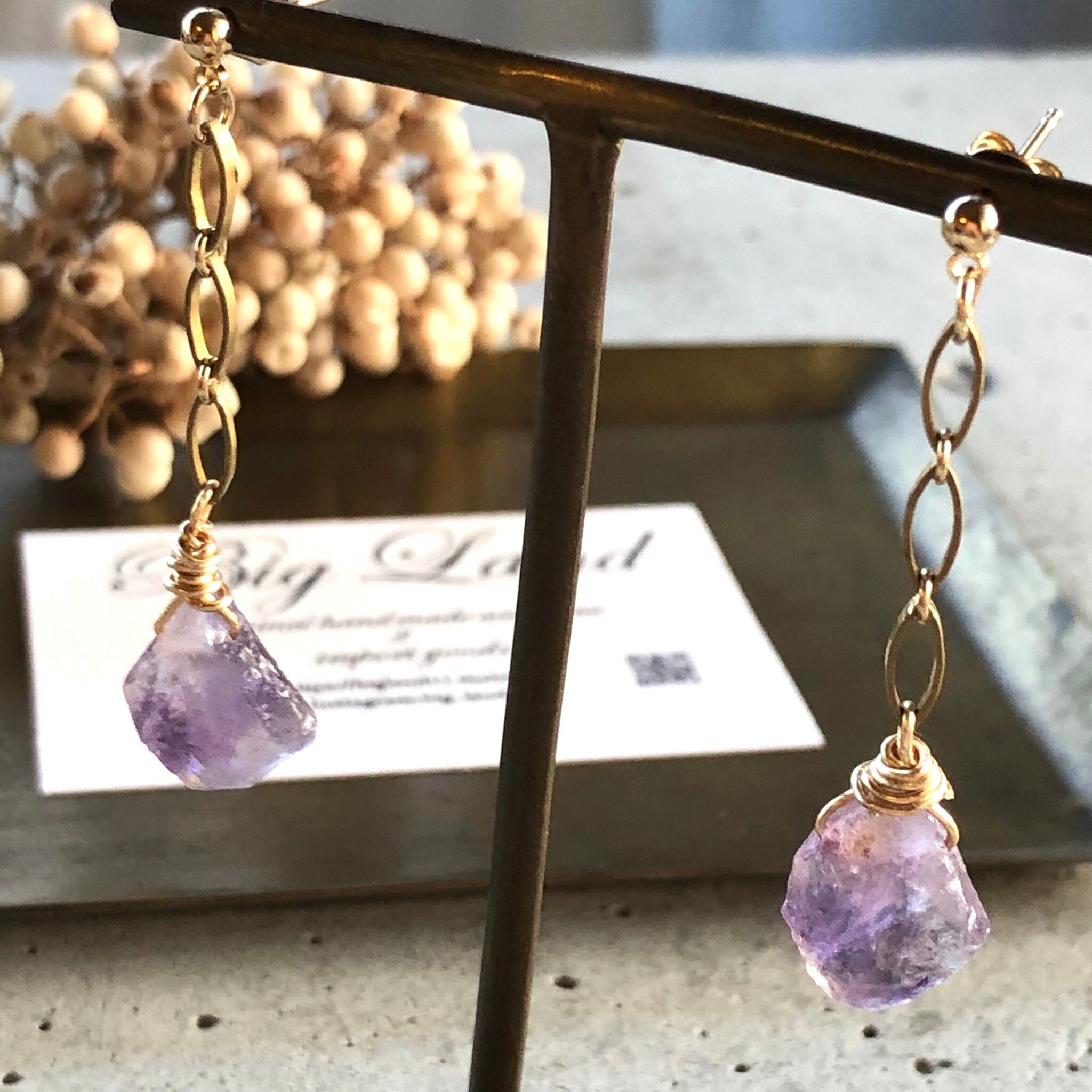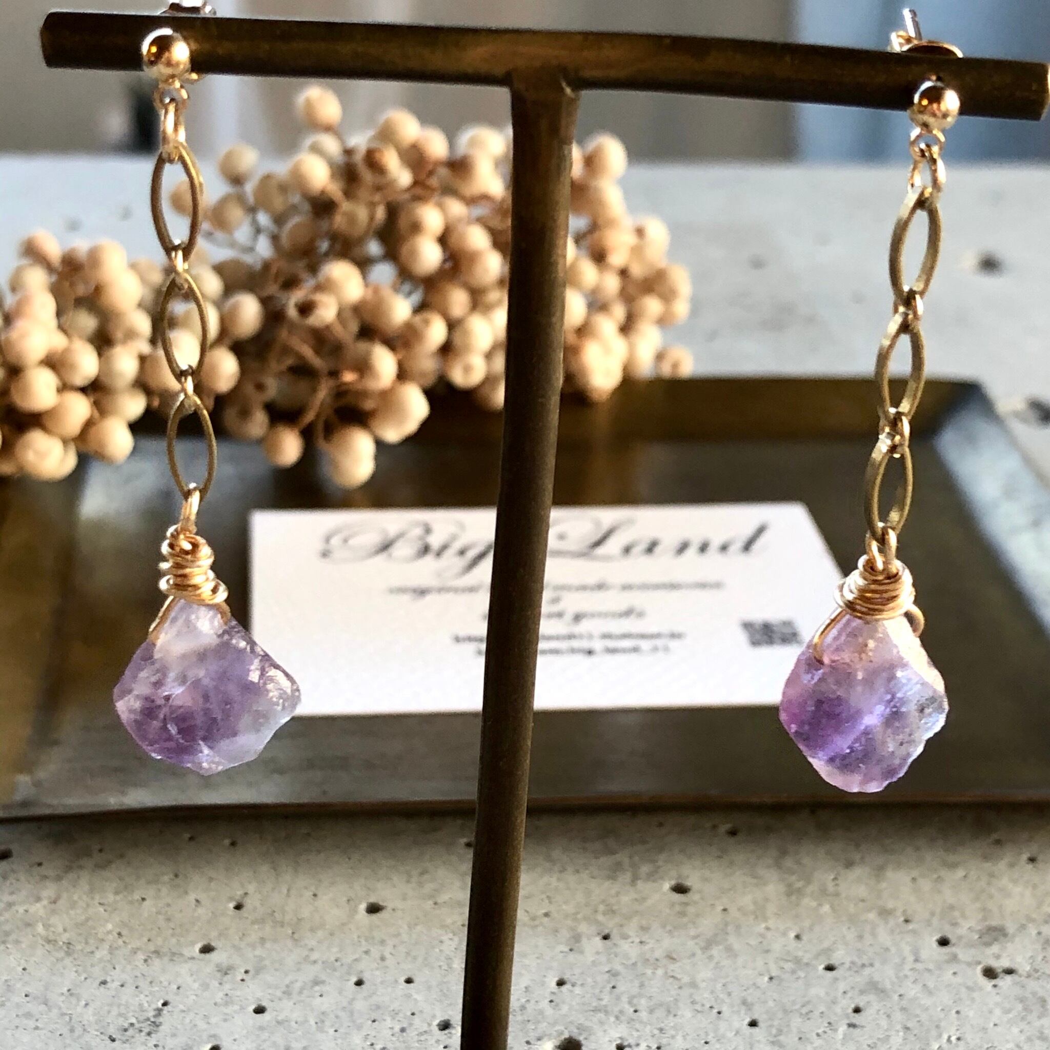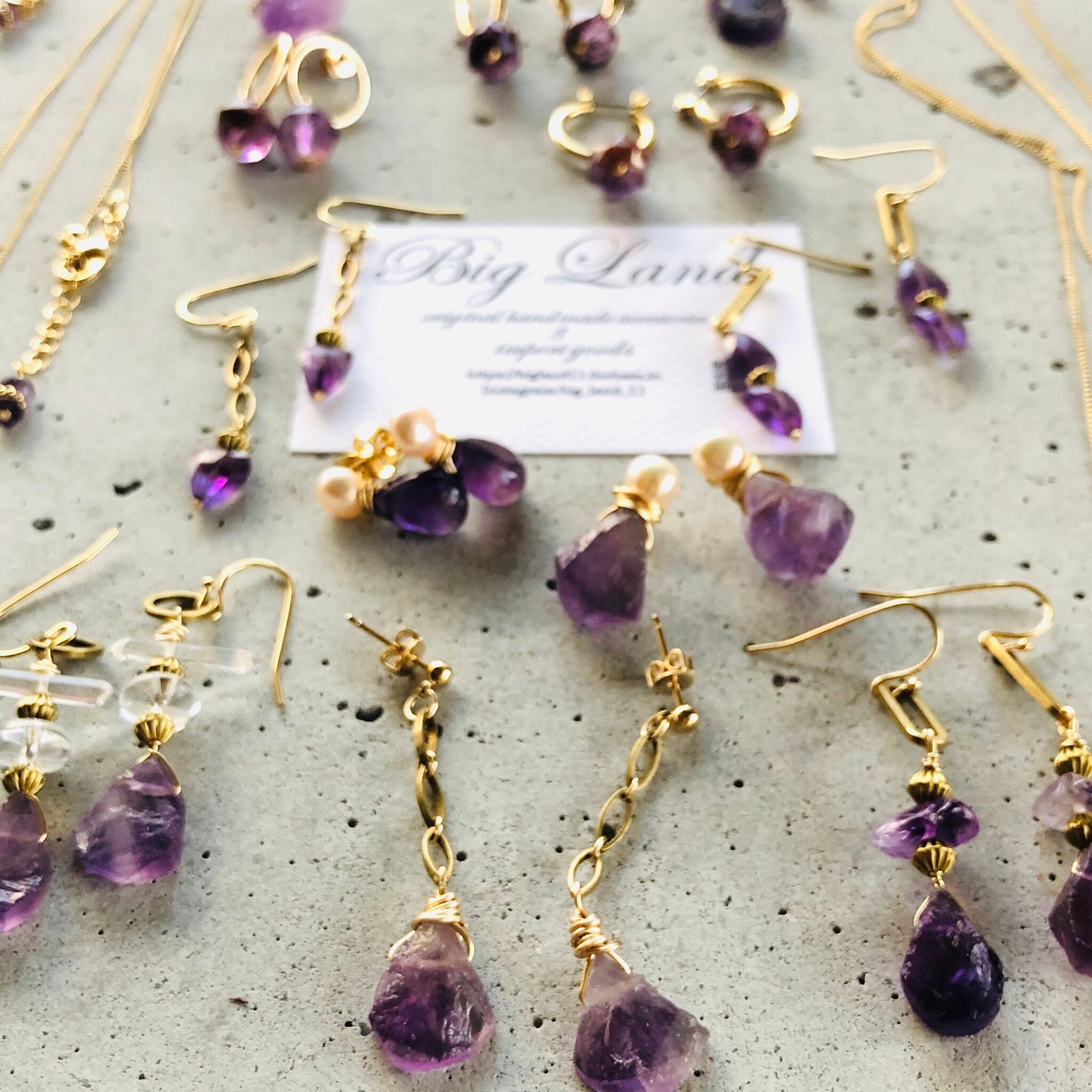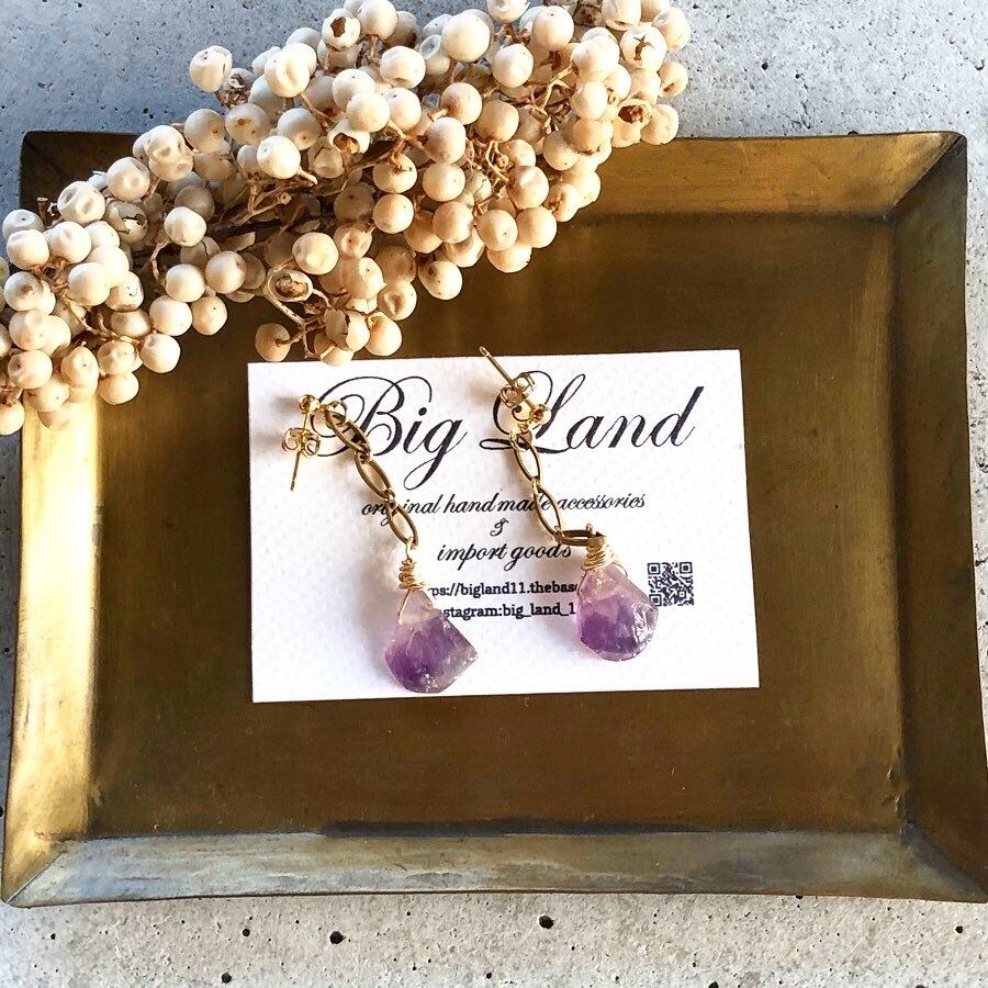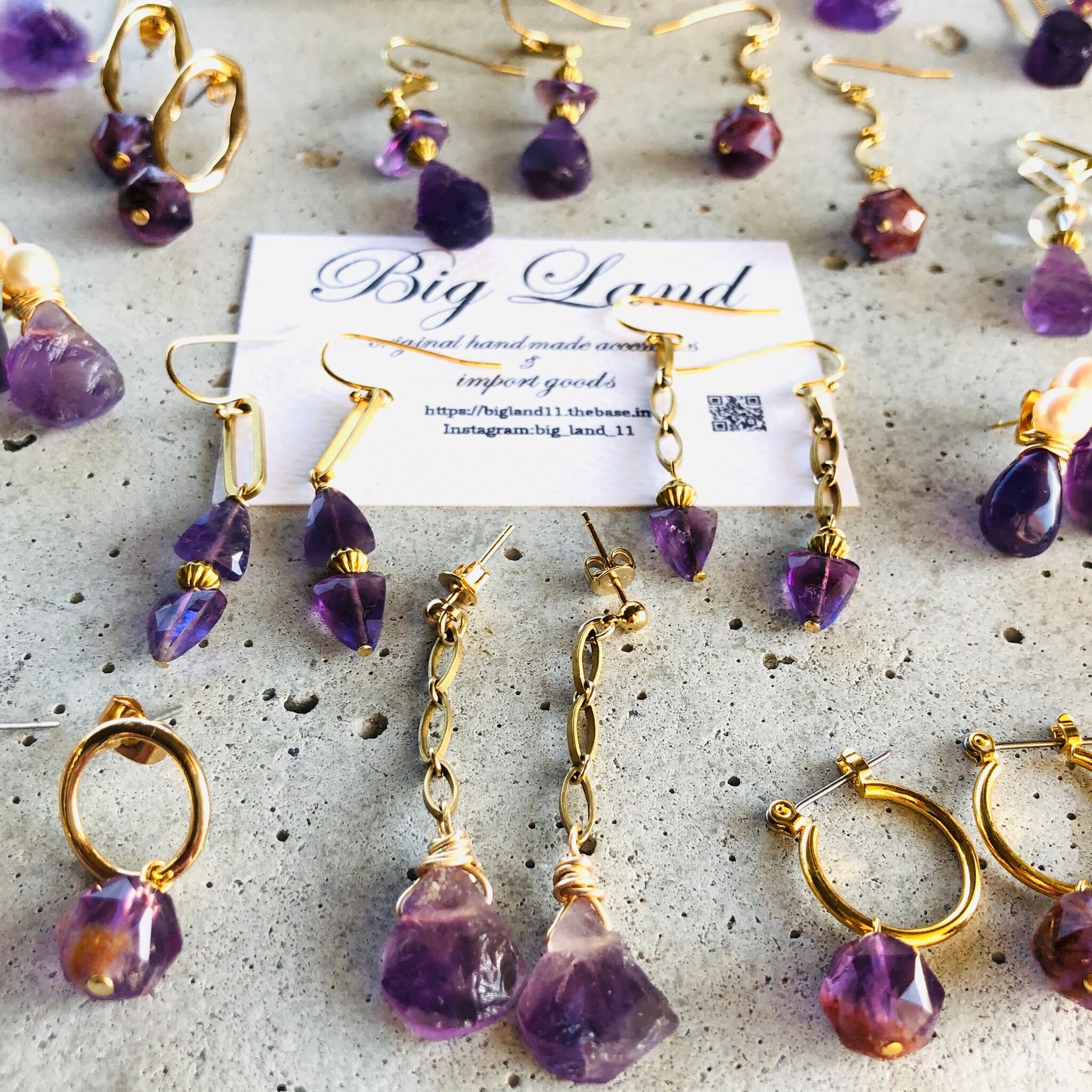 2月生まれのパワーストン、高貴な紫色「アメジスト」珍しいしずく型アメジスト原石と真鍮を使いどこかエキゾチックな雰囲気漂う一点モノのピアスに仕上げ....綺麗目ファッションから白ティーデニムとカジュアルスタイルにもgood✨