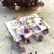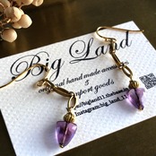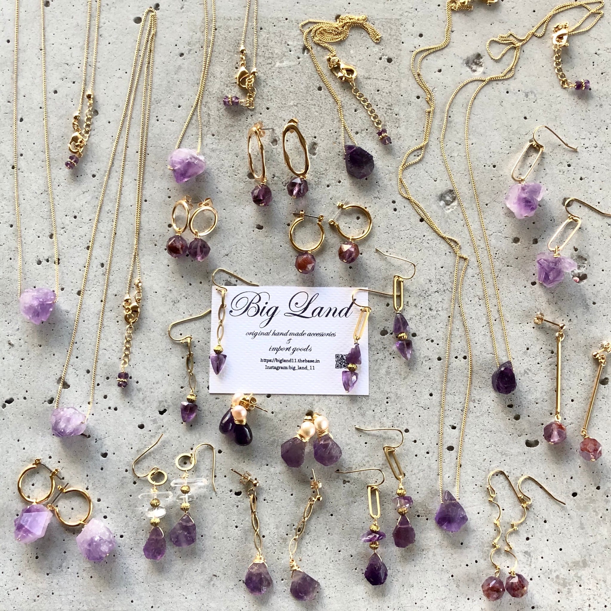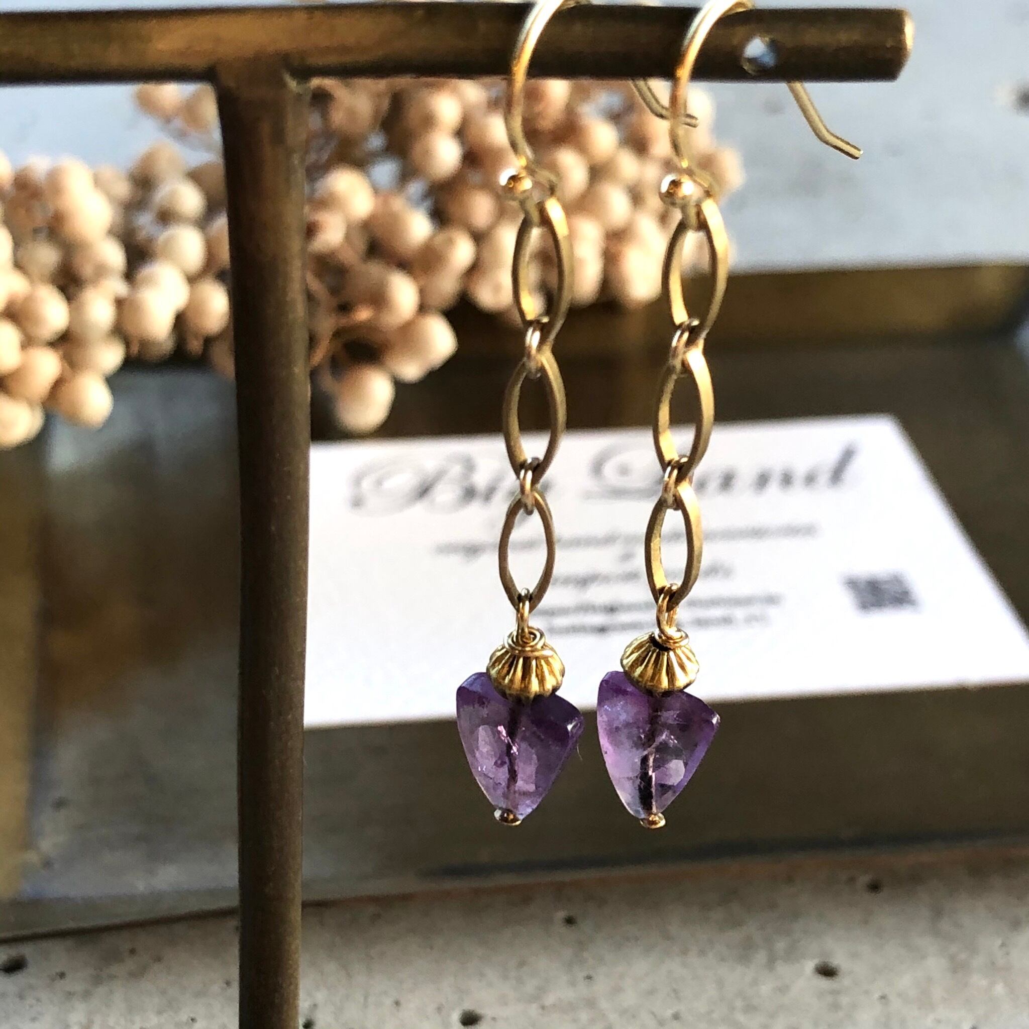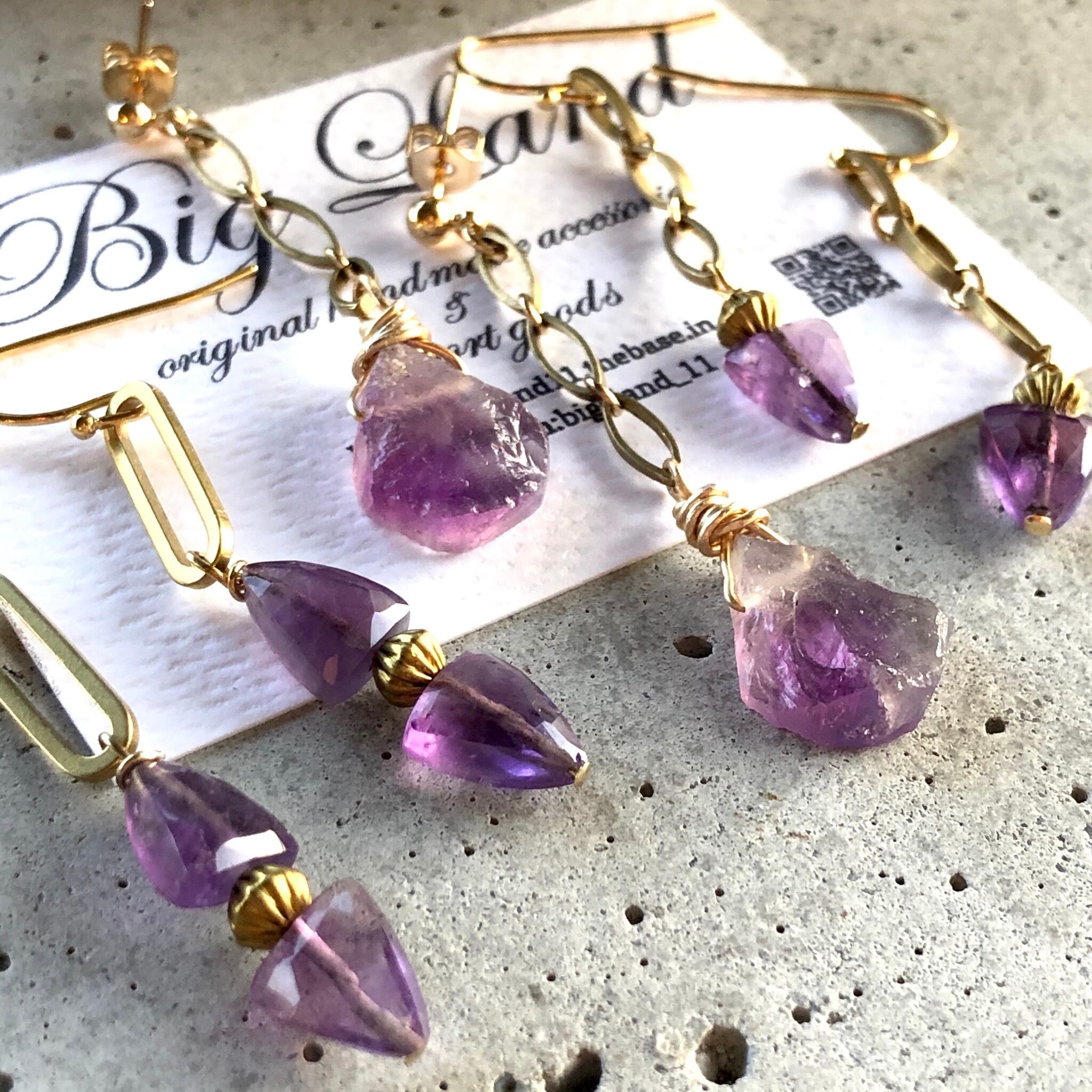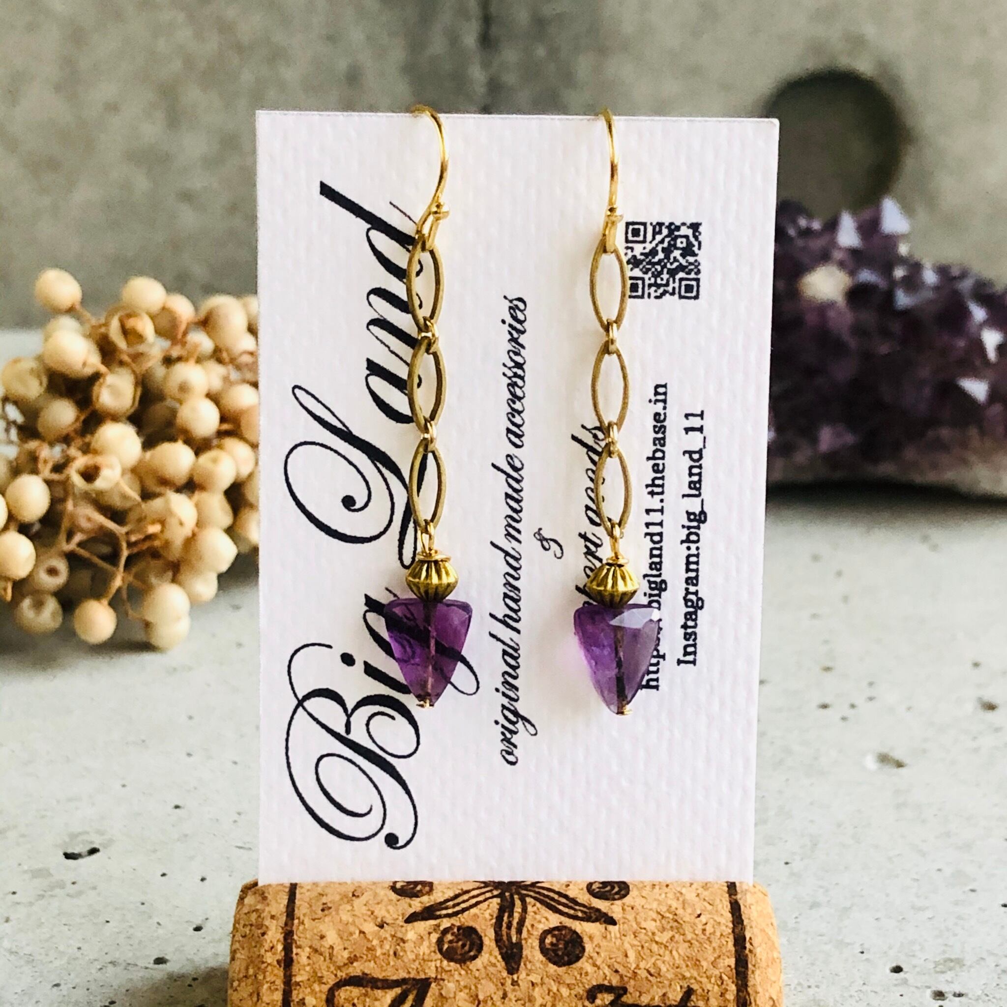 2月生まれのパワーストン、高貴な紫色「アメジスト」美しいカッティングのアメジストと真鍮を使いどこかエキゾチックな雰囲気漂うピアスに仕上げ....綺麗目ファッションから白ティーデニムとカジュアルスタイルにもgood✨