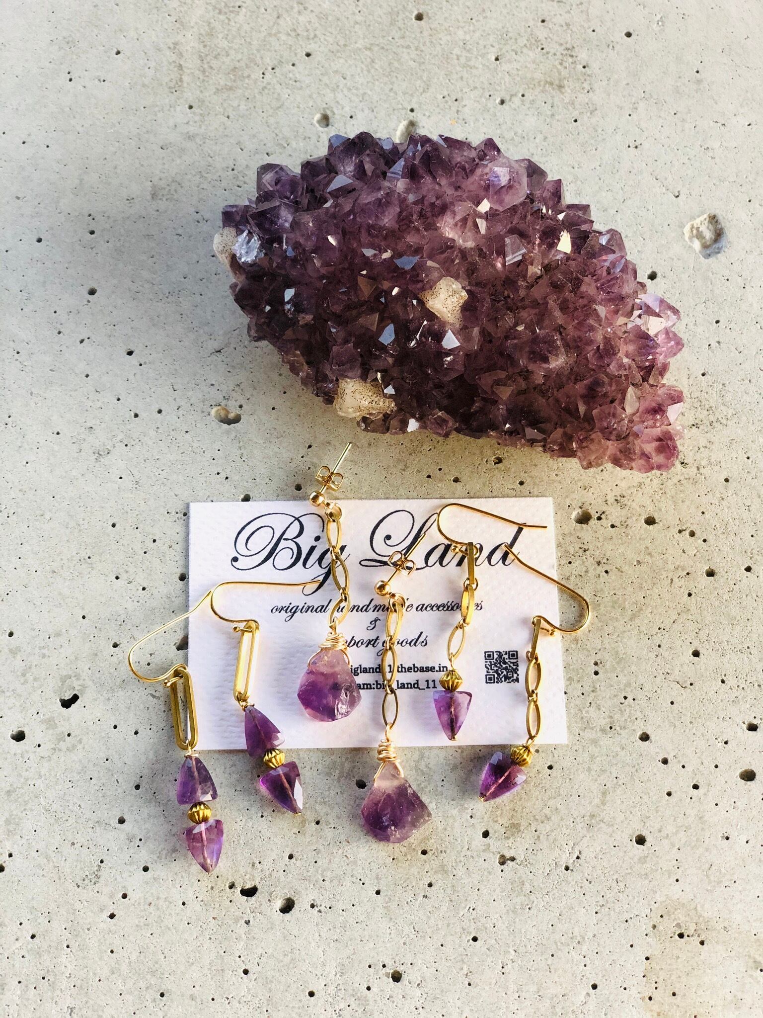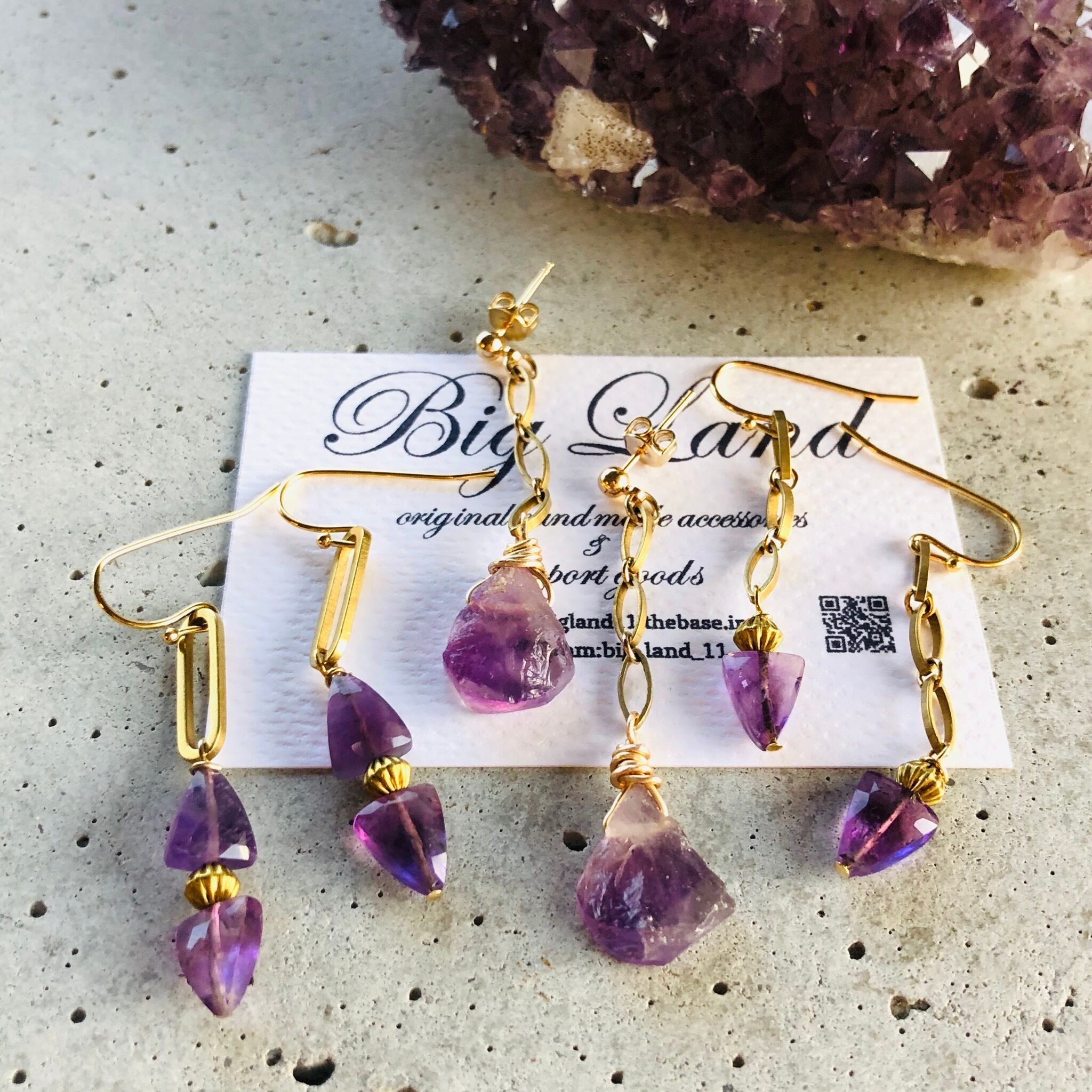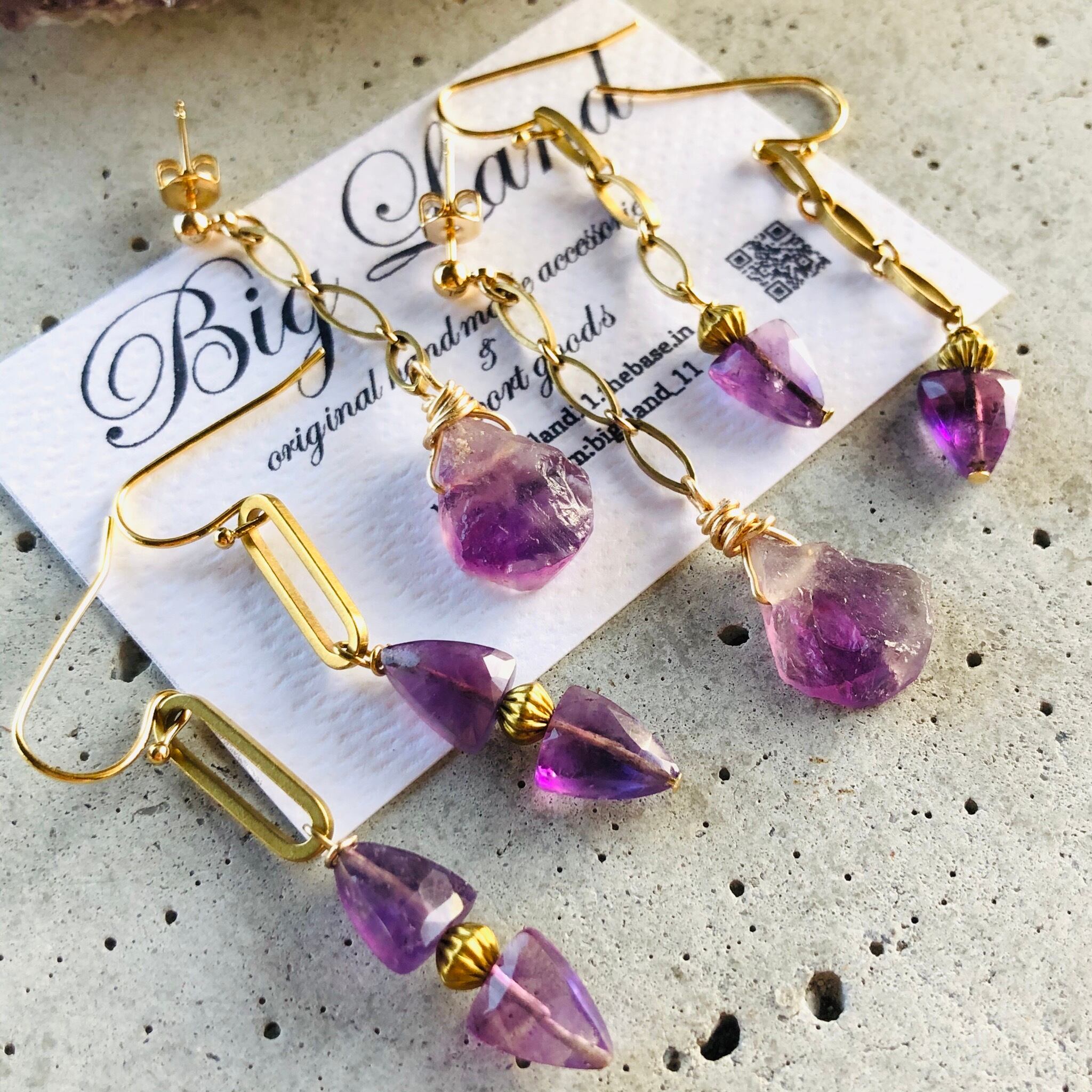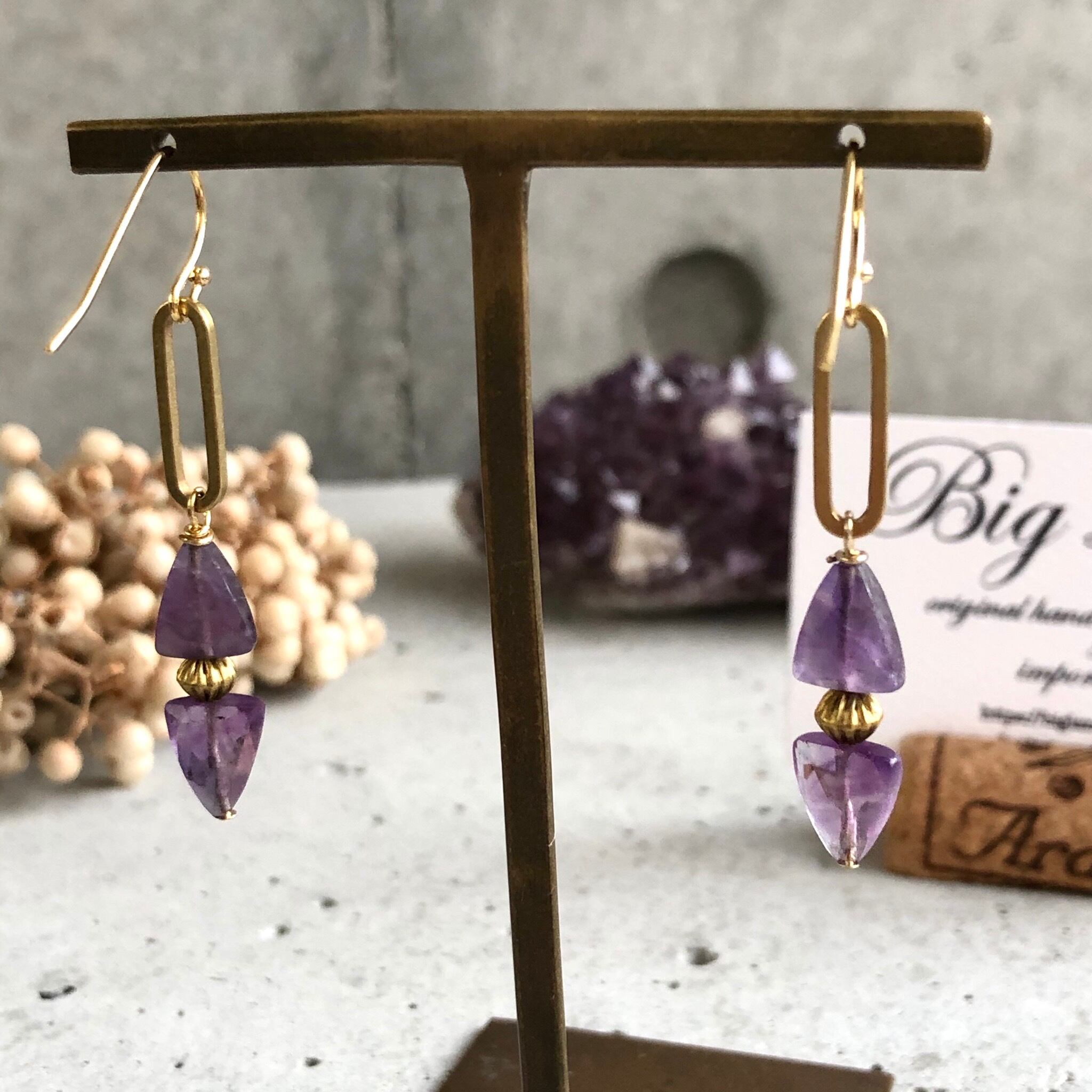2月生まれのパワーストン、高貴な紫色「アメジスト」美しいカッティングのアメジストと真鍮を使いどこかエキゾチックな雰囲気漂うピアスに仕上げ....綺麗目ファッションから白ティーデニムとカジュアルスタイルにもgood✨