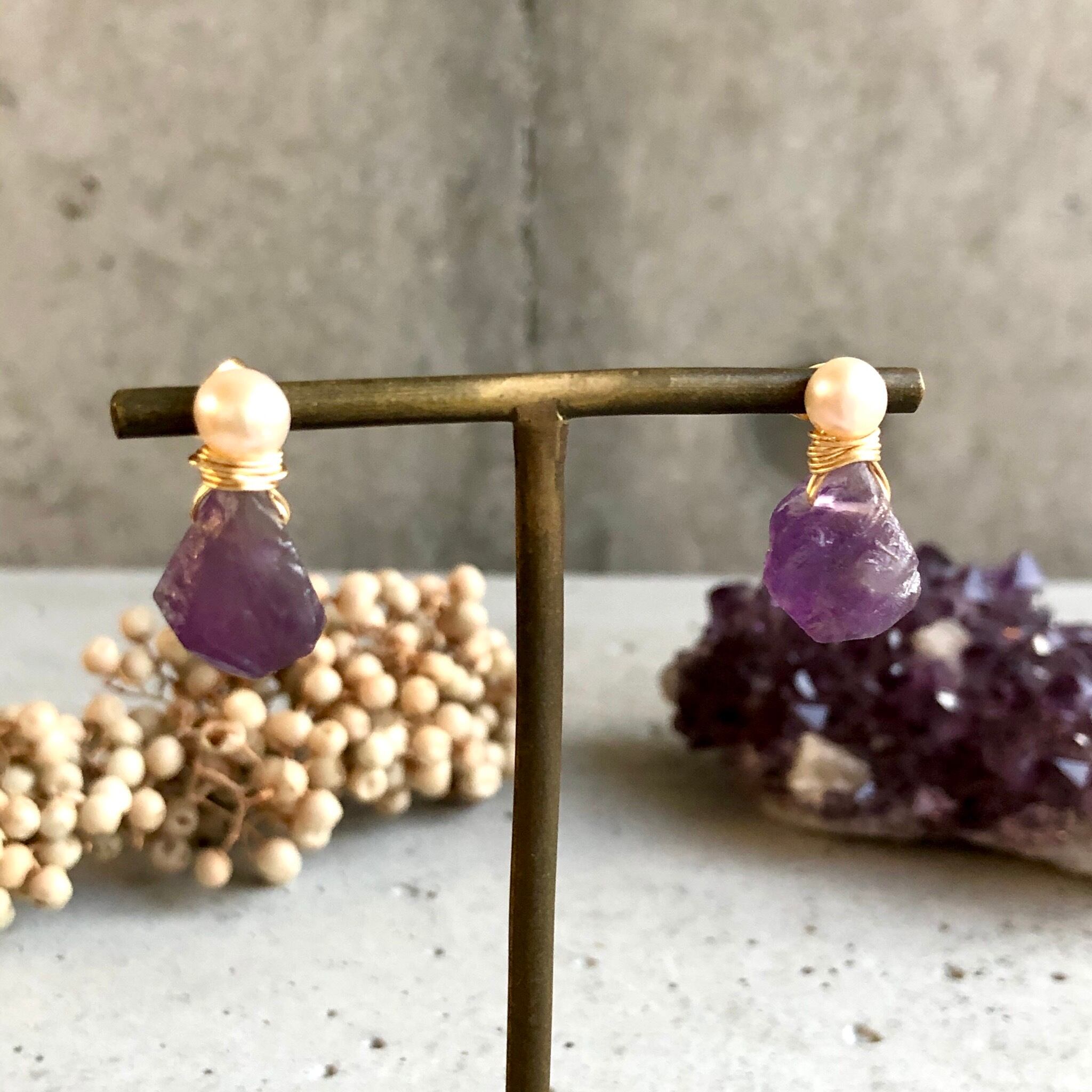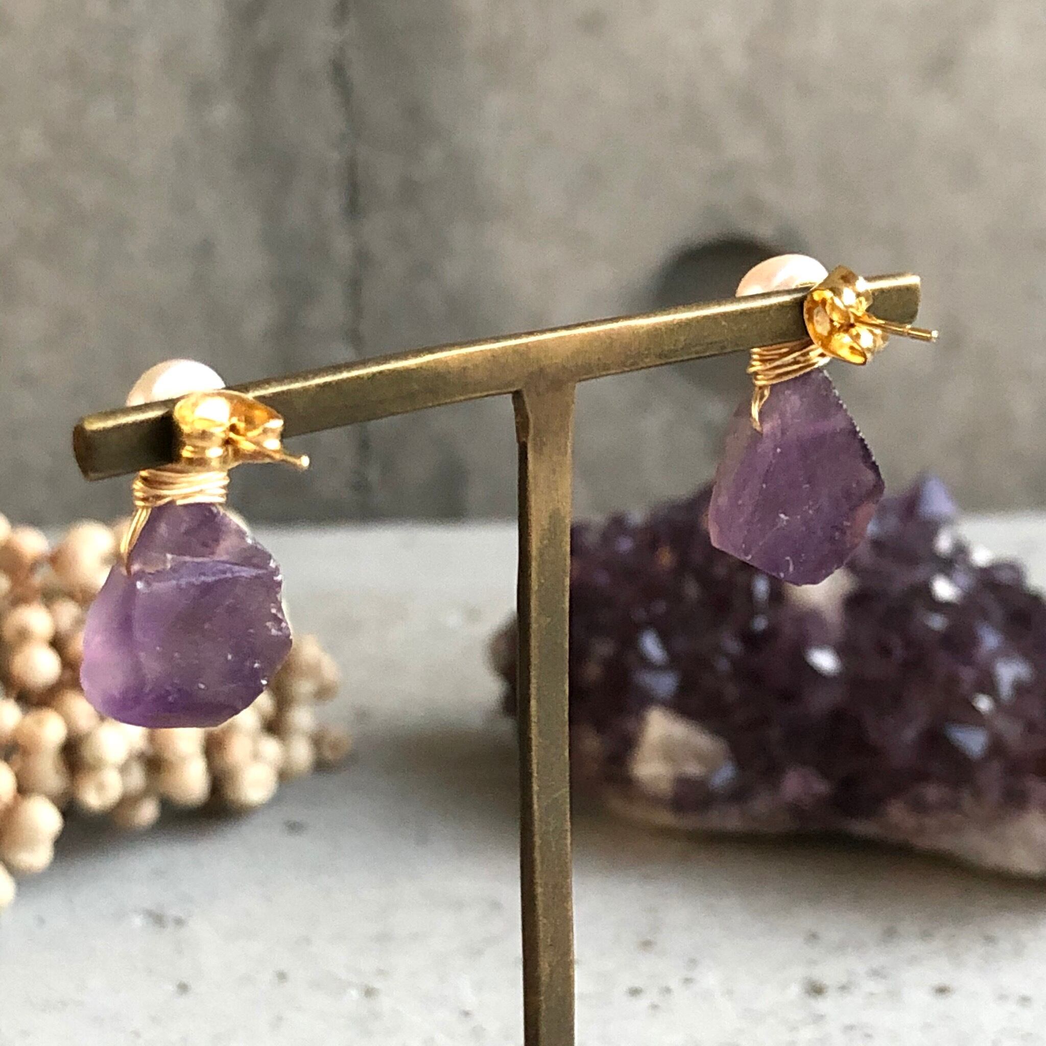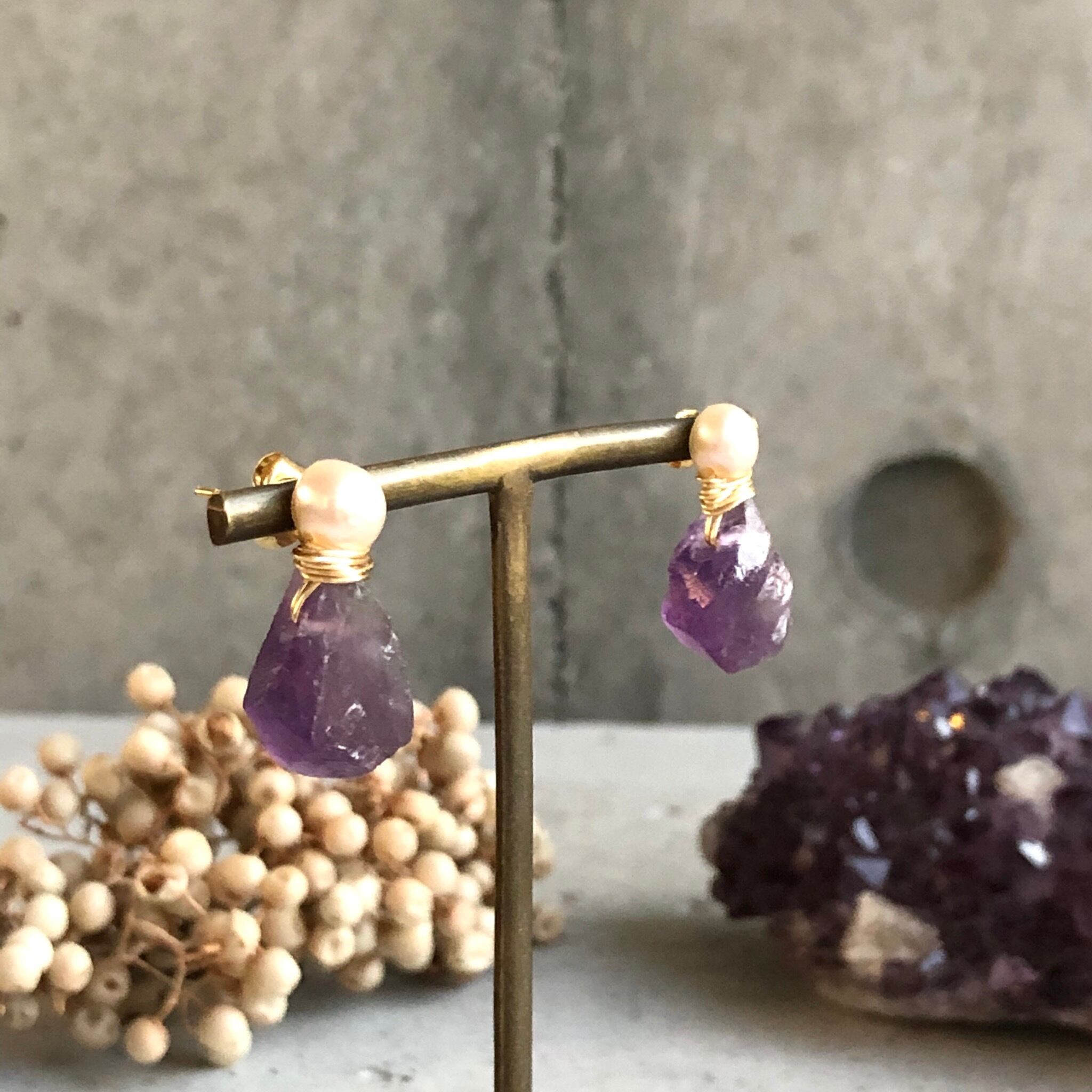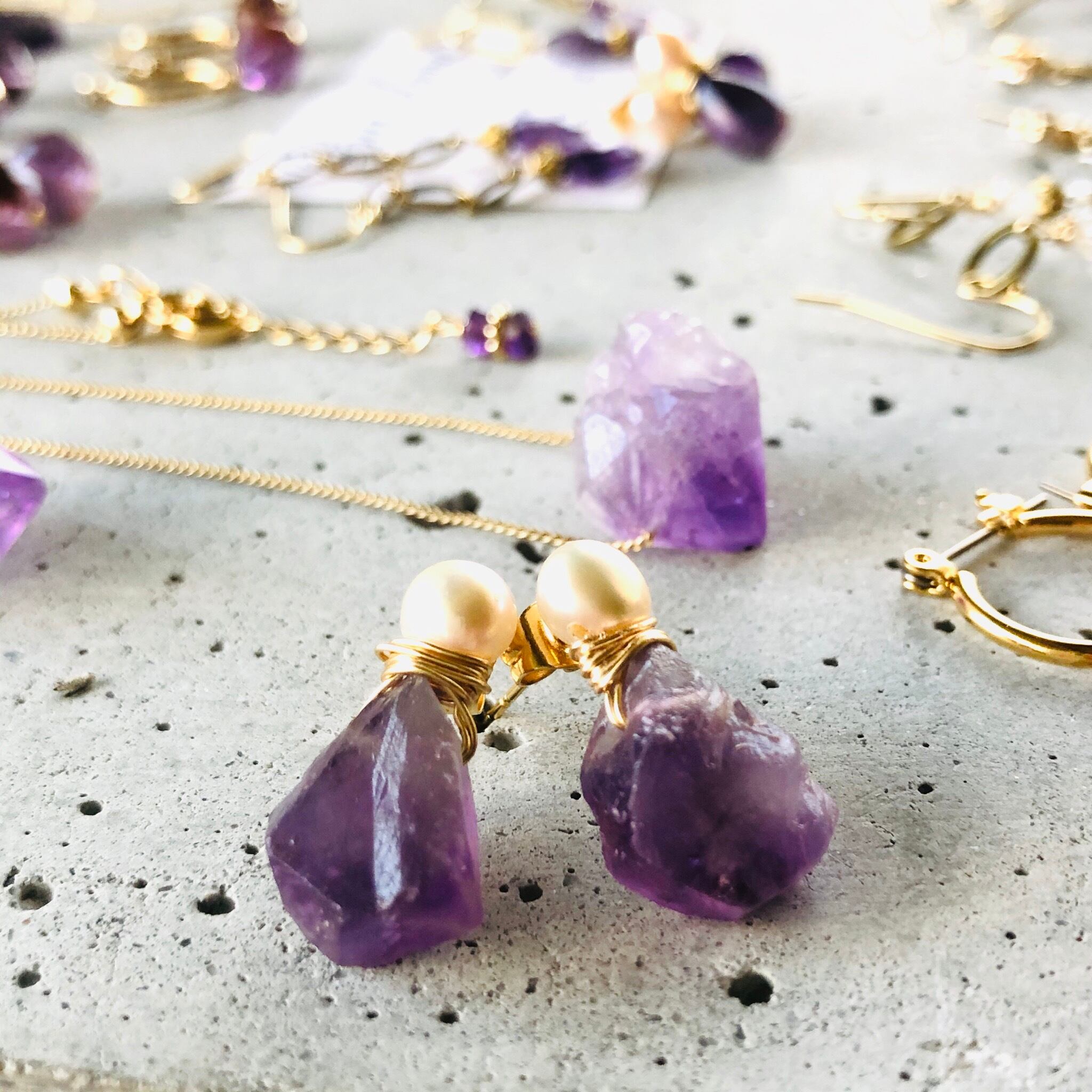 2月生まれのパワーストン、高貴な紫色「アメジスト」珍しいしずく型アメジスト原石とパールを組み合わせ、アレルギーの方にオススメのサージカルステンレスのピアスポストを使用‼︎