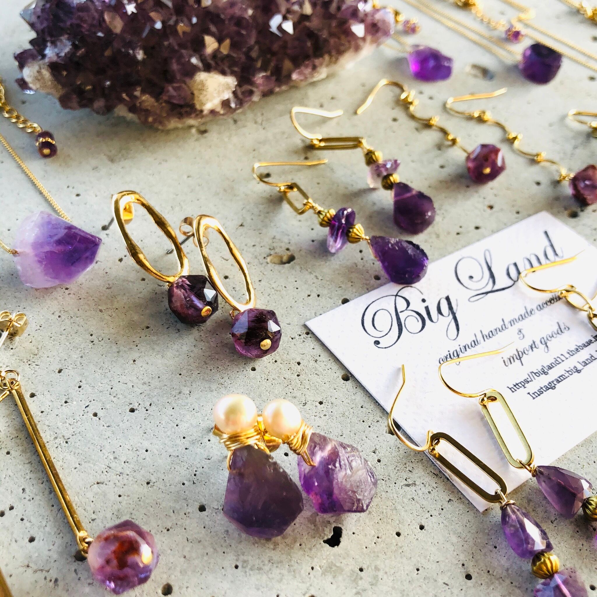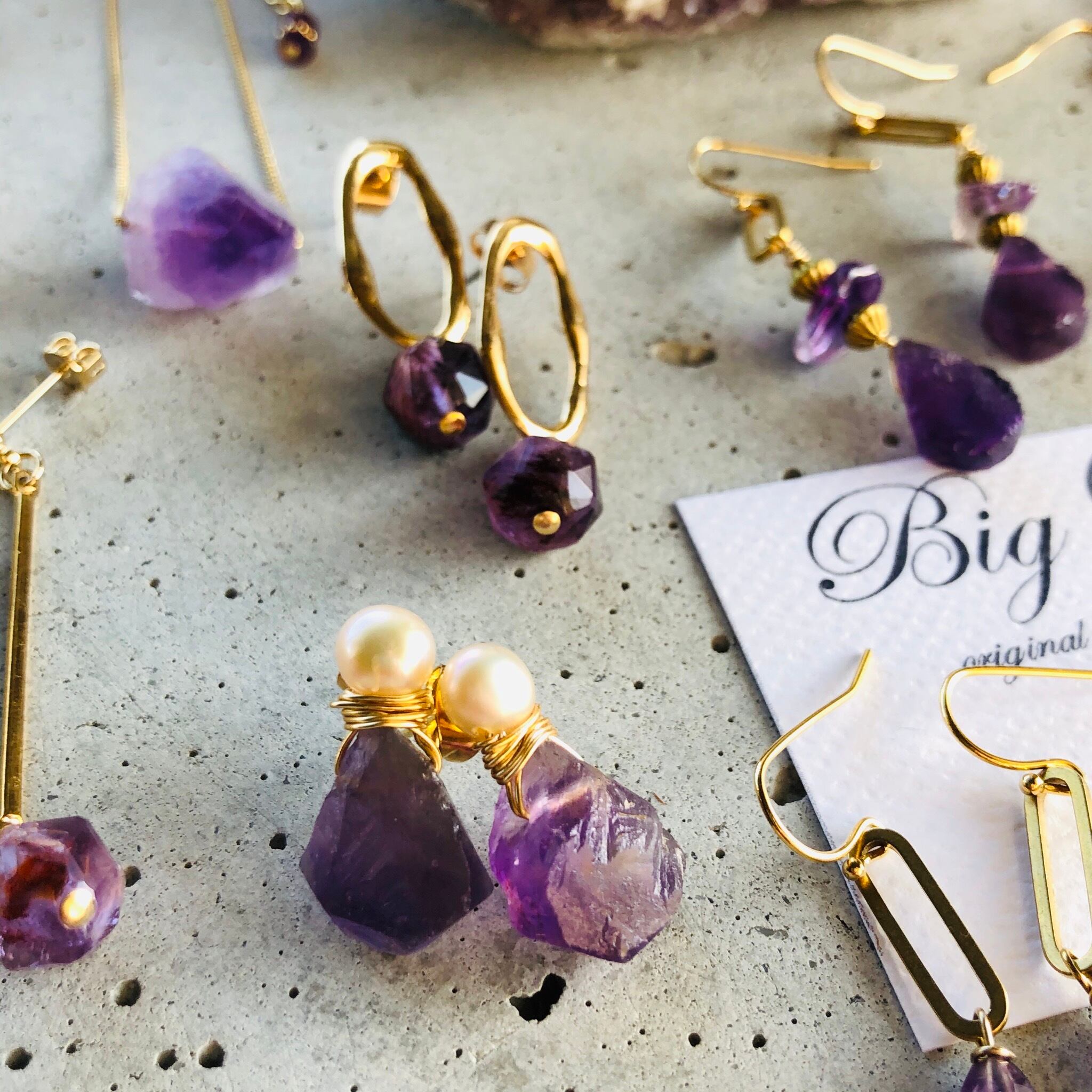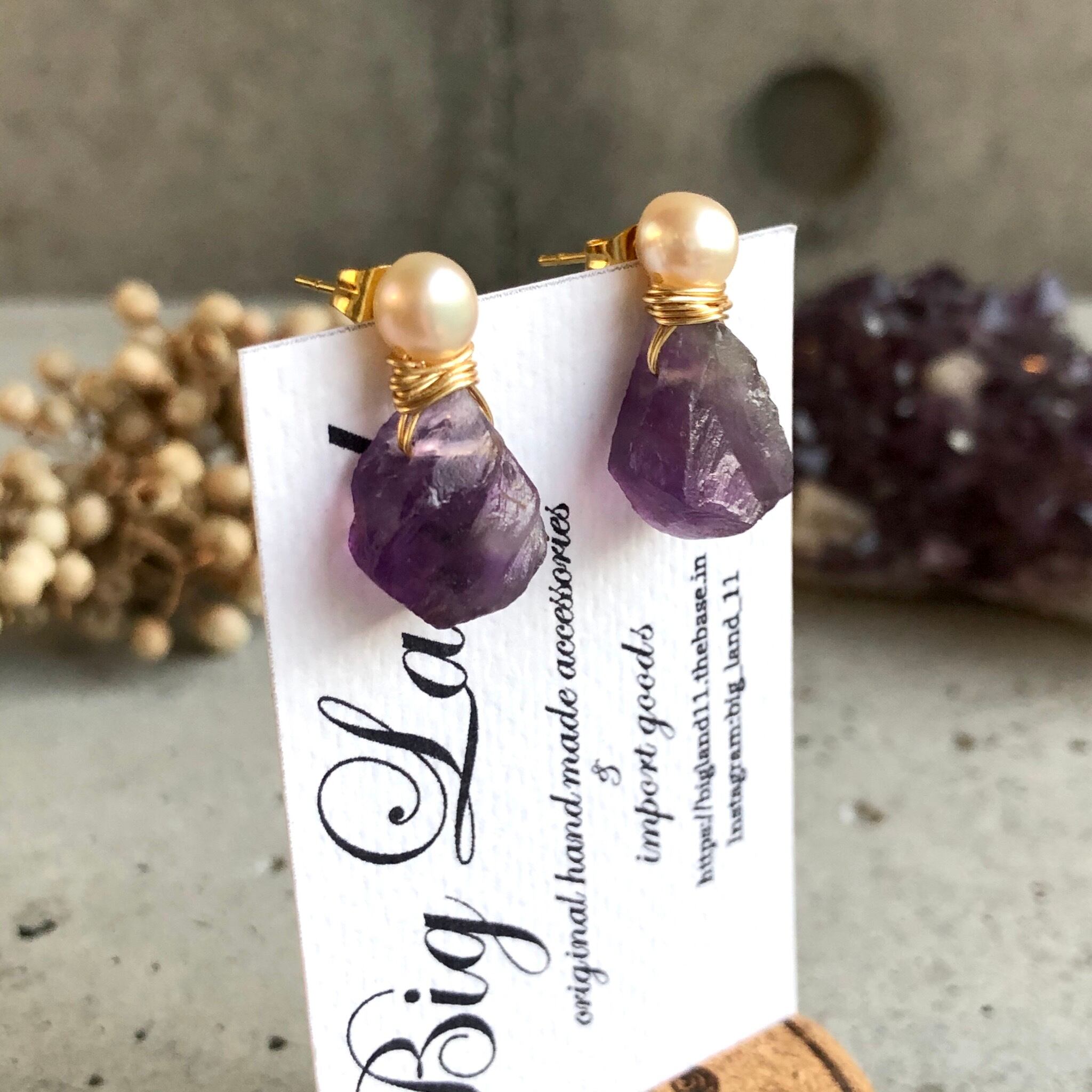 2月生まれのパワーストン、高貴な紫色「アメジスト」珍しいしずく型アメジスト原石とパールを組み合わせ、アレルギーの方にオススメのサージカルステンレスのピアスポストを使用‼︎