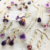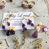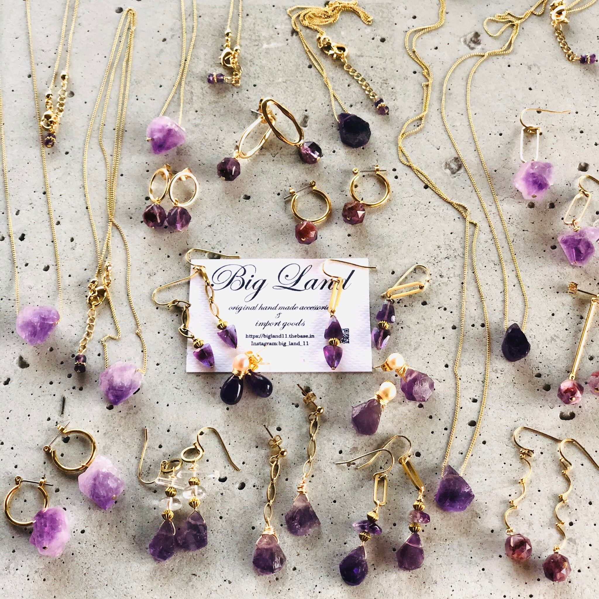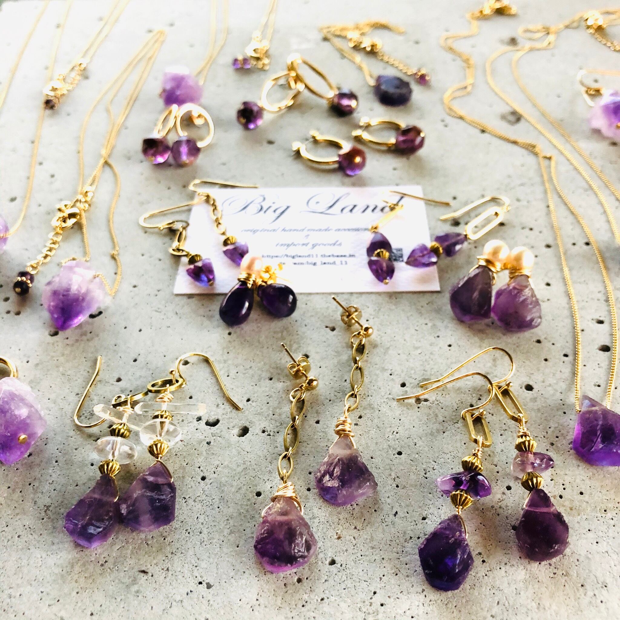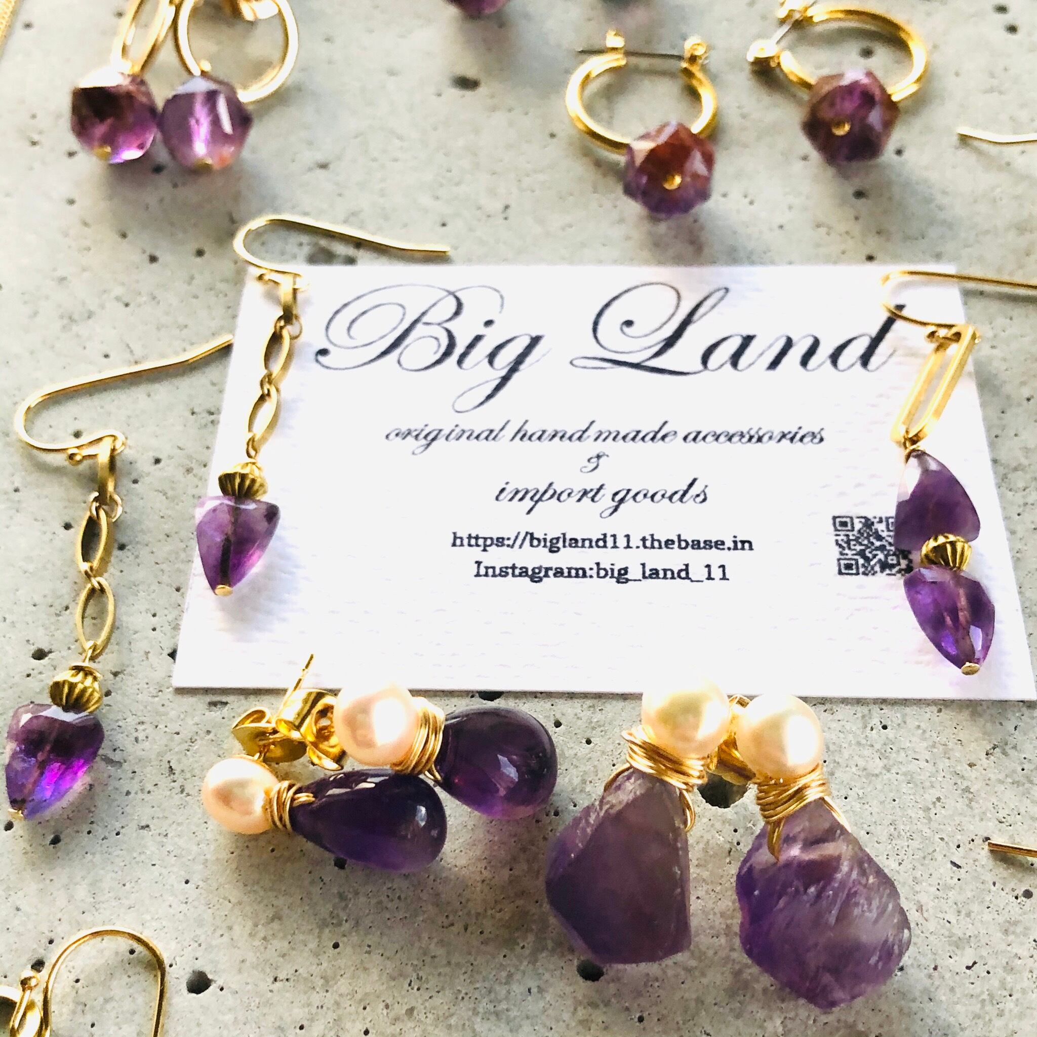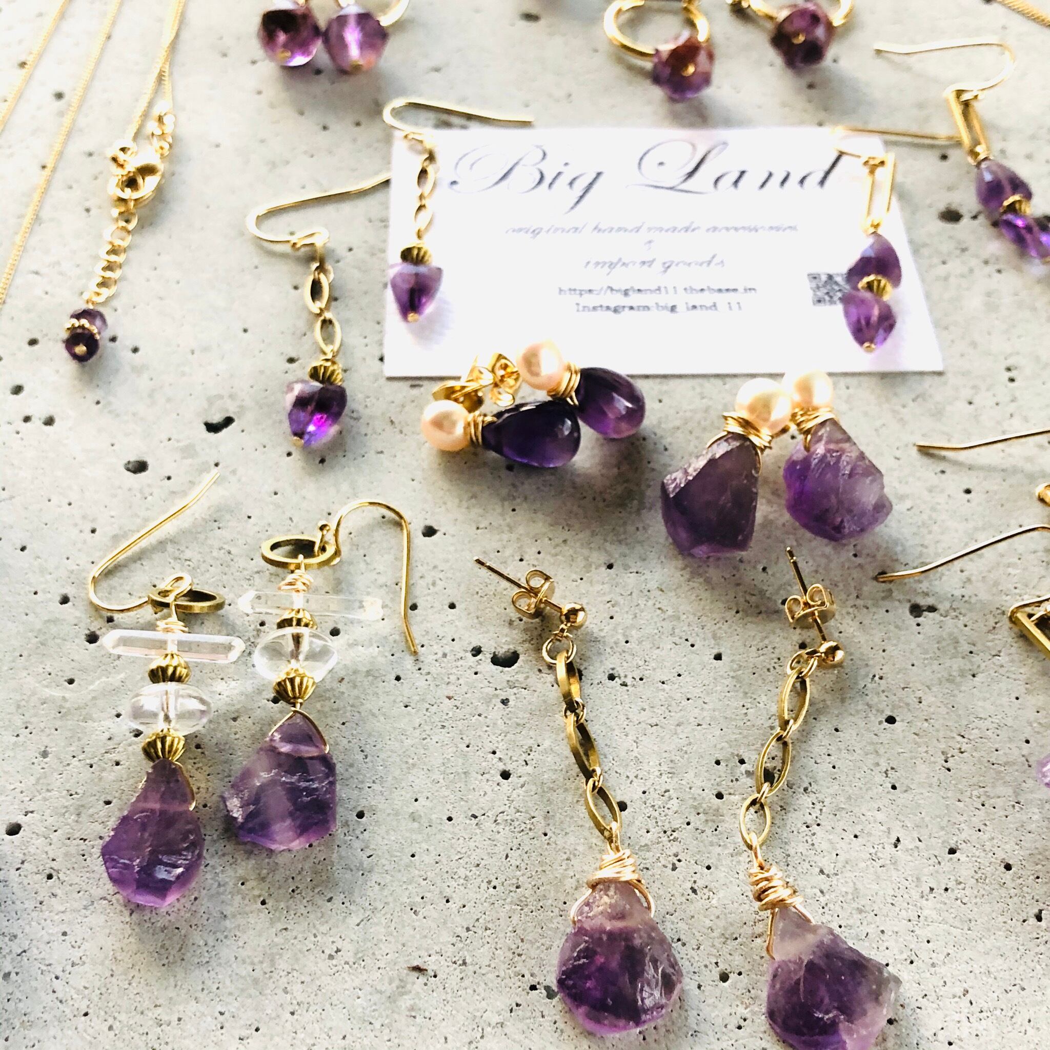 2月生まれのパワーストン、高貴な紫色「アメジスト」珍しいしずく型アメジスト原石とパールを組み合わせ、アレルギーの方にオススメのサージカルステンレスのピアスポストを使用‼︎