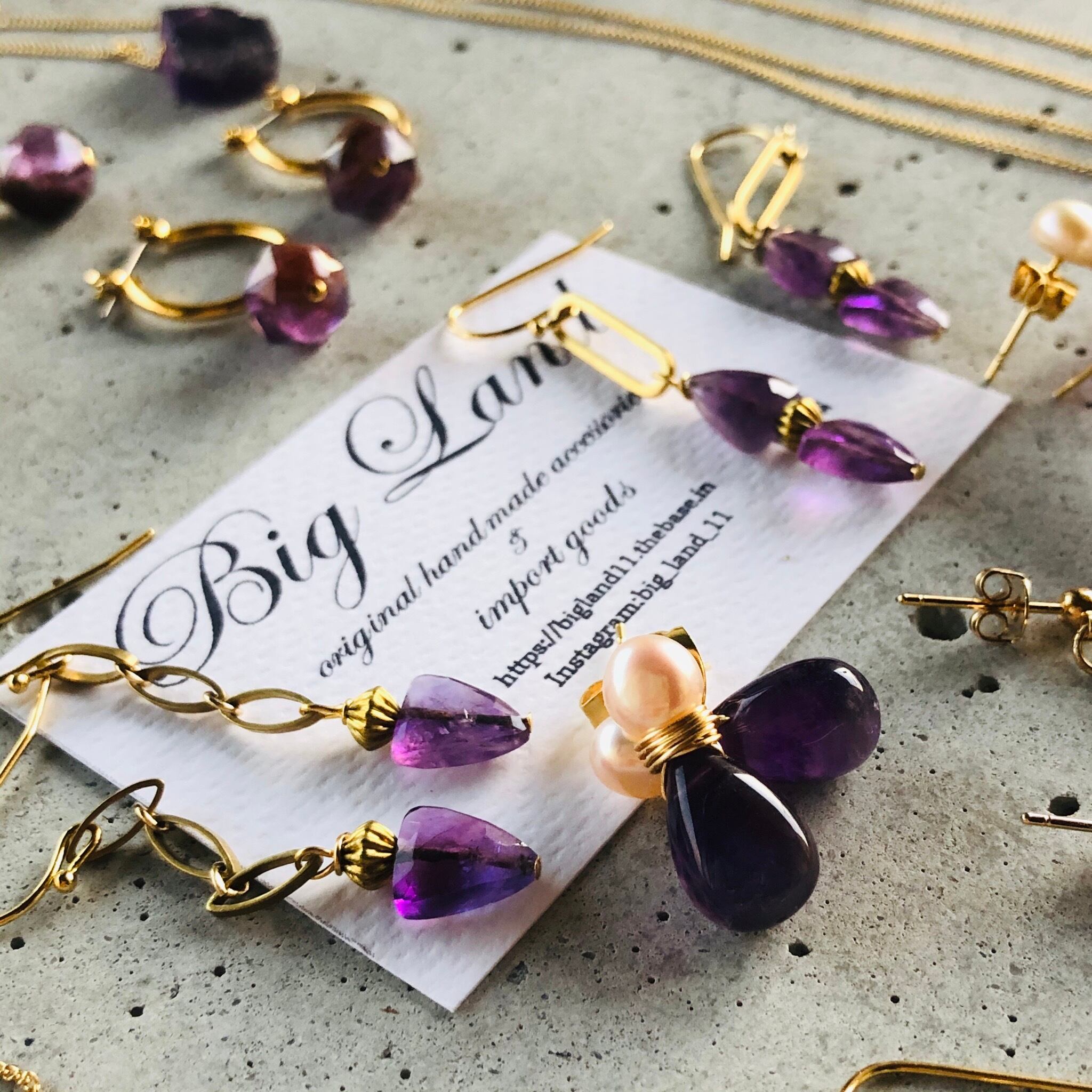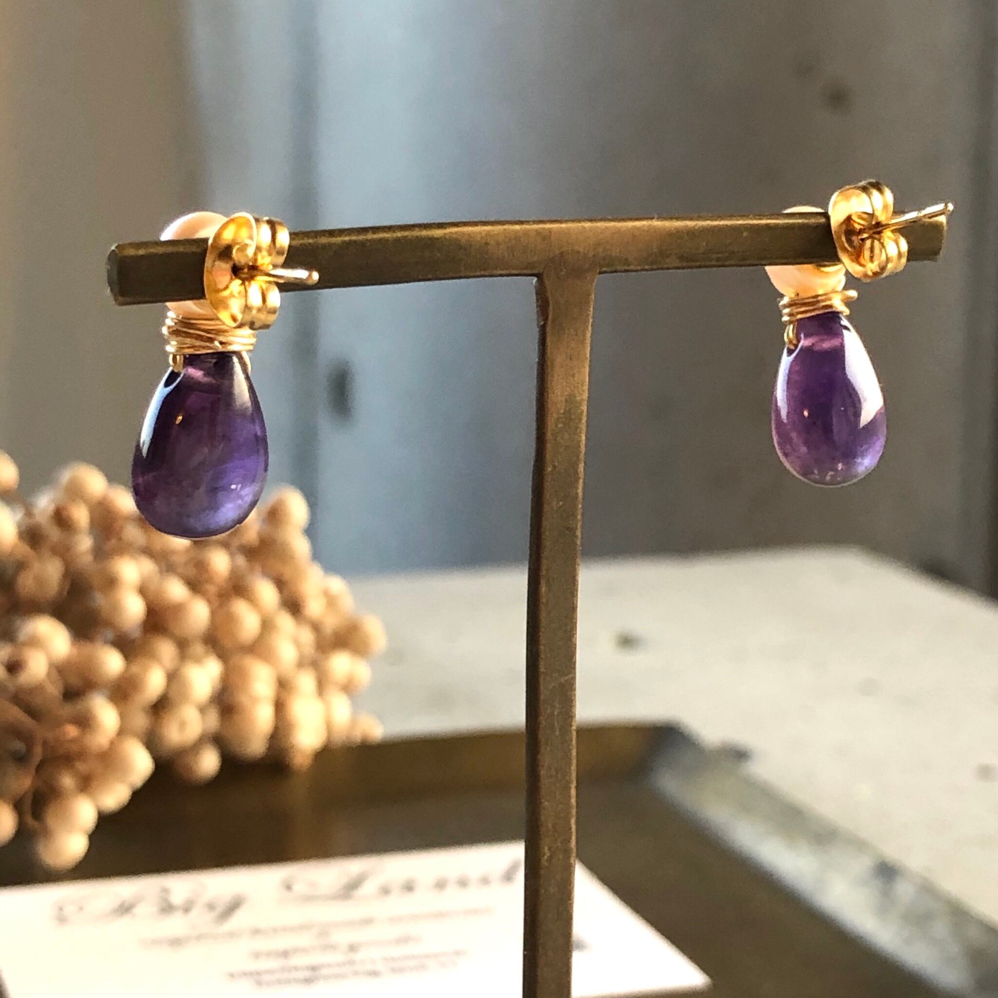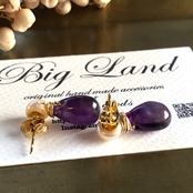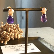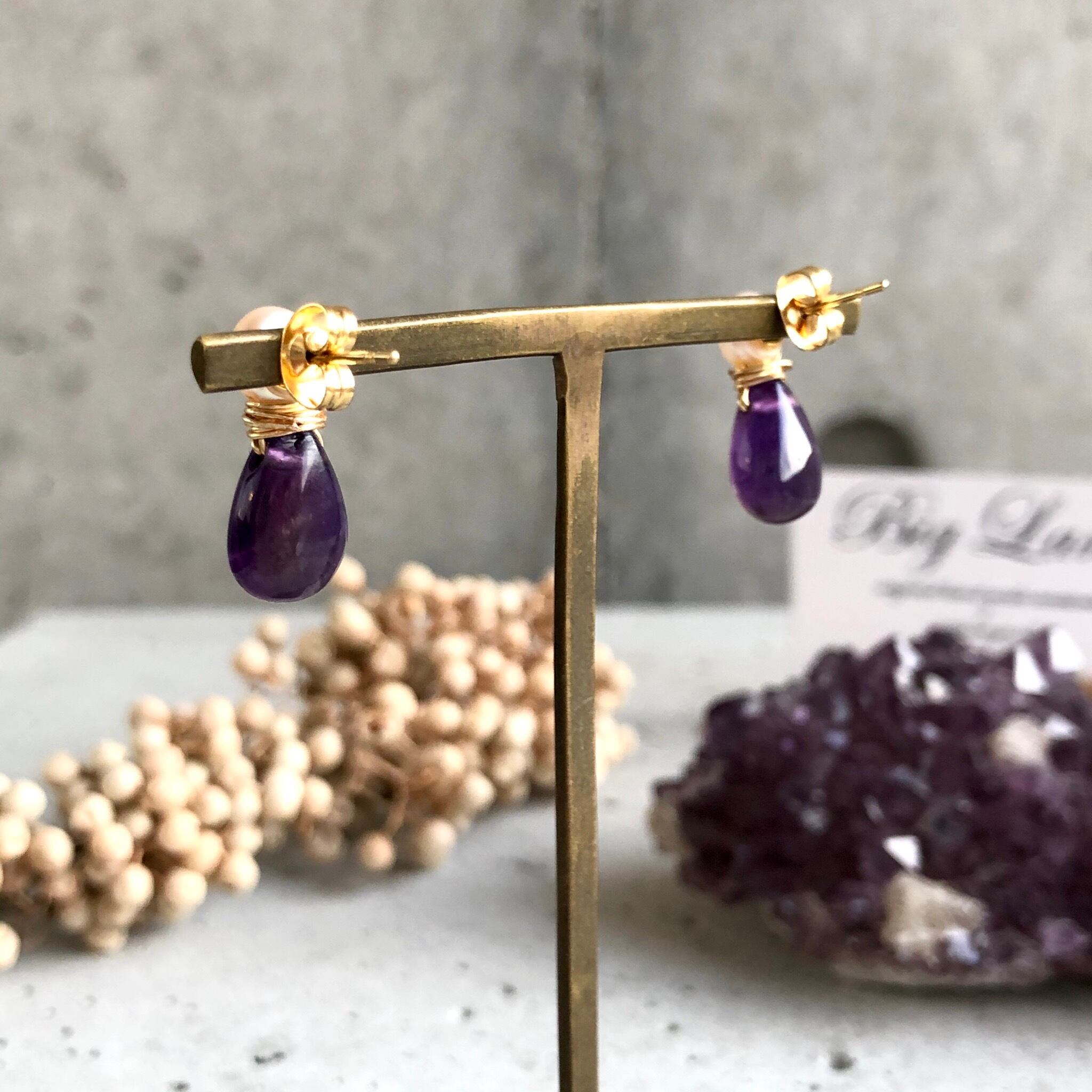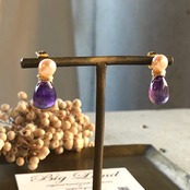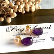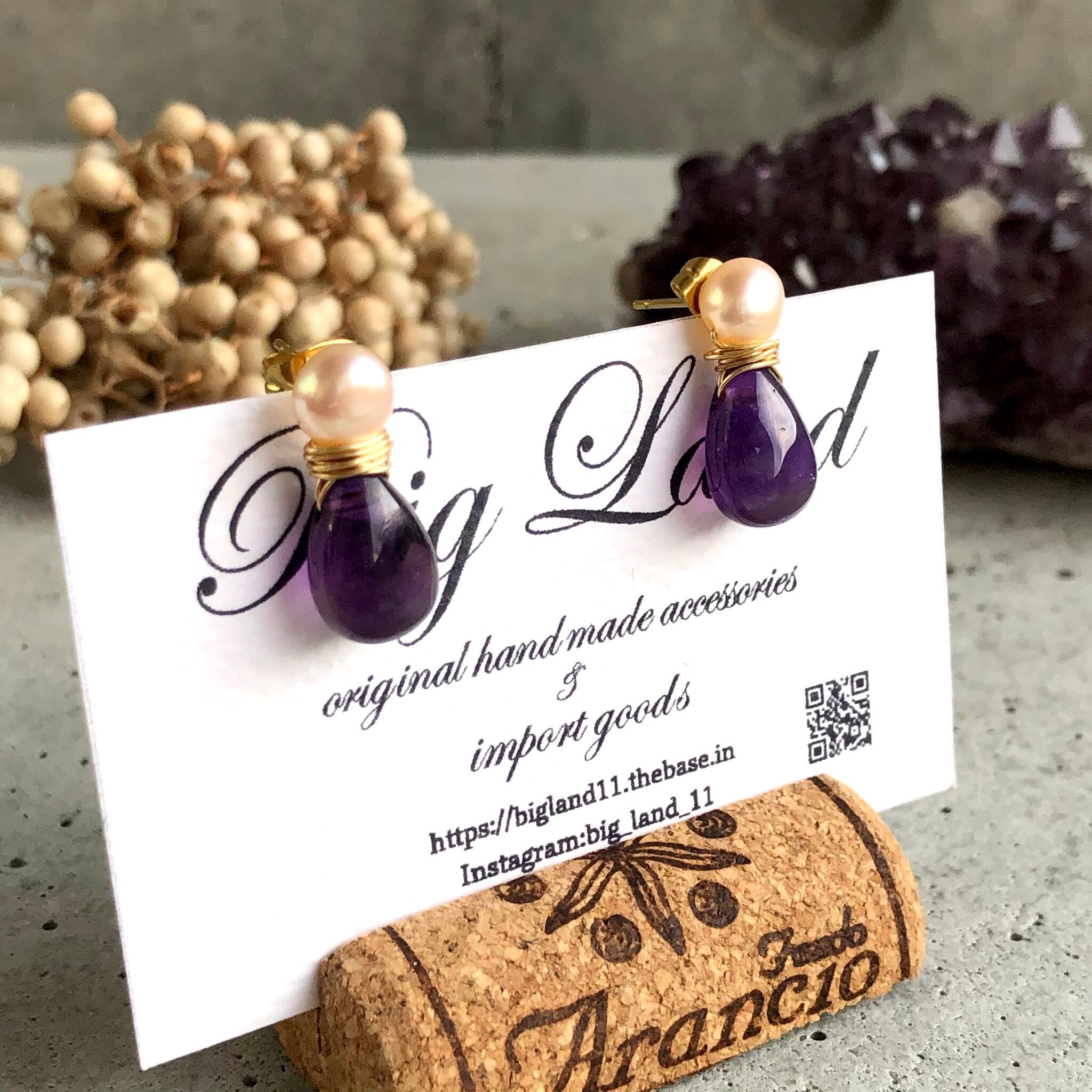 2月生まれのパワーストン、高貴な紫色「アメジスト」珍しいしずく型アメジスト原石とパールを組み合わせ、アレルギーの方にオススメのサージカルステンレスのピアスポストを使用‼︎