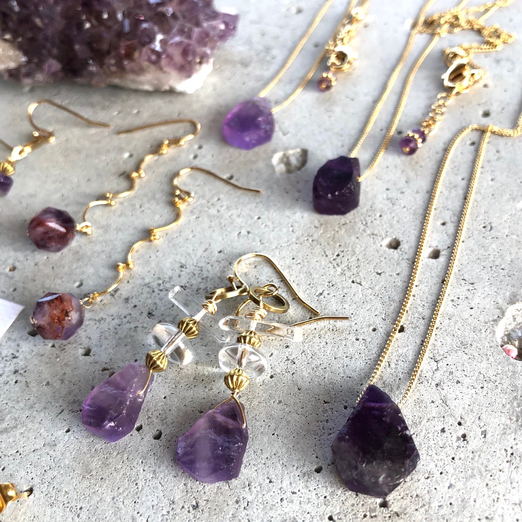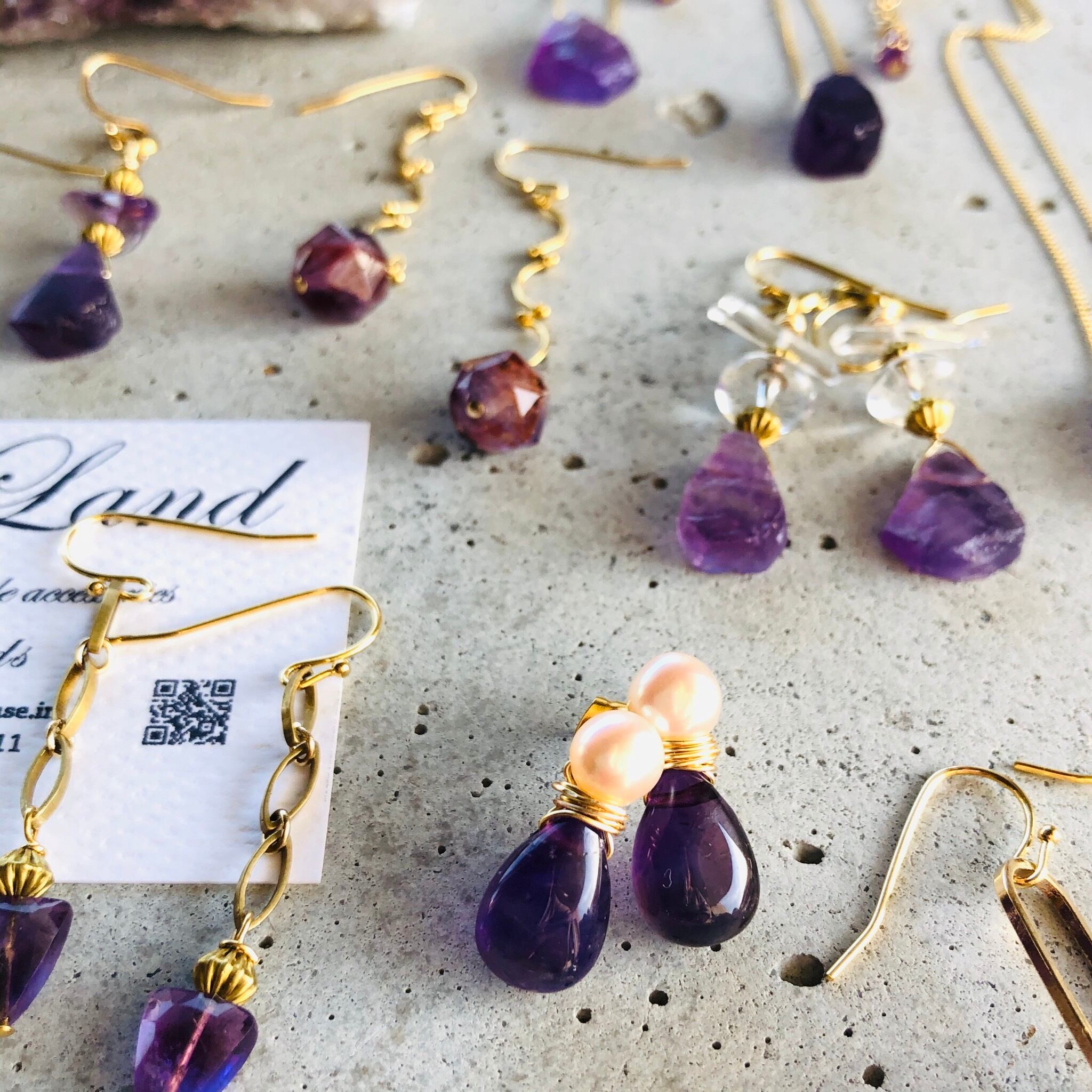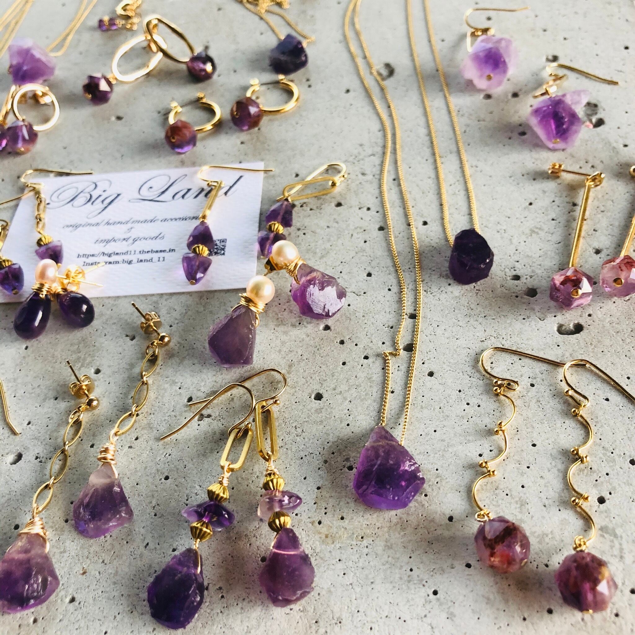 2月生まれのパワーストン、高貴な紫色「アメジスト」美しいカッティングのアメジストを使い人気の揺れ感あるモテピアスに仕上げました✨綺麗目ファッションからカジュアルスタイルにもgood✨
