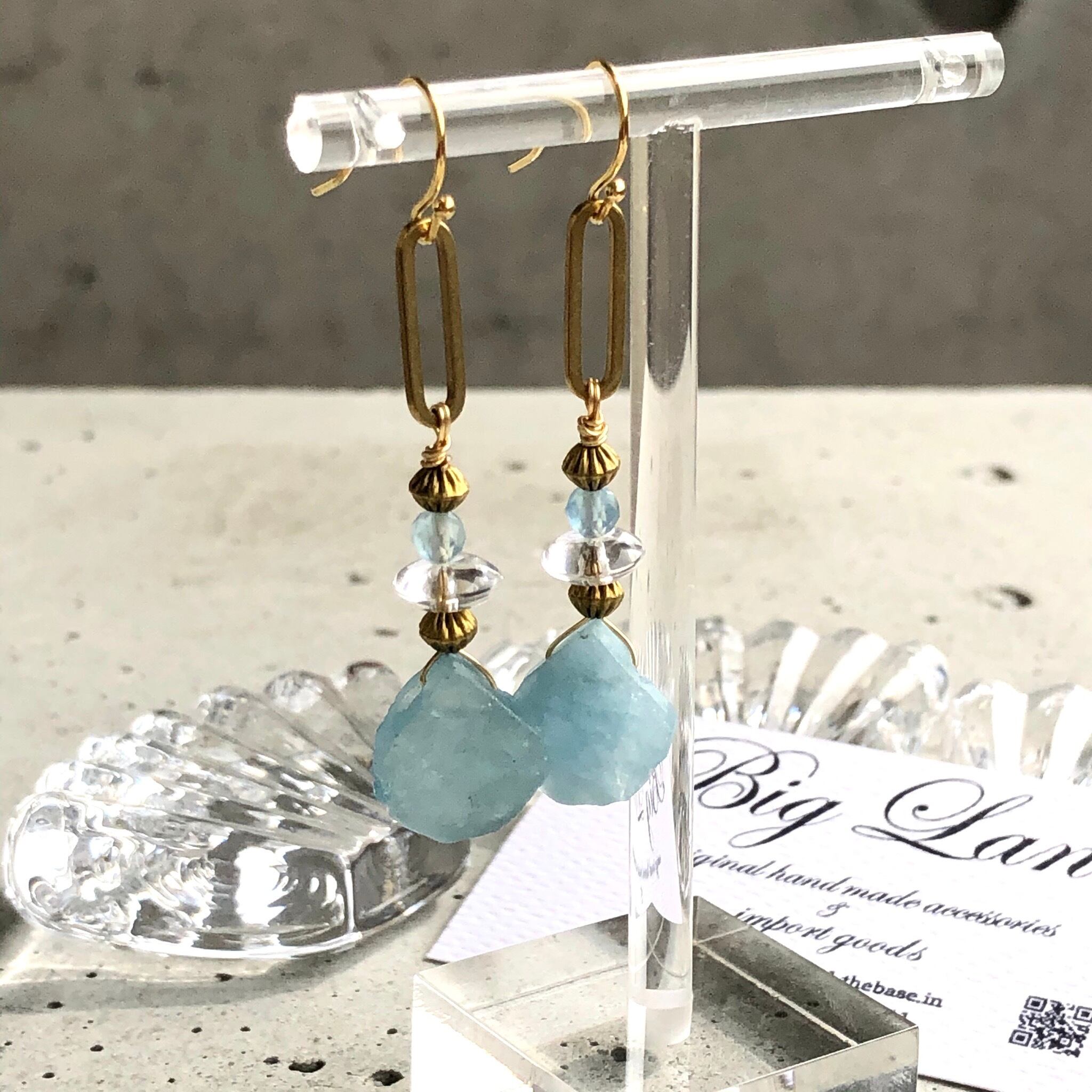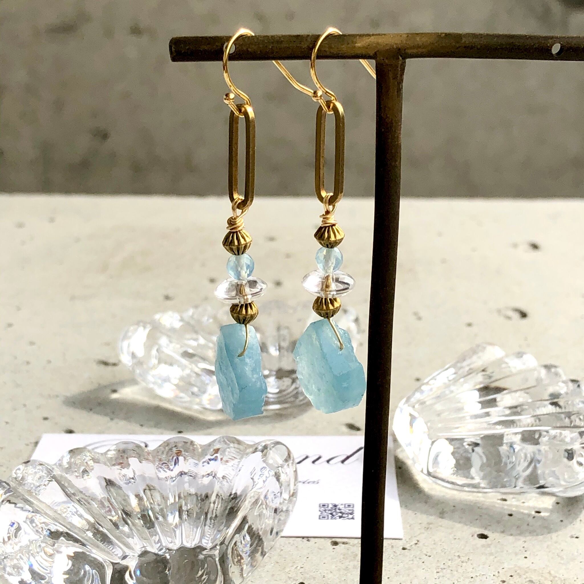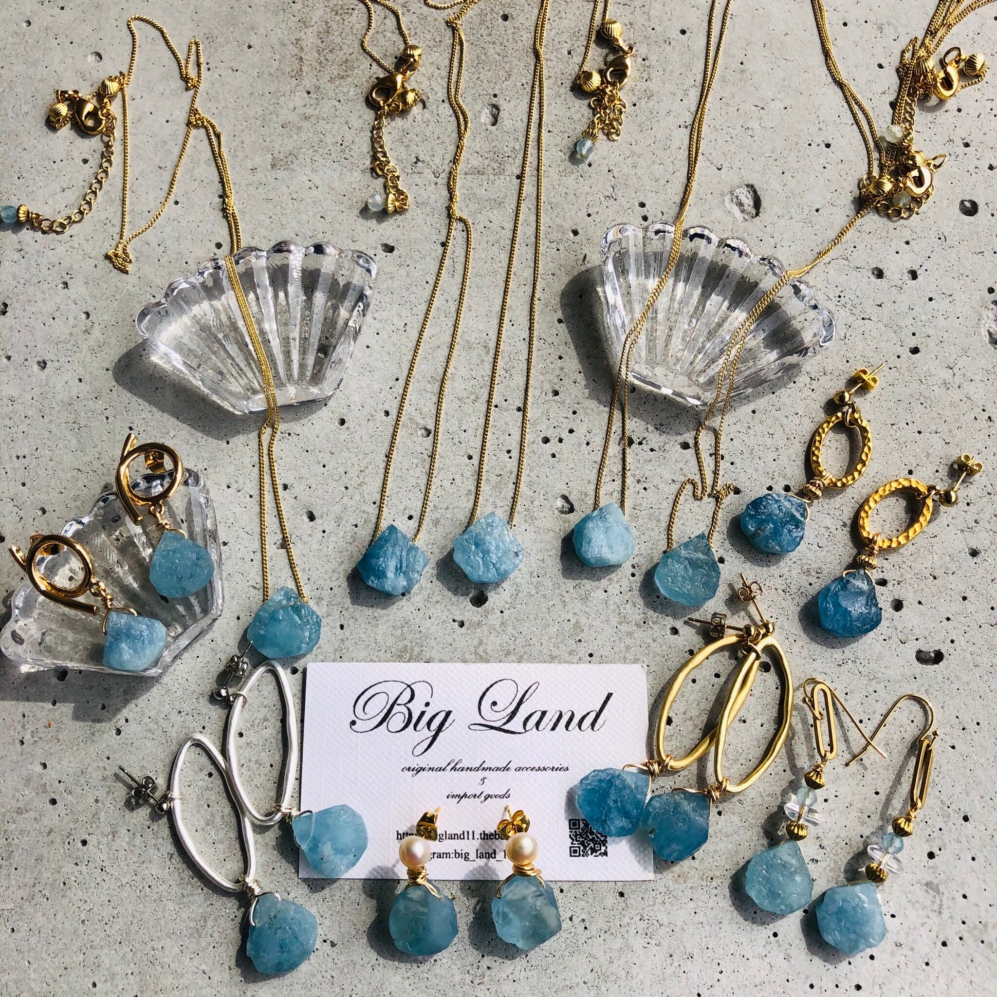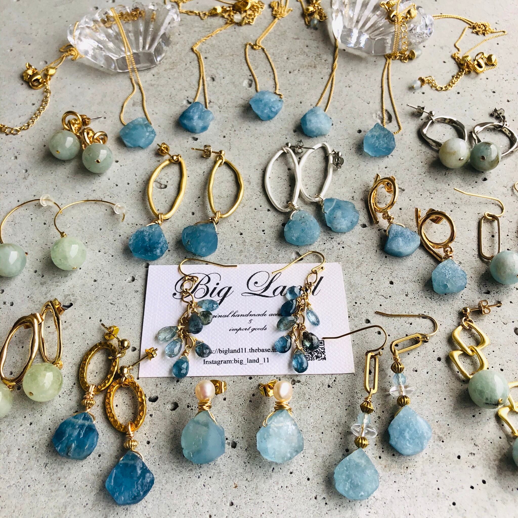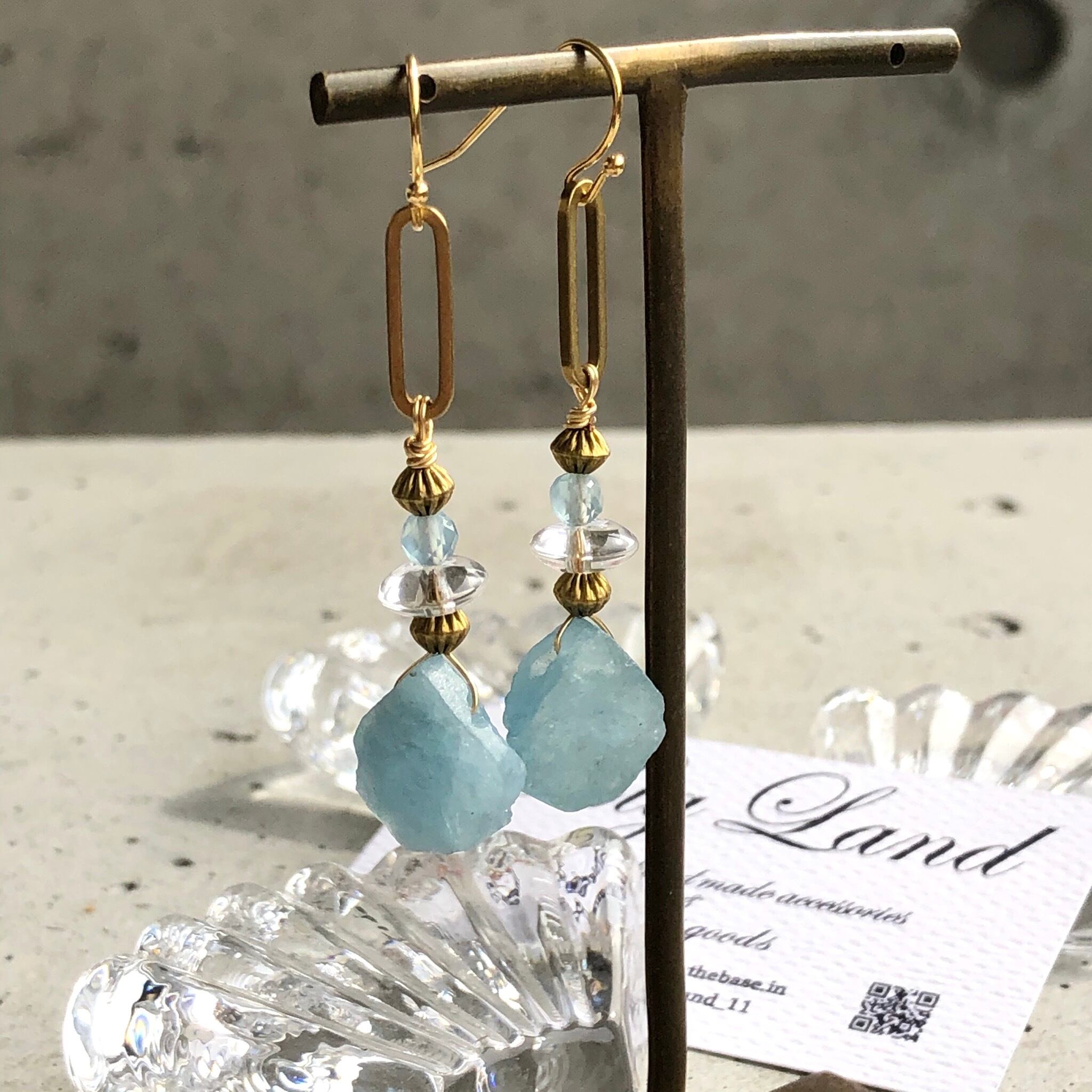 アクアマリンの原石&水晶&真鍮を使いエキゾチックな雰囲気に仕上げてみました!!今年はブルーや水色がトレンドカラーで雑誌でも推してるので小物で取り入れて爽やか気分でコーデをお楽しみ下さい✨