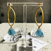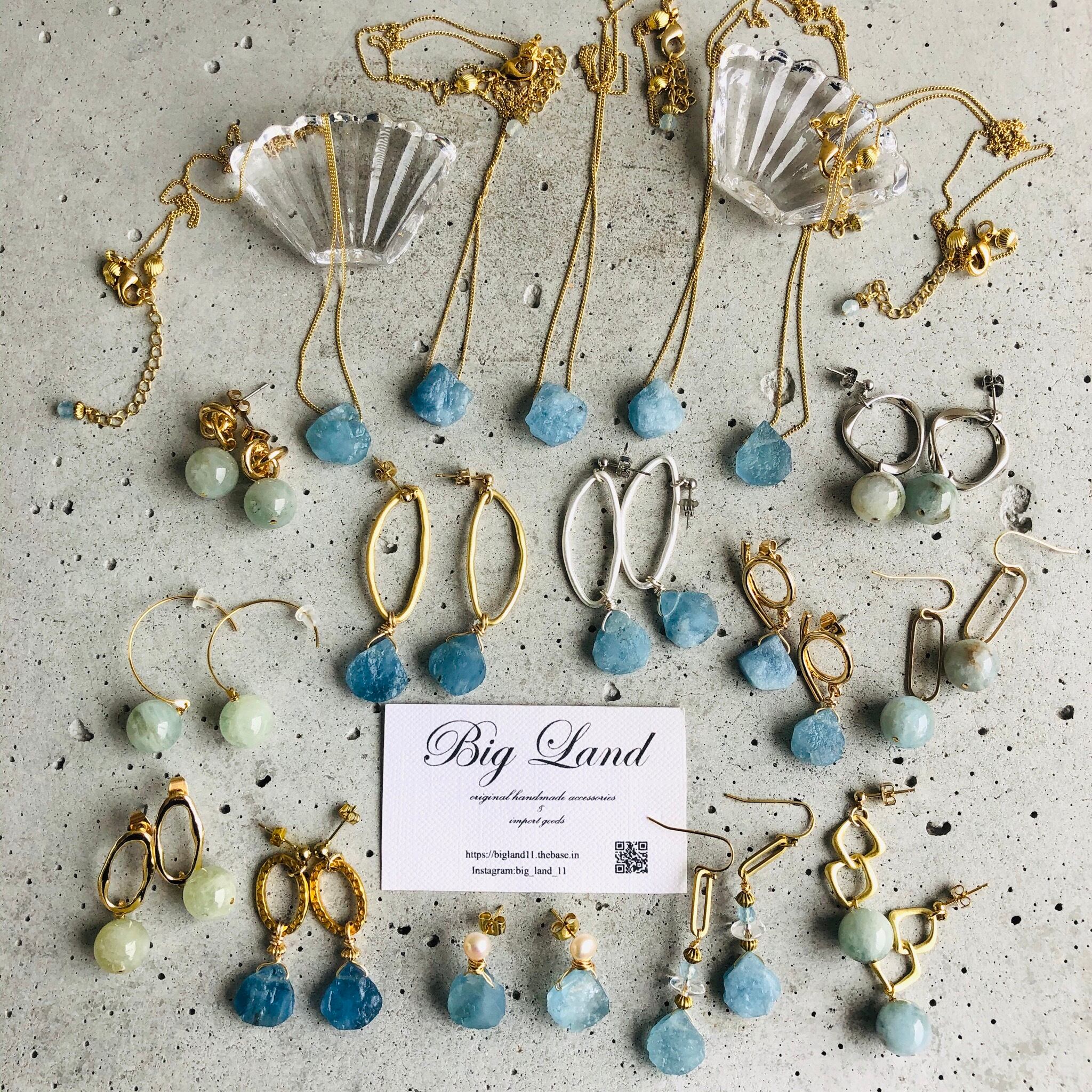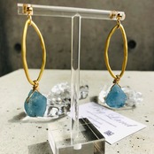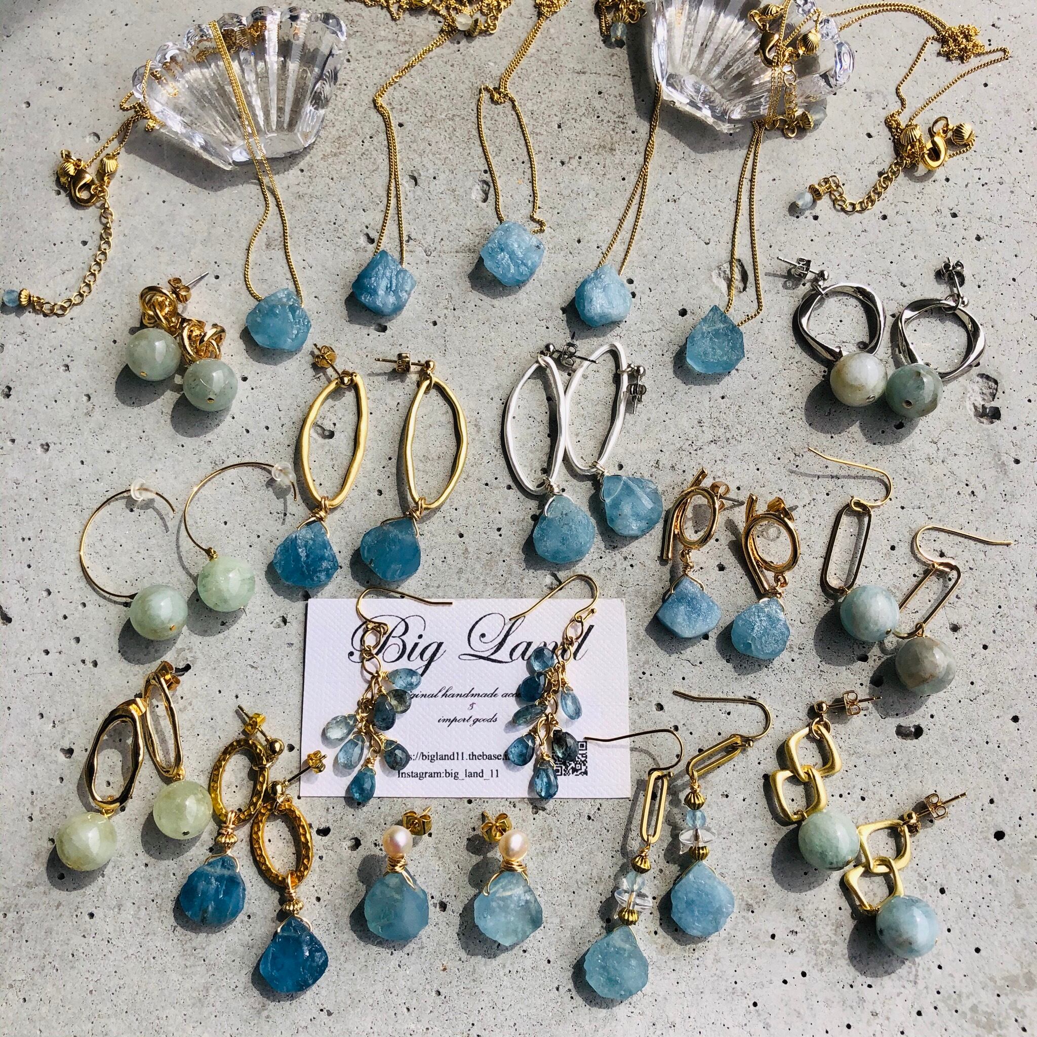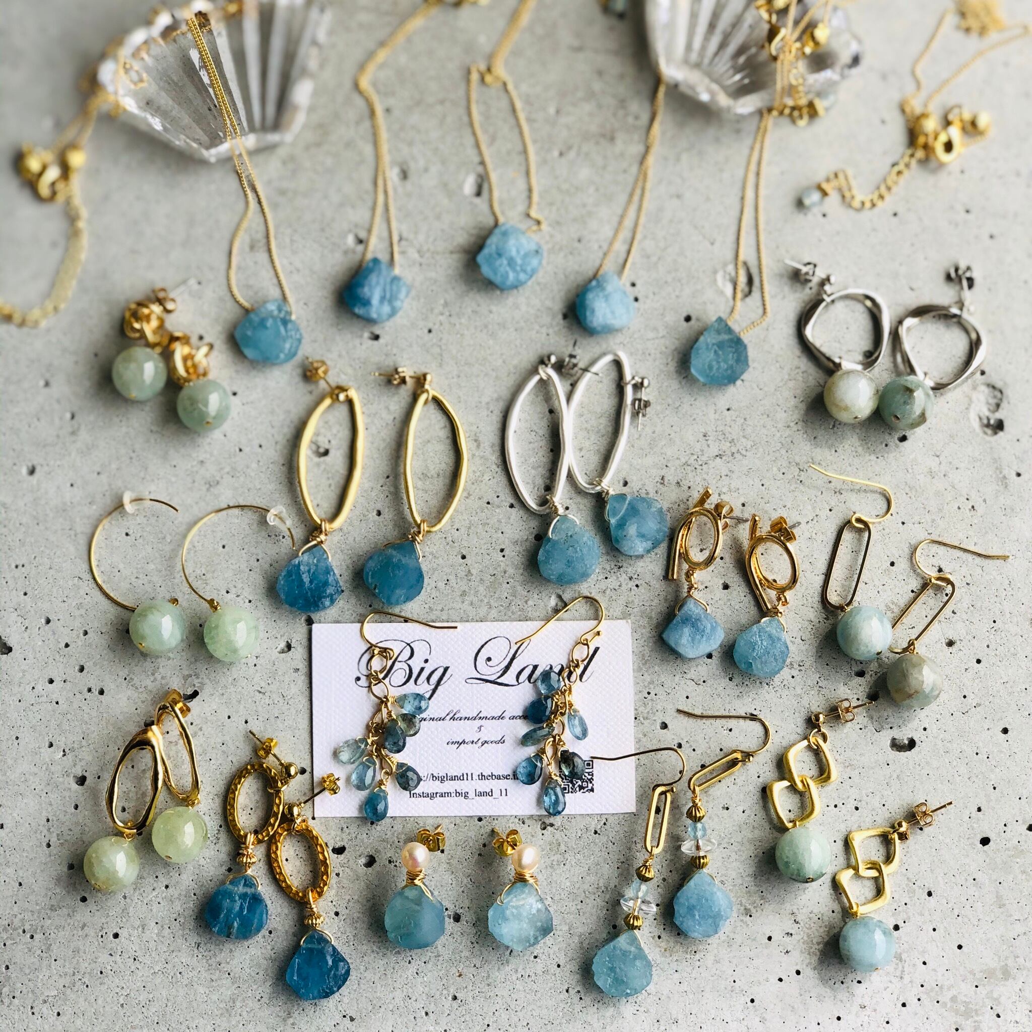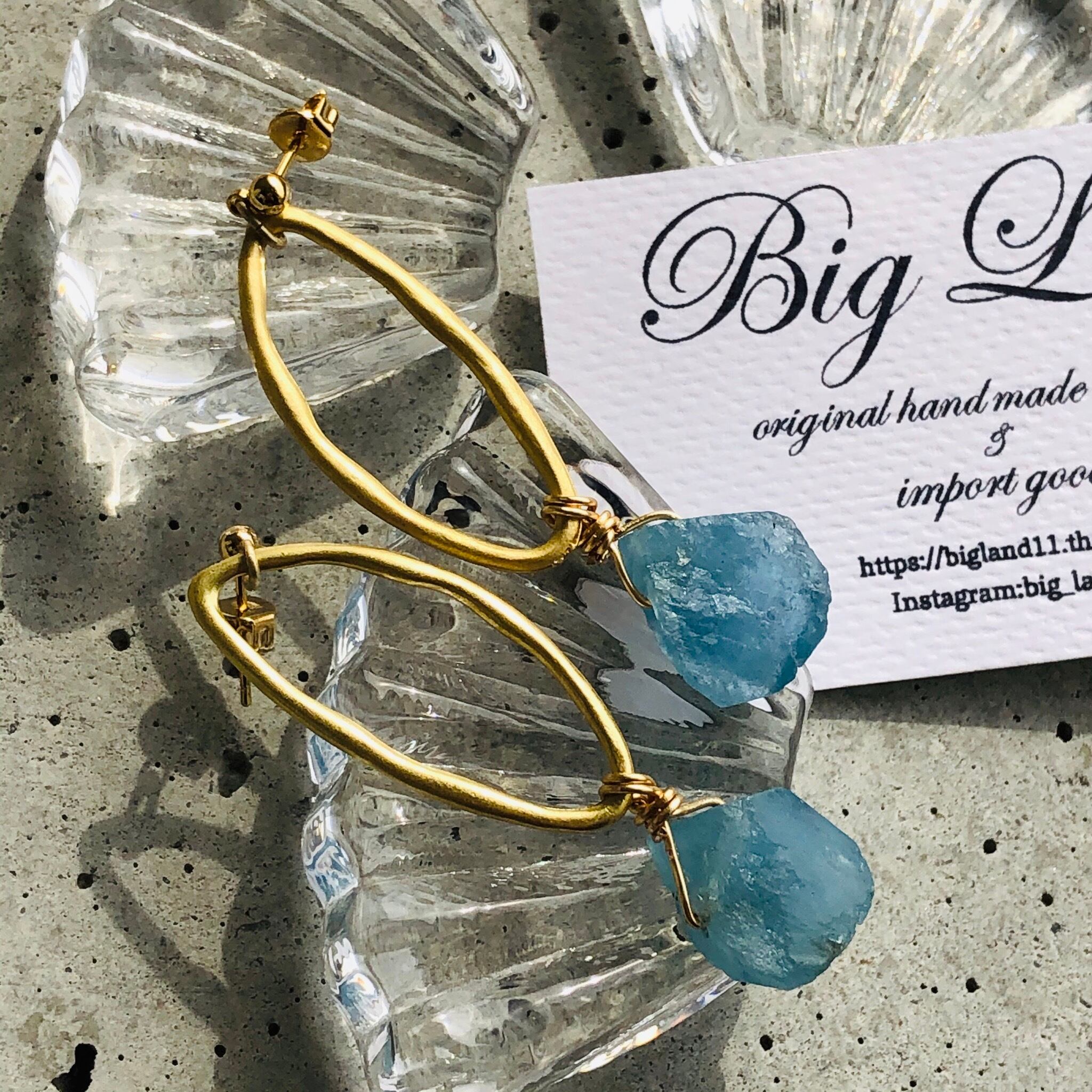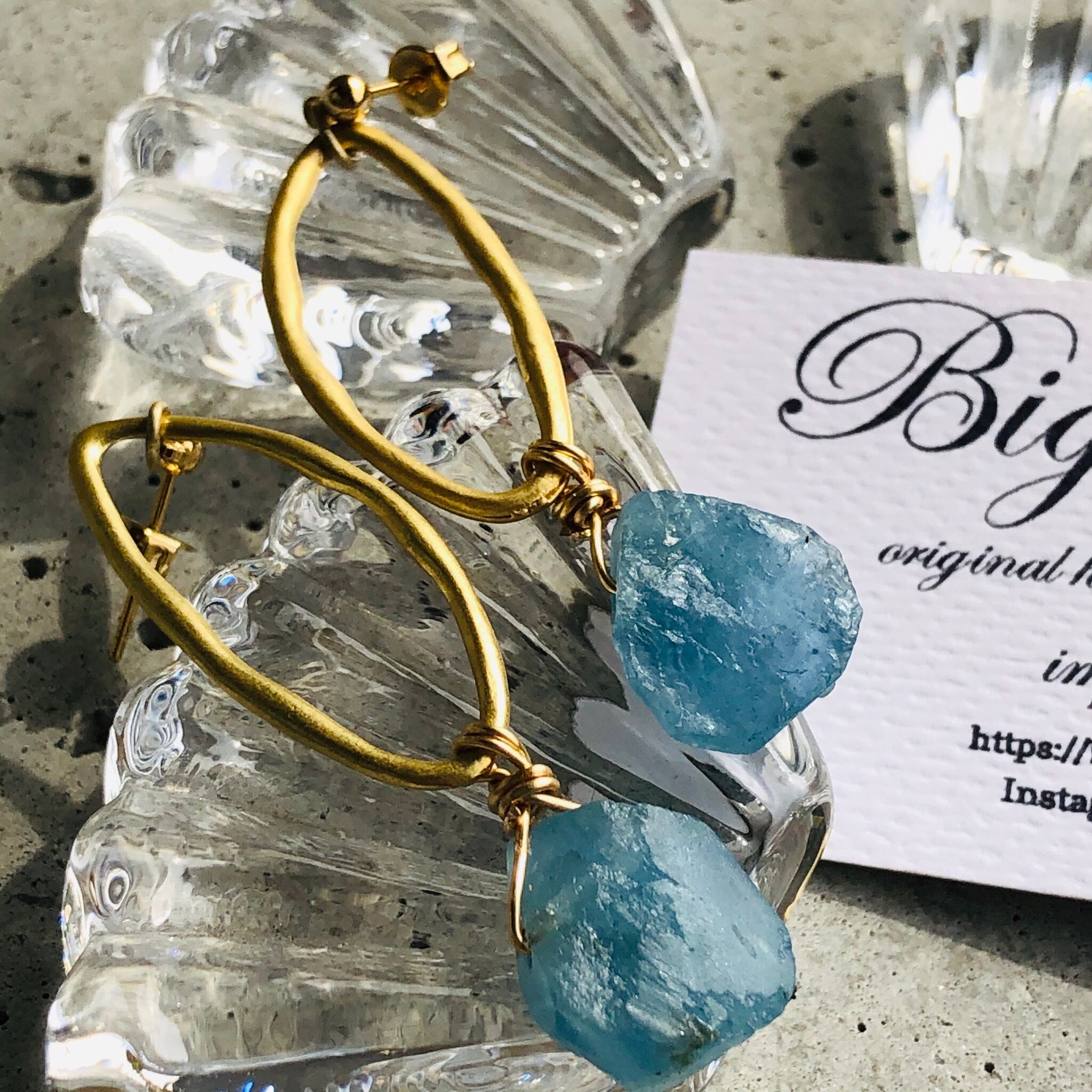 アクアマリンの原石と涼しげなマットゴールドを組み合わせ長めの揺れるピアスは小顔効果あり^_^