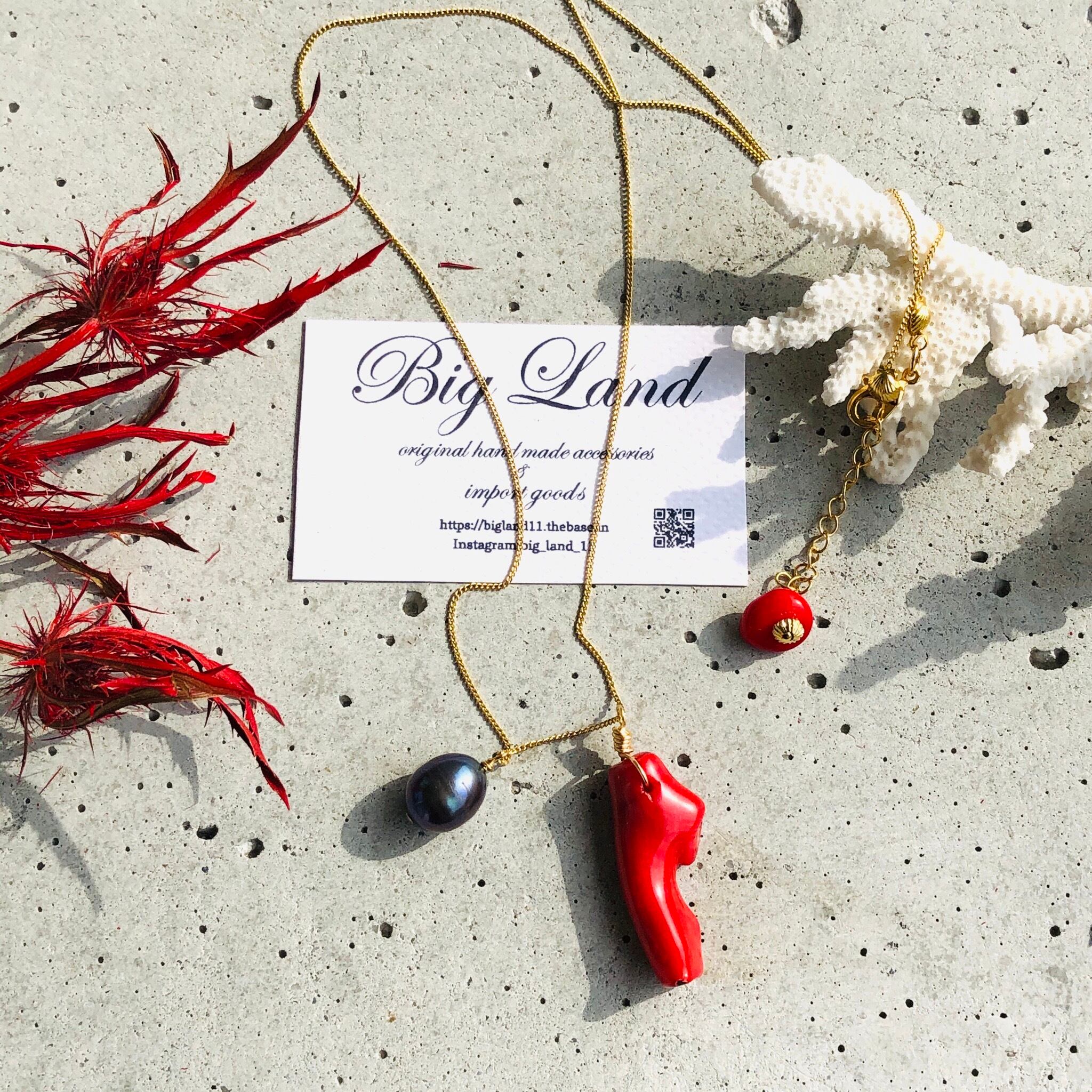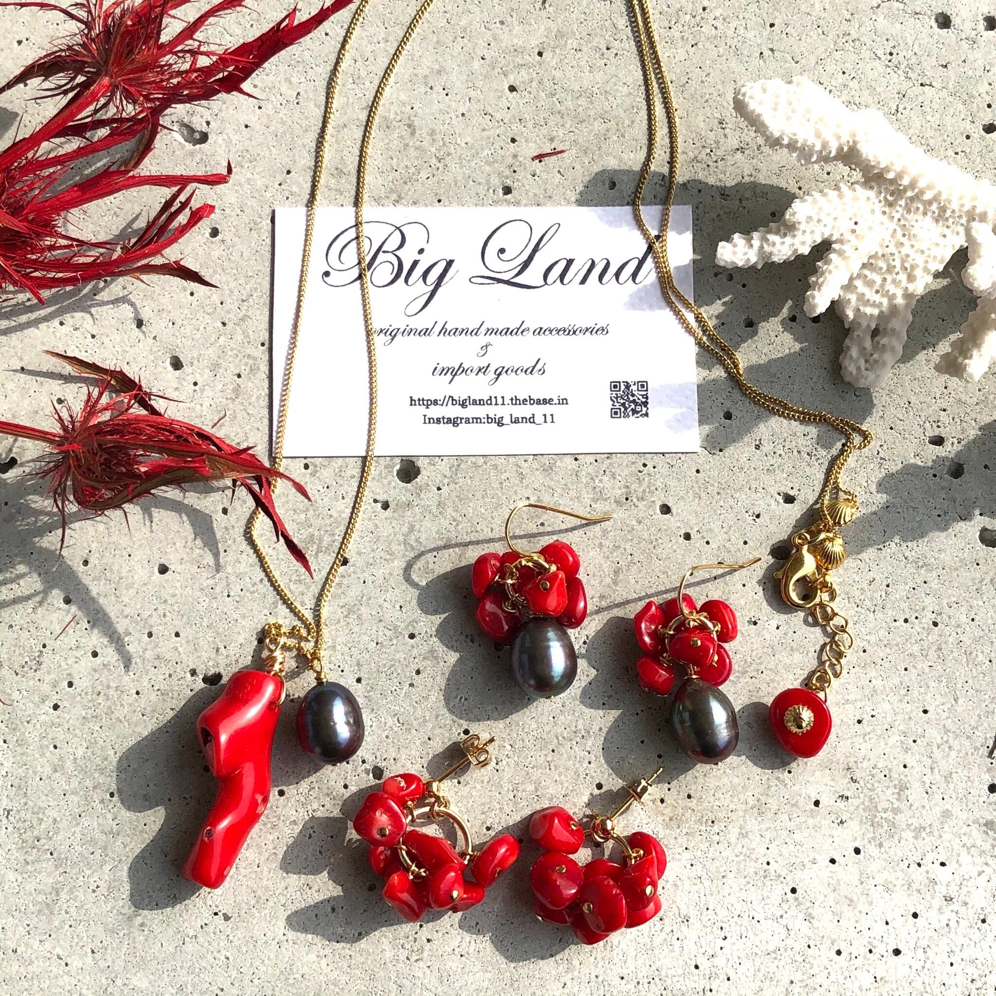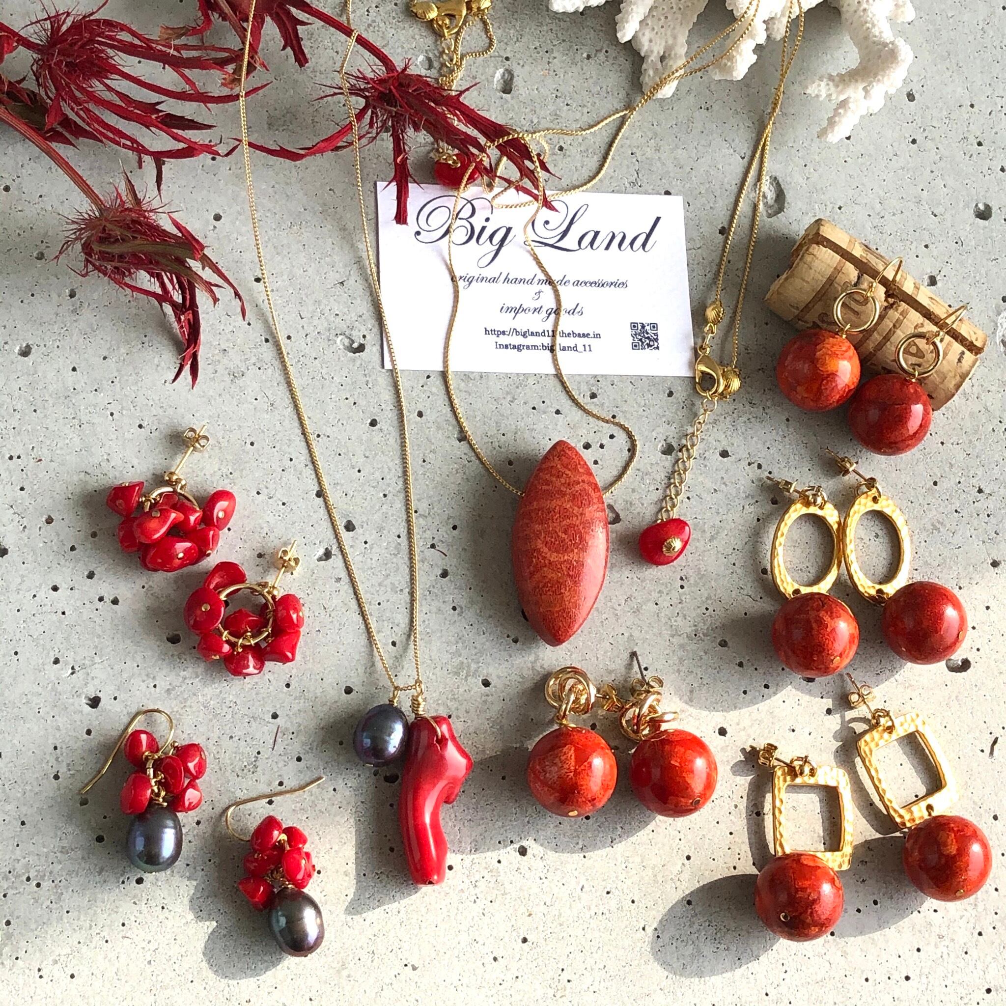 真っ赤な情熱カラー珊瑚とパールを使いパワーがみなぎるような個性溢れ夏スタイルコーデのワンポイントに目を引きます‼️