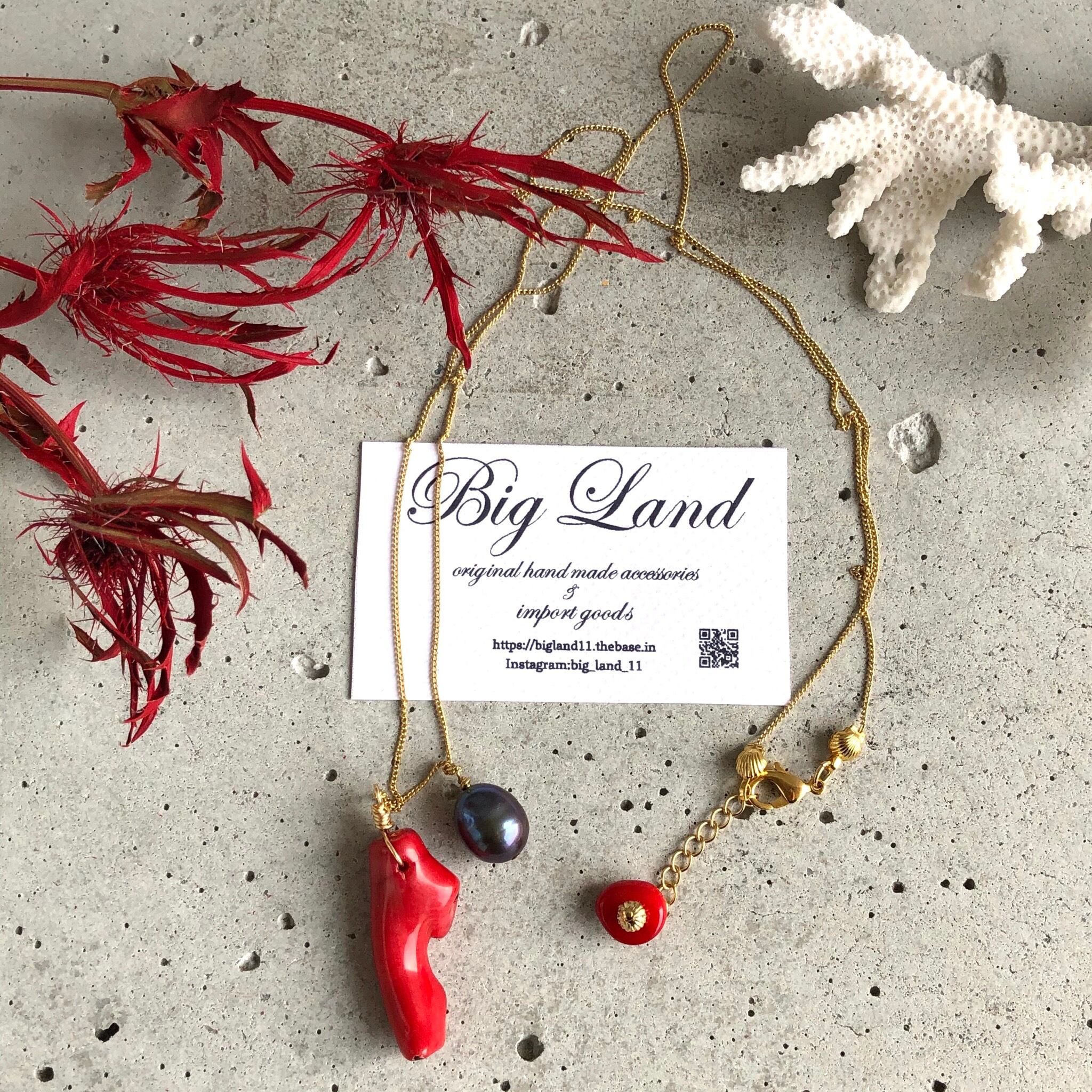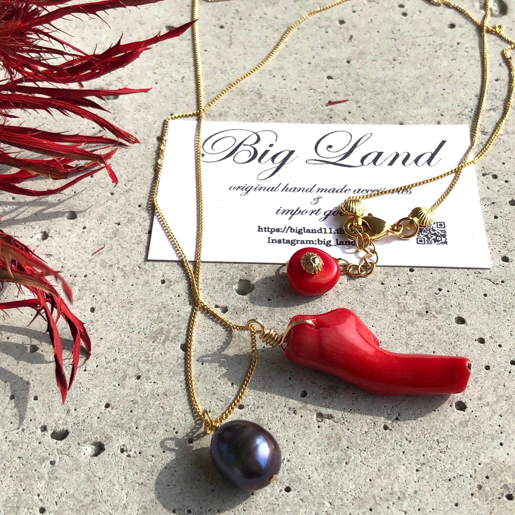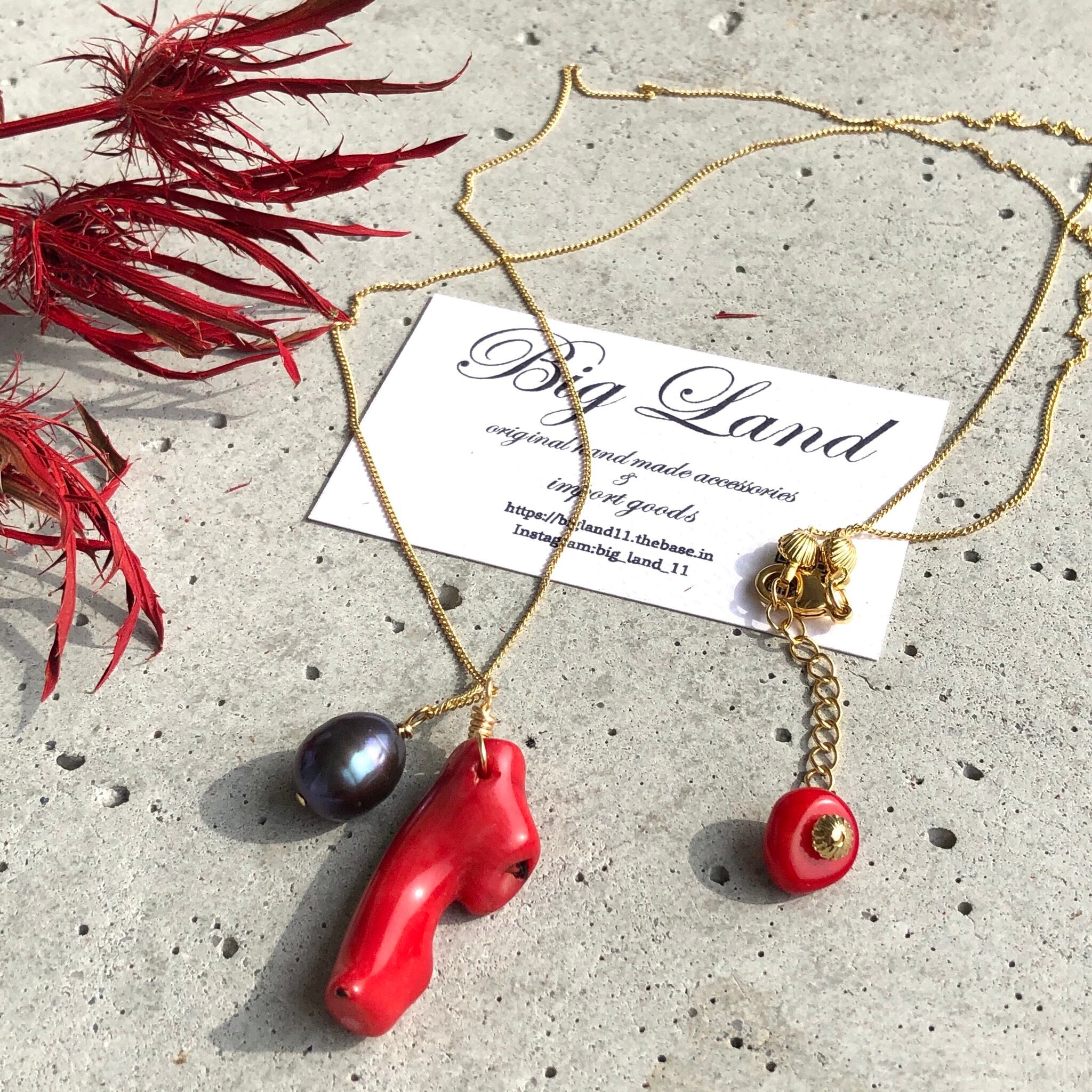 真っ赤な情熱カラー珊瑚とパールを使いパワーがみなぎるような個性溢れ夏スタイルコーデのワンポイントに目を引きます‼️