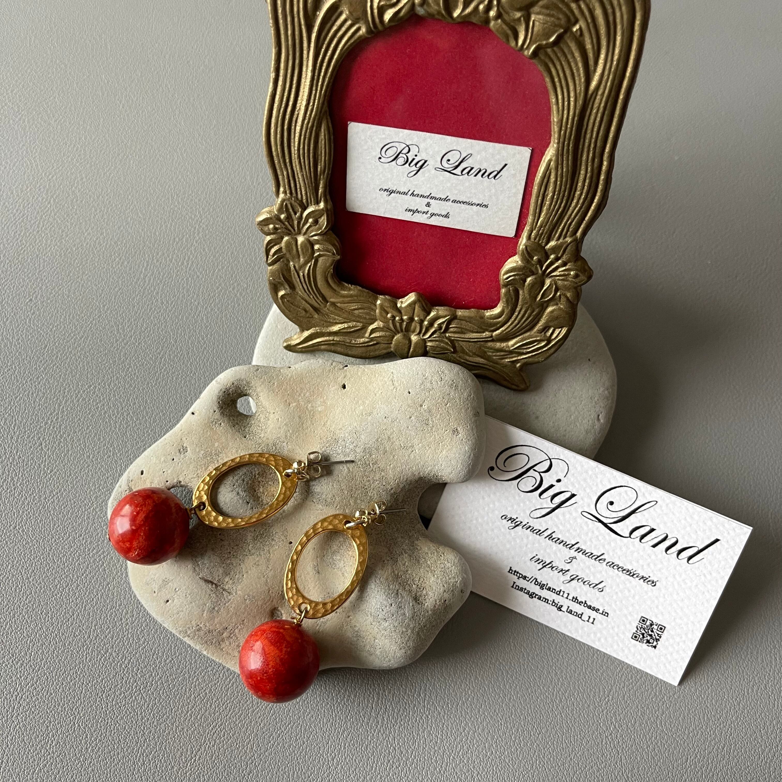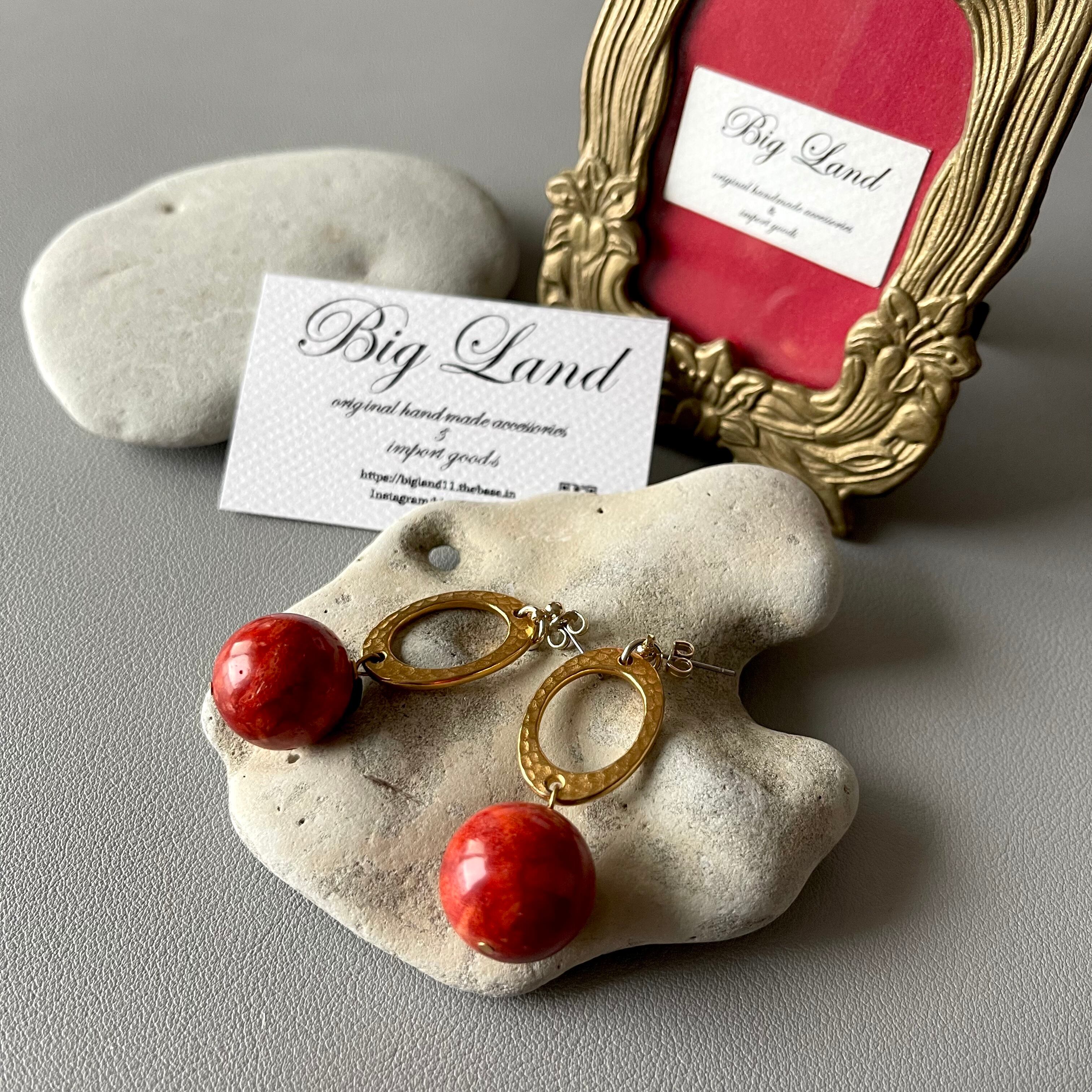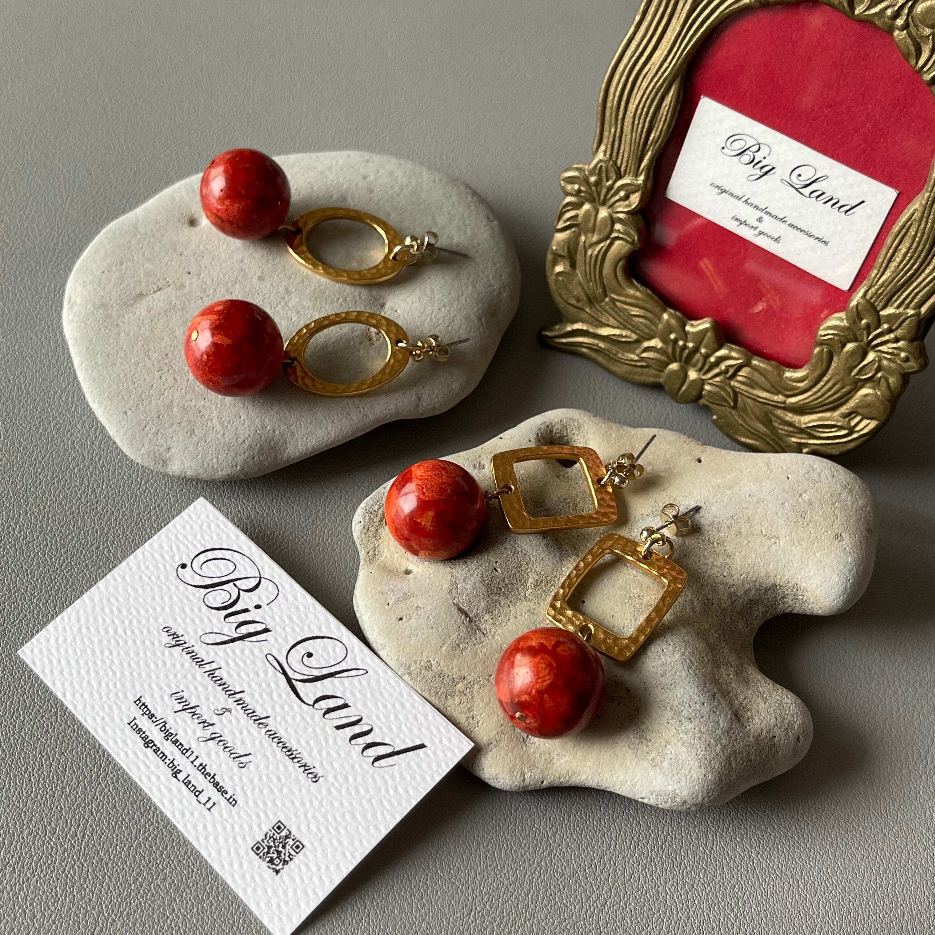 朱色情熱カラーの大玉スポンジ珊瑚とロサンゼルスで買い付けて来たデザインパーツと組み合わせ個性的でアンティークレトロやフレンチ&イタリアンスタイルが好きな方や全身ブラックコーデに合わせるとグッと大人っぽくなりデザイナーズな雰囲気に!!