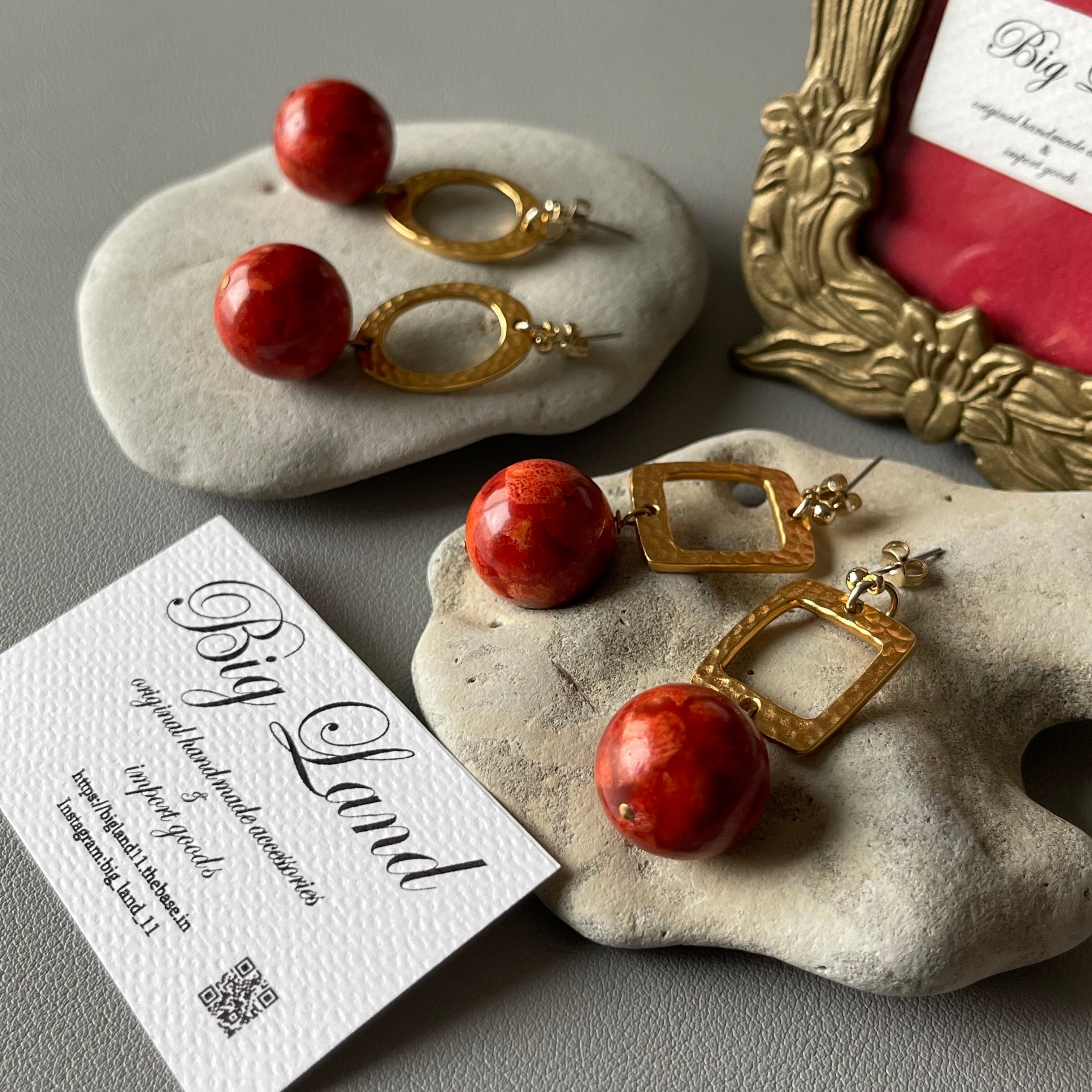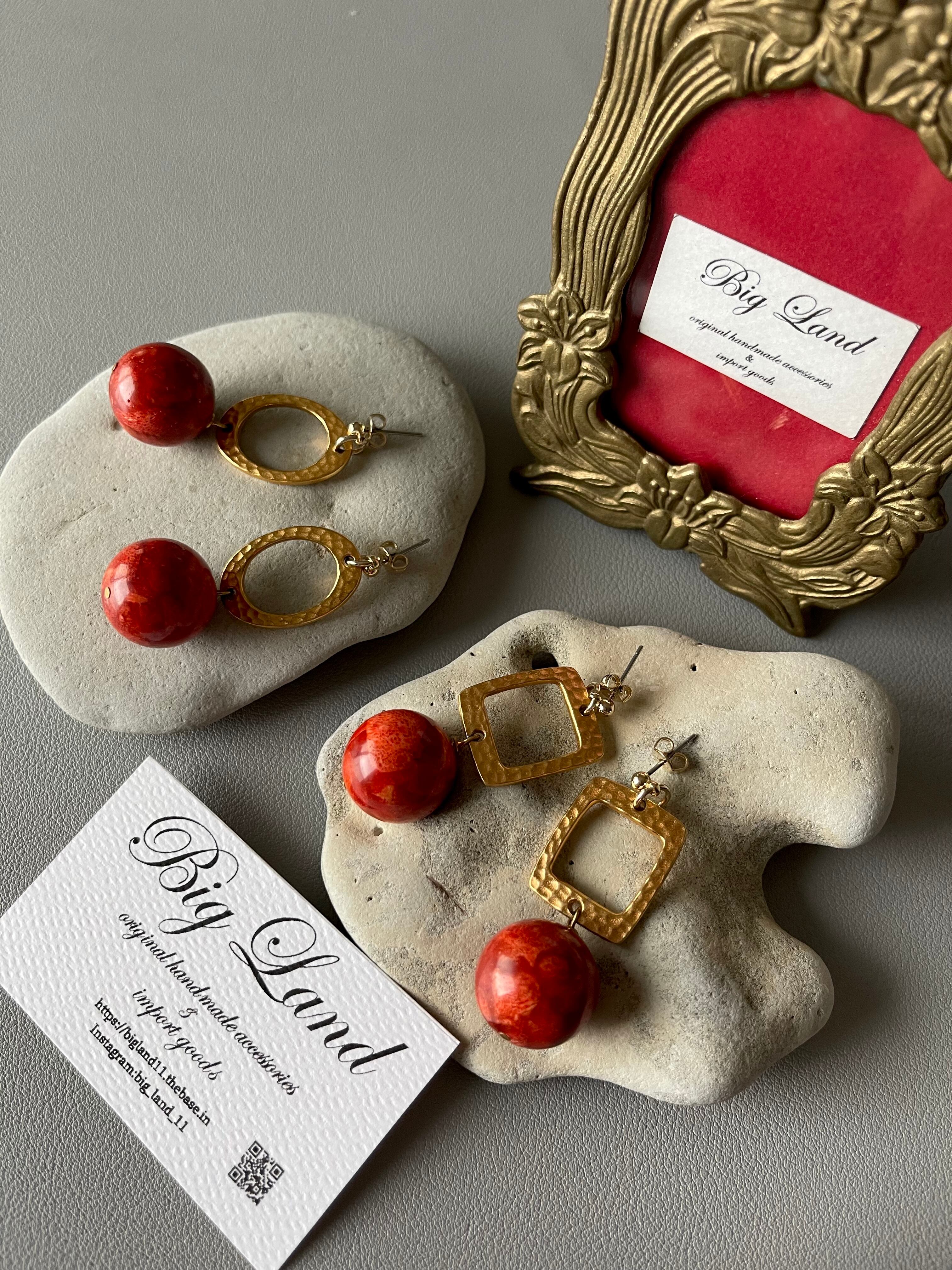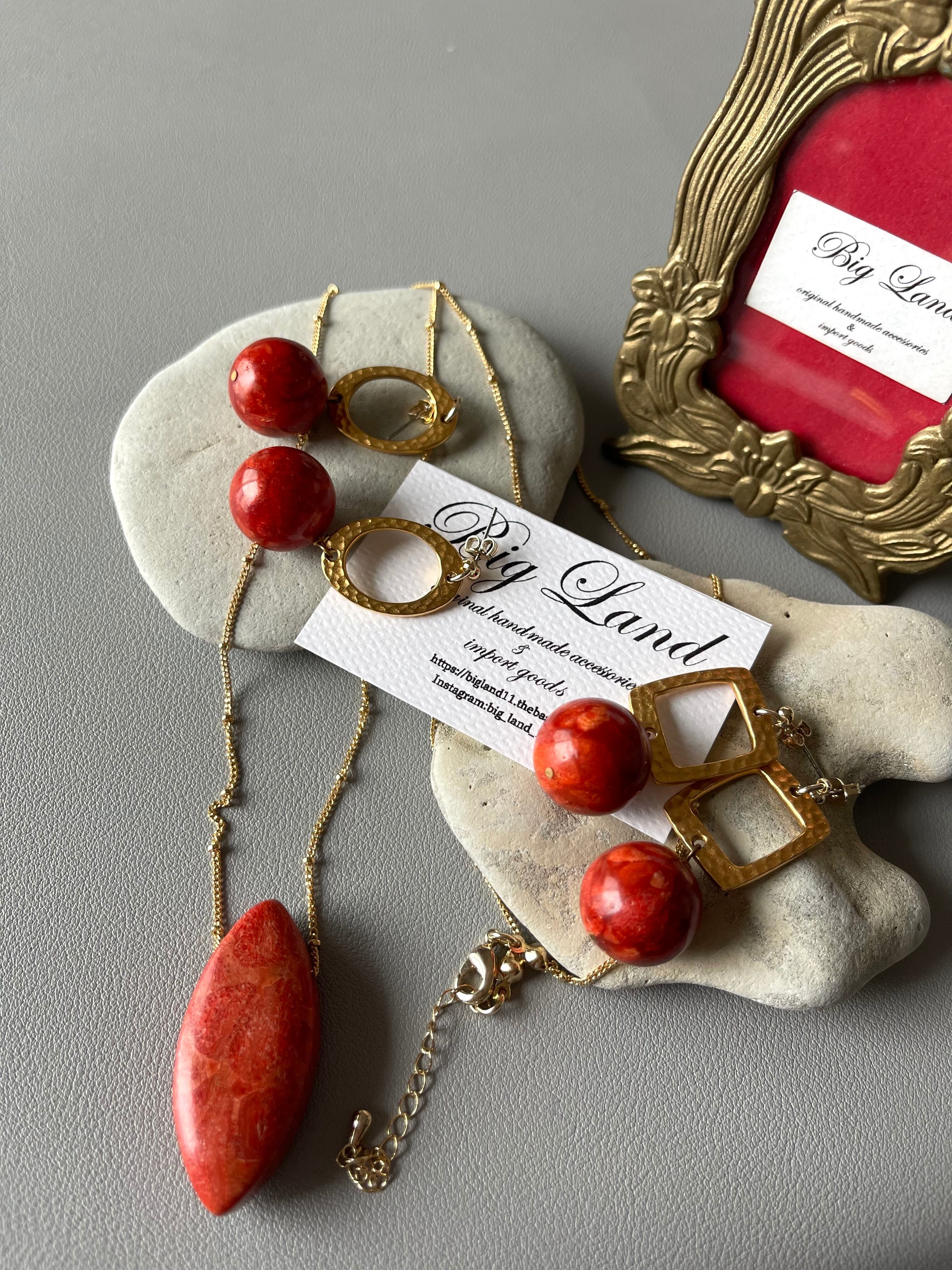 朱色情熱カラーの大玉スポンジ珊瑚とロサンゼルスで買い付けて来たデザインパーツと組み合わせ個性的でアンティークレトロやフレンチ&イタリアンスタイルが好きな方や全身ブラックコーデに合わせるとグッと大人っぽくなりデザイナーズな雰囲気に!!