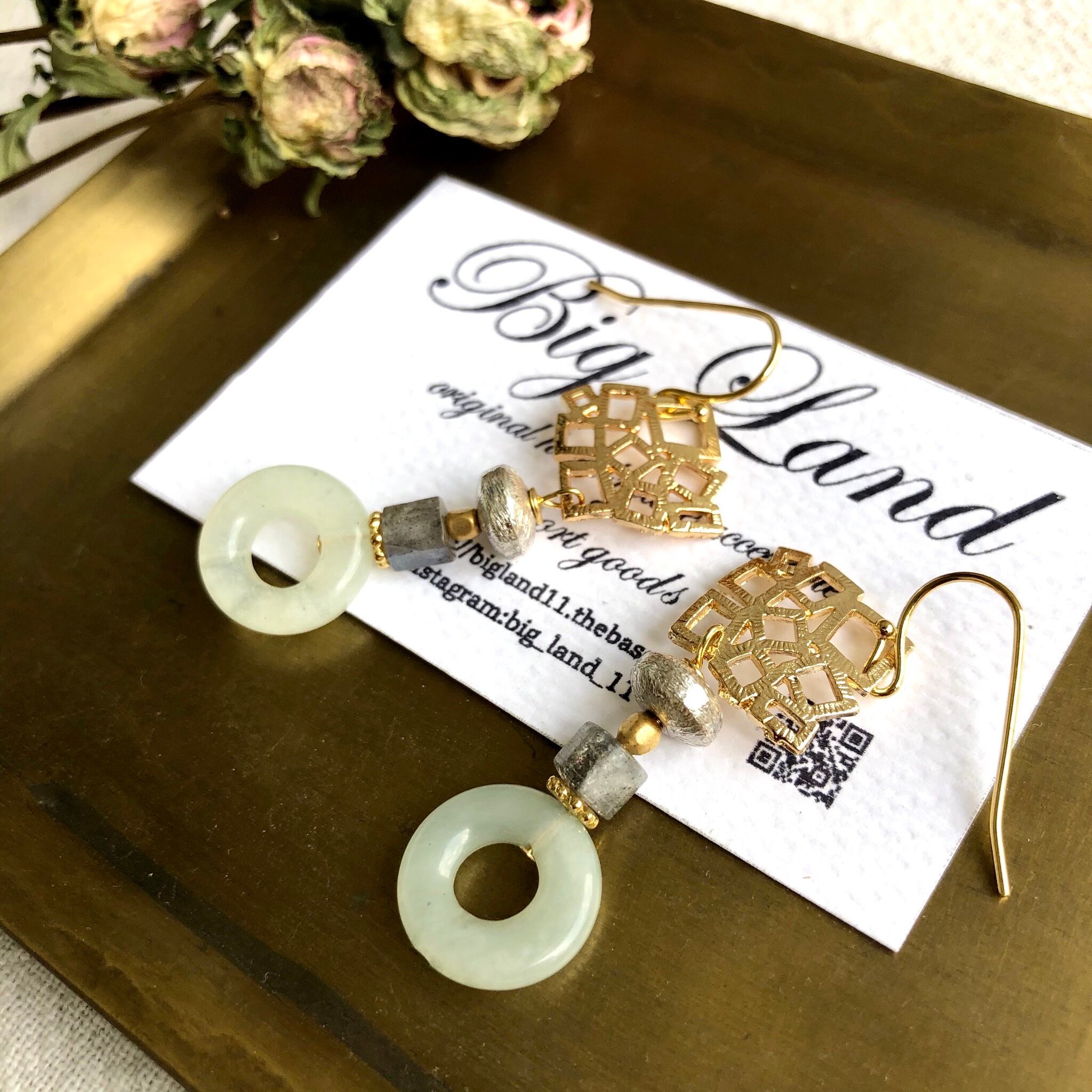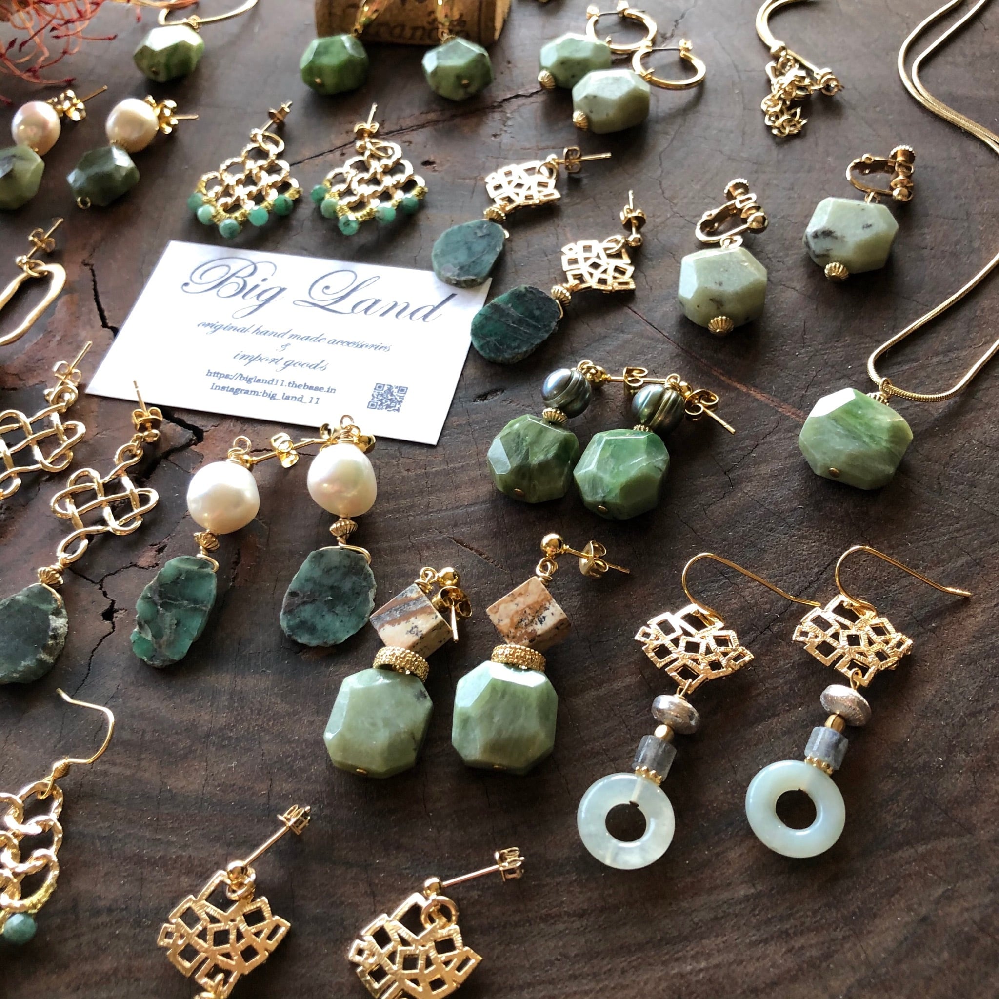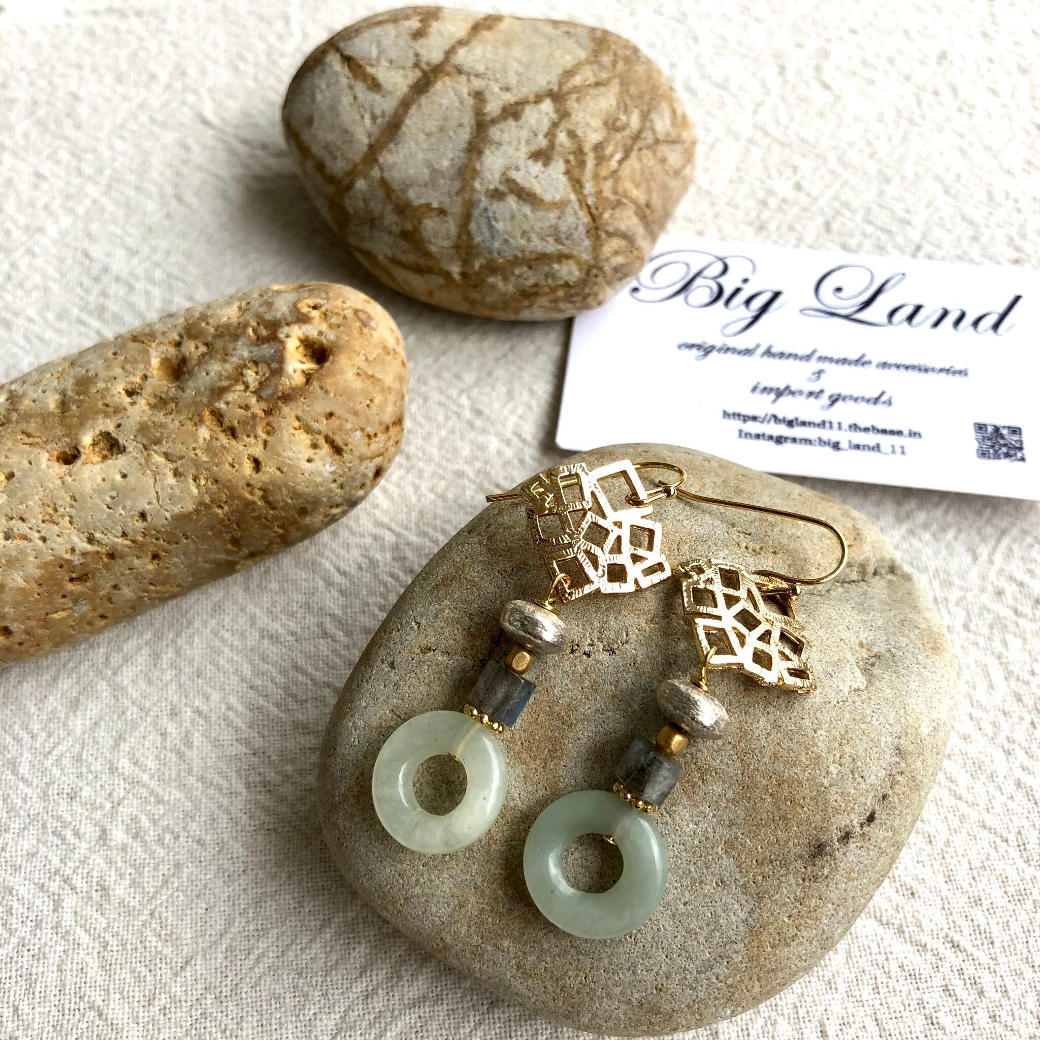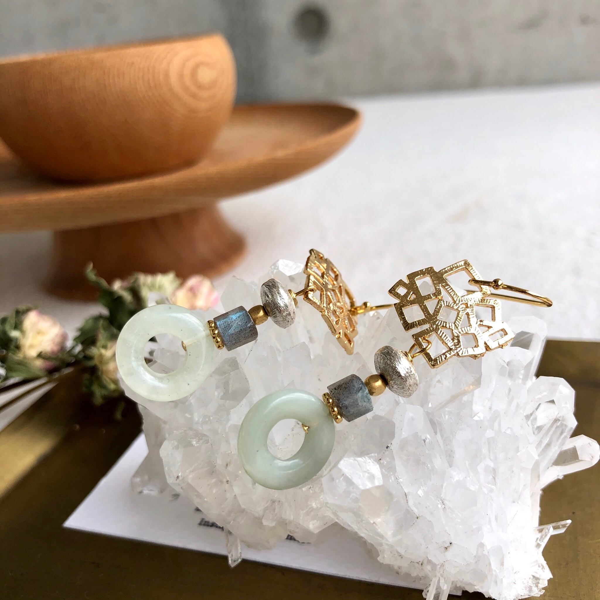 夏らしい優しい色の翡翠とキラキラ輝くラブラドライト等組み合わせ遊びのある個性的なデザインに仕上げました✨