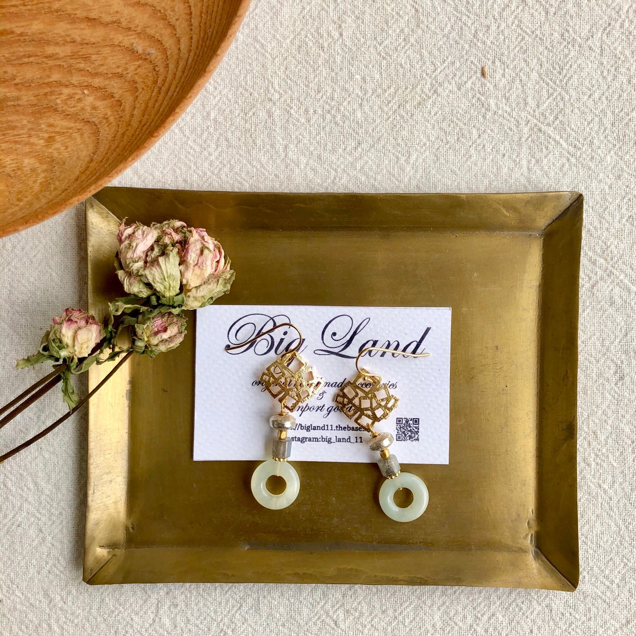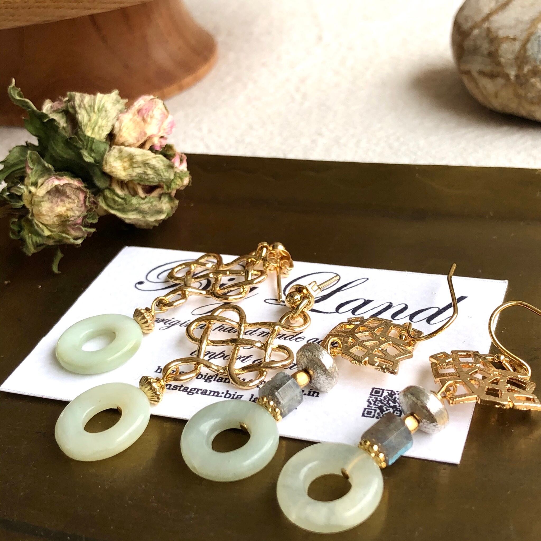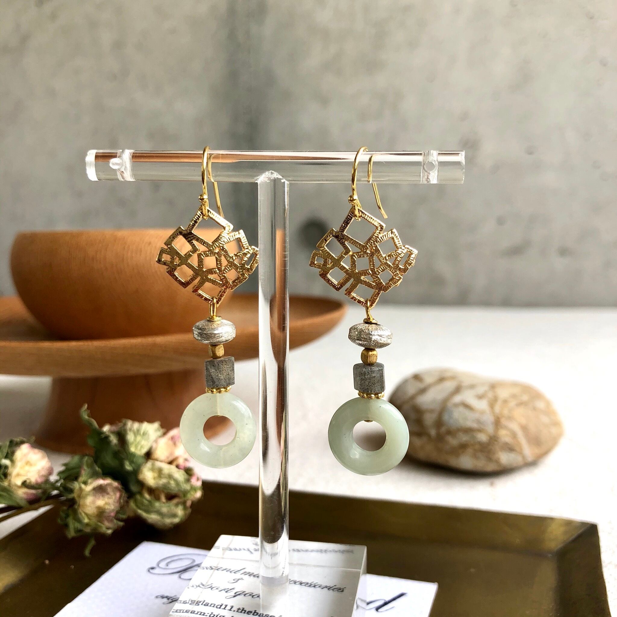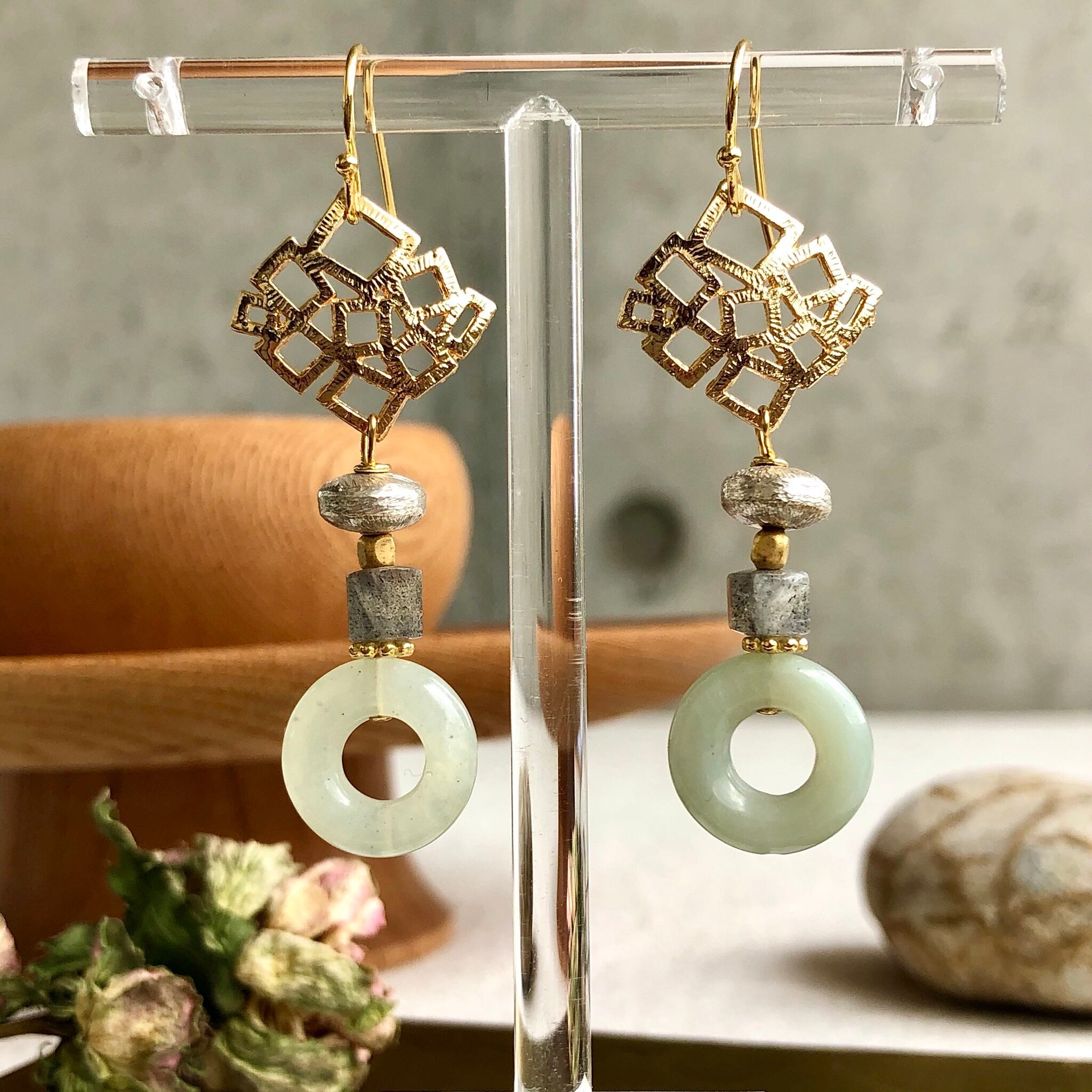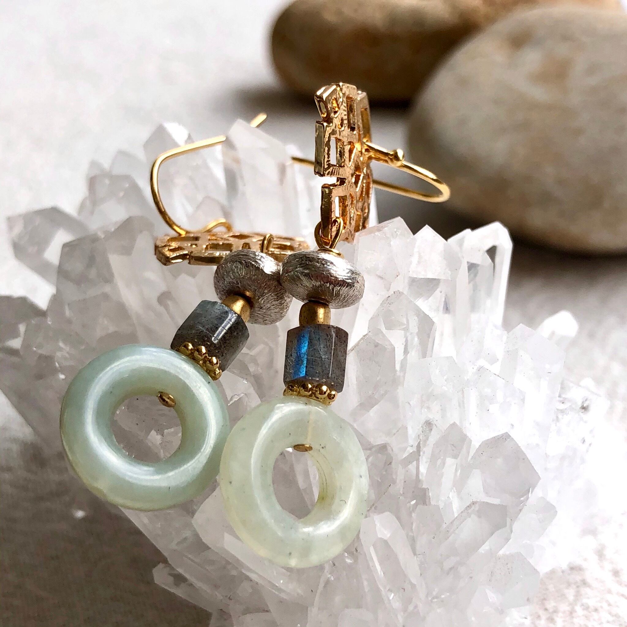 夏らしい優しい色の翡翠とキラキラ輝くラブラドライト等組み合わせ遊びのある個性的なデザインに仕上げました✨