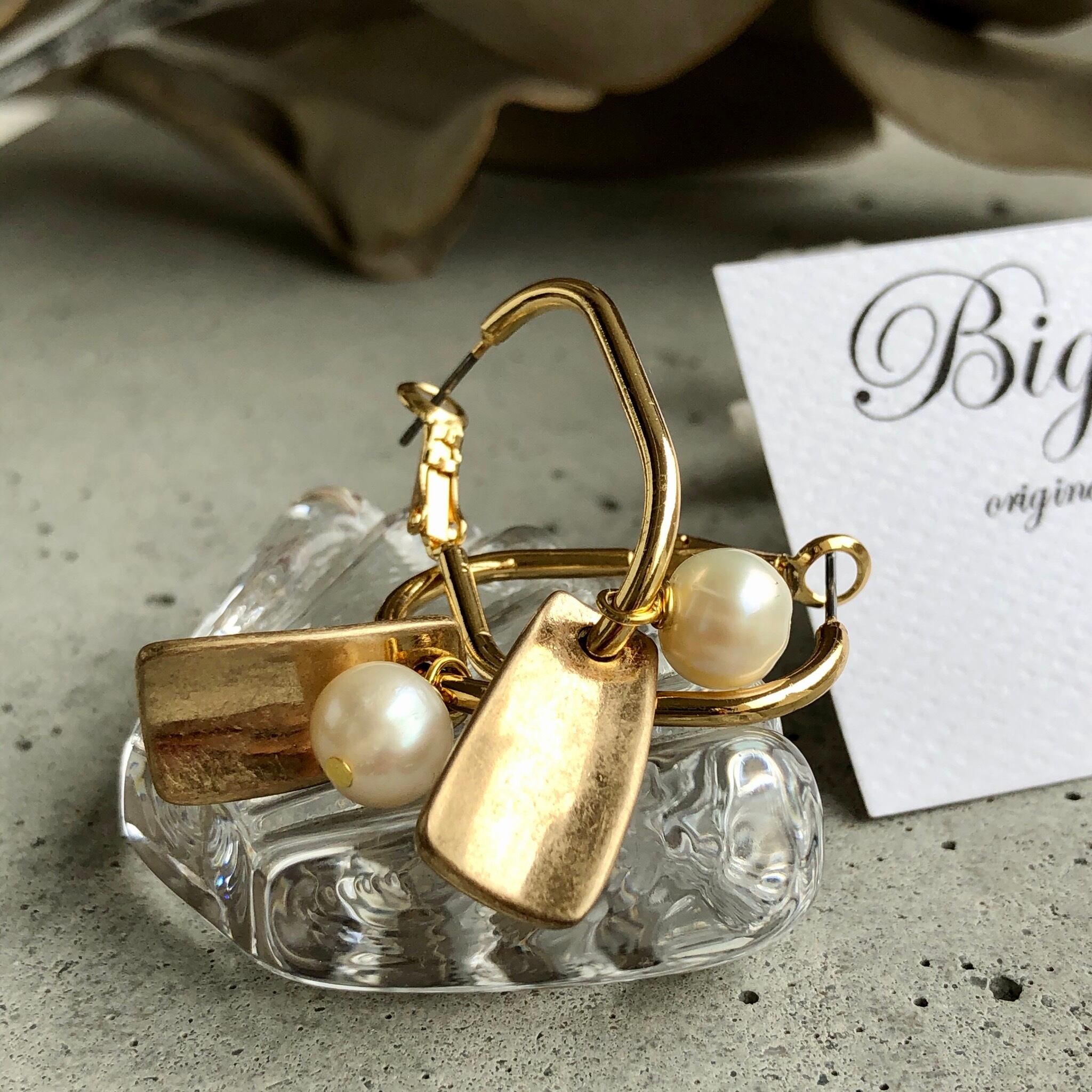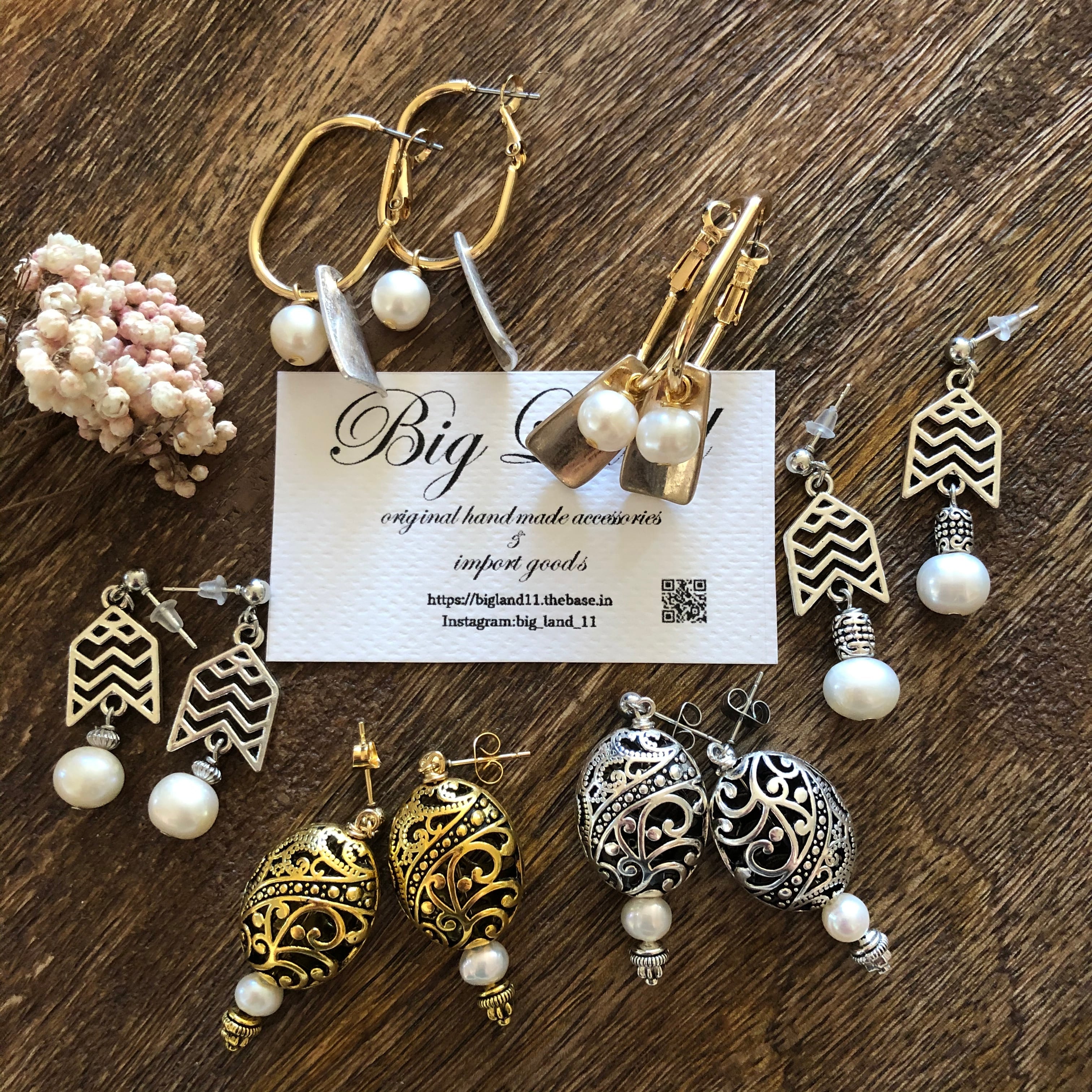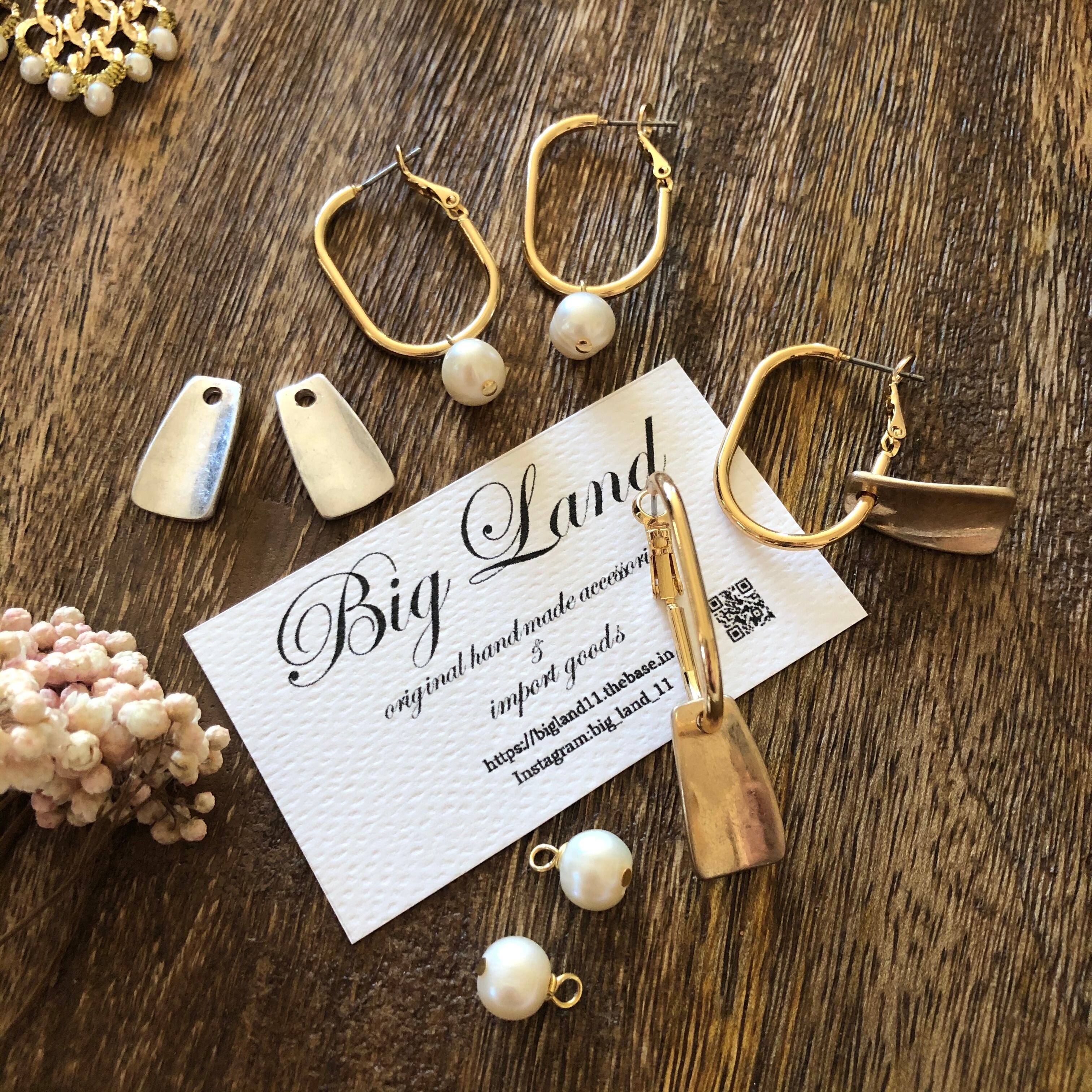 ゴールドとホワイトパールはどんなお洋服にも合わせ易く楕円の大振りフープとの組み合わせが大人っぽくてオシャレ度が高いデザインです✨