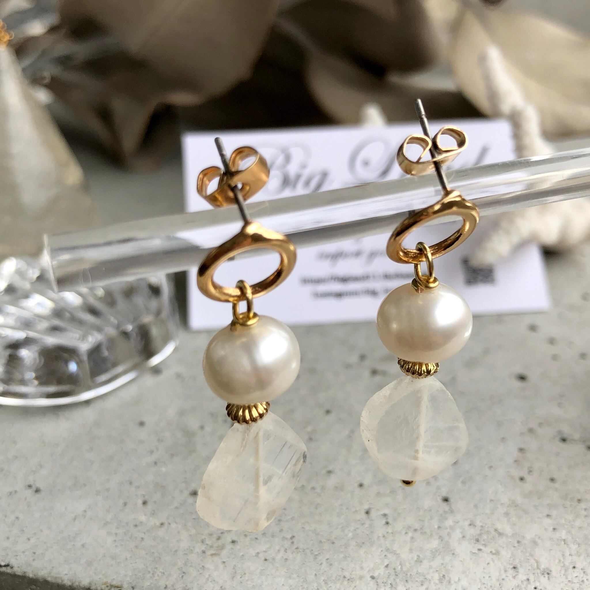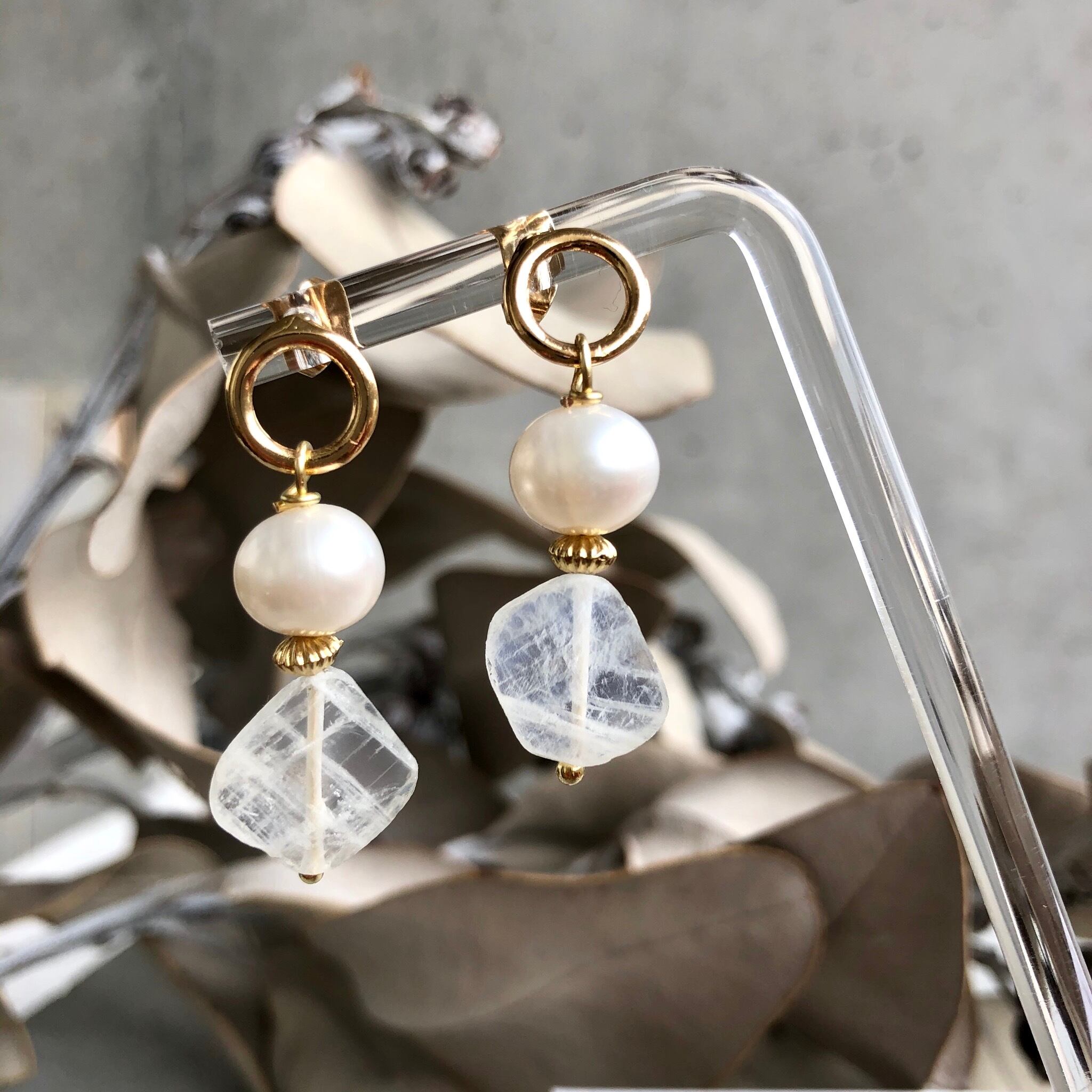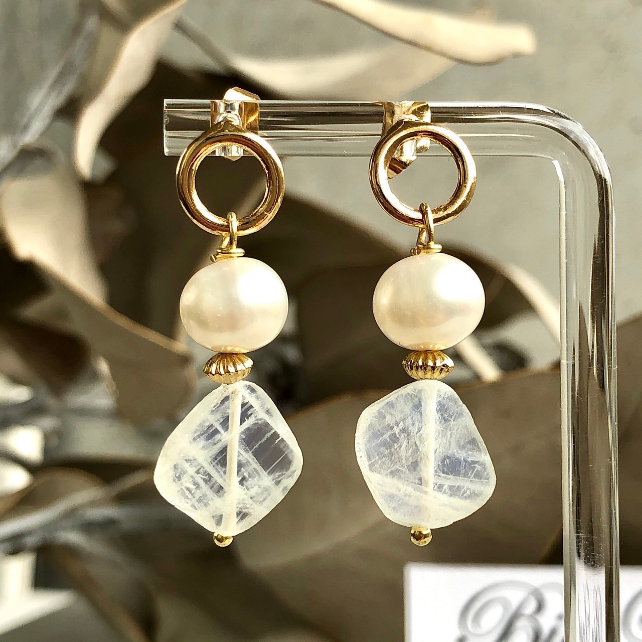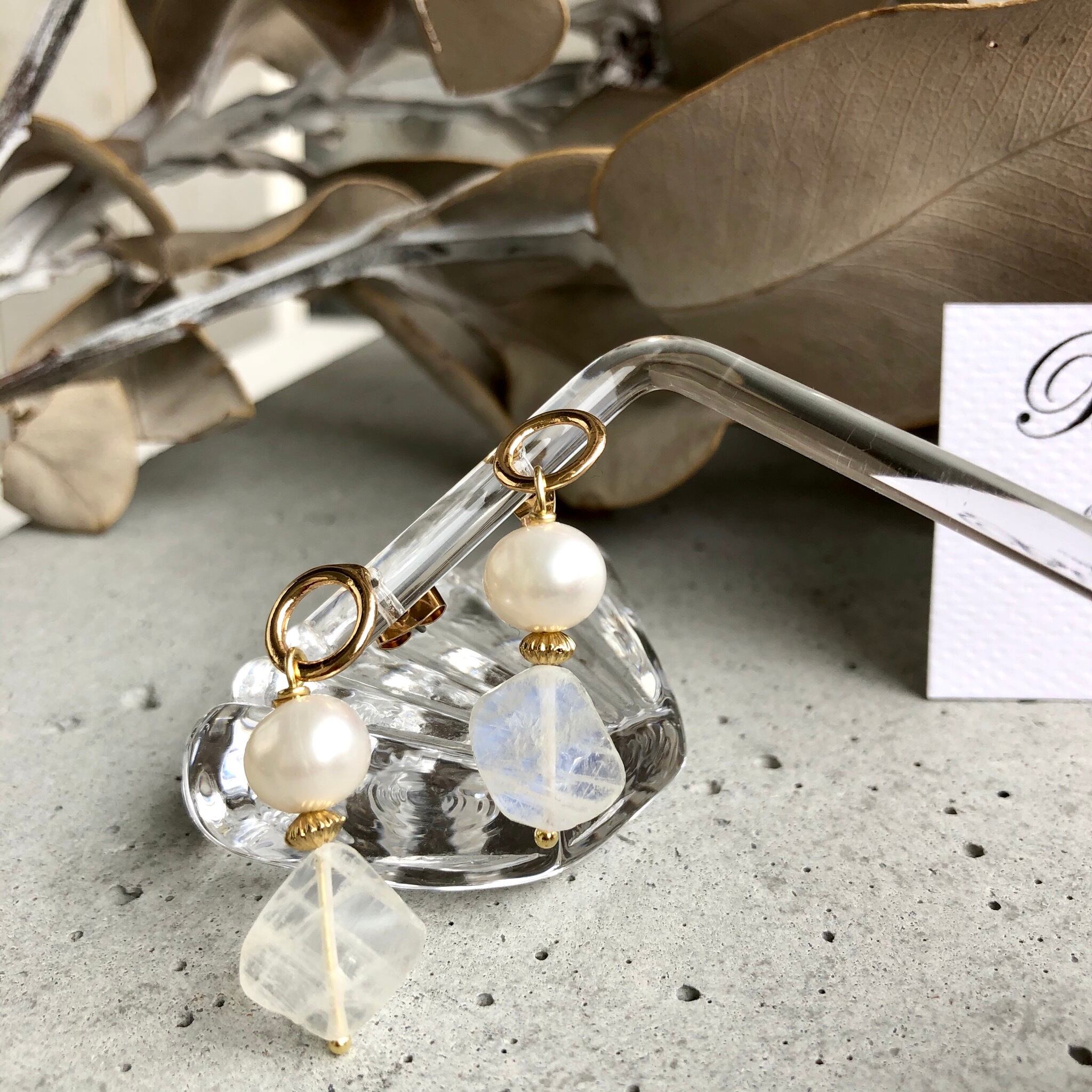 ロイヤルブルームーンストーンの原石スライスとパール、アンティークゴールドと組み合わせカジュアルにも綺麗めにもお使いできる雰囲気に仕上げてみました✨