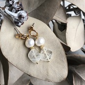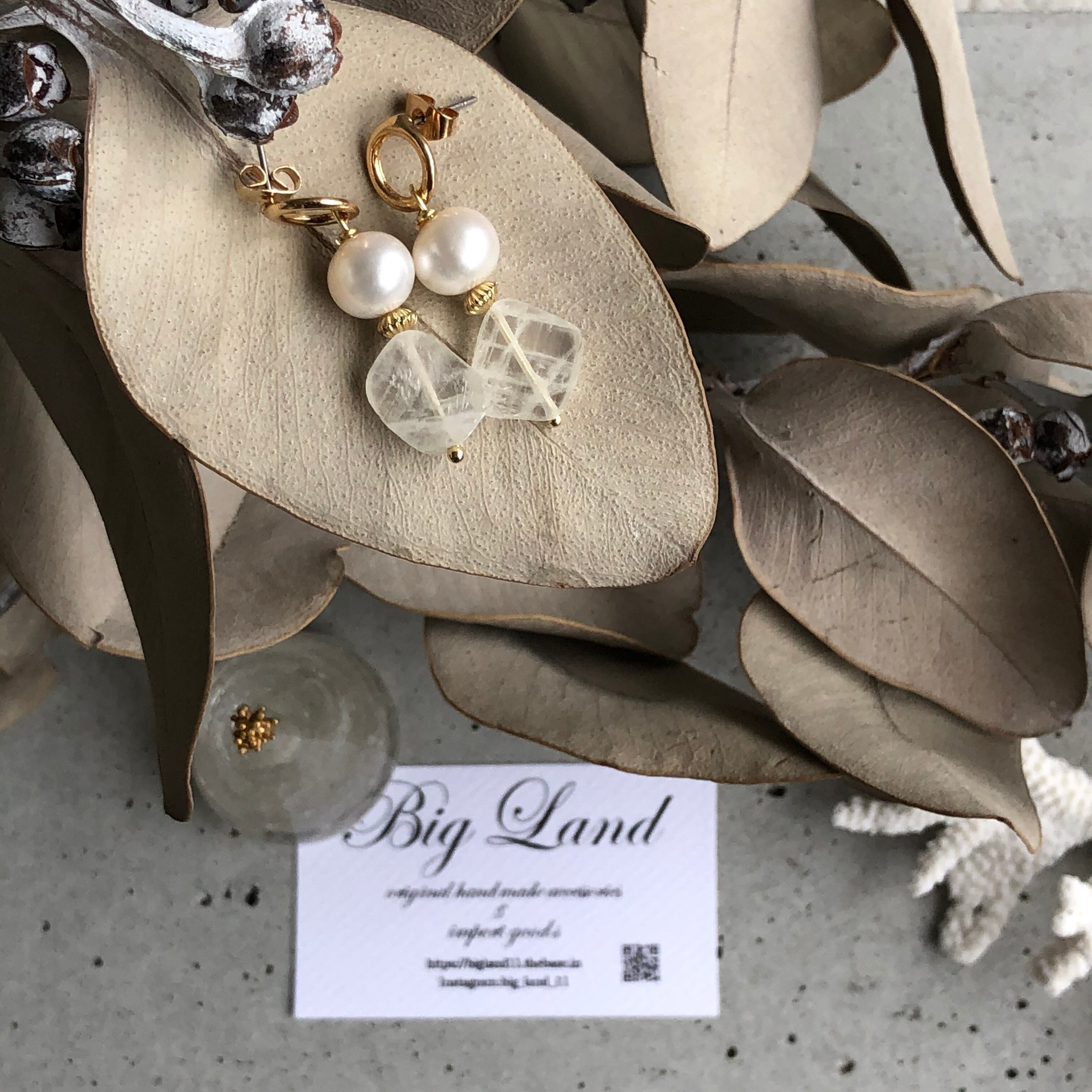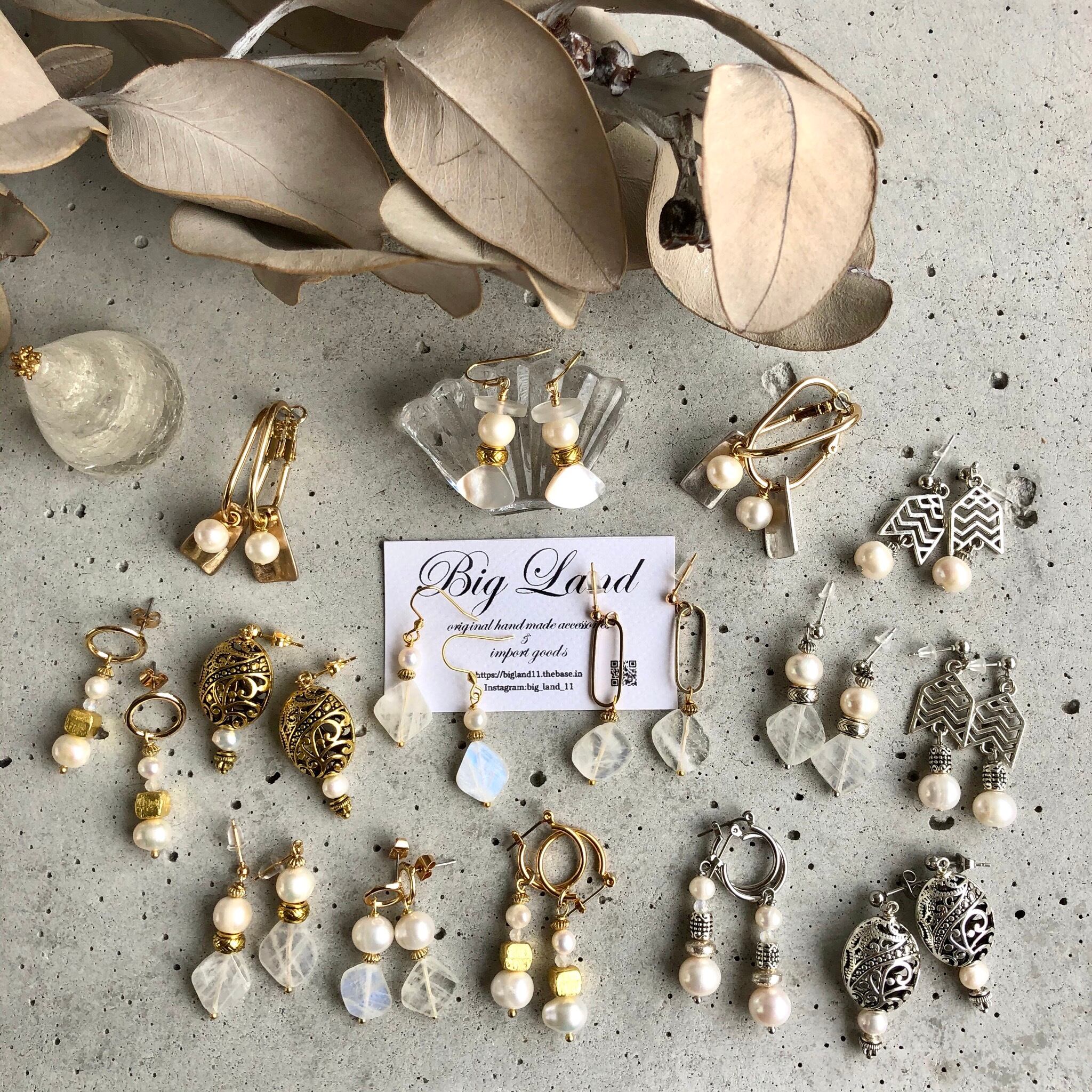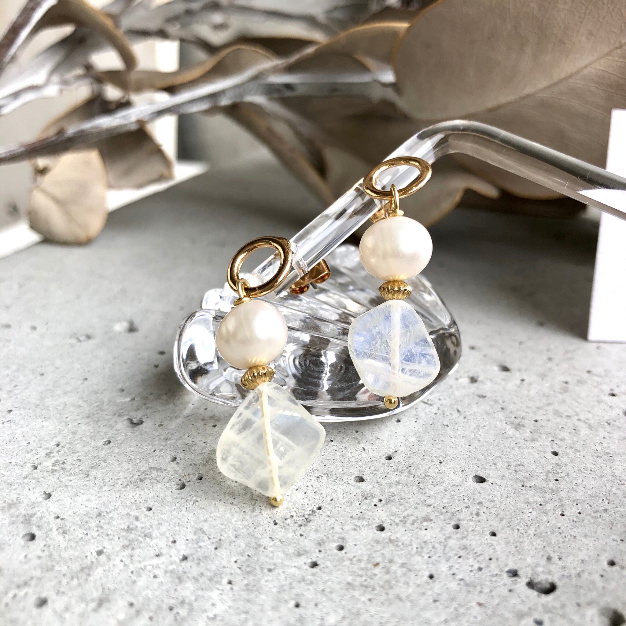 ロイヤルブルームーンストーンの原石スライスとパール、アンティークゴールドと組み合わせカジュアルにも綺麗めにもお使いできる雰囲気に仕上げてみました✨