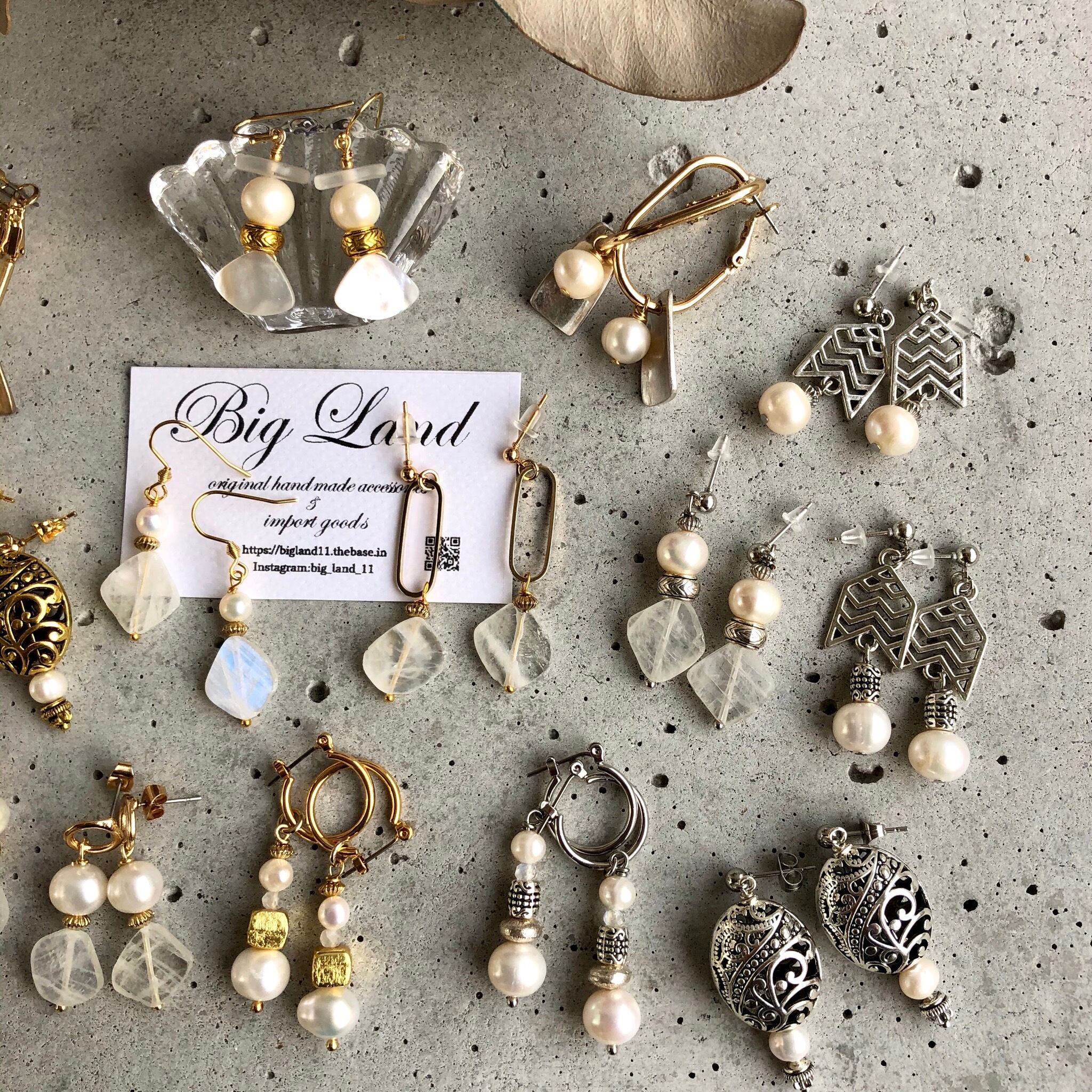 ロイヤルブルームーンストーンの原石スライスとパール、アンティークゴールドと組み合わせカジュアルにも綺麗めにもお使いできる雰囲気に仕上げてみました✨ ピアスフックもオシャレなデザインでアレルギーの方にもオススメなサージカルステンレスを使用
