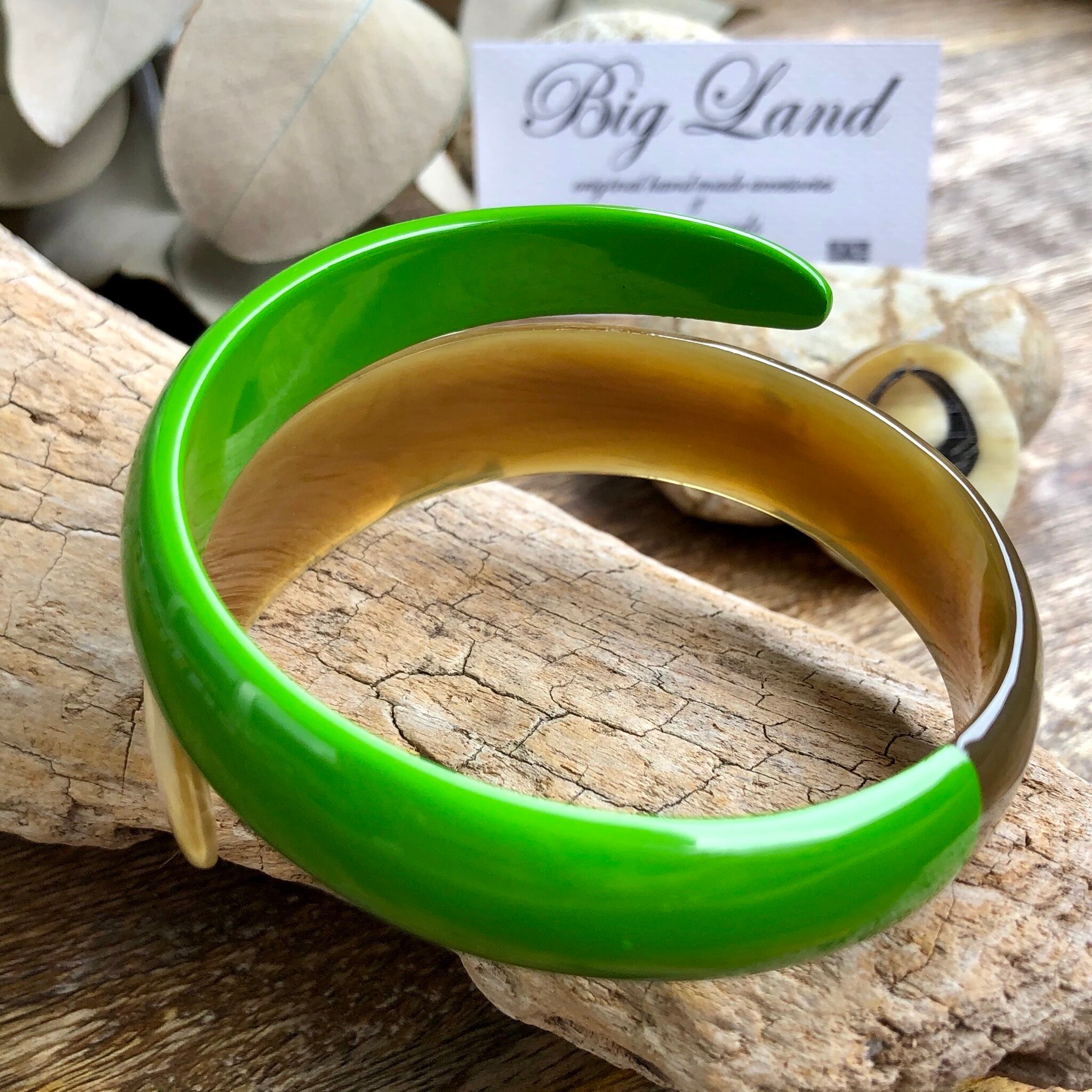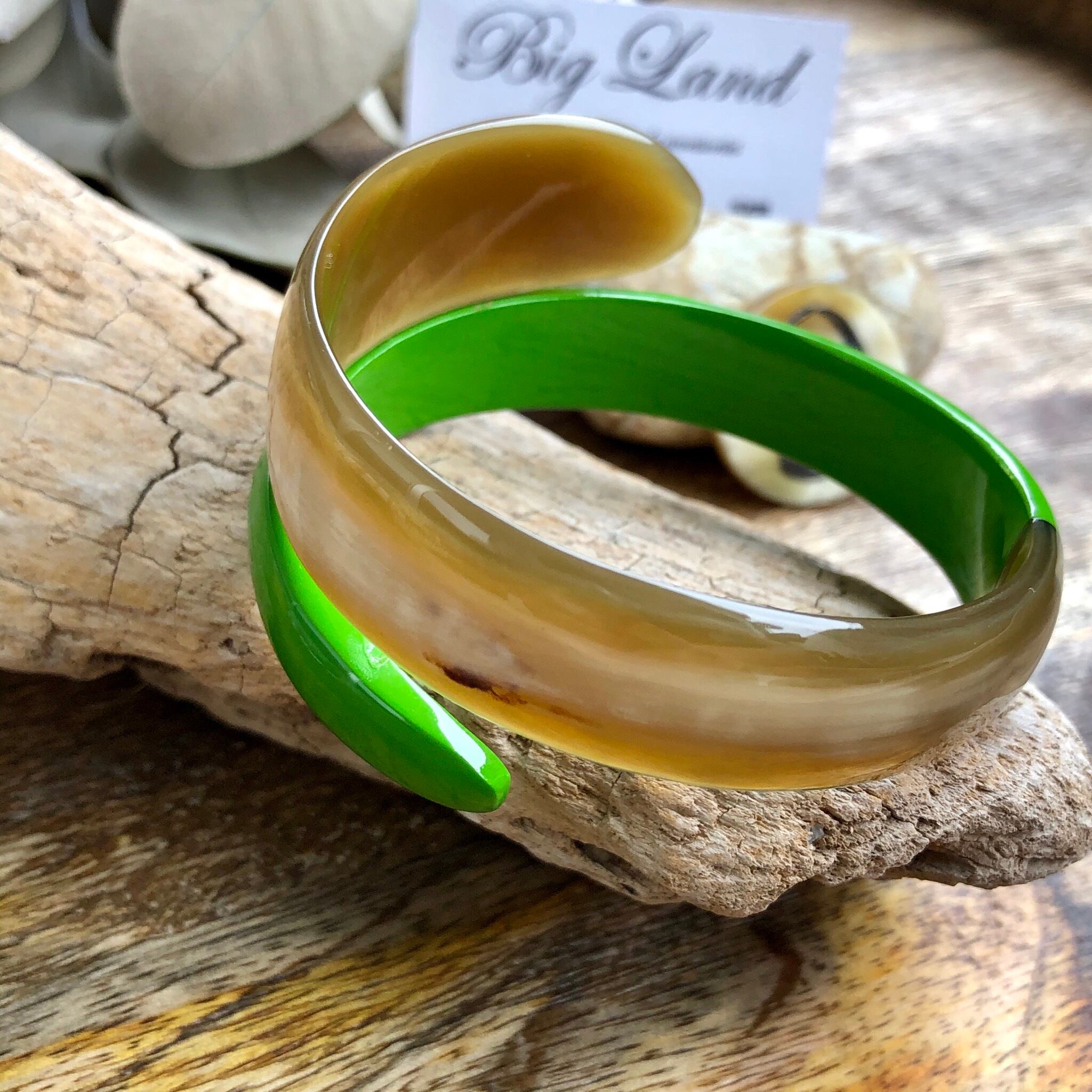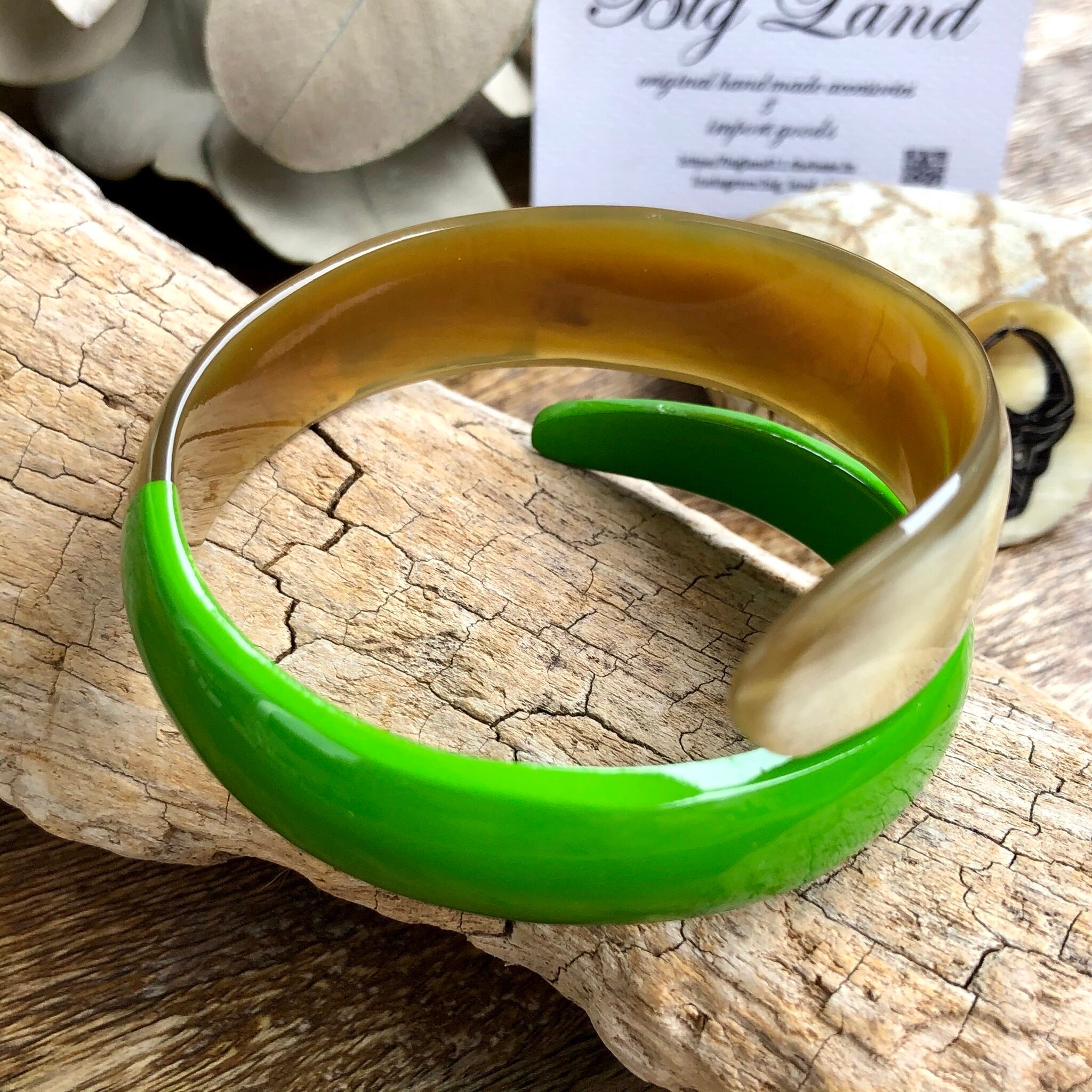 水牛ならではの軽い装着感とこなれたワンランク上の雰囲気でグリーンと天然水牛の色合いがなんとも美しい〜☺️✨