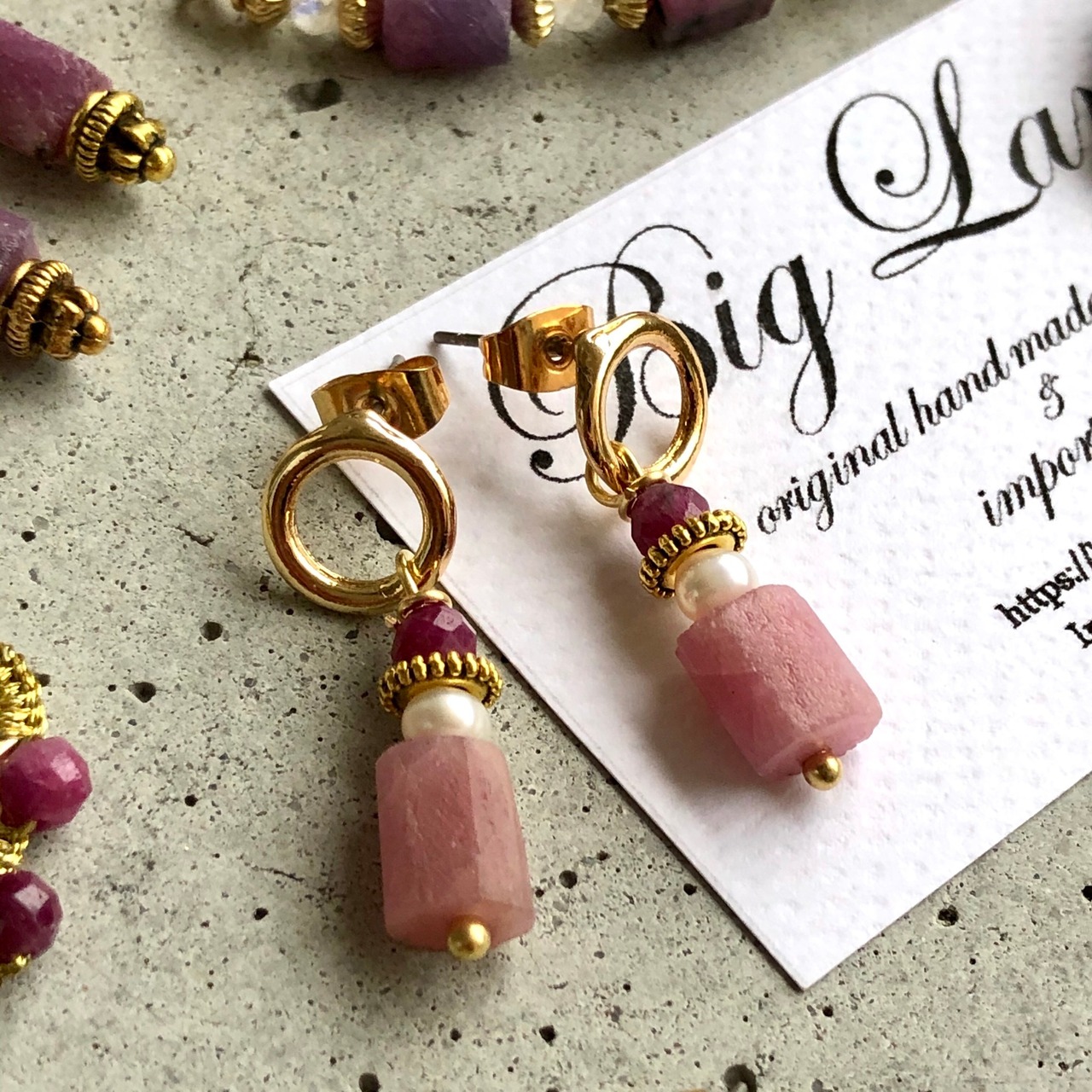 マットルビー原石&多面カットルビー&パールを組み合わせさりげなサイズ感で可愛らしい雰囲気に仕上げ、職場コーデにもオススメ✨