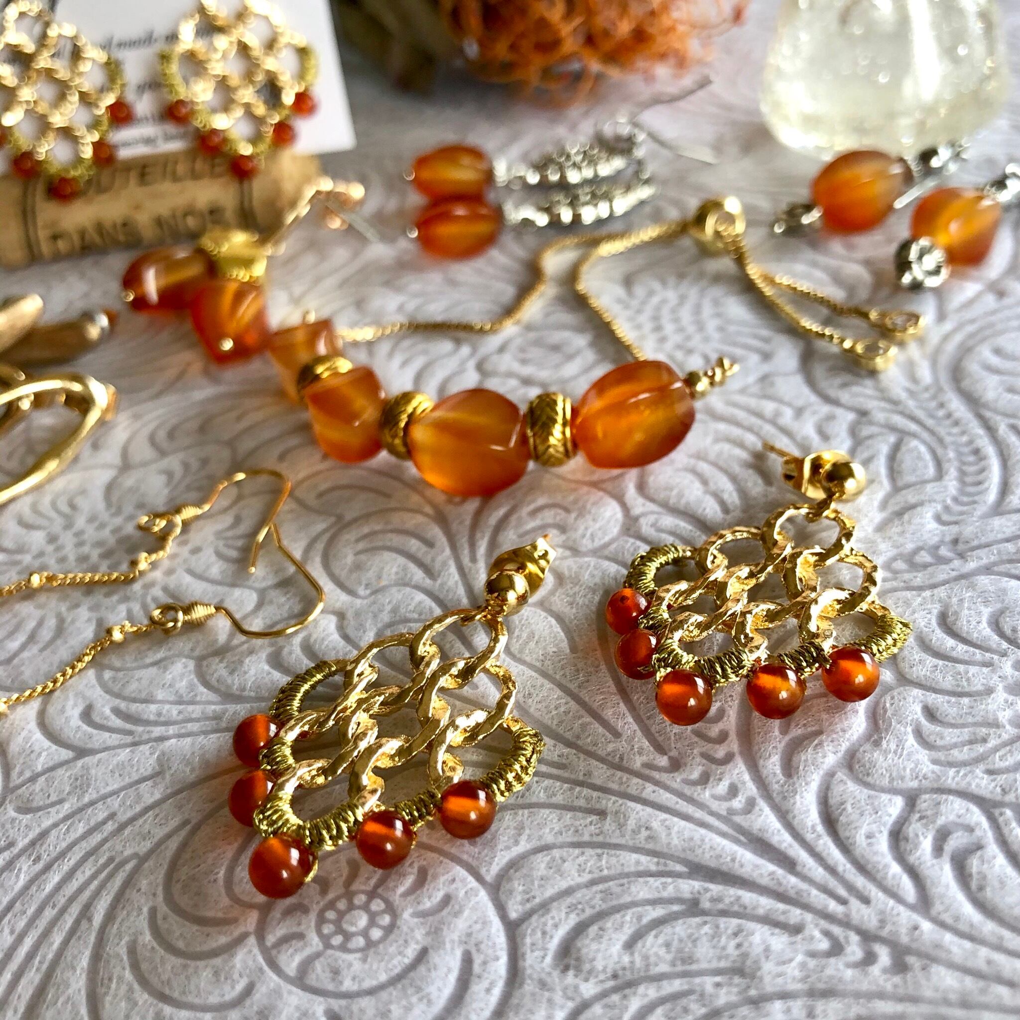 18Kゴールドメッキチェーンに艶々なカーネリアンと組み合わせ大人っぽい雰囲気に仕上げピアスとのセットコーデもオススメです✨