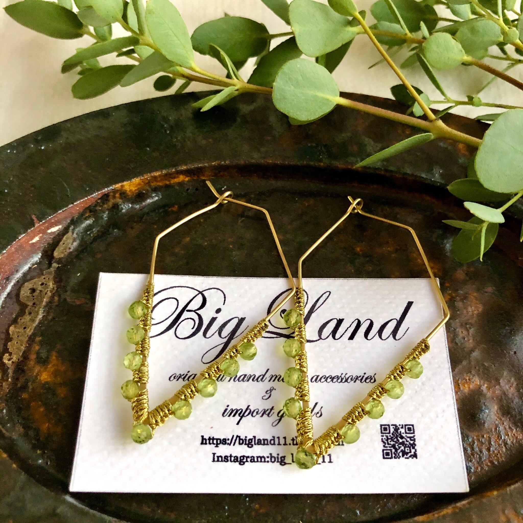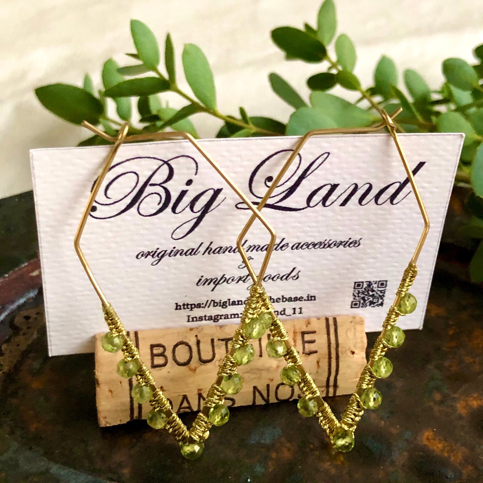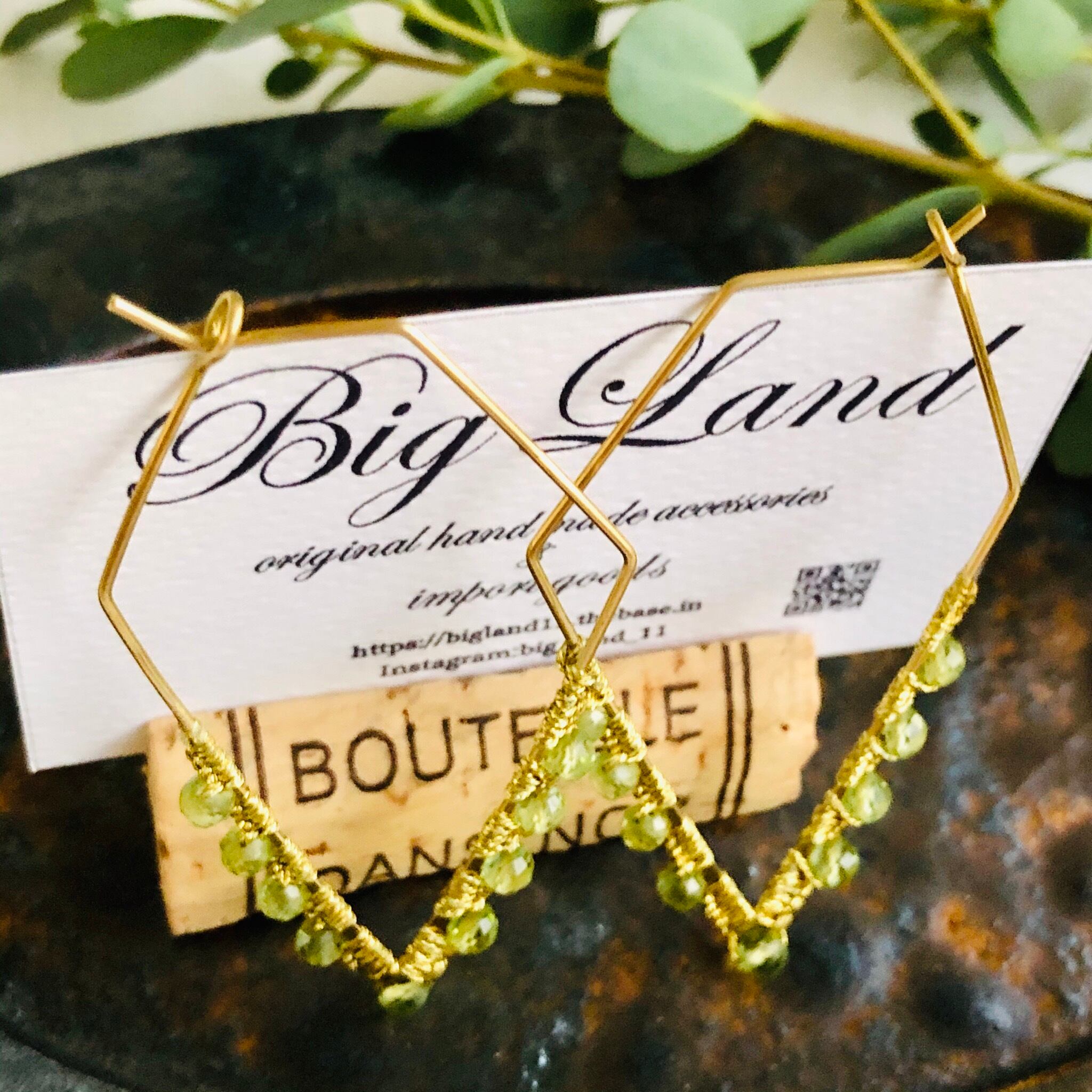 ペリドットを真鍮素材にゴールドの糸で丁寧にひと編みひと編みし繊細なディテールをお楽しみ下さい✨こなれ感あるアンティーク風な感じに仕上がり、大振りで小顔効果あり!!